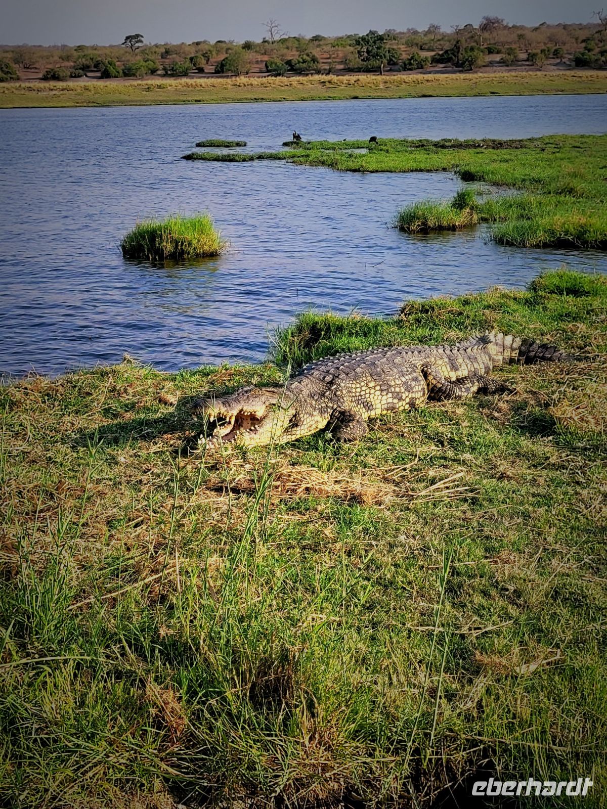 Diesmal hieß es zeitig aufstehen, denn wir wollten bei einer Jeep-Safari im Chobe Nationalpark viele Tiere und möglichst auch Löwen sehen. Vor unserer Abfahrt ging ein zwar kurzes aber heftiges Gewitter und starker Regen nieder. Für unsere Tour hatte das aber keine Auswirkungen und so starteten wir in den ca. 20 Fahrminuten entfernten Park. Unser lokaler Guide wusste Bescheid und fuhr uns zielstrebig zum Ort der erfolgreichsten Löwensichtungen. Tatsächlich, in der Nähe des Chobe-Flusses konnten wir ein Löwenrudel mit 13 Tieren (meine Zählung) beobachten und umfangreich fotografieren. Die Kameras kamen gar nicht mehr zur Ruhe. Bei unserer weiteren Fahrt durch den Park konnten wir wieder viele Tiere entdecken: Elefanten auf dem Weg zum Wasser und im Uferbereich des Chobe; Marabus, Kudus, Moorantilopen, jede Menge Impalas, Mungos, freche Meerkatzen, Warzenschweine, einen Schakal, eine junge Leopardenschildkröte und viele Vögel. Eine Giraffe fraß so nah an unserem Jeep, so dass wir sie fast hätten streicheln können. Nach runde 4 Stunden Pirschfahrt verließen wir den Chobe Nationalpark und fuhren zurück zu unserer Lodge, um uns nach dem späten Frühstück erst einmal vom frühen Aufstehen zu erholen. Am Nachmittag folgte dann eine Bootstour auf dem Chobe. Wieder sahen wir viele Tiere, so u.a. ein ca. 5 Meter großes und 900 kg schweres Krokodil, Giraffen und Elefanten beim Trinken, große Büffelherden und eine Vielzahl an Vögeln und Reihern. Zum Sonnenuntergang wurden dann wieder Getränke gereicht und wie immer viele schöne Fotos von der sich absenkenden Sonne gemacht. Ein sehr schöner Tag ging mit einem Barbecue in unserer Lodge zu Ende.