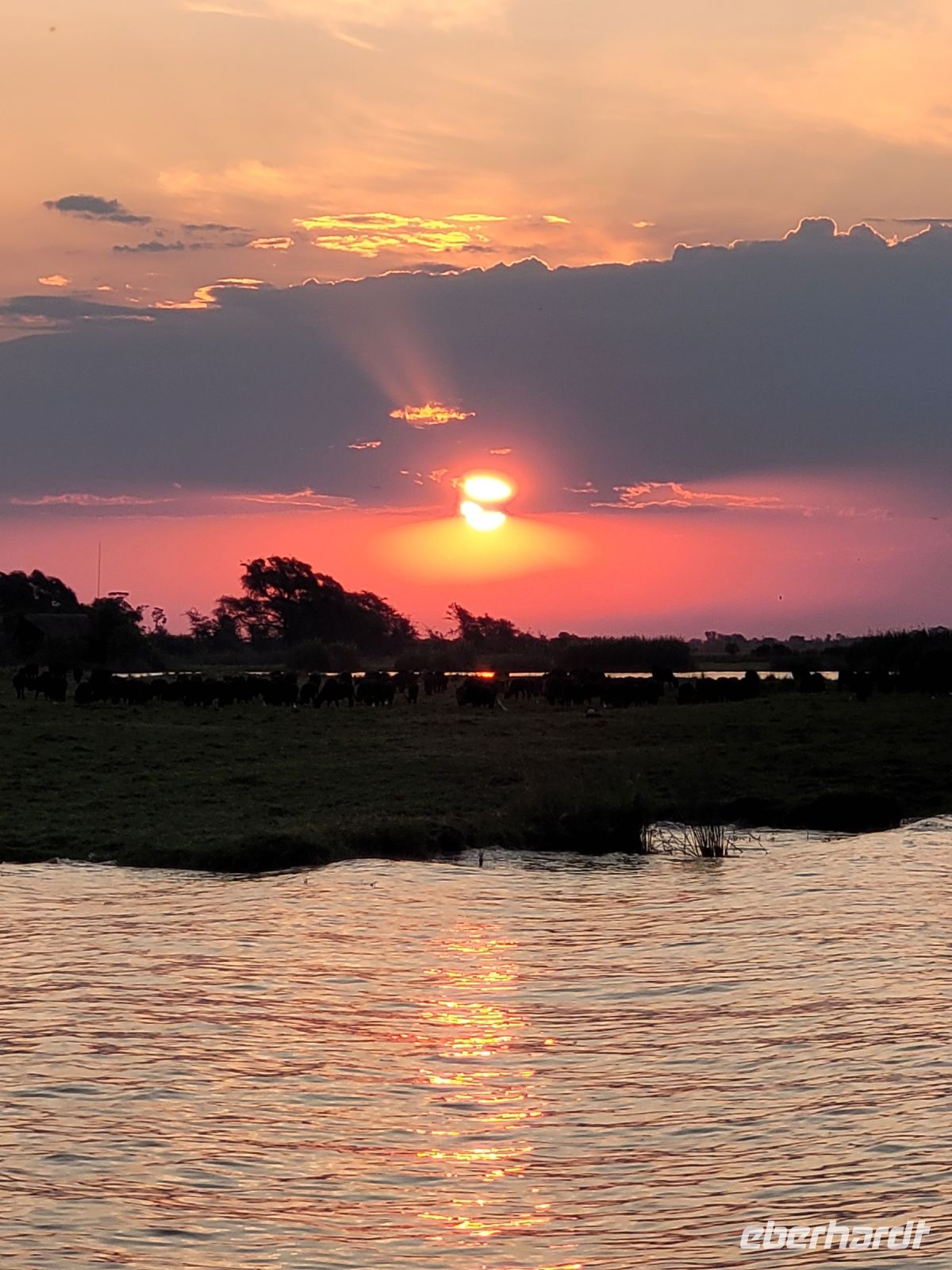 Am späten Nachmittag starteten wir noch einmal zu einer Sundowner-Bootstour auf dem Kavango, wie der Okavango in Namibia genannt wird. Wieder konnten wir Antilopen und verschiedene Vögel (z.B. den afrikanischen Bienenfresser), aber auch Hippos und Elefanten beobachten. Letztere kamen mit einer ca. 30 Tieren starken Herde zum abendlichen Wassertrunk in unmittelbarer Nähe unseres Bootes, so dass wir diese Tiere in aller Ruhe betrachten und fotografieren konnten. Dabei landeten wir mit unserem Boot auf einer Sandbank. Es ging nicht vorwärts und nicht rückwärts. Also unser Reiseleiter Jaco und meine Wenigkeit ab ins Wasser (war nur knietief und angenehm warm) und schieben. Krokodile gab es hier keine ?? und mit vereinten Kräften schoben wir das Boot ins tiefere Wasser und konnten unsere Fahrt fortsetzen. Dabei erlebten wir wieder einen sehr schönen Sonnenuntergang. Zurück in der Lodge genossen wir ein vorzügliches Abendessen mit Kudu-Fleisch als Hauptgang. Ein wiederum heißer und schöner Tag voller Erlebnisse ging langsam zu Ende.