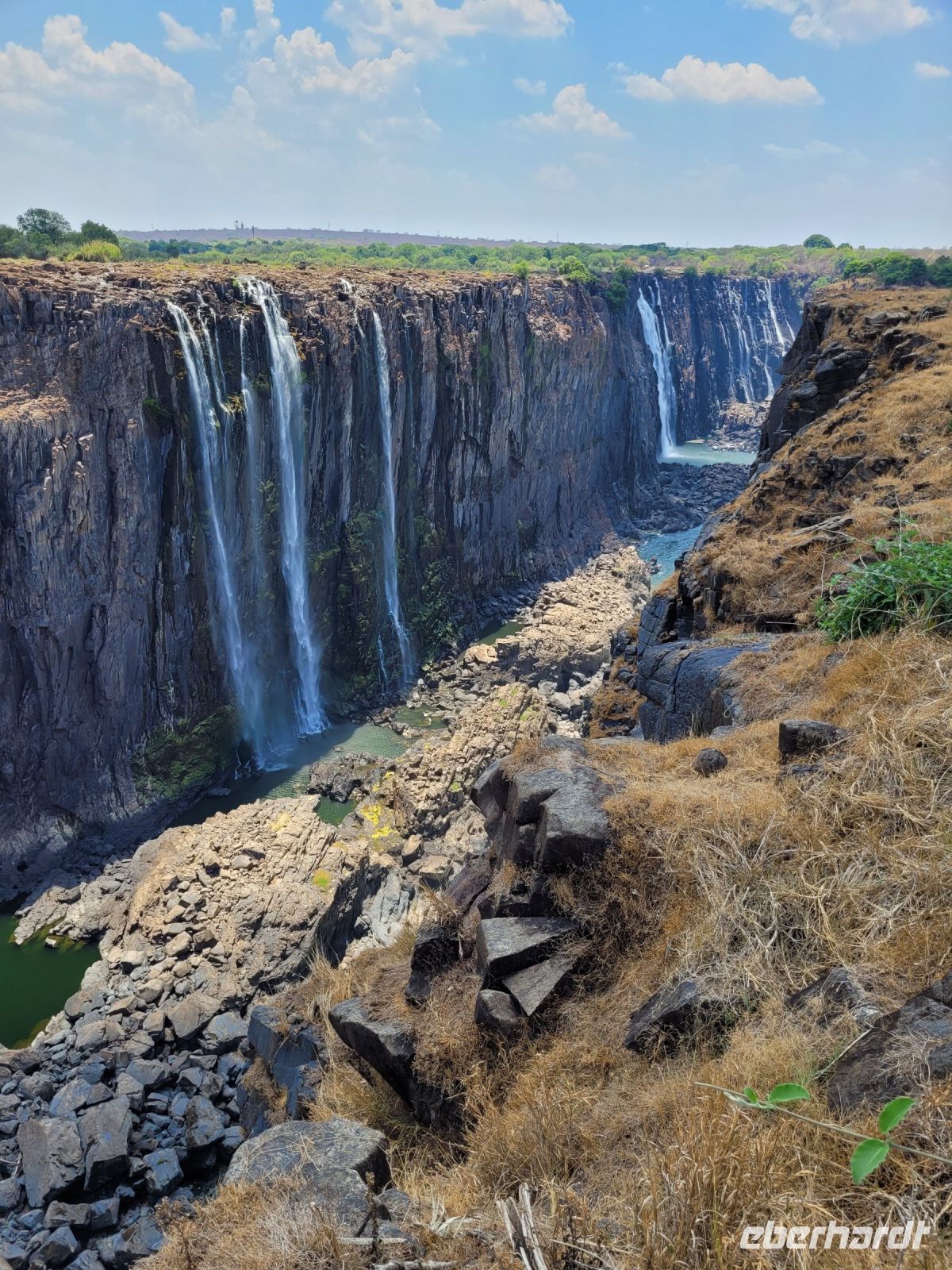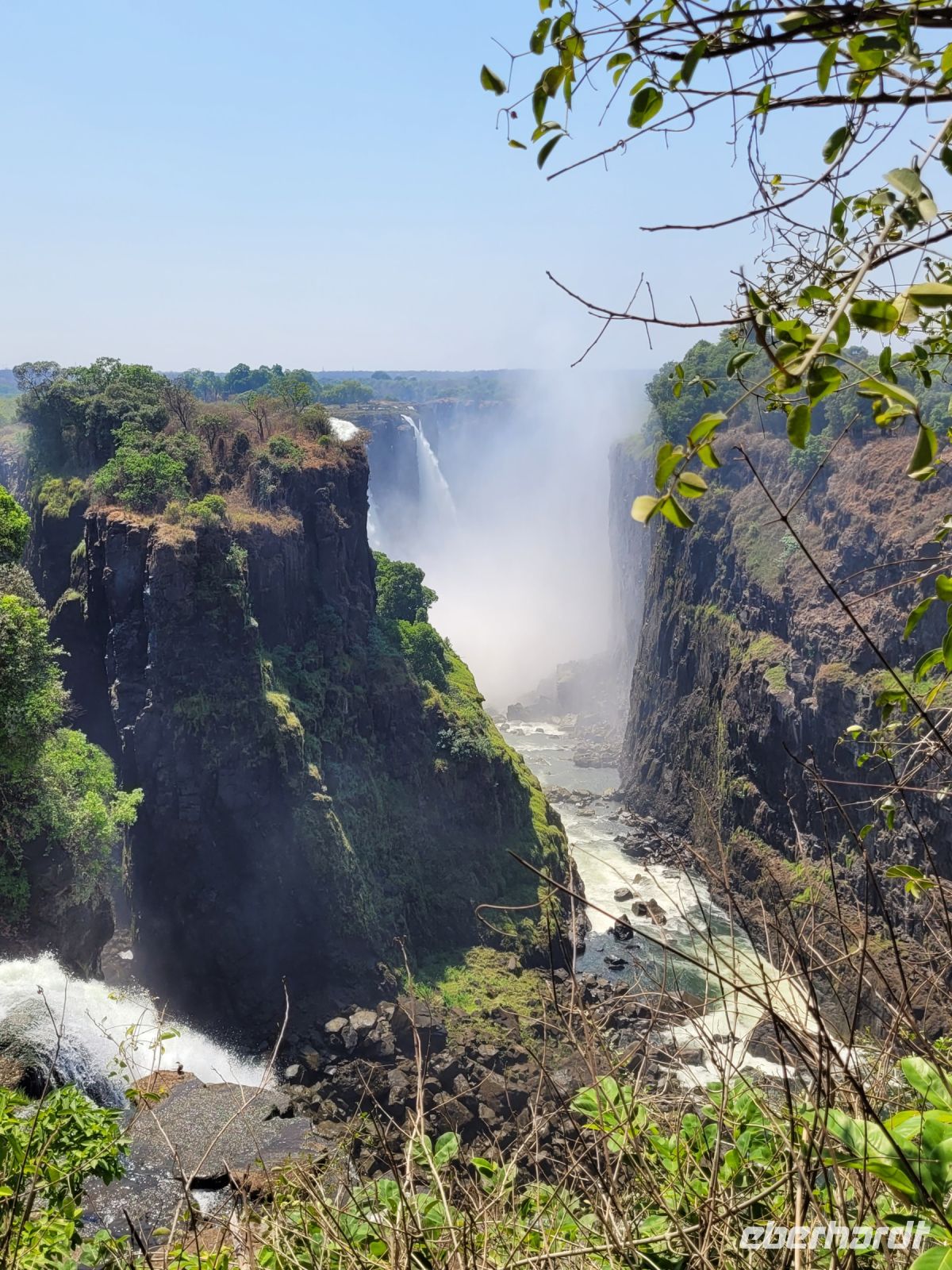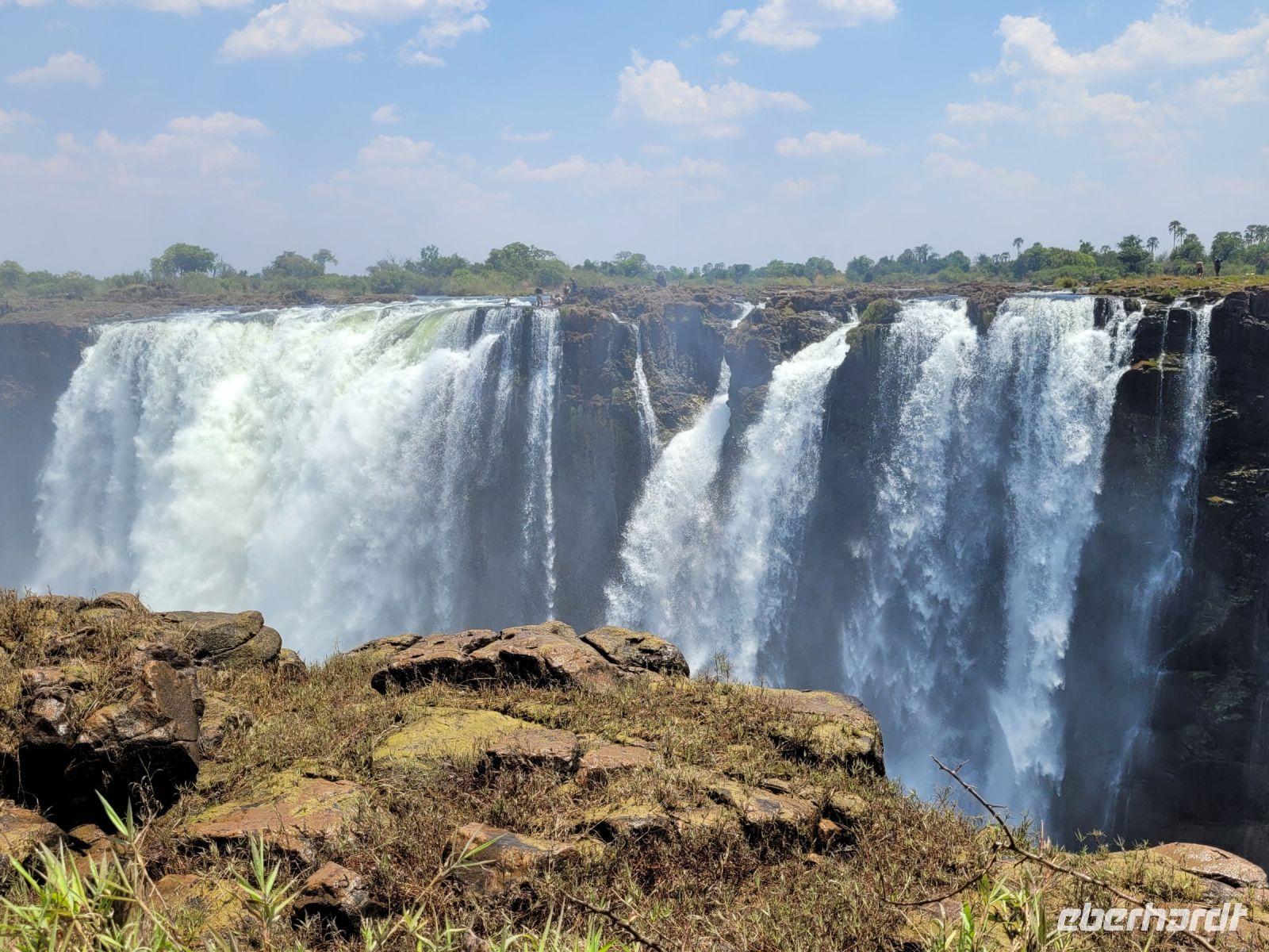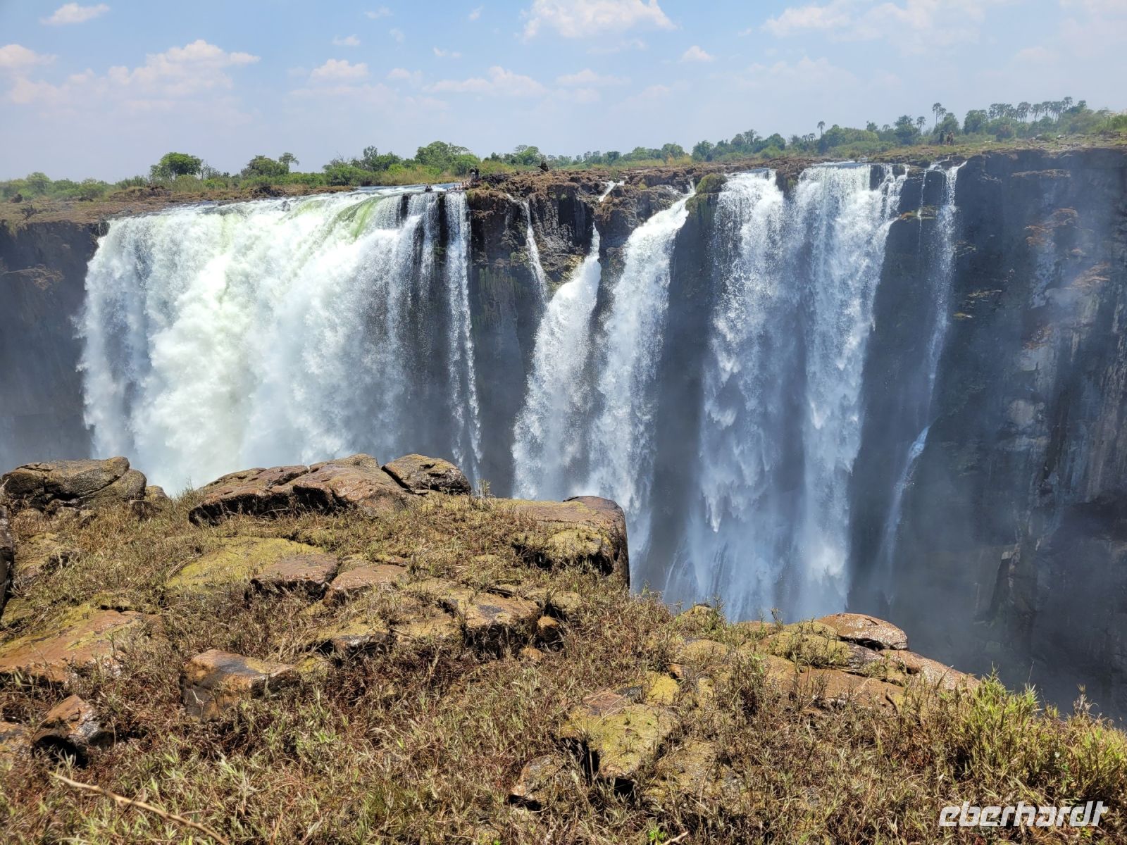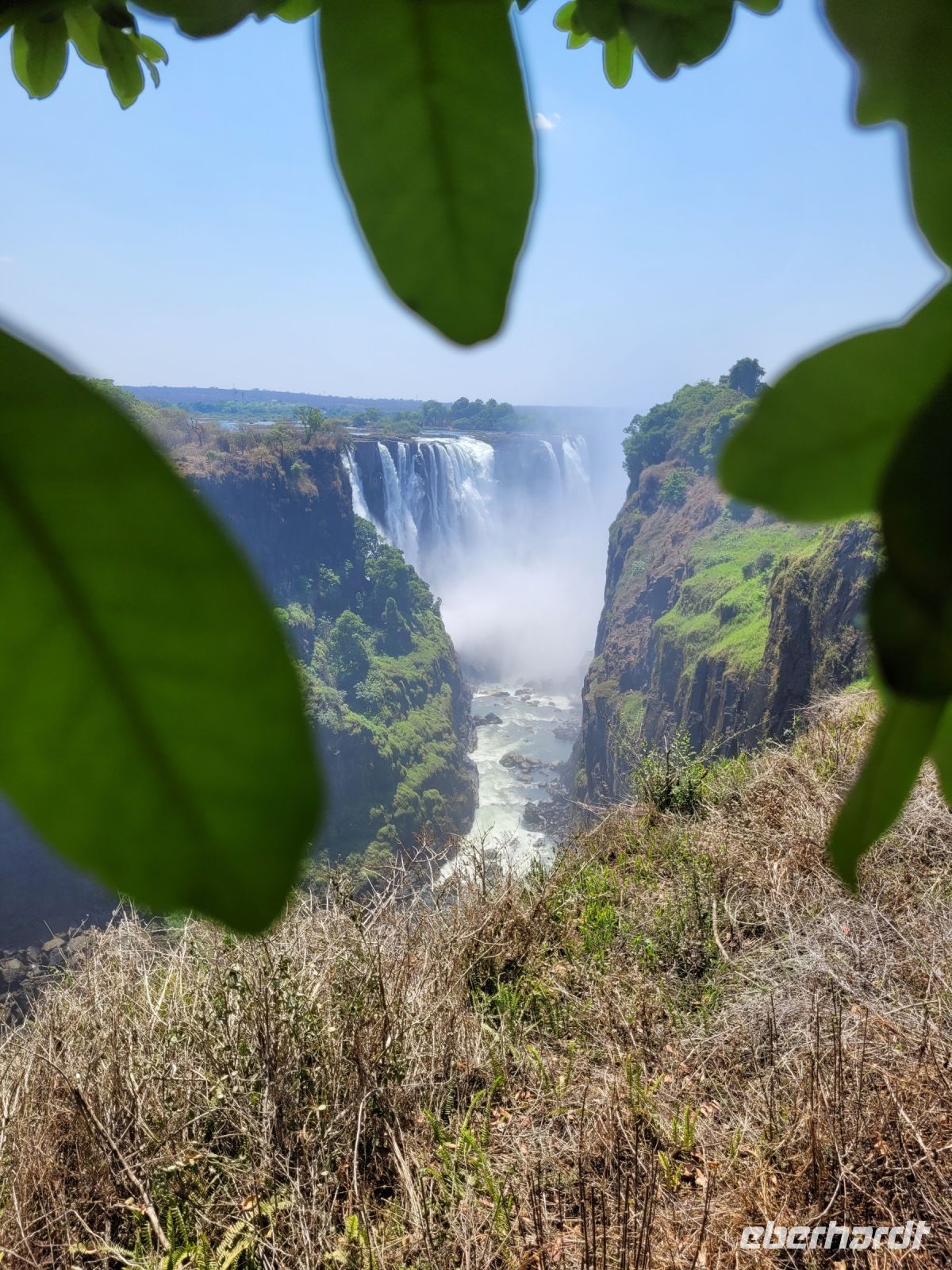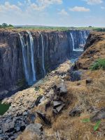 Wir verließen Botswana und fuhren in das Land unseres Reiseanfangs, nach Simbabwe. Die Grenzübergänge waren schnell passiert und nach rund einer Stunde Fahrzeit erreichten wir Victoria Falls, eine kleine lebendige Stadt mit vermutlich so vielen Souvenirgeschäften wie wir sie bisher auf unserer Reise zusammen nicht gesehen haben. Aber die Geschäfte waren nicht unser Ziel, sondern wir wollten die Victoria Wasserfälle sehen. Nach einführenden Erklärungen durch Jaco zur Entstehung der Wasserfälle absolvierten wir den Weg mit verschiedenen Aussichtspunkten. Trotz der vorausgegangenen Trockenzeit führte der Sambesi (immerhin der 4. längste Fluss in Afrika) erstaunlich viel Wasser, so dass die Wasserfälle eine imposante Fotokulisse abgaben.