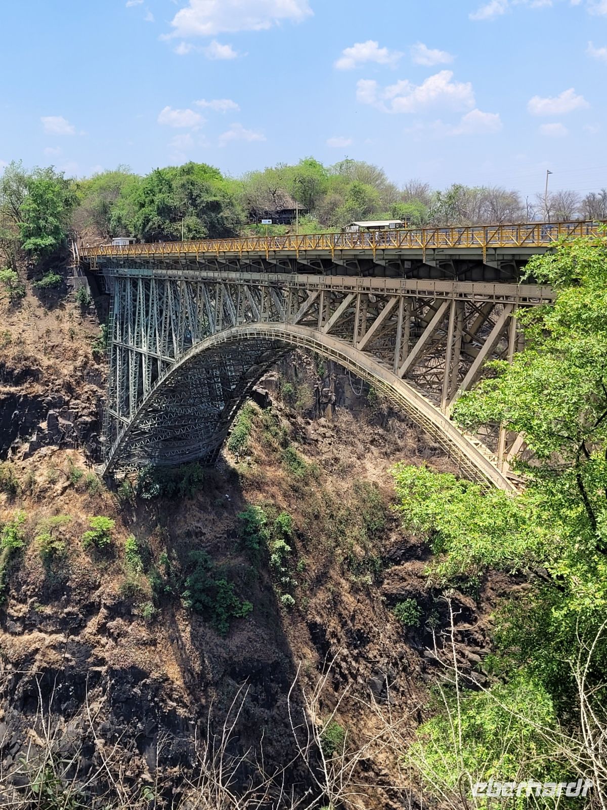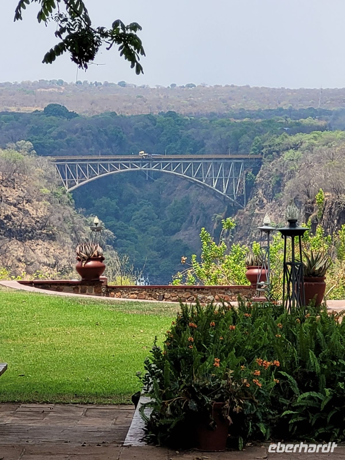 Im Anschluss bauten wir noch einen Stopp bei dem sehr schönen VIC Falls Hotel ein, um bei dem einen oder anderen erfrischenden Getränk auf der Hotelterrasse den Blick auf die Landschaft und die 1905 (seinerzeit Höchste der Welt) erbauten ViC Falls Bridge zu werfen.