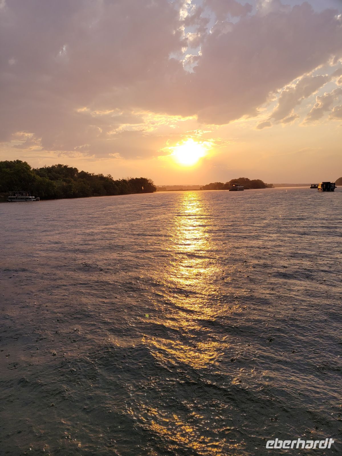 Am Nachmittag erreichten wir die idyllisch am Okavango River gelegene Shakawe River Lodge. Wieder wurden wir vom gesamten Team begrüßt, bezogen unsere Zimmer und trafen uns kurz darauf wieder zu einer Sundowner-Bootsfahrt auf dem Okavango. Während der Fahrt durch das Flussdelta konnten wir viele schöne Aufnahmen von Vögeln und Pflanzen machen und einen wunderschönen Sonnenuntergang genießen. Unser Bootsführer führte uns dann auch vor, wie Adler Beute aus dem Wasser aufnahm, indem er Fisch in s Wasser warf und die Adler rief. Ein tolles Erlebnis.