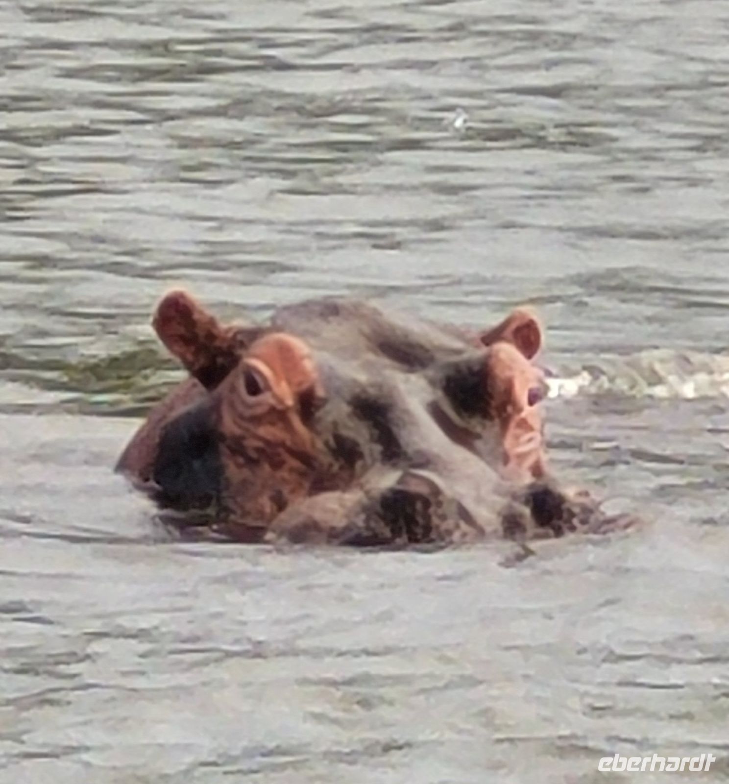Zurück in der Lodge konnten alle Gäste erst einmal relaxen, bevor es am späten Nachmittag zu einer weiteren Pirschfahrt, diesmal mit dem Boot losging. Nachdem die Getränke (ganz wichtig), die Snacks im Boot verstaut und auch alle Gäste an Bord waren, konnte es losgehen. Wieder sahen wir die uns nun schon vom Vormittag bekannten Hippos, aber auch Krokodile, Antilopen, Büffel und farbenfrohen Bienenfresser, bevor wir zur Sonnenuntergangszeit an Land gingen und mit den mitgebrachten Getränken auf einen wiederum sehr schönen Tag anstießen. Auf dem Rückweg zur Lodge bekamen wir dann sogar noch einige Löwen (die Gleichen wie vom Vormittag?) am Wasser zu sehen. Leider ergriffen sie recht schnell die Flucht, so dass gute Fotos eher Mangelware blieben. Aber wir haben sie gesehen. Zurück in der Lodge haben wir den Tag dann mit einem schmackhaften Abendessen (u.a. Stroganoff vom Springbock und Filet von der Oryx-Antilope) ausklingen lassen.
