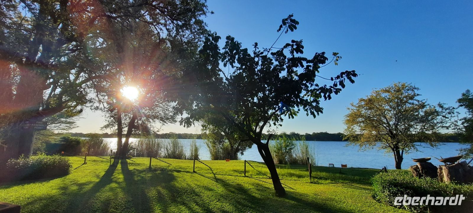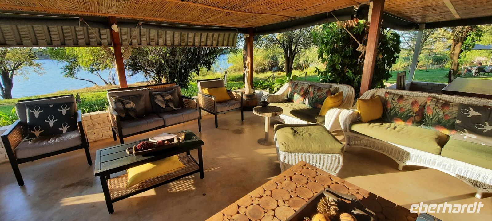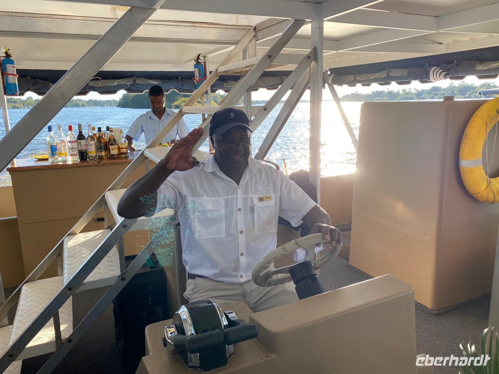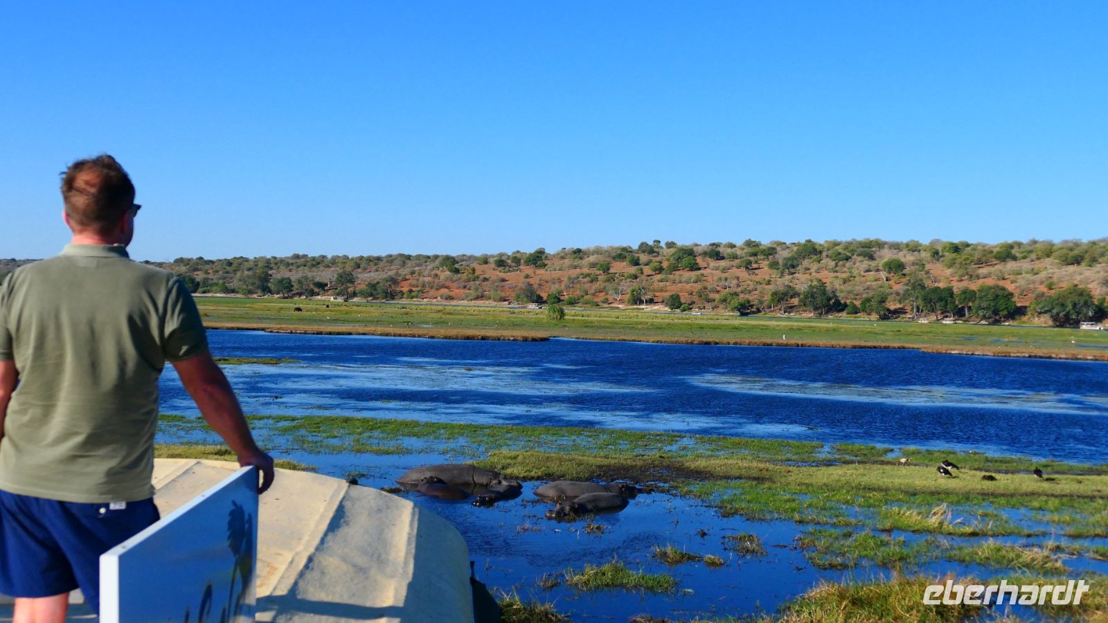 Am Ausgang des Flughafens ins Victoria Falls begrüßte uns Hartmut, unser örtlicher Reiseleiter und zugleich Fahrer. Hartmut ist ein erfahrener Guide und kennt sich bestens in Afrika aus, zumal er in Namibia geboren wurde. Außerdem ist er als Vogelkundler ein echter Experte. auf diesem Gebiet. Draußen begrüßte uns dann auch die strahlende Sonne und wollig warme Temperaturen. Victoria Falls und somit Simbabwe ließen wir vorerst links liegen und fuhren zur Grenze nach Botswana. Flott, Zack, Zack Ausreise Simbabwe - Einreise Botswana dank einer sehr gewissenhaften und dominanten Grenzbeamtin schleppend. Sie wollte Schuhe, Schuhe sehen, obwohl wir ja gerade direkt aus Deutschland eingereist waren. Also erfüllten wir Ihr den Wunsch in unsere Koffer zu schauen, präsentierten unsere Schuhe und liefen über die Seuchenmatte. Mit neuem Stempel und keimfrei wurde uns dann der Einlass nach Botswana gewährt. Kurze Zeit später checkten wir in der familiengeführten River View Lodge bei Kazangula ein. Die kleine Lodge, inmitten eines gepflegten Gartens befindet sich direkt am Chobe Fluss. Den weiteren Tag ließen wir die Seele baumeln und erholten uns vom langen Flug: ein kühler Drink an der Bar, Abkühlung im Pool oder einfach nur Nichtstun. Als die Sonne langsam unterging, trafen wir uns bei Gin & Tonic und besprachen den weiteren Reiseverlauf. In gemütlicher Runde speisten wir zu Abend, bevor wir müde ins Bett fielen.