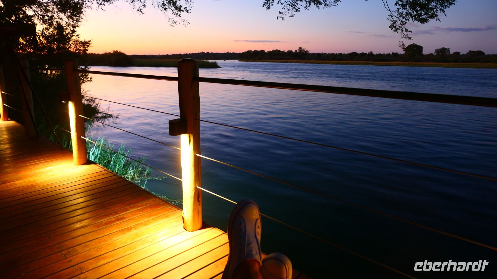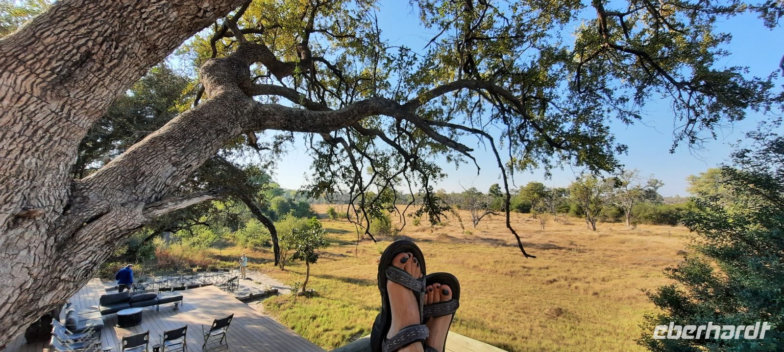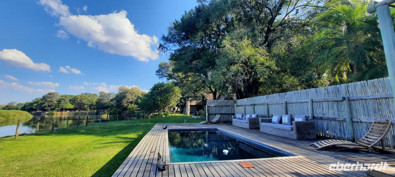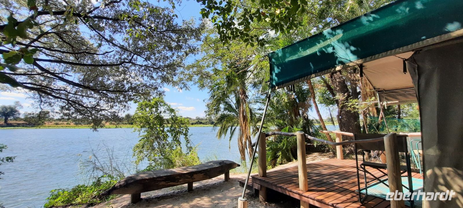 Am Ausgang des Flughafens ins Victoria Falls begrüßte uns Hartmut, unser örtlicher Reiseleiter und zugleich Fahrer. Hartmut ist ein erfahrener Guide und kennt sich bestens in Afrika aus, zumal er in Namibia geboren wurde. Außerdem ist er als Vogelkundler ein echter Experte. auf diesem Gebiet. Draußen begrüßte uns dann auch die strahlende Sonne und wollig warme Temperaturen. Victoria Falls und somit Simbabwe ließen wir vorerst links liegen und fuhren zur Grenze nach Botswana. Flott, Zack, Zack Ausreise Simbabwe - Einreise Botswana dank einer sehr gewissenhaften und dominanten Grenzbeamtin schleppend. Sie wollte Schuhe, Schuhe sehen, obwohl wir ja gerade direkt aus Deutschland eingereist waren. Also erfüllten wir Ihr den Wunsch in unsere Koffer zu schauen, präsentierten unsere Schuhe und liefen über die Seuchenmatte. Mit neuem Stempel und keimfrei wurde uns dann der Einlass nach Botswana gewährt. Kurze Zeit später checkten wir in der familiengeführten River View Lodge bei Kazangula ein. Die kleine Lodge, inmitten eines gepflegten Gartens befindet sich direkt am Chobe Fluss. Den weiteren Tag ließen wir die Seele baumeln und erholten uns vom langen Flug: ein kühler Drink an der Bar, Abkühlung im Pool oder einfach nur Nichtstun. Als die Sonne langsam unterging, trafen wir uns bei Gin & Tonic und besprachen den weiteren Reiseverlauf. In gemütlicher Runde speisten wir zu Abend, bevor wir müde ins Bett fielen.