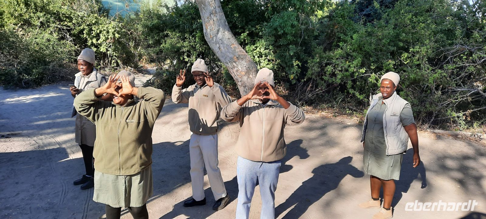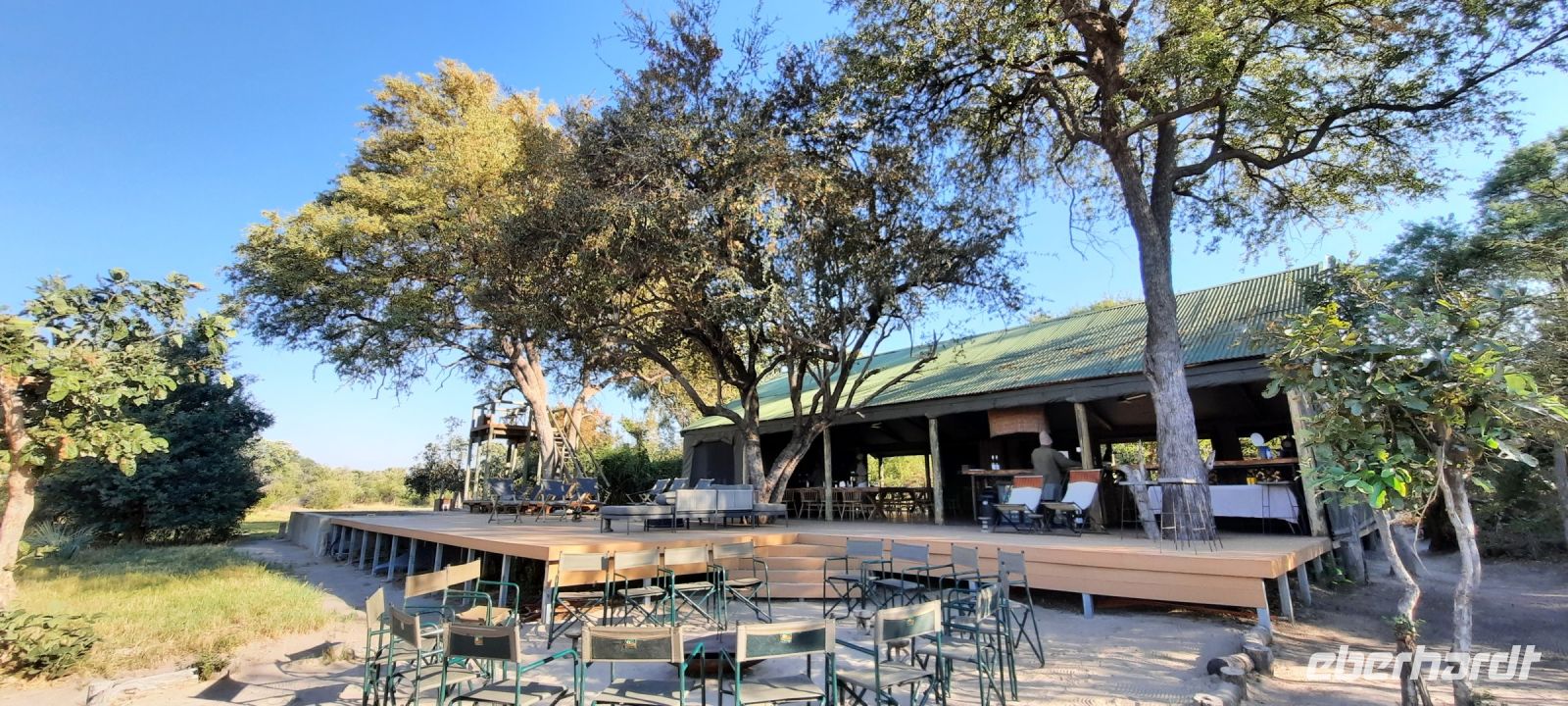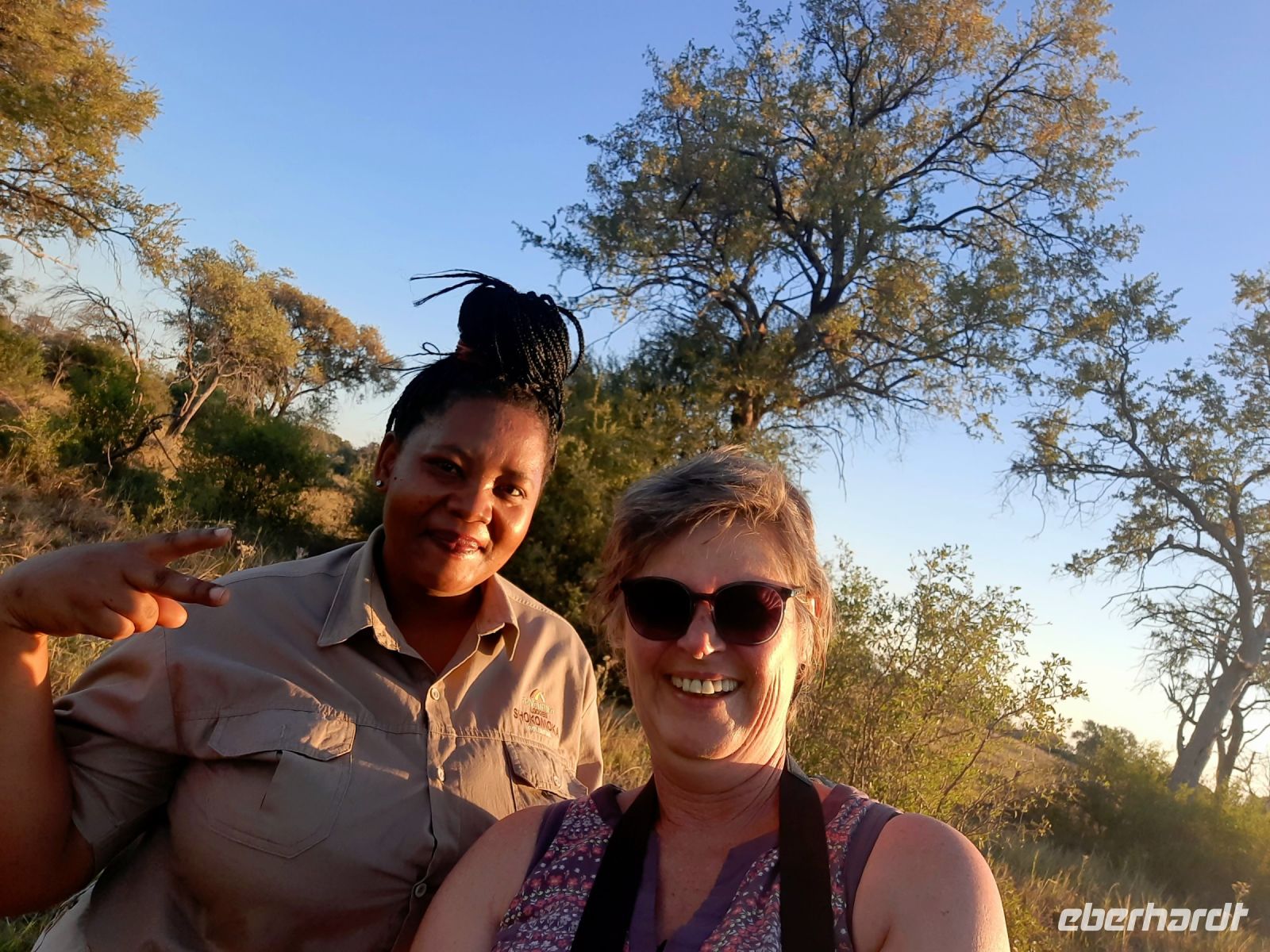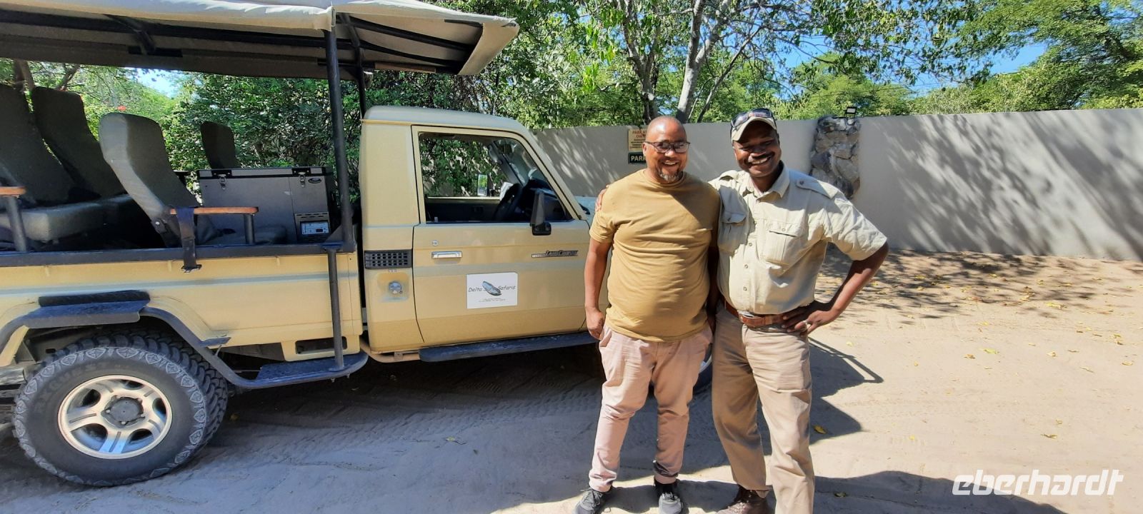 "Wildnis Afrika" war das Motto für die nächsten beiden Tage. Unser großes Gepäck und unseren Truck ließen wir in Maun zurück. Die Ranger Kebi und Katembo holten uns nach dem Frühstück mit 2 offenen Jeeps in der Thamalakane Lodge ab. Neuer Tage - neue Taten! Wir waren gespannt, die auf die Erlebnisse in der Shokomoka Adventure Lodge, abseits von Zivilisation und mitten im afrikanischen Busch. Die ersten Kilometer auf Asphalt bis zum Dorf Shorobe waren zwar etwas windy, aber bequem. Auf den steinigen und tiefen Sandwegen mit angemessener Geschwindigkeiten erhielten wir ab und zu eine afrikanische Massage gratis. Das Gebiet am trockenen Gomati Fluss grenzt direkt an das Moremi Wildreservat im südlichen Okavango Delta, welches nur durch den Buffalo-Zaun (Veterinärzaun) getrennt ist. Dieser Zaun hält aber Elefanten & Co von ihren Wanderungen nicht auf. Einzelne Elefanten Giraffen, Antilopen und plötzlich Geier an einem Kadaver, und das unweit unserer Lodge! Huch..... Auf Shokomoka wurden wir von Otti und der Crew herzlich begrüßte - Was für ein Empfang. Die Lodge hatten wir exklusiv für Eberhardt und fühlten uns sofort wohl. Obwohl frische Löwenspuren und Elefanten Dung auf den Wegen zu sehen waren. Nach einer Einweisung und dem Check In stärkten wir uns beim liebevoll zubereiteten Mittagessen, bevor wir zu unseren komfortabel ausgestatteten Zelt-Chalets begleitet wurden. Tagsüber dürfen wir auch allein, aber in der Dunkelheit nur mit Begleitung, denn die Lodge hat keine Zäune! Am späteren Nachmittag trafen wir uns an der Bar, um eine Ausfahrt in die Umgebung zu unternehmen. Tokos, Geier und anderes kleineres Getier läuft uns übern Weg, großes Tiere nicht. Mitten im Busch erwartet uns eine Überraschung. Die liebenswürdige Otti und ihr Team haben eine Bar, nur für uns, aufgebaut. Eberhardt spendiert die Getränke - Bei Amarula, Gin & Tonic, Wein und Bier genießen wir den exklusiven Moment und den magisch Sonnenuntergang in der Wildnis, der nur für uns ist. Zum Abendessen werden wir mit einem vorzüglichen Menü bewirtet, das Kreuz des Südens erstrahlt für uns..... In unseren Zelt-Chalets schlummern wir mit den Geräuschen der Wildnis ein: Frösche quaken, die Löwen brüllen, Hyänen kichern und es raschelt! Auf dem Nachtisch steht griffbereit eine Tröte (kein Raumspray;-)