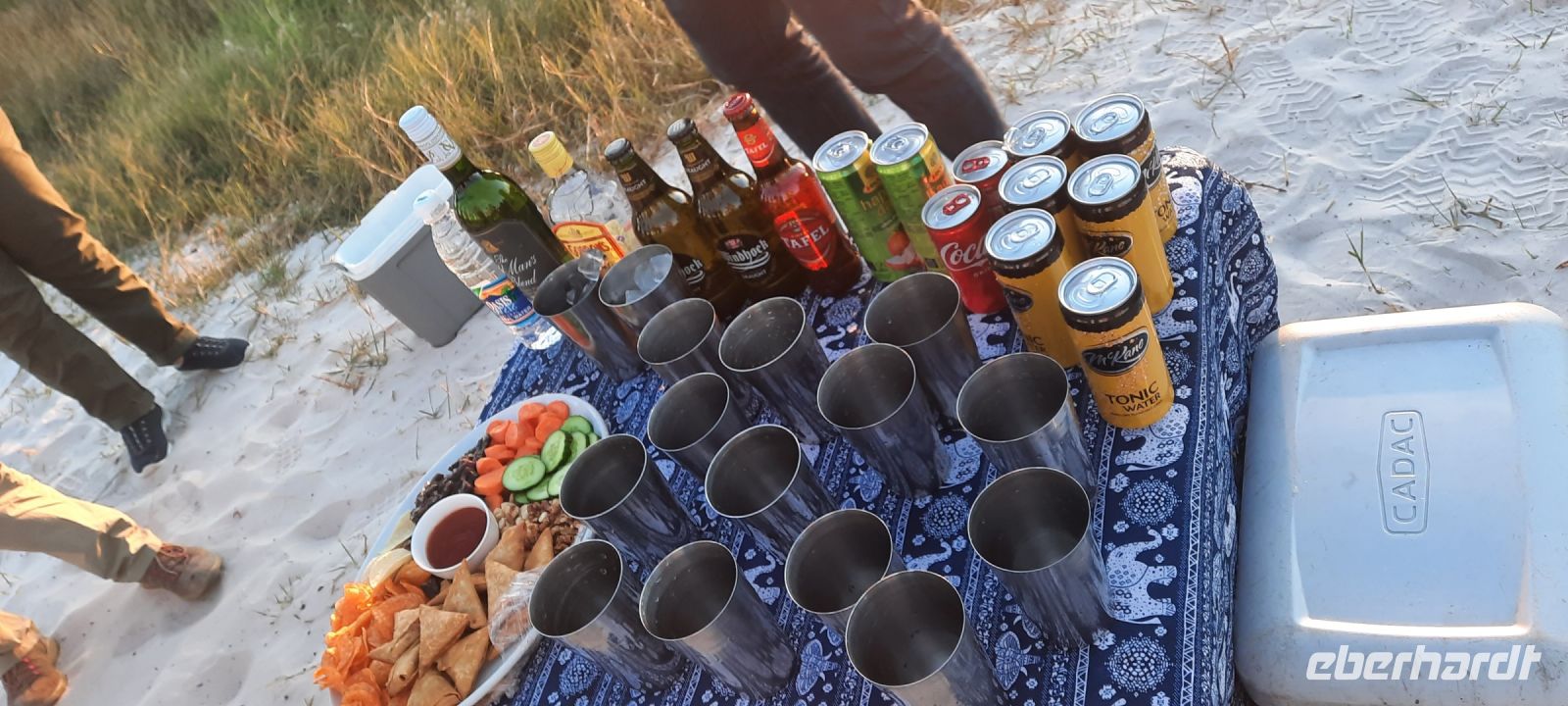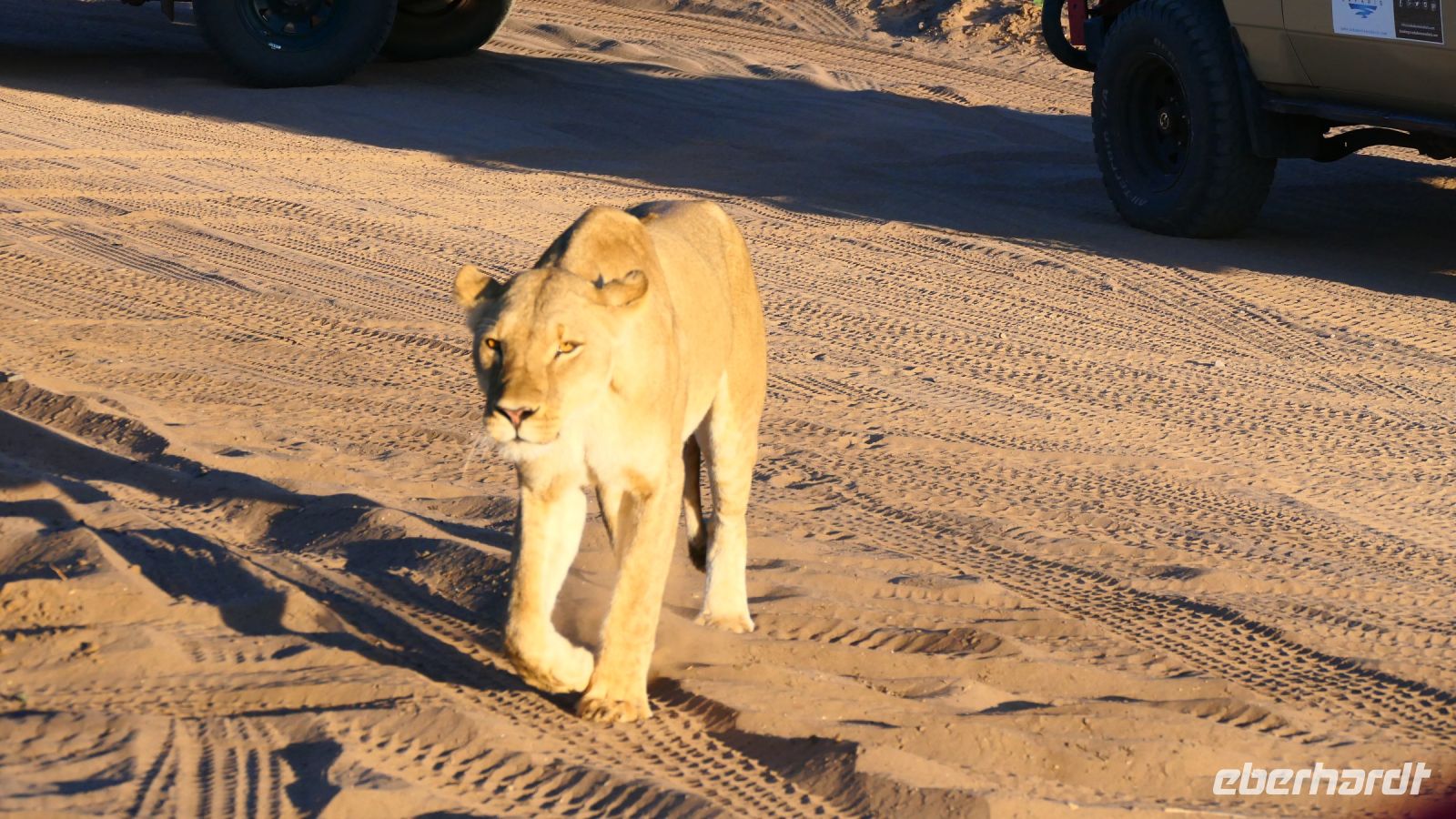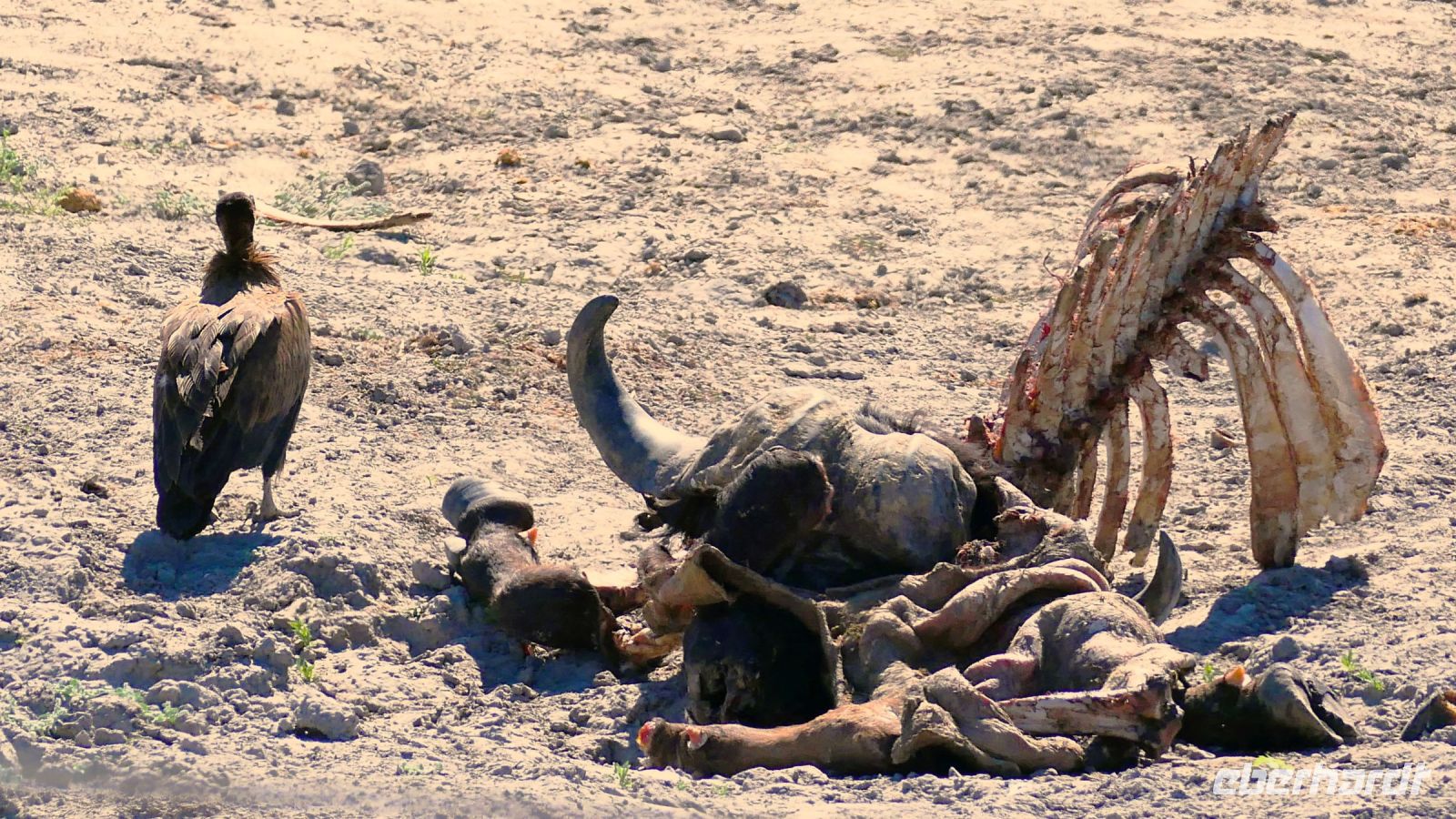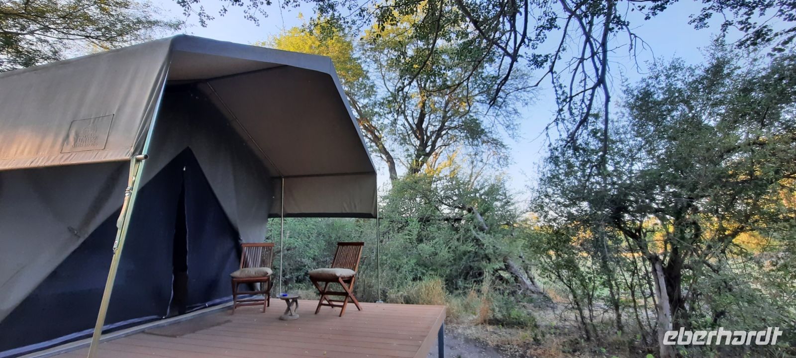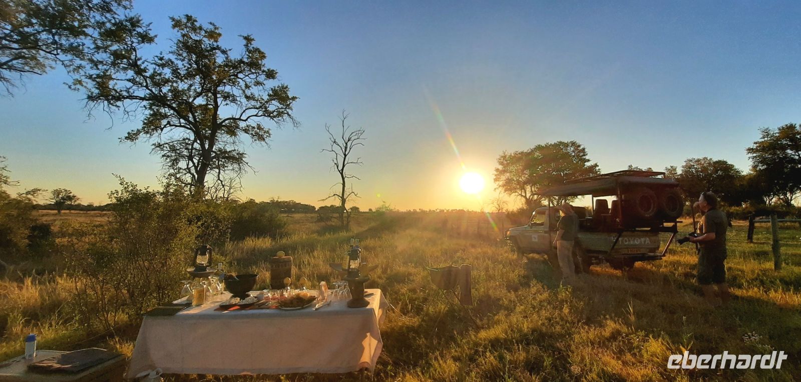 "Wildnis Afrika" war das Motto für die nächsten beiden Tage. Unser großes Gepäck und unseren Truck ließen wir in Maun zurück. Die Ranger Kebi und Katembo holten uns nach dem Frühstück mit 2 offenen Jeeps in der Thamalakane Lodge ab. Neuer Tage - neue Taten! Wir waren gespannt, die auf die Erlebnisse in der Shokomoka Adventure Lodge, abseits von Zivilisation und mitten im afrikanischen Busch. Die ersten Kilometer auf Asphalt bis zum Dorf Shorobe waren zwar etwas windy, aber bequem. Auf den steinigen und tiefen Sandwegen mit angemessener Geschwindigkeiten erhielten wir ab und zu eine afrikanische Massage gratis. Das Gebiet am trockenen Gomati Fluss grenzt direkt an das Moremi Wildreservat im südlichen Okavango Delta, welches nur durch den Buffalo-Zaun (Veterinärzaun) getrennt ist. Dieser Zaun hält aber Elefanten & Co von ihren Wanderungen nicht auf. Einzelne Elefanten Giraffen, Antilopen und plötzlich Geier an einem Kadaver, und das unweit unserer Lodge! Huch..... Auf Shokomoka wurden wir von Otti und der Crew herzlich begrüßte - Was für ein Empfang. Die Lodge hatten wir exklusiv für Eberhardt und fühlten uns sofort wohl. Obwohl frische Löwenspuren und Elefanten Dung auf den Wegen zu sehen waren. Nach einer Einweisung und dem Check In stärkten wir uns beim liebevoll zubereiteten Mittagessen, bevor wir zu unseren komfortabel ausgestatteten Zelt-Chalets begleitet wurden. Tagsüber dürfen wir auch allein, aber in der Dunkelheit nur mit Begleitung, denn die Lodge hat keine Zäune! Am späteren Nachmittag trafen wir uns an der Bar, um eine Ausfahrt in die Umgebung zu unternehmen. Tokos, Geier und anderes kleineres Getier läuft uns übern Weg, großes Tiere nicht. Mitten im Busch erwartet uns eine Überraschung. Die liebenswürdige Otti und ihr Team haben eine Bar, nur für uns, aufgebaut. Eberhardt spendiert die Getränke - Bei Amarula, Gin & Tonic, Wein und Bier genießen wir den exklusiven Moment und den magisch Sonnenuntergang in der Wildnis, der nur für uns ist. Zum Abendessen werden wir mit einem vorzüglichen Menü bewirtet, das Kreuz des Südens erstrahlt für uns..... In unseren Zelt-Chalets schlummern wir mit den Geräuschen der Wildnis ein: Frösche quaken, die Löwen brüllen, Hyänen kichern und es raschelt! Auf dem Nachtisch steht griffbereit eine Tröte (kein Raumspray;-)