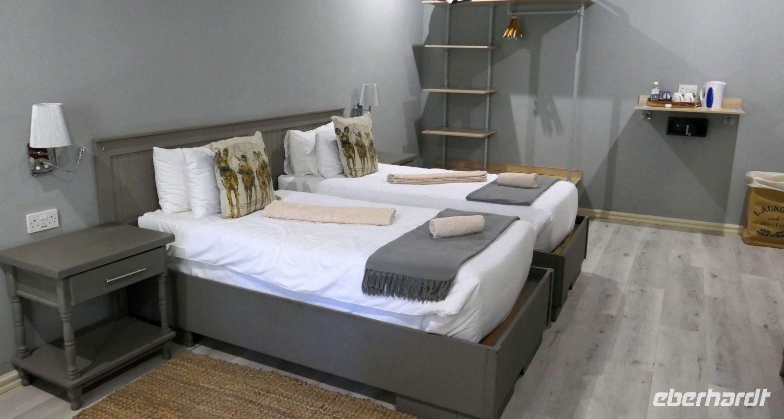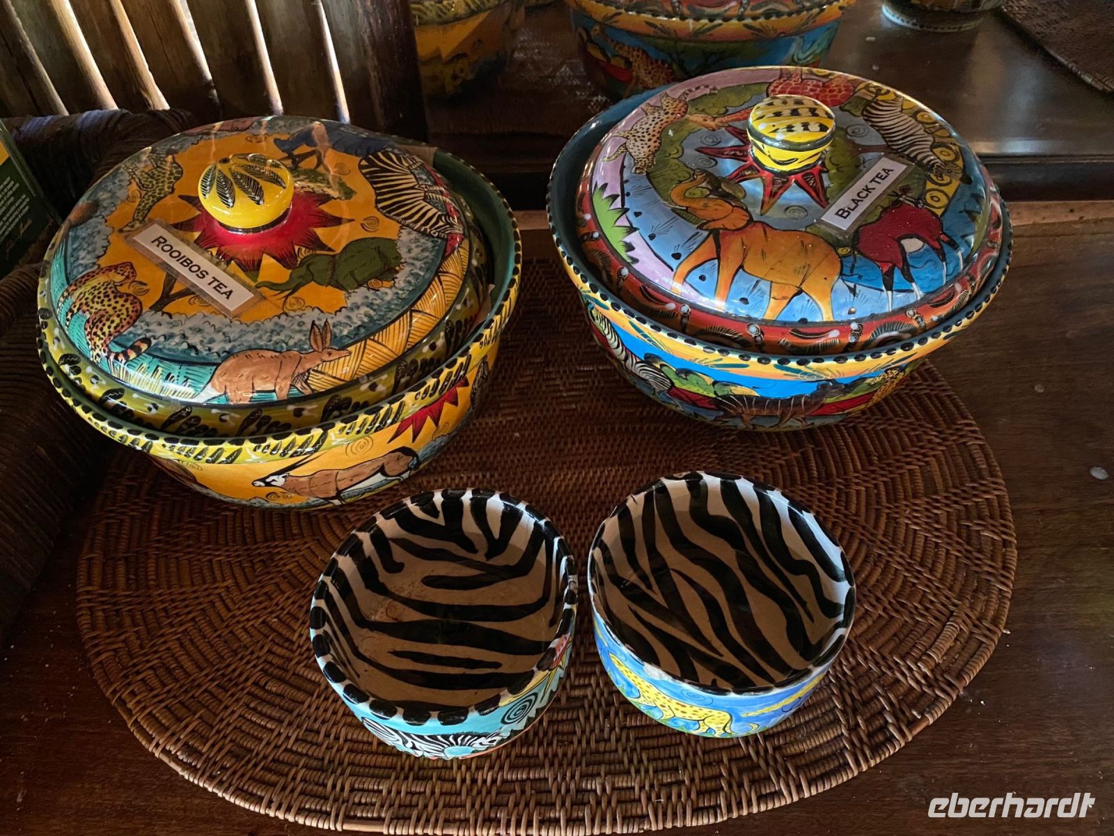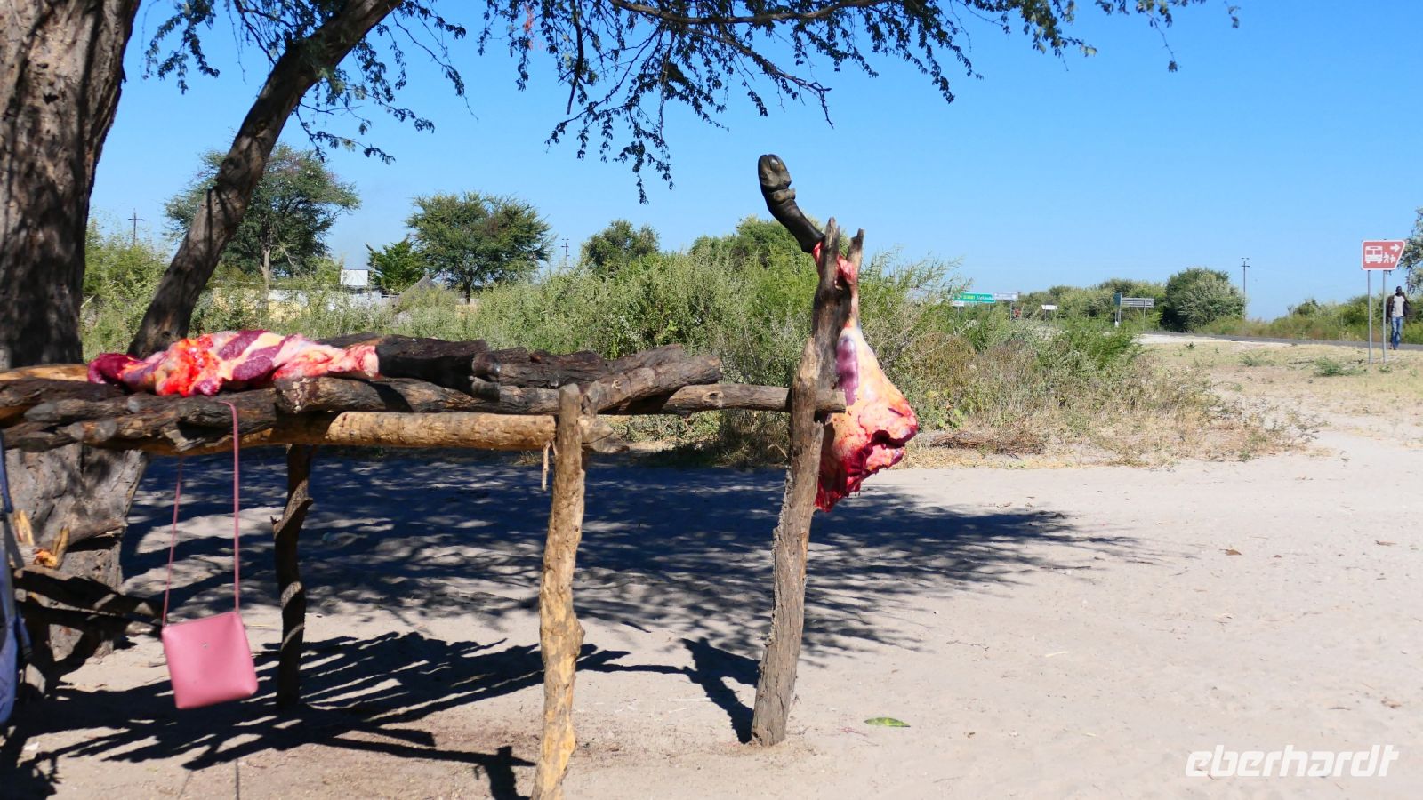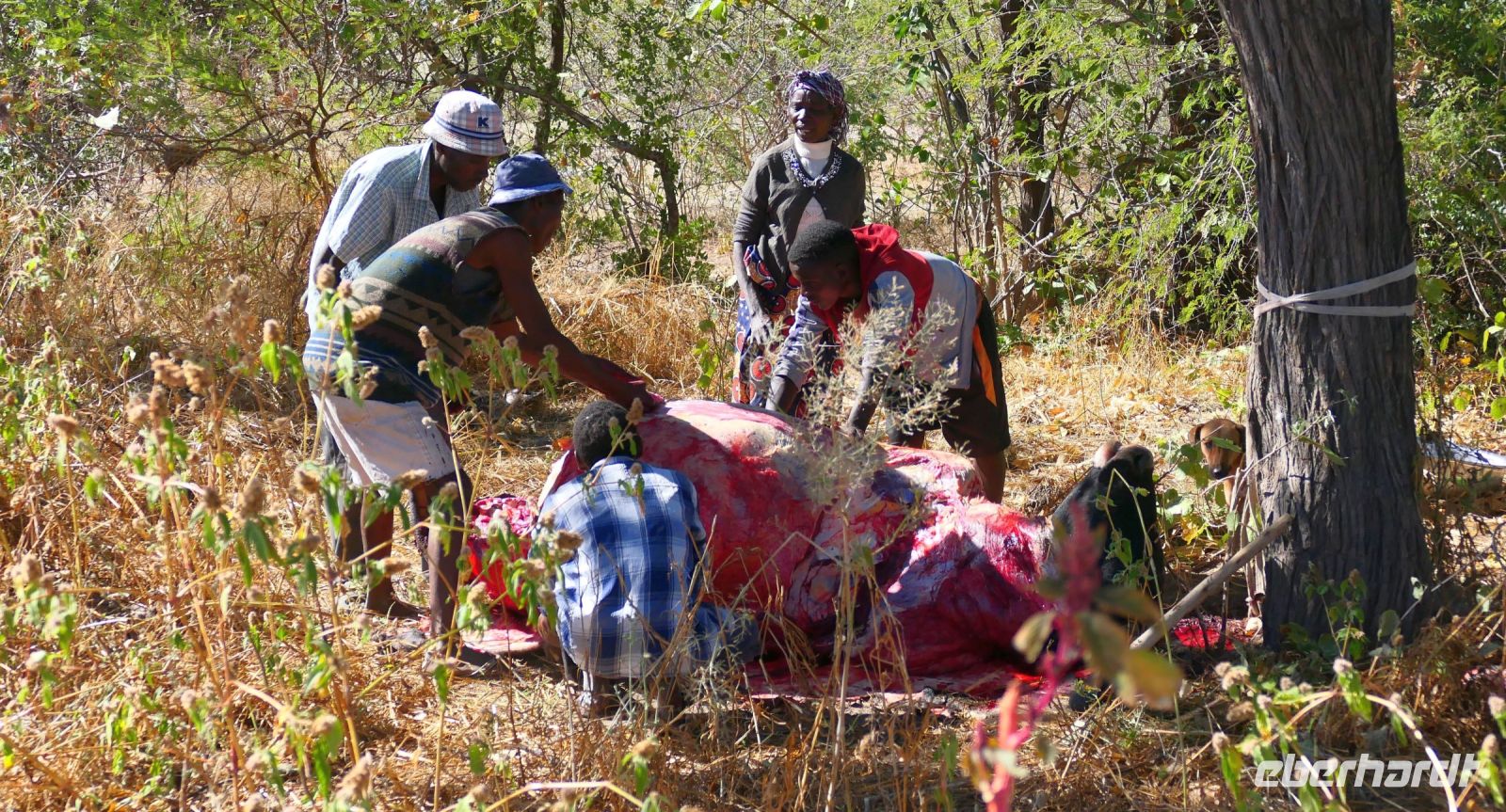 "Wildnis Afrika" war das Motto für die nächsten beiden Tage. Unser großes Gepäck und unseren Truck ließen wir in Maun zurück. Die Ranger Kebi und Katembo holten uns nach dem Frühstück mit 2 offenen Jeeps in der Thamalakane Lodge ab. Neuer Tage - neue Taten! Wir waren gespannt, die auf die Erlebnisse in der Shokomoka Adventure Lodge, abseits von Zivilisation und mitten im afrikanischen Busch. Die ersten Kilometer auf Asphalt bis zum Dorf Shorobe waren zwar etwas windy, aber bequem. Auf den steinigen und tiefen Sandwegen mit angemessener Geschwindigkeiten erhielten wir ab und zu eine afrikanische Massage gratis. Das Gebiet am trockenen Gomati Fluss grenzt direkt an das Moremi Wildreservat im südlichen Okavango Delta, welches nur durch den Buffalo-Zaun (Veterinärzaun) getrennt ist. Dieser Zaun hält aber Elefanten & Co von ihren Wanderungen nicht auf. Einzelne Elefanten Giraffen, Antilopen und plötzlich Geier an einem Kadaver, und das unweit unserer Lodge! Huch..... Auf Shokomoka wurden wir von Otti und der Crew herzlich begrüßte - Was für ein Empfang. Die Lodge hatten wir exklusiv für Eberhardt und fühlten uns sofort wohl. Obwohl frische Löwenspuren und Elefanten Dung auf den Wegen zu sehen waren. Nach einer Einweisung und dem Check In stärkten wir uns beim liebevoll zubereiteten Mittagessen, bevor wir zu unseren komfortabel ausgestatteten Zelt-Chalets begleitet wurden. Tagsüber dürfen wir auch allein, aber in der Dunkelheit nur mit Begleitung, denn die Lodge hat keine Zäune! Am späteren Nachmittag trafen wir uns an der Bar, um eine Ausfahrt in die Umgebung zu unternehmen. Tokos, Geier und anderes kleineres Getier läuft uns übern Weg, großes Tiere nicht. Mitten im Busch erwartet uns eine Überraschung. Die liebenswürdige Otti und ihr Team haben eine Bar, nur für uns, aufgebaut. Eberhardt spendiert die Getränke - Bei Amarula, Gin & Tonic, Wein und Bier genießen wir den exklusiven Moment und den magisch Sonnenuntergang in der Wildnis, der nur für uns ist. Zum Abendessen werden wir mit einem vorzüglichen Menü bewirtet, das Kreuz des Südens erstrahlt für uns..... In unseren Zelt-Chalets schlummern wir mit den Geräuschen der Wildnis ein: Frösche quaken, die Löwen brüllen, Hyänen kichern und es raschelt! Auf dem Nachtisch steht griffbereit eine Tröte (kein Raumspray;-)
