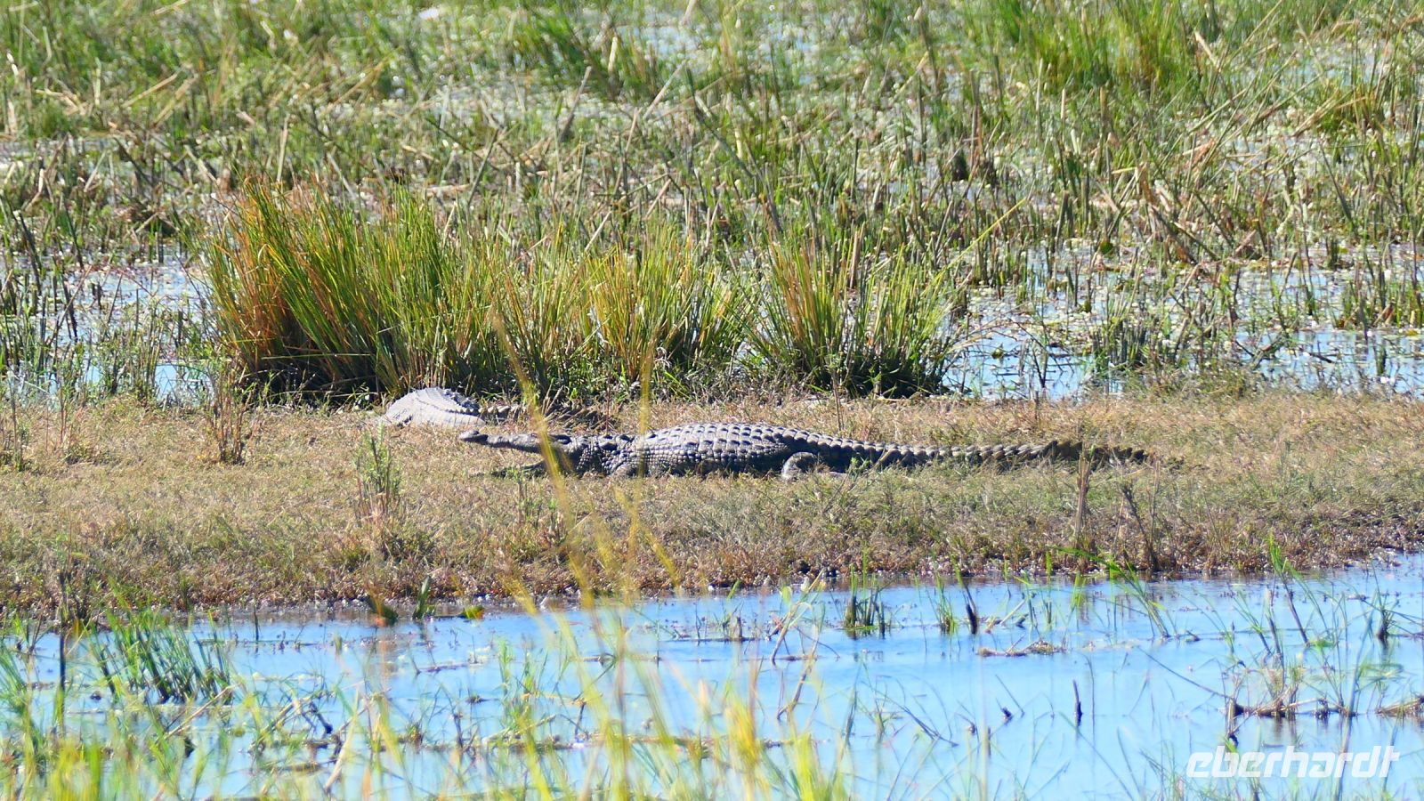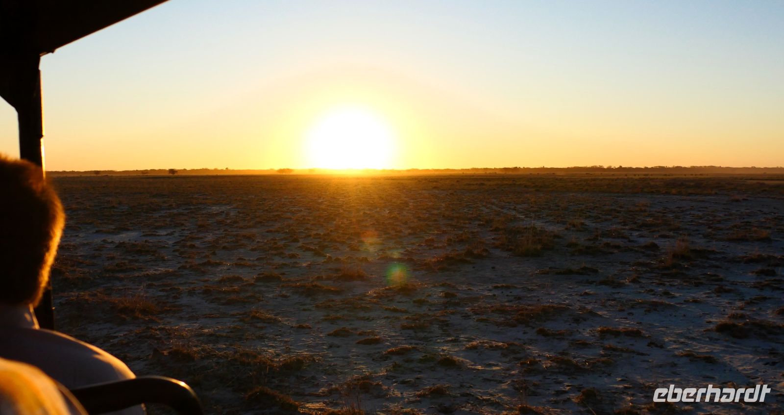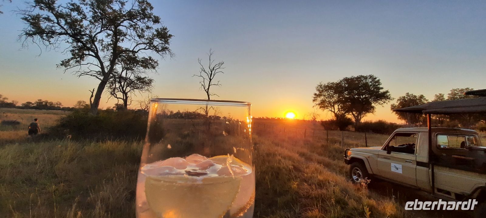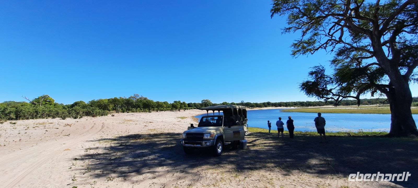 Mit unserem Truck ging es heute auf die längste Etappe unserer Reise weiter. Heute umrundeten wir das Okavango Delta am südlichen Rand bis zur westlichen Seite, zum sogenannten Pfannenstil. Die einzigste Verbindung, wenn man nicht eine Fly-In-Safari gebucht hat. Die Straße, die wir zunächst Richtung Westen befuhren, bildet die Grenze zum trockenen Süden, wo das Wasser aus dem Delta in den Salzpfannen endet bzw. verdunstet. Hier befindet sich noch ein letzter, großer See, der Lake Ngami, der vom Wasser aus dem Okavango Delta gespeist wurde, aber nun komplett ausgetrocknet ist. Vor einigen Jahren hatte er noch ganzjährig Wasser, da er in einer Senke des Kalahari-Becken an der Nordgrenze der Wüste liegt. Obwohl alles flach und eben, befinden wir uns fast 1.000 m über den Meerspiegel. Später bogen wir nach Norden (Richtung Namibia) ab und die Straße wurde zunehmender dirty - Schweizer Käse Road, wo nun endlich Bauarbeiten beginnen! Unter einem Schattenbaum halten wir für ein schnelles Picknick. Am Nachmittag erreichten wir die idyllisch am Okavango River (kurz oberhalb des Pfannenstiels) gelegene Shakawe River Lodge, die wir wieder für uns exklusiv bewohnten. Nach der staubtrockenen Landschaft empfing uns hier eine saftig grüne Flusslandschaft mit Papyrus und Rietgras. Eine traumhafte Location, in der wir freundlich von den Mitarbeitern begrüßt wurden. Die klimatisierten Steinhäuschen waren geräumig und komfortabel. Am späteren Nachmittag starteten wir zu einer Bootsfahrt. Santos, unser Kapitän begeisterte uns für die Schönheit der Region und die Tierwelt: Graufischer (Eisvogel), Bienenfresser (Weißstirnspint), Krokodil & Co. Und ein pfeifender Ruf: ein Schreiseeadler kam rasant angeflogen, um den präsentierten Fisch zu erhaschen. Mit dem passenden Getränk in der Hand erlebten wir auch hier einen magischen Sonnenuntergang. Zum Thema passende Getränke: Am Abend wollten Reisegäste mit uns auf ihr besonderes Jubiläum anstoßen, doch die schöne Bar war nur spärlich bestückt. Auch Hartmuts Suche nach mehr Wein, Bubbles und Tonic (braucht man nun mal zum Gin) war nicht erfolgreich. Schade, gern hätten wir nach dem Abendessen noch gemütlich am Lagerfeuer gesessen und für Umsatz gesorgt. Die freundlichen Mitarbeiter konnten nichts dafür, da hat eindeutig das Management versagt. Also gingen wir früher zu Bett, die Hippos grunzten genüsslich, in der Ferne trötete ein Elefant und den Umtrunk zum Jubiläum verschoben wir auf den nächsten Tag.