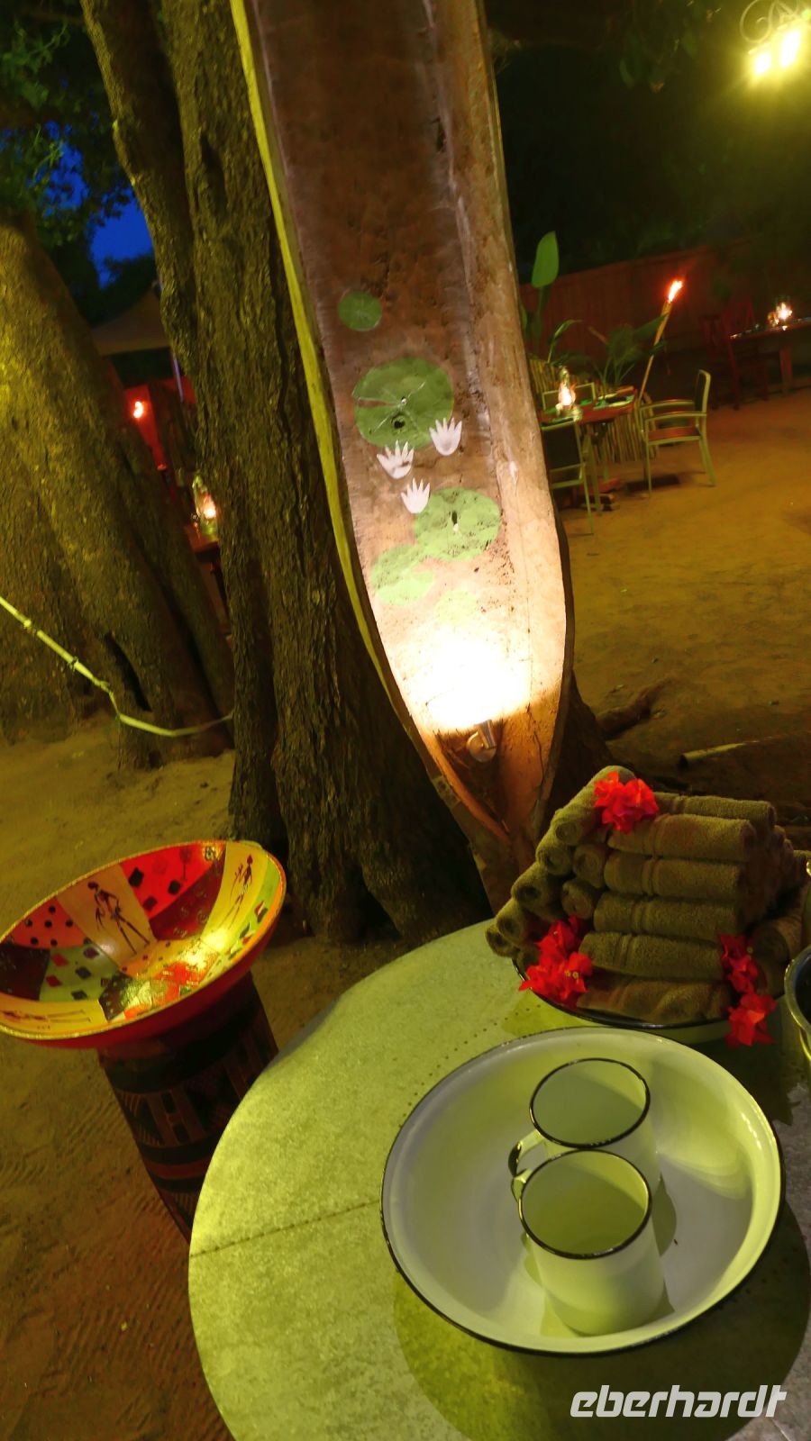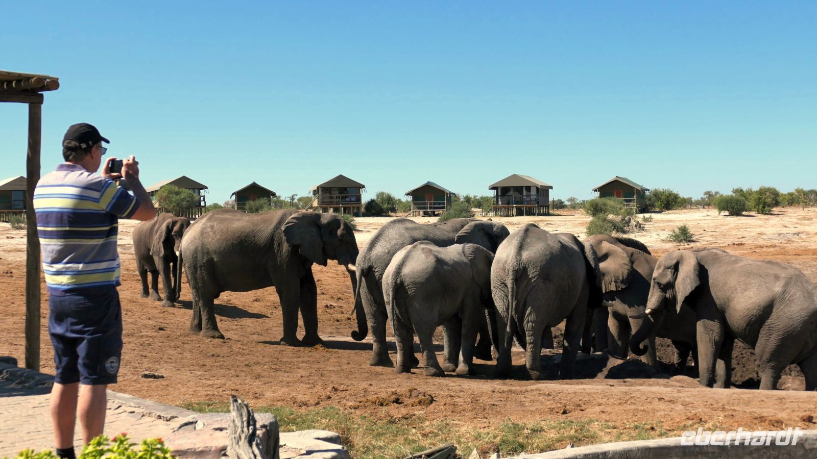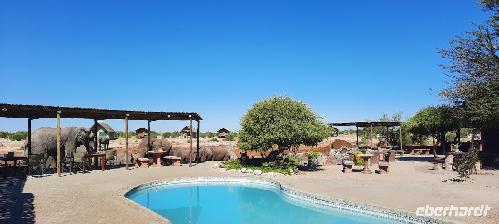 Diesen Tag begannen wir mit südafrikanischer Gelassenheit und mit einem Bingo-Spiel bei der Bestellung diverser Eierspeisen beim Frühstück, die länger auf sich warten ließen. Ja, das ist Afrika. Wir Europäer haben die Uhr, in Afrika hat man Zeit! Anschließend ging unsere Reise weiter. Heute war nur ein Fahrtag vorgesehen, aber warten wir es ab. Unverhofft kommt oft! Mit viele Potholes (Schlaglöcher) und teilweise auf nur zu erahnender Teerstraße truckten wir weiter.In den letzten 2 Jahren wurden zwar einige Löcher gestopft, aber der Teerstraßen wird trotzdem schmaler, aber die Straße breiter. Obwohl es eine wichtige Hauptroute ist, lässt die notwendige Ausbesserung der öffentlichen Straßen in Botswana aus Geldmangel auf sich warten. Die Strecke führte direkt durch das ebene Salzpfannengebiet, eine trockene Landschaft und flach wie weine Flunder. Strauße, Zebras und massig Esel waren ebenso unterwegs wie wir. Manche Zungen behaupten das Nationaltier Botswanas ist der Esel. Unterwegs passierten wir Ort Gweta. Der Name des Ortes stammt aus der Sprache der San und bedeutet so viel wie "wo die großen Frösche quaken". Früher war das ein sehr feuchtes Gebiet, heute absolut trocken und dürr. Die sonst üblichen regionalen Regen- und Flugzeiten werden immer seltener. Rechts neben der Straße verläuft eine Wasserpipeline mit Pumpstationen, die die wachsenden Dörfer in der Gegend mit Wasser versorgt. Elefanten haben aber ein unglaubliches Gespür, Wasseradern in trockenen Zeiten zu finden. Aller 200 bis 300 m Elefanten, die die Betonplatten der Pumpstationen einfach aufgebrochen haben und sich am frischen Wasser genüsslich taten. Ein alkoholfreier Elefanten-Shebeen (Pub) folgte dem nächsten und unsere Fotoapparate waren im Stress. Später sichteten wir ein überdimensionales Erdferkel, allerdings aus Beton. Bereits am Mittag erreichten wir Maun und kurze Zeit später unsere komfortable Thamalakane Lodge, welche am Ufer des gleichnamigen Flusses liegt. Leider war der Fluss komplett ausgetrocknet, Fahrten mit dem Boot oder Kanu nicht möglich. Also war Entspannung angesagt. Ob beim Lunch, Käffchen oder kühlem Bier auf der schattigen Terrasse oder im oder am Pool. Das leckere Buffet-Abendessen auf der wunderschönen Terrasse mit musikalischer Umrahmung durch das Personal wurde durch den fantastischen Sonnenuntergang perfekt.