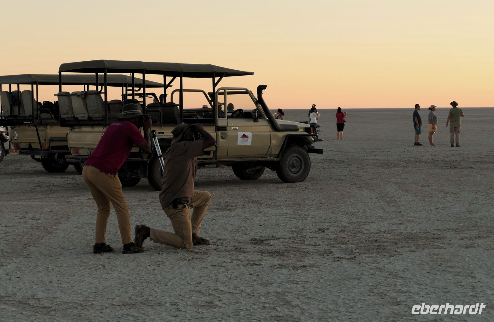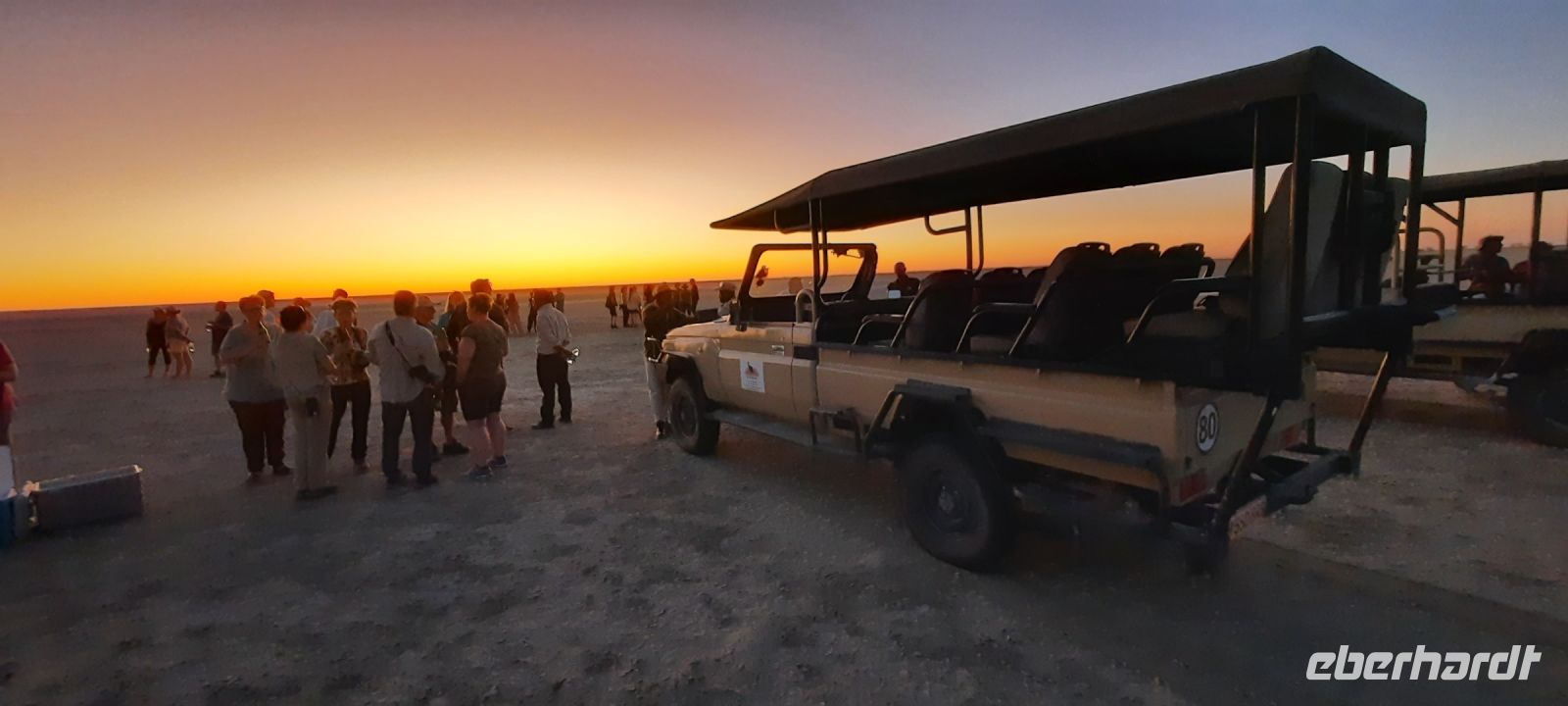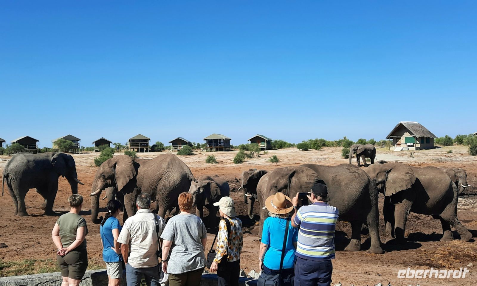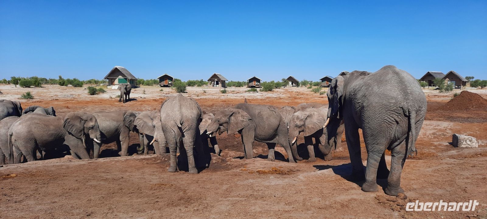 Neuer Tag, neue Taten - das war ab sofort der Leitspruch von Hartmut. Wegen der Veterinär-Checkpoints unterwegs, hatten wir ab sofort vorsorglich ein 2. Paar Schuhe im Handgepäck. In der hiesigen, neuen Shopping Mall deckten wir uns mit Pula ein, inspizierten den gut ausgestatteten Supermarkt und auch ein Sonnenhut wurde erworben. Denn der Winter eigentlich Einzug gehalten hatte, war es doch sehr warm und Klärchen strahlte intensiv. Auf gut ausgebauter Asphaltstraße fuhren wir Richtung Süden. Rechts und links flaches, trockenes Buschland sowie eine große landwirtschaftliche Nutzfläche einer Kooperative, die die Region mit Mais und Gemüse versorgt. Auch Tierrisches gab es zu sehen: Hornraben, Säbelantilopen, Paviane und Impalas sowie viel Elefanten Dung. Die Elefanten ließen natürlich nicht lange auf sich warten. Während einer kurzen Pause unterm Kameldorn Baum leistete uns ein Elefantenbulle (in ausreichender Distanz) Gesellschaft. Zur Mittagszeit steuerten wir die Elephant Sands Lodge an. Bereits auf der Zufahrt viel elefantistischer Verkehr. In der Region wird es von Jahr zu Jahr trockener, deshalb wissen Elefanten genau, wo noch Wasser zu finden ist. Das Wasserloch der Lodge ist zentraler Mittelpunkt, von allen Seiten kommen die Elefanten, wir sind von den Elefanten nur wenige Meter entfernt - großes Kino zum Mittagessen für uns! Dennoch haben wir auch die lustigen Zebramangusten und den kuschligen Habichtsadler noch im Blick. Unser heutiges Etappenziel war das Dorf Nata, welches wir nach kurzer Fahrt erreichten und somit auch unsere gleichnamige Lodge. Nach einer kurzen Auszeit folgte der nächste Programmpunkt. Ein Ausflug in die Sowa Pan, um den Sonnenuntergang nicht zu verpassen. Die Sowa Pan ist neben der Nxai und Ntwetwe Pan ein Teil der Makgadikgadi-Salzpfannen, die ineinander über gehen. Das geschützte Gebiet umfasst ca. 12.000 km², das weltweit größte Salzpfannensystem. Hier gibt es keine Straßen, ausgetrocknete Spuren. Unendliche, ebene Weite - unvorstellbar, dass früher hier ein "Riesensee" (60.000 km²) war, der aber verdunstete. Wir sahen unzählige Gnus, Riesentrappen, Gackeltrappe und Zebras. Leider war die Blüte der Hoodia (Kaktus). Eine faszinierender Pflanze mit magischen Kräften. Temperaturen von unter 0° C bis über 40 ° C hält sie Stand. Auch die San (Buschmänner) nutzen die Pflanze auf ihren langen Wanderungen gegen Durst und Hunger als sogenannten Appetitzügler. Leider wird das Gebiet seit einigen Jahren immer trockener. Selbst die fast vegetationslose Sowa Pan (Salzpfanne) führt kein Wasser mehr, sodass sich die Wasservögel wie Flamingos und Pelikane nach Namibia zurückgezogen haben. Dennoch ist die Landschaft magisch: bis zum Horizont erstreckt sich eine unendlich scheinende kahle, weiße Ebene. Mit vielen anderen und einem passenden Getränk genießen wir den Moment als die Sonne am Horizont verschwindet. Beim gemeinsamen Abendessen an einer romantisch beleuchteten Tafel lassen wir den ereignisreichen Tag ausklingen.