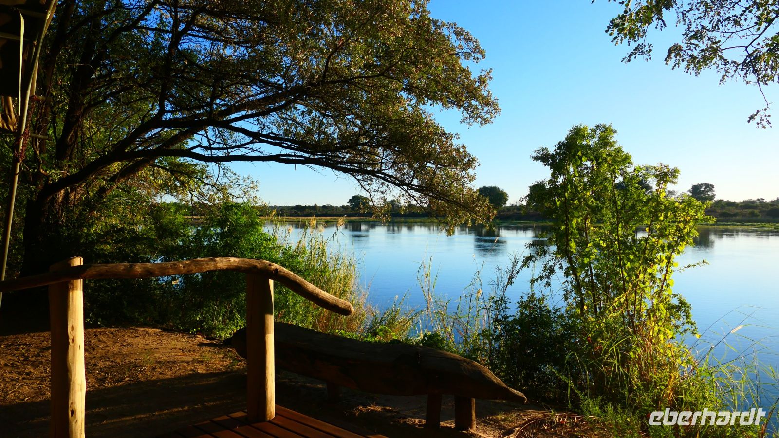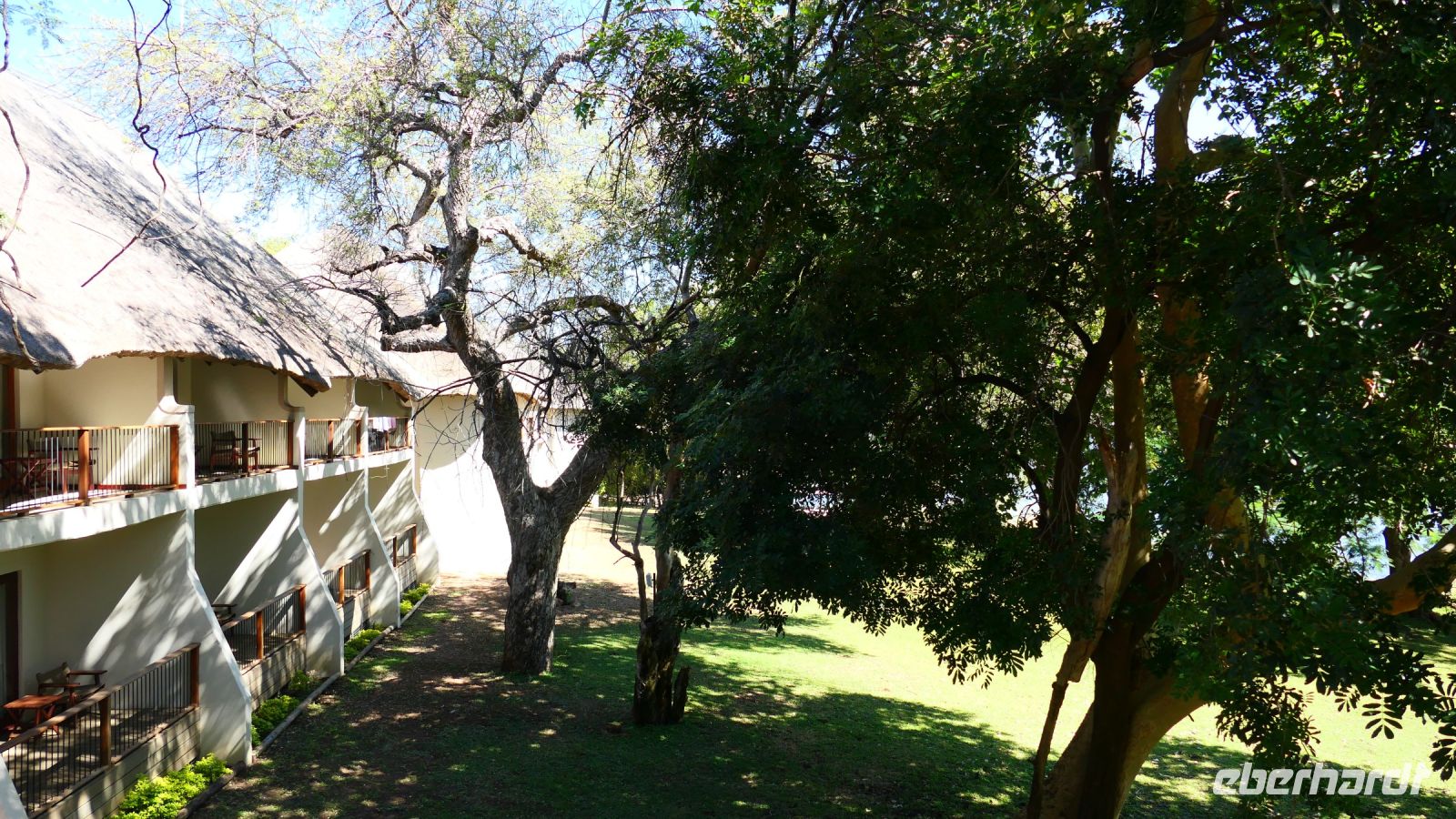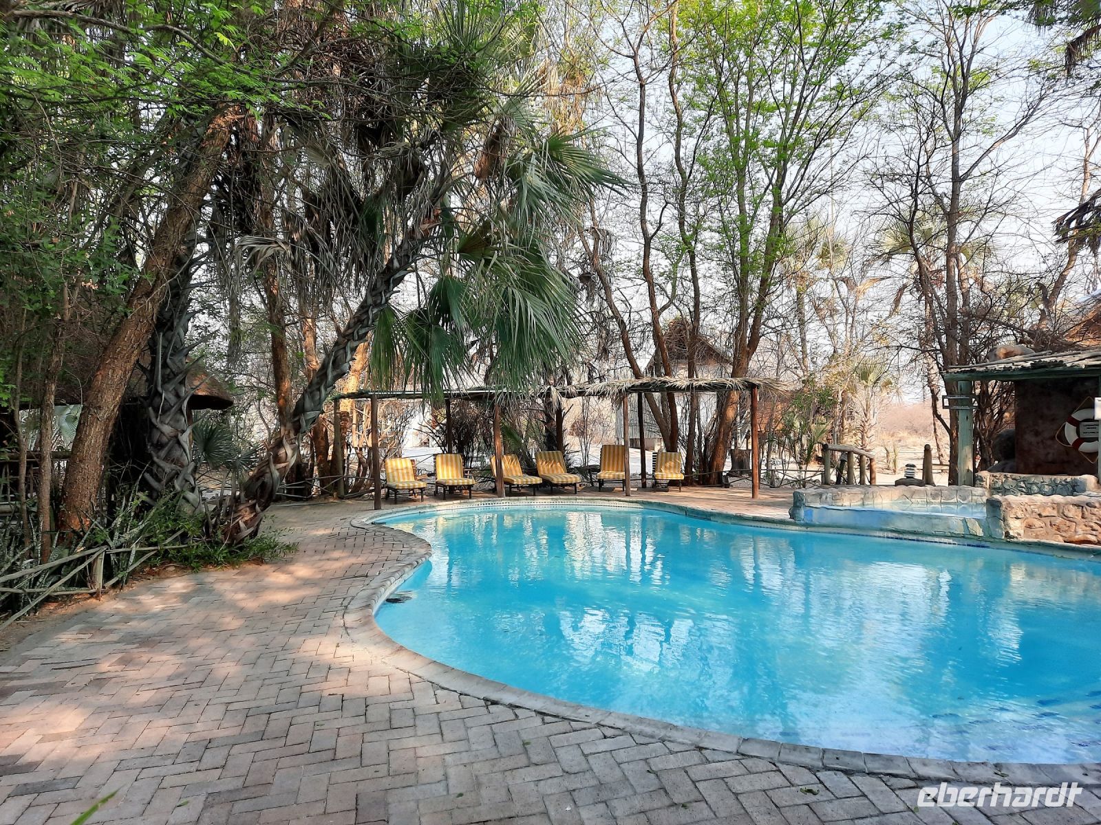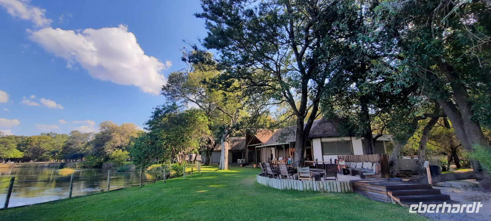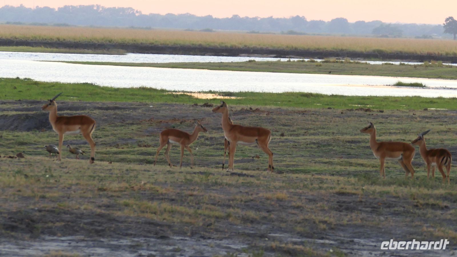 entspringt und später in den Sambesi fließt. Am Unterlauf (an der Grenze zu Botswana Delta) wird der Fluss dann Linyanti und später Chobe genannt - 3 Namen für einen Fluss. Wenn der Sambesi zu viel Wasser führt, ändert der Kwando/Linyanti/Chobe seine Richtung und fließt wieder zurück. Am frühen Nachmittag checkten wir für die nächsten beiden Nächte in die wildromantische Namushasha Lodge am Ufer des Kwando ein. Von unseren Terrassen konnten wir alsbald Flusspferde und Krokodile beobachten, auf den Dächern beobachten Ibise uns. Vorsicht vor Hippos & Crocs angesagt! In der freien Zeit bis zum Abendessen war Relaxen angesagt, beim Durchstreifen des wunderschönen Gartens oder auf der Aussichtsterrasse bei einem kühlen Getränk. Am Abend bedienten wir uns am super leckeren Buffet, genossen den lauen Sommerabend auf der Terrasse unterm Sternenzelt.