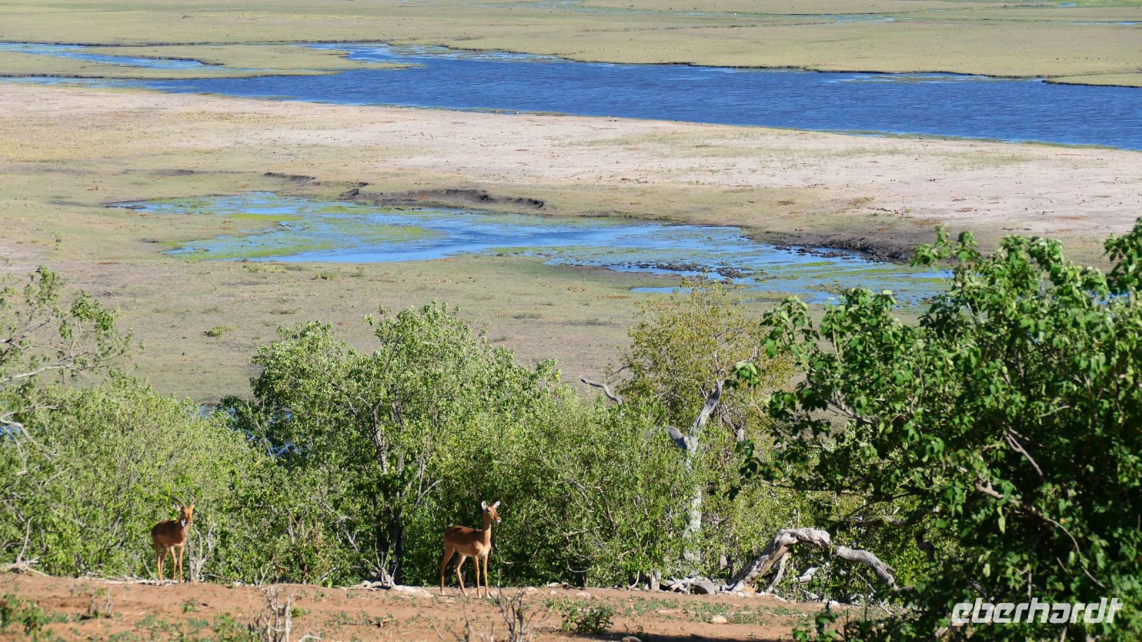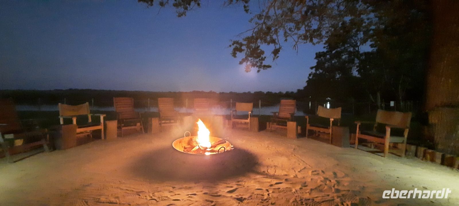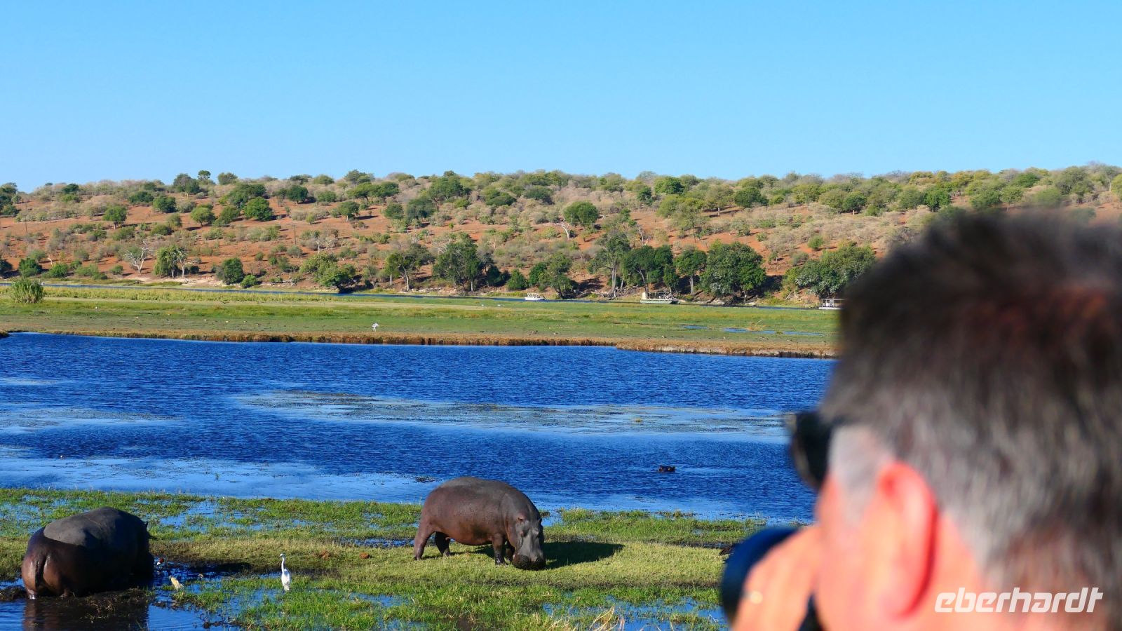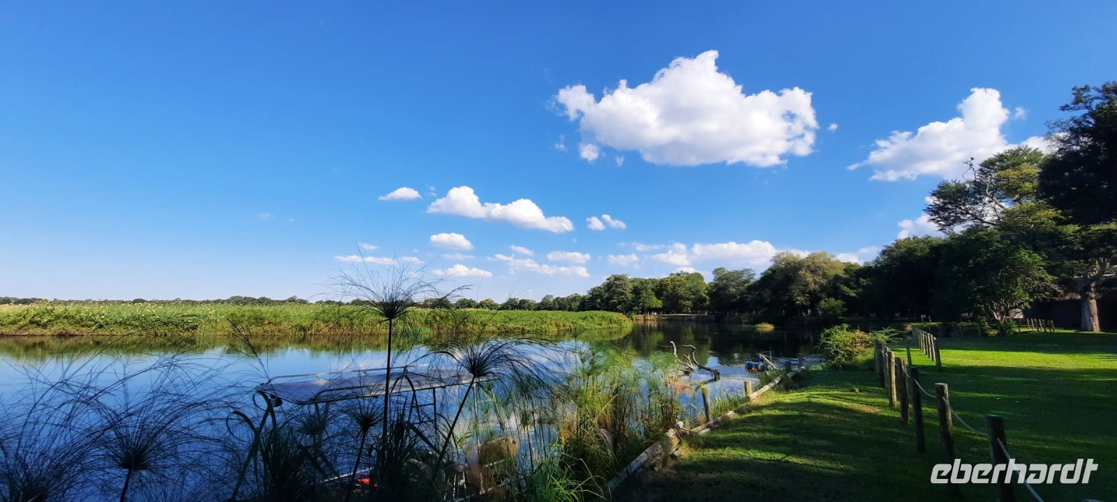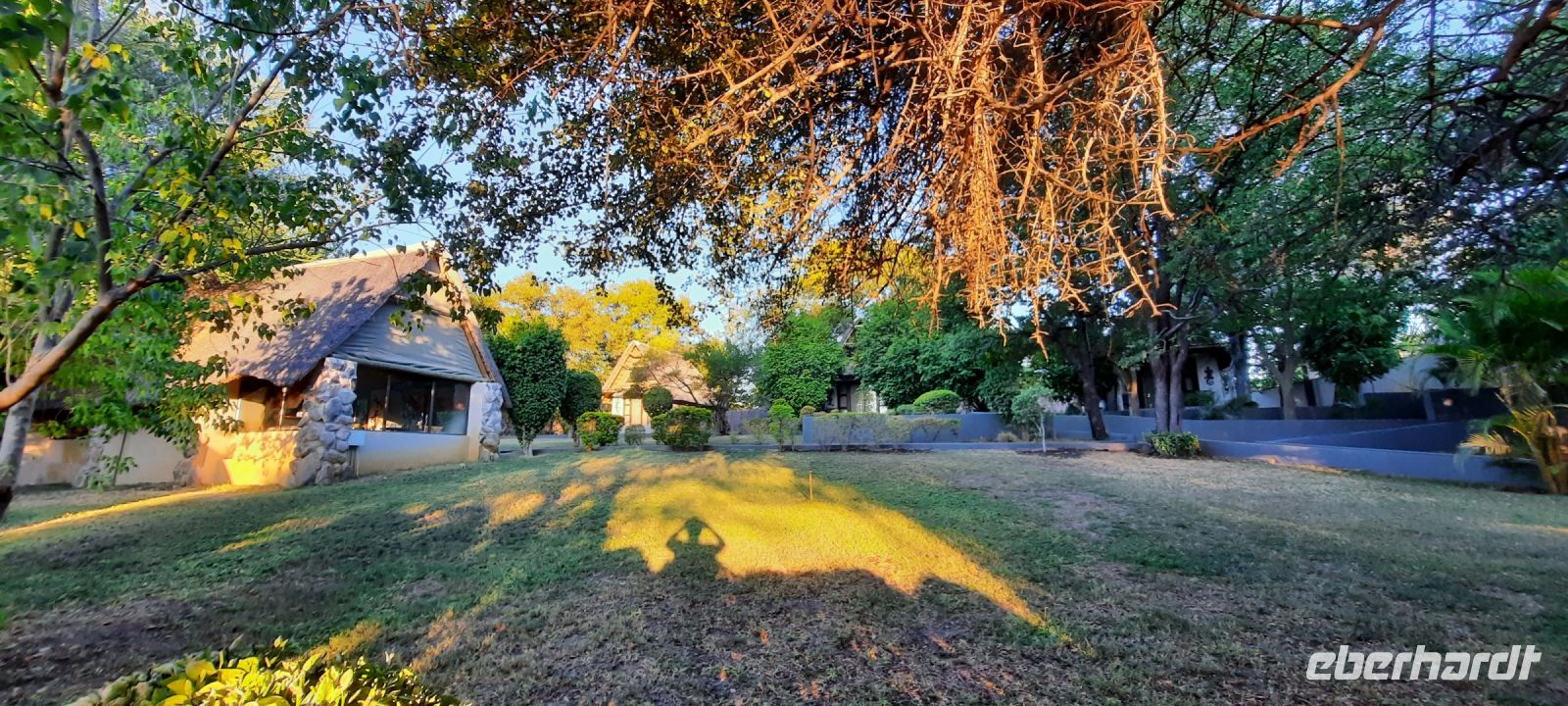 entspringt und später in den Sambesi fließt. Am Unterlauf (an der Grenze zu Botswana Delta) wird der Fluss dann Linyanti und später Chobe genannt - 3 Namen für einen Fluss. Wenn der Sambesi zu viel Wasser führt, ändert der Kwando/Linyanti/Chobe seine Richtung und fließt wieder zurück. Am frühen Nachmittag checkten wir für die nächsten beiden Nächte in die wildromantische Namushasha Lodge am Ufer des Kwando ein. Von unseren Terrassen konnten wir alsbald Flusspferde und Krokodile beobachten, auf den Dächern beobachten Ibise uns. Vorsicht vor Hippos & Crocs angesagt! In der freien Zeit bis zum Abendessen war Relaxen angesagt, beim Durchstreifen des wunderschönen Gartens oder auf der Aussichtsterrasse bei einem kühlen Getränk. Am Abend bedienten wir uns am super leckeren Buffet, genossen den lauen Sommerabend auf der Terrasse unterm Sternenzelt.