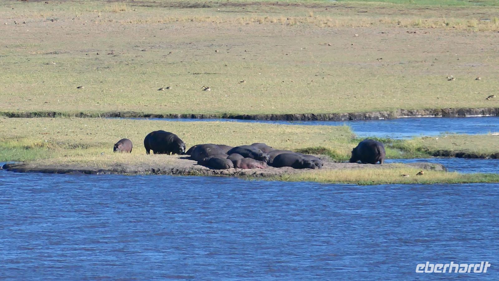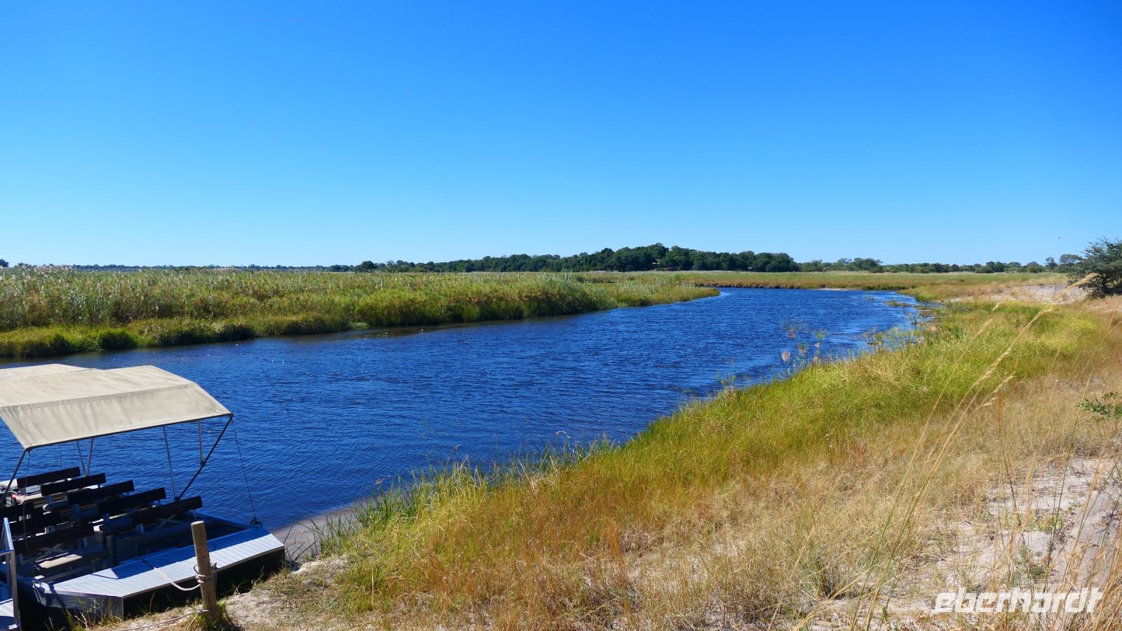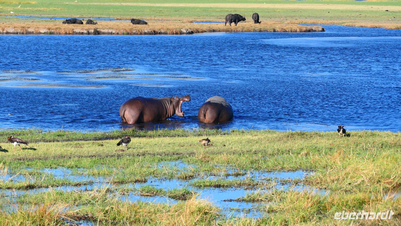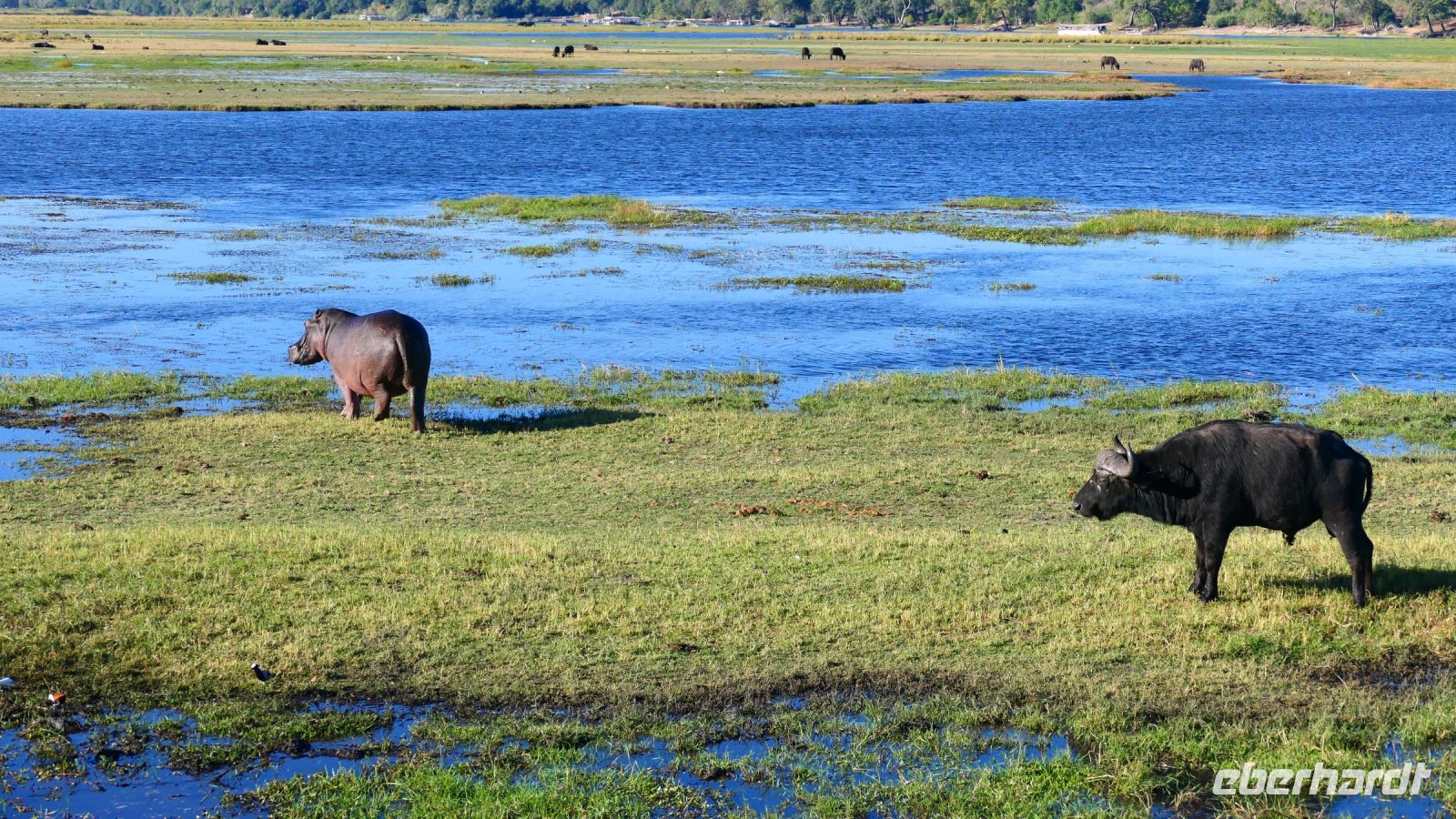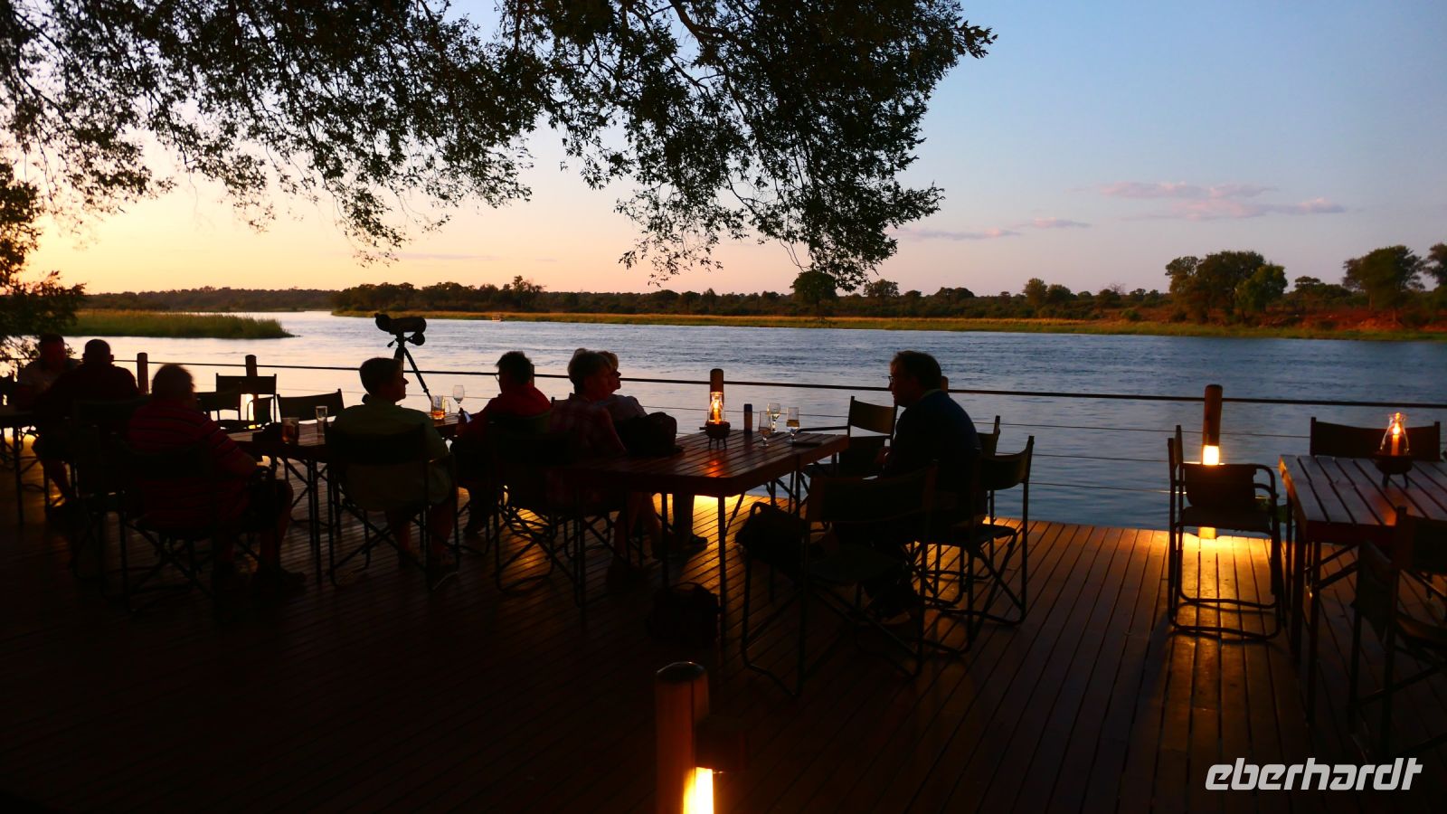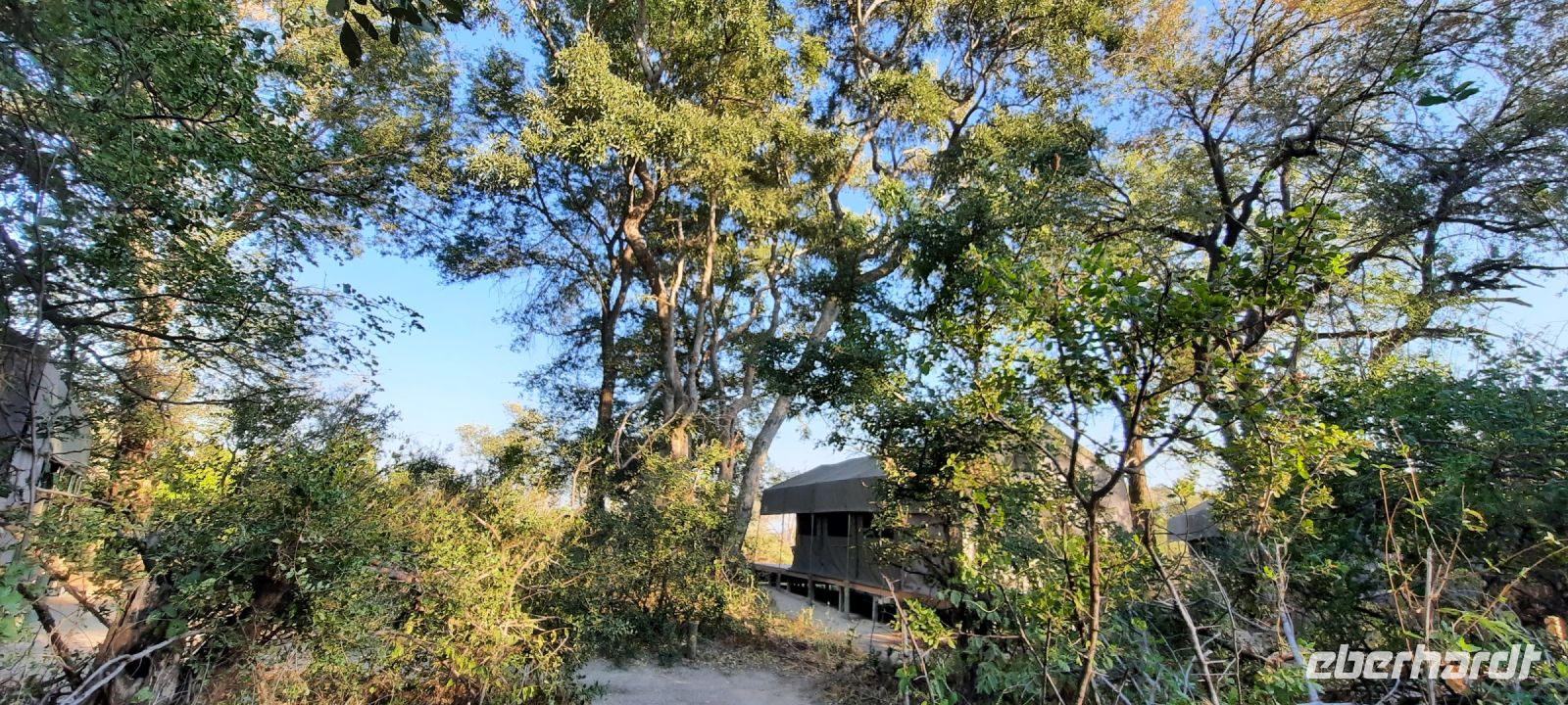 entspringt und später in den Sambesi fließt. Am Unterlauf (an der Grenze zu Botswana Delta) wird der Fluss dann Linyanti und später Chobe genannt - 3 Namen für einen Fluss. Wenn der Sambesi zu viel Wasser führt, ändert der Kwando/Linyanti/Chobe seine Richtung und fließt wieder zurück. Am frühen Nachmittag checkten wir für die nächsten beiden Nächte in die wildromantische Namushasha Lodge am Ufer des Kwando ein. Von unseren Terrassen konnten wir alsbald Flusspferde und Krokodile beobachten, auf den Dächern beobachten Ibise uns. Vorsicht vor Hippos & Crocs angesagt! In der freien Zeit bis zum Abendessen war Relaxen angesagt, beim Durchstreifen des wunderschönen Gartens oder auf der Aussichtsterrasse bei einem kühlen Getränk. Am Abend bedienten wir uns am super leckeren Buffet, genossen den lauen Sommerabend auf der Terrasse unterm Sternenzelt.