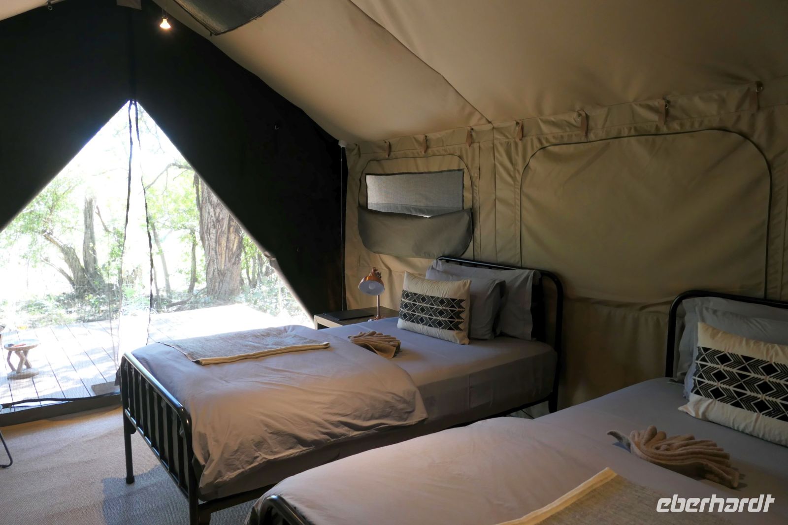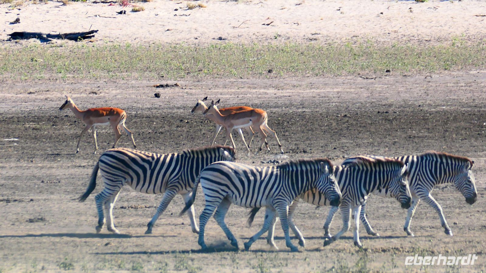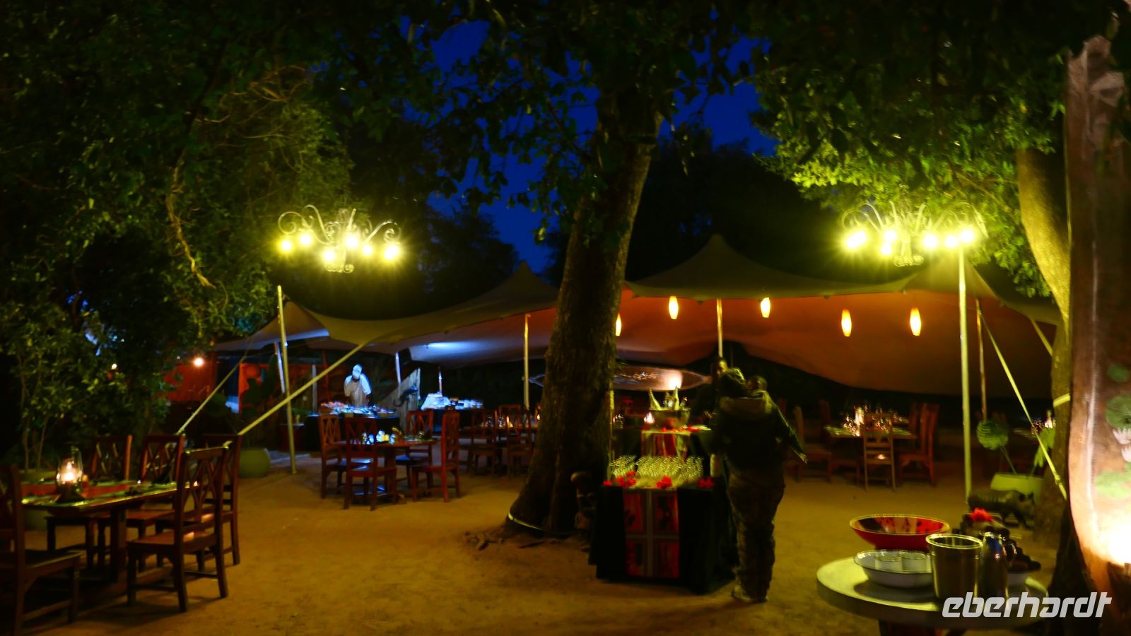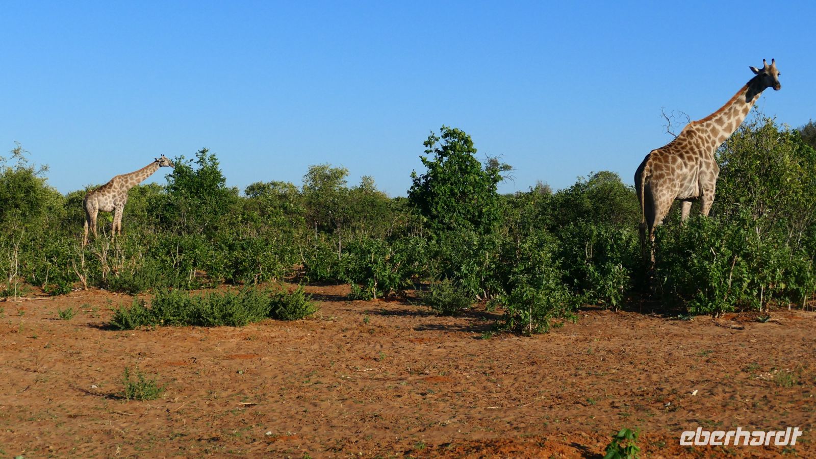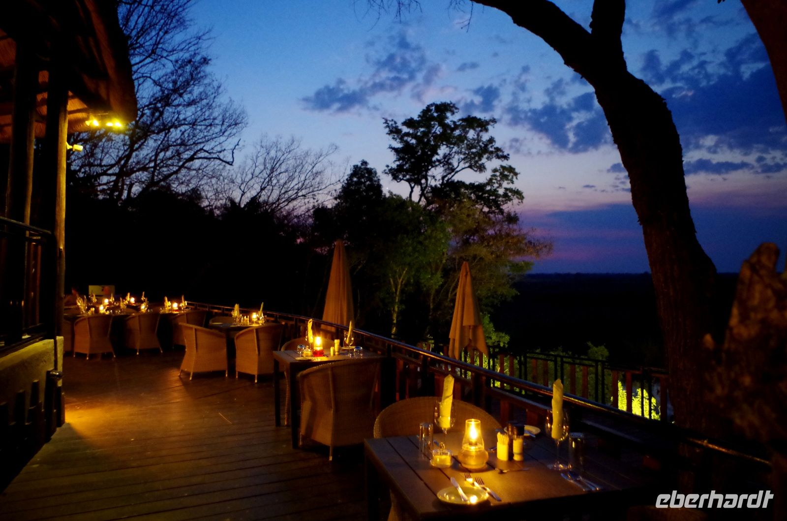 entspringt und später in den Sambesi fließt. Am Unterlauf (an der Grenze zu Botswana Delta) wird der Fluss dann Linyanti und später Chobe genannt - 3 Namen für einen Fluss. Wenn der Sambesi zu viel Wasser führt, ändert der Kwando/Linyanti/Chobe seine Richtung und fließt wieder zurück. Am frühen Nachmittag checkten wir für die nächsten beiden Nächte in die wildromantische Namushasha Lodge am Ufer des Kwando ein. Von unseren Terrassen konnten wir alsbald Flusspferde und Krokodile beobachten, auf den Dächern beobachten Ibise uns. Vorsicht vor Hippos & Crocs angesagt! In der freien Zeit bis zum Abendessen war Relaxen angesagt, beim Durchstreifen des wunderschönen Gartens oder auf der Aussichtsterrasse bei einem kühlen Getränk. Am Abend bedienten wir uns am super leckeren Buffet, genossen den lauen Sommerabend auf der Terrasse unterm Sternenzelt.
