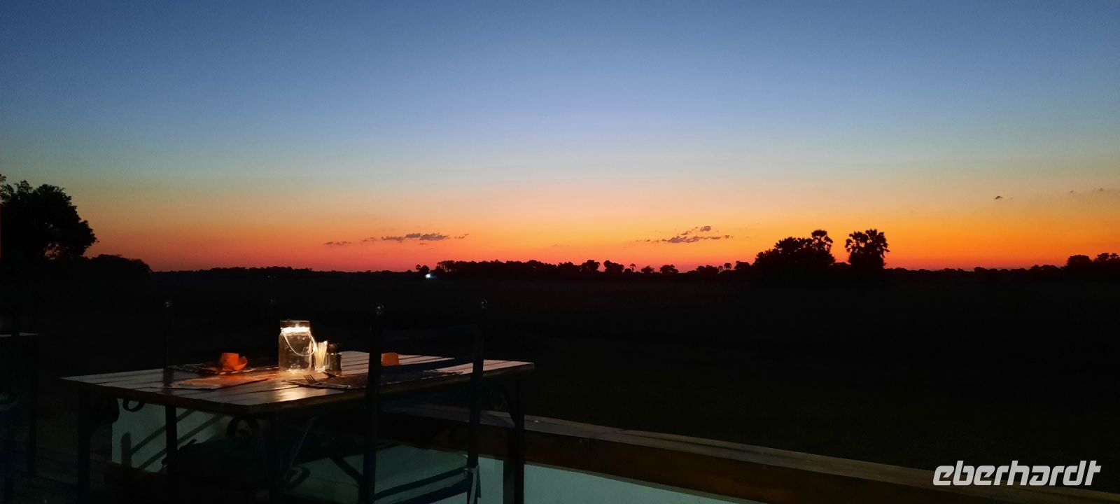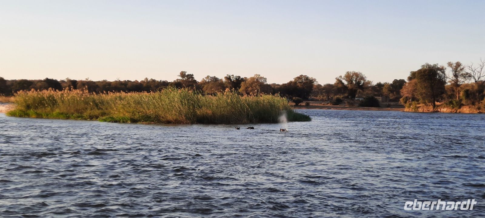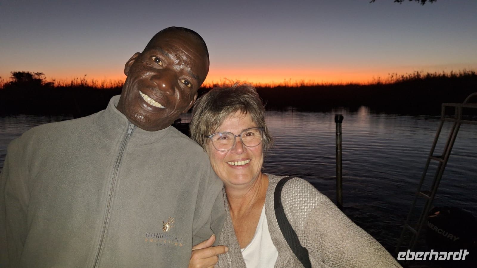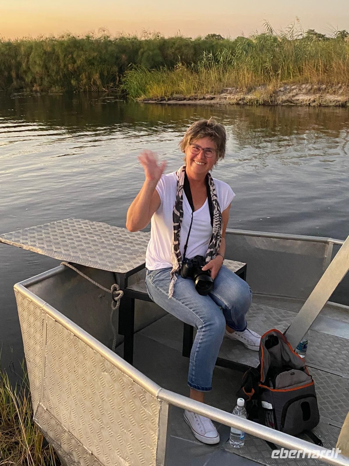Die ersten warmen Sonnenstrahlen kitzelten unsere Nasen, als wir uns zum Frühstück auf der Terrasse trafen. Die Nacht war frischer als bisher. Die Winterzeit hielt Einzug, früher Sonnenauf- und -untergang, kältere Nächte. Gut gestärkt fuhren wir ein kurzes Stück zum Mahango Park, einem Teil des Bwabwata Nationalparks, der sich am gegenüberliegenden Ufer des Okavango befindet. Wir passierten das Tor und sahen auf den halbfeuchten Ebenen die ersten Tiere: Viele, viele Zebras, Warzenschweine, Impalas, Sporengänse, Reiher - später Krokodile, Letschwe Antipolen, Paviane, Kampfadler und und und. Auch die ganz andere Landschaft hier begeisterte uns. Die Freizeit bis zum Nachmittag verbrachten wir in unserer schönen Lodge. Der ein oder andere konnte der gutbürgerlichen Hausmannskost mit Currywurst & Co nicht widerstehen, andere relaxten am Pool oder sonnten sich auf der Terrasse. Am Nachmittag bestiegen wir abermals ein Boot, eigens für unsere Gruppe. Gemütlich schipperten wir flussabwärts bis zur Grenze des Mahango Nationalparks, dann in die entgegen gesetzte Richtung. Wir beobachteten Flusspferde, Sporengänse, Graureiher, hautnah ein riesiges Krokodil, der Schrei des Fischadlers war nicht zu überhören, eine Elefantenherde mit Jungtieren kam zum Flussufer, eine Hippo-Familie beäugte uns neugierig aus dem Wasser. Diese einmalige Kulisse bot nun den passenden Rahmen, um die Korken knallen zu lassen und auf unser Jubiläumspaar anzustoßen. Vielen Dank und auf weitere 25 Jahre! Im Sonnenuntergang gesellte sich noch ein einsamer Elefantenbulle an Ufer und wir schipperten zurück. Nach dem wiederum delikaten Abendessen ließen wir den schönen Tag am Okavango ausklingen, in dem sich der Mond spiegelte.