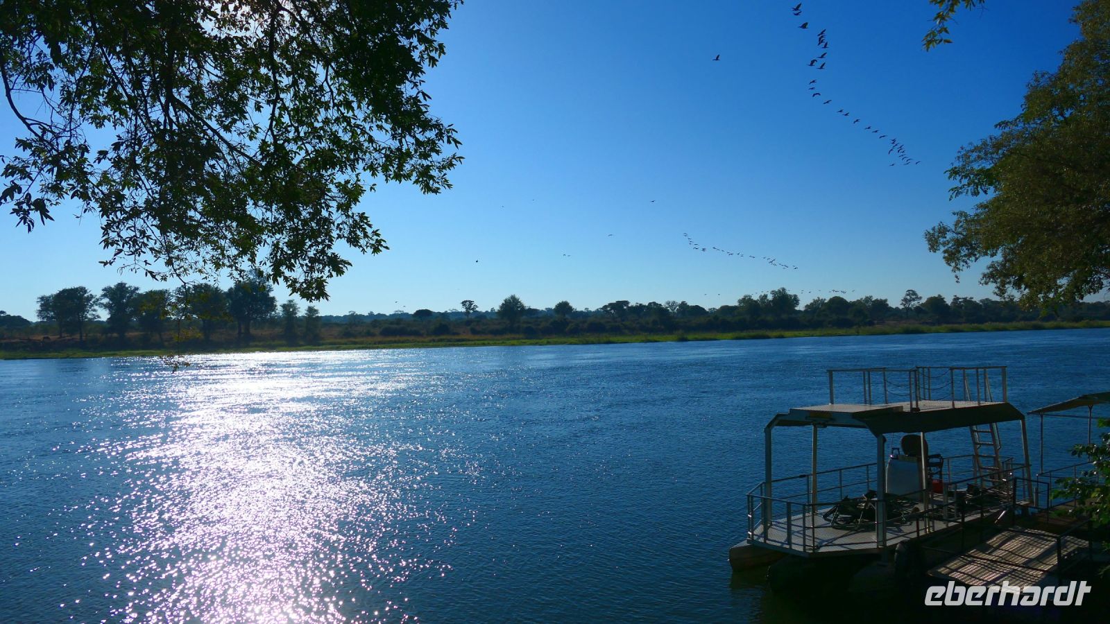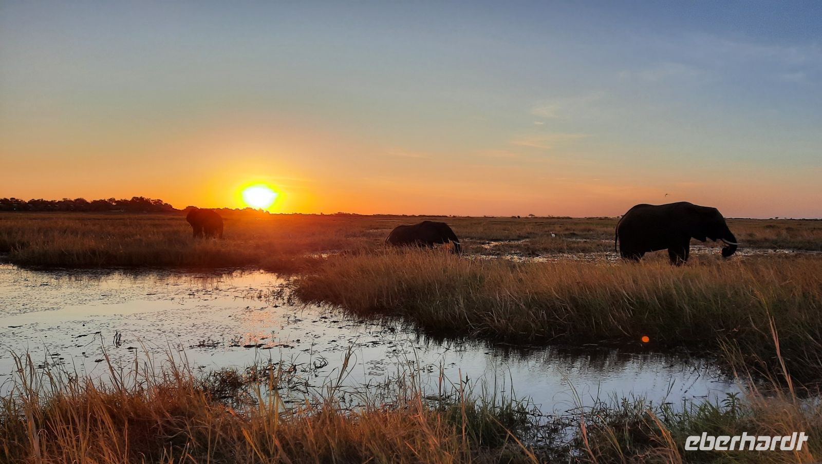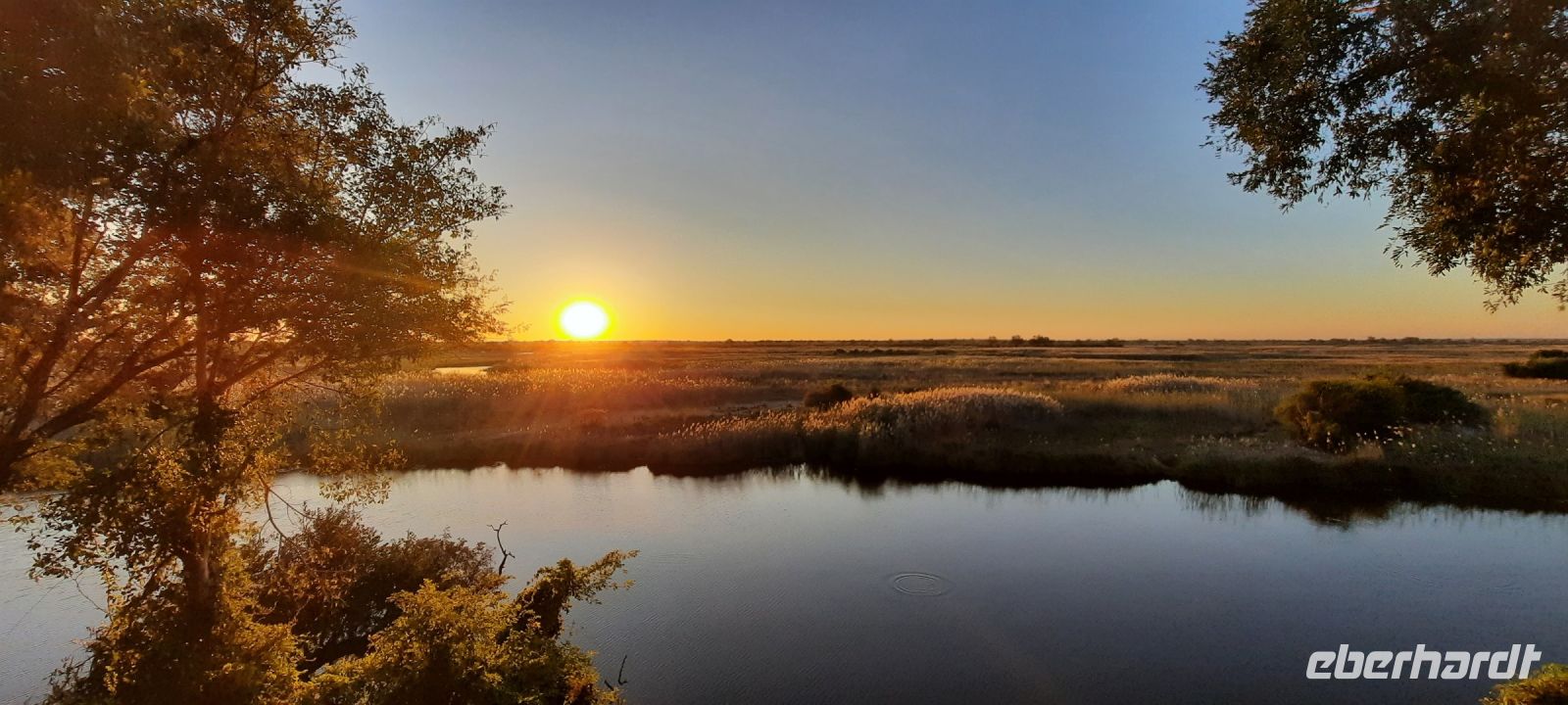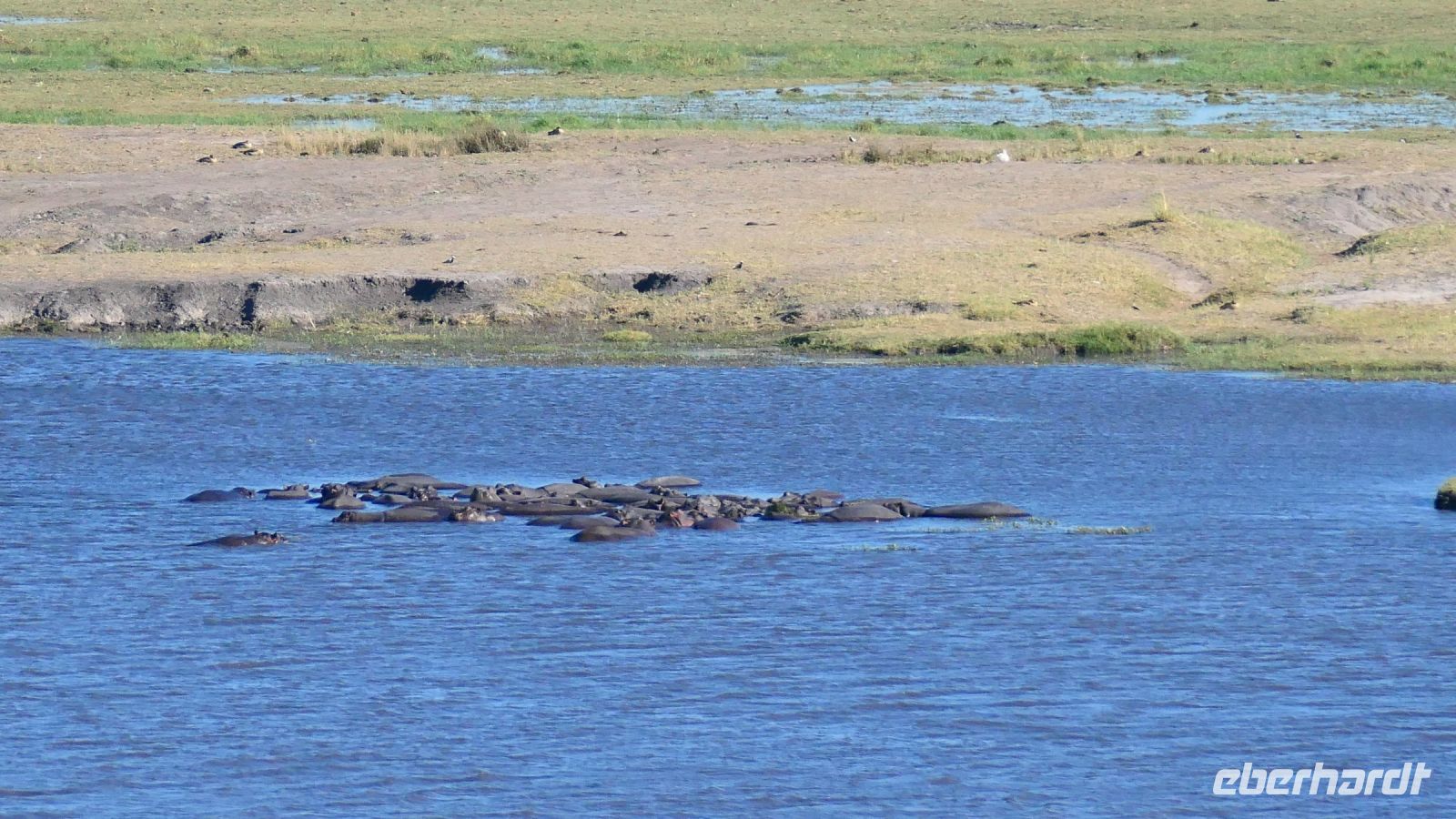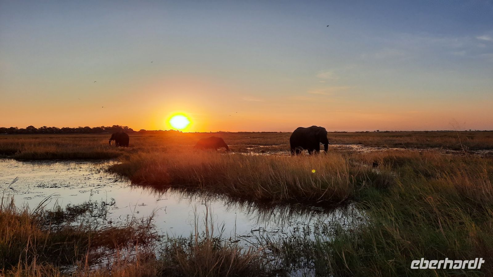 Die ersten warmen Sonnenstrahlen kitzelten unsere Nasen, als wir uns zum Frühstück auf der Terrasse trafen. Die Nacht war frischer als bisher. Die Winterzeit hielt Einzug, früher Sonnenauf- und -untergang, kältere Nächte. Gut gestärkt fuhren wir ein kurzes Stück zum Mahango Park, einem Teil des Bwabwata Nationalparks, der sich am gegenüberliegenden Ufer des Okavango befindet. Wir passierten das Tor und sahen auf den halbfeuchten Ebenen die ersten Tiere: Viele, viele Zebras, Warzenschweine, Impalas, Sporengänse, Reiher - später Krokodile, Letschwe Antipolen, Paviane, Kampfadler und und und. Auch die ganz andere Landschaft hier begeisterte uns. Die Freizeit bis zum Nachmittag verbrachten wir in unserer schönen Lodge. Der ein oder andere konnte der gutbürgerlichen Hausmannskost mit Currywurst & Co nicht widerstehen, andere relaxten am Pool oder sonnten sich auf der Terrasse. Am Nachmittag bestiegen wir abermals ein Boot, eigens für unsere Gruppe. Gemütlich schipperten wir flussabwärts bis zur Grenze des Mahango Nationalparks, dann in die entgegen gesetzte Richtung. Wir beobachteten Flusspferde, Sporengänse, Graureiher, hautnah ein riesiges Krokodil, der Schrei des Fischadlers war nicht zu überhören, eine Elefantenherde mit Jungtieren kam zum Flussufer, eine Hippo-Familie beäugte uns neugierig aus dem Wasser. Diese einmalige Kulisse bot nun den passenden Rahmen, um die Korken knallen zu lassen und auf unser Jubiläumspaar anzustoßen. Vielen Dank und auf weitere 25 Jahre! Im Sonnenuntergang gesellte sich noch ein einsamer Elefantenbulle an Ufer und wir schipperten zurück. Nach dem wiederum delikaten Abendessen ließen wir den schönen Tag am Okavango ausklingen, in dem sich der Mond spiegelte.
