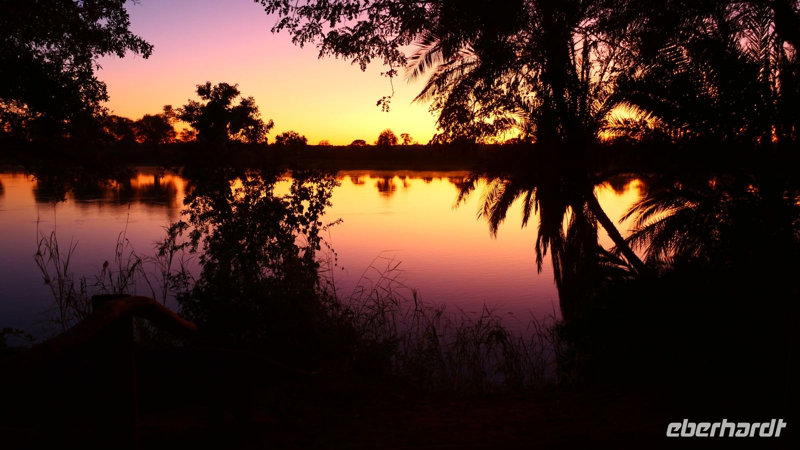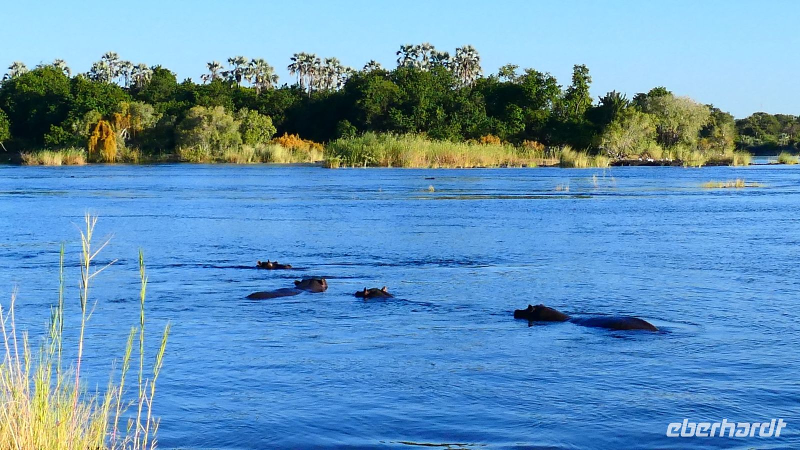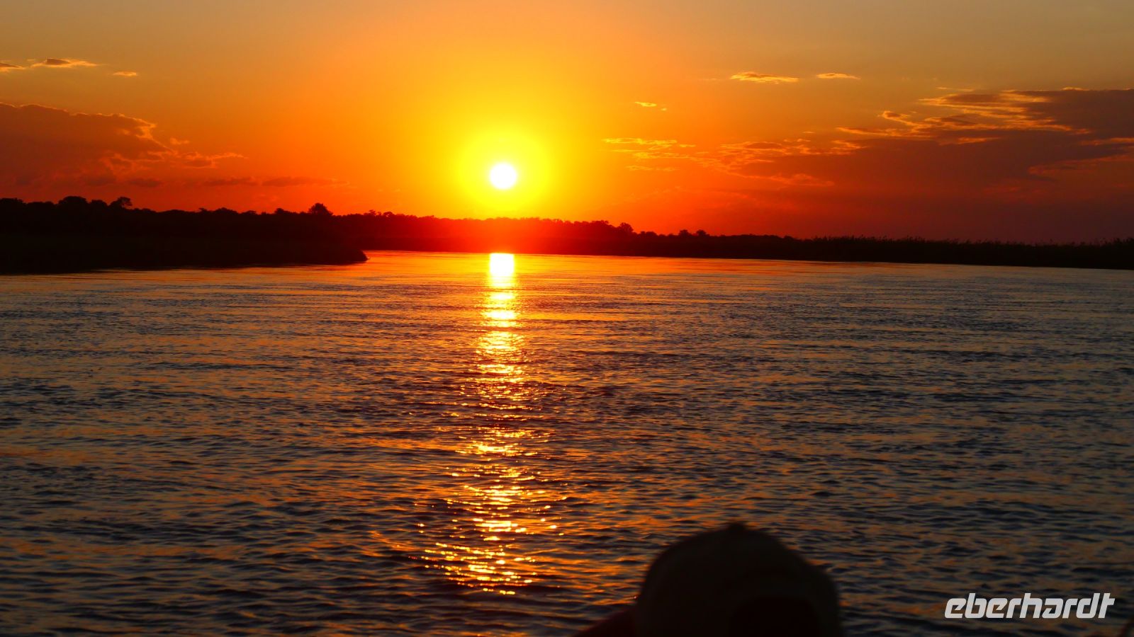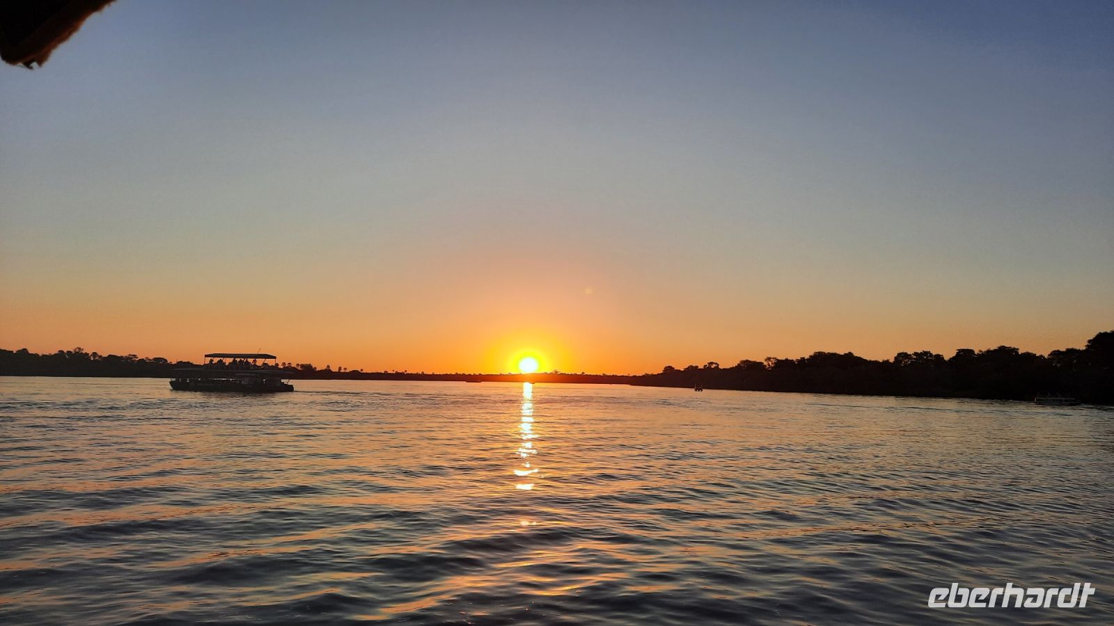 Die ersten warmen Sonnenstrahlen kitzelten unsere Nasen, als wir uns zum Frühstück auf der Terrasse trafen. Die Nacht war frischer als bisher. Die Winterzeit hielt Einzug, früher Sonnenauf- und -untergang, kältere Nächte. Gut gestärkt fuhren wir ein kurzes Stück zum Mahango Park, einem Teil des Bwabwata Nationalparks, der sich am gegenüberliegenden Ufer des Okavango befindet. Wir passierten das Tor und sahen auf den halbfeuchten Ebenen die ersten Tiere: Viele, viele Zebras, Warzenschweine, Impalas, Sporengänse, Reiher - später Krokodile, Letschwe Antipolen, Paviane, Kampfadler und und und. Auch die ganz andere Landschaft hier begeisterte uns. Die Freizeit bis zum Nachmittag verbrachten wir in unserer schönen Lodge. Der ein oder andere konnte der gutbürgerlichen Hausmannskost mit Currywurst & Co nicht widerstehen, andere relaxten am Pool oder sonnten sich auf der Terrasse. Am Nachmittag bestiegen wir abermals ein Boot, eigens für unsere Gruppe. Gemütlich schipperten wir flussabwärts bis zur Grenze des Mahango Nationalparks, dann in die entgegen gesetzte Richtung. Wir beobachteten Flusspferde, Sporengänse, Graureiher, hautnah ein riesiges Krokodil, der Schrei des Fischadlers war nicht zu überhören, eine Elefantenherde mit Jungtieren kam zum Flussufer, eine Hippo-Familie beäugte uns neugierig aus dem Wasser. Diese einmalige Kulisse bot nun den passenden Rahmen, um die Korken knallen zu lassen und auf unser Jubiläumspaar anzustoßen. Vielen Dank und auf weitere 25 Jahre! Im Sonnenuntergang gesellte sich noch ein einsamer Elefantenbulle an Ufer und wir schipperten zurück. Nach dem wiederum delikaten Abendessen ließen wir den schönen Tag am Okavango ausklingen, in dem sich der Mond spiegelte.