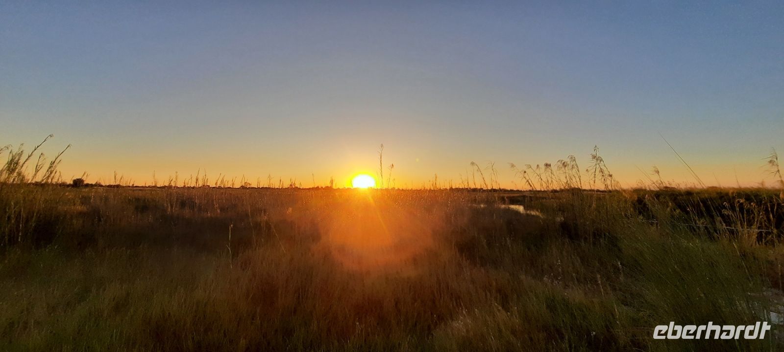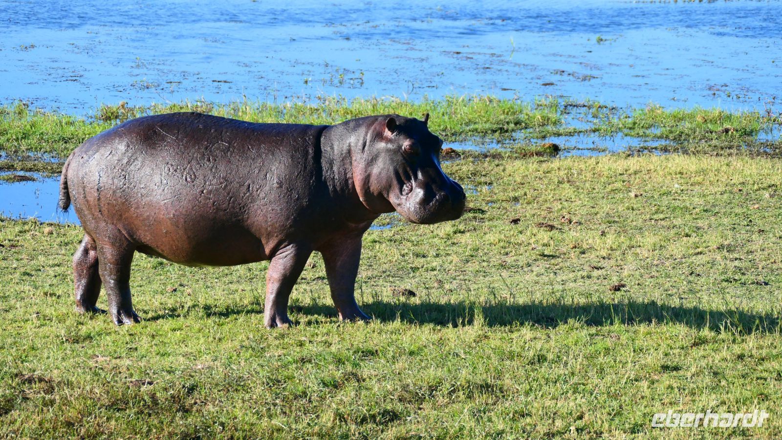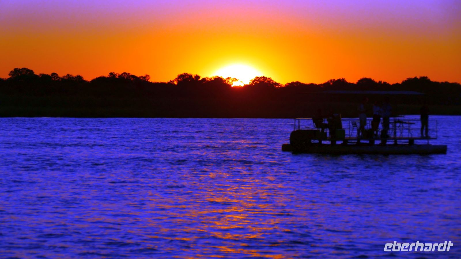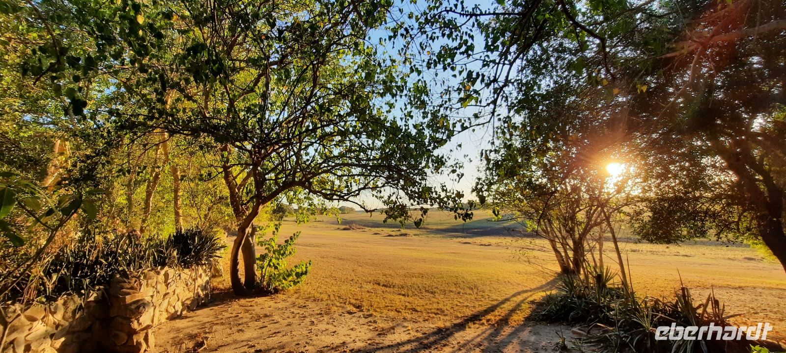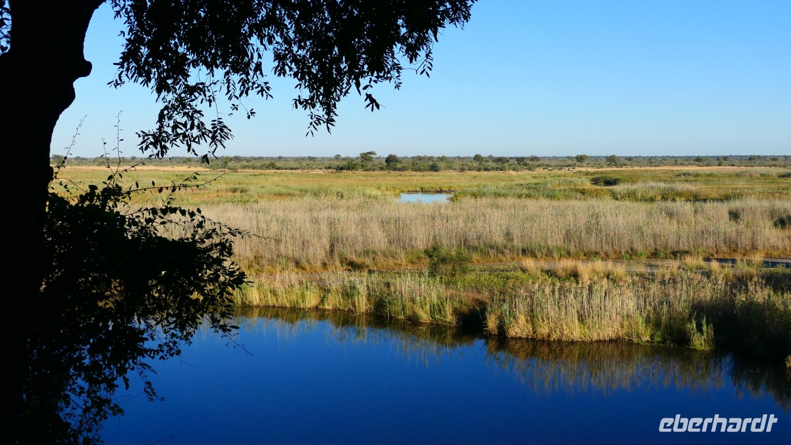 Die ersten warmen Sonnenstrahlen kitzelten unsere Nasen, als wir uns zum Frühstück auf der Terrasse trafen. Die Nacht war frischer als bisher. Die Winterzeit hielt Einzug, früher Sonnenauf- und -untergang, kältere Nächte. Gut gestärkt fuhren wir ein kurzes Stück zum Mahango Park, einem Teil des Bwabwata Nationalparks, der sich am gegenüberliegenden Ufer des Okavango befindet. Wir passierten das Tor und sahen auf den halbfeuchten Ebenen die ersten Tiere: Viele, viele Zebras, Warzenschweine, Impalas, Sporengänse, Reiher - später Krokodile, Letschwe Antipolen, Paviane, Kampfadler und und und. Auch die ganz andere Landschaft hier begeisterte uns. Die Freizeit bis zum Nachmittag verbrachten wir in unserer schönen Lodge. Der ein oder andere konnte der gutbürgerlichen Hausmannskost mit Currywurst & Co nicht widerstehen, andere relaxten am Pool oder sonnten sich auf der Terrasse. Am Nachmittag bestiegen wir abermals ein Boot, eigens für unsere Gruppe. Gemütlich schipperten wir flussabwärts bis zur Grenze des Mahango Nationalparks, dann in die entgegen gesetzte Richtung. Wir beobachteten Flusspferde, Sporengänse, Graureiher, hautnah ein riesiges Krokodil, der Schrei des Fischadlers war nicht zu überhören, eine Elefantenherde mit Jungtieren kam zum Flussufer, eine Hippo-Familie beäugte uns neugierig aus dem Wasser. Diese einmalige Kulisse bot nun den passenden Rahmen, um die Korken knallen zu lassen und auf unser Jubiläumspaar anzustoßen. Vielen Dank und auf weitere 25 Jahre! Im Sonnenuntergang gesellte sich noch ein einsamer Elefantenbulle an Ufer und wir schipperten zurück. Nach dem wiederum delikaten Abendessen ließen wir den schönen Tag am Okavango ausklingen, in dem sich der Mond spiegelte.
