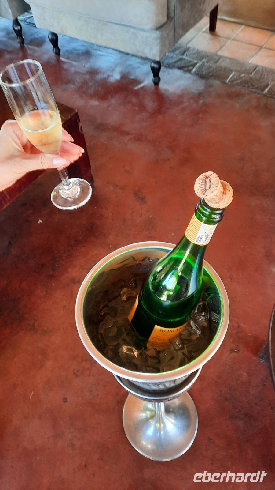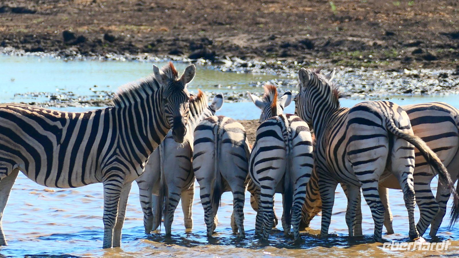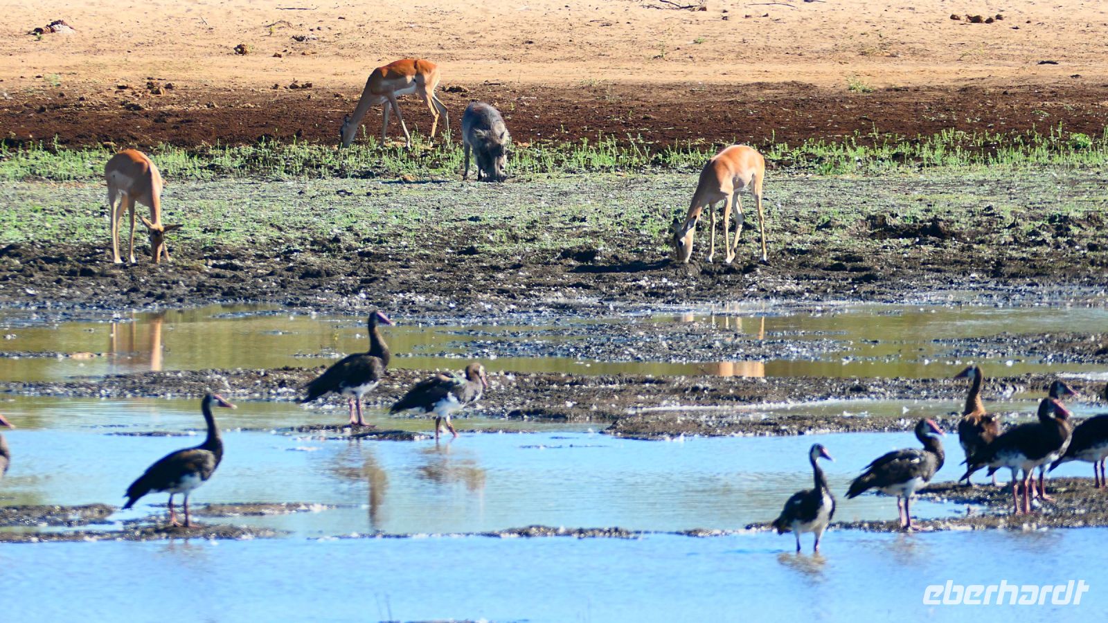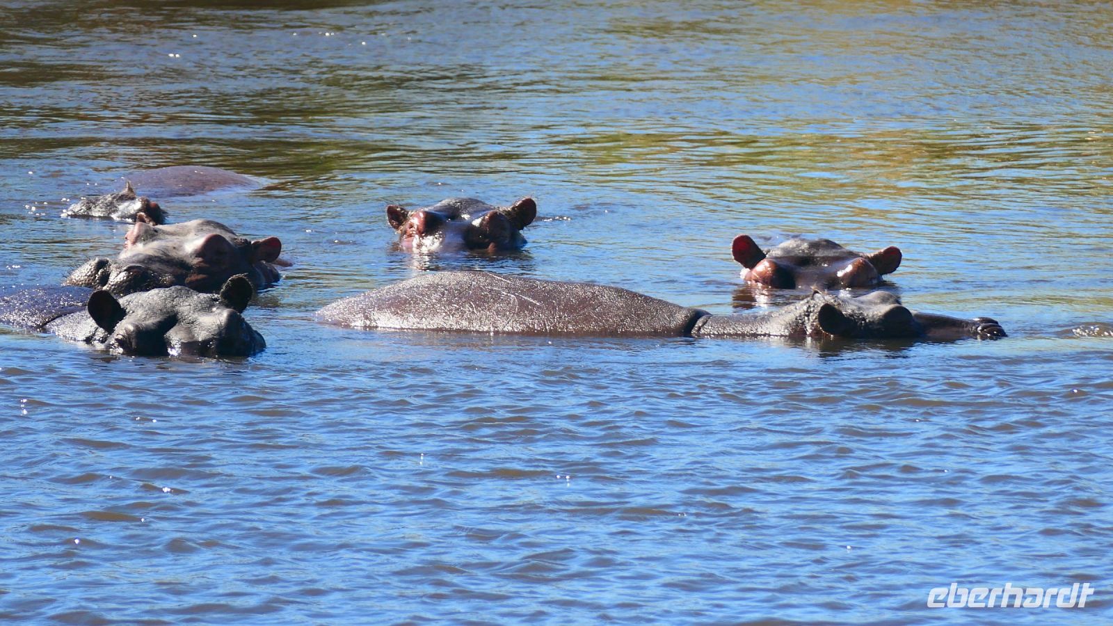Die ersten warmen Sonnenstrahlen kitzelten unsere Nasen, als wir uns zum Frühstück auf der Terrasse trafen. Die Nacht war frischer als bisher. Die Winterzeit hielt Einzug, früher Sonnenauf- und -untergang, kältere Nächte. Gut gestärkt fuhren wir ein kurzes Stück zum Mahango Park, einem Teil des Bwabwata Nationalparks, der sich am gegenüberliegenden Ufer des Okavango befindet. Wir passierten das Tor und sahen auf den halbfeuchten Ebenen die ersten Tiere: Viele, viele Zebras, Warzenschweine, Impalas, Sporengänse, Reiher - später Krokodile, Letschwe Antipolen, Paviane, Kampfadler und und und. Auch die ganz andere Landschaft hier begeisterte uns. Die Freizeit bis zum Nachmittag verbrachten wir in unserer schönen Lodge. Der ein oder andere konnte der gutbürgerlichen Hausmannskost mit Currywurst & Co nicht widerstehen, andere relaxten am Pool oder sonnten sich auf der Terrasse. Am Nachmittag bestiegen wir abermals ein Boot, eigens für unsere Gruppe. Gemütlich schipperten wir flussabwärts bis zur Grenze des Mahango Nationalparks, dann in die entgegen gesetzte Richtung. Wir beobachteten Flusspferde, Sporengänse, Graureiher, hautnah ein riesiges Krokodil, der Schrei des Fischadlers war nicht zu überhören, eine Elefantenherde mit Jungtieren kam zum Flussufer, eine Hippo-Familie beäugte uns neugierig aus dem Wasser. Diese einmalige Kulisse bot nun den passenden Rahmen, um die Korken knallen zu lassen und auf unser Jubiläumspaar anzustoßen. Vielen Dank und auf weitere 25 Jahre! Im Sonnenuntergang gesellte sich noch ein einsamer Elefantenbulle an Ufer und wir schipperten zurück. Nach dem wiederum delikaten Abendessen ließen wir den schönen Tag am Okavango ausklingen, in dem sich der Mond spiegelte.