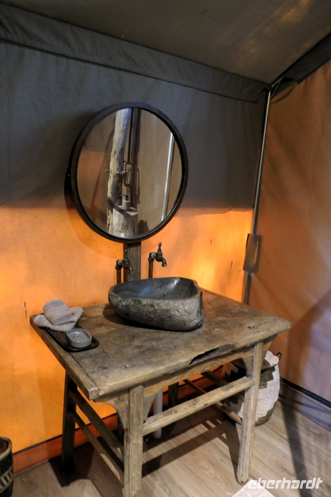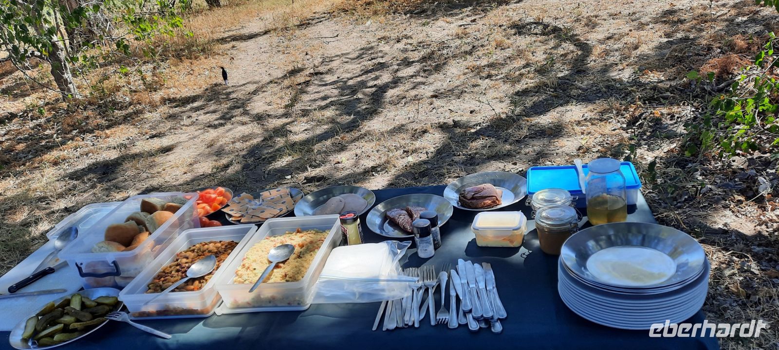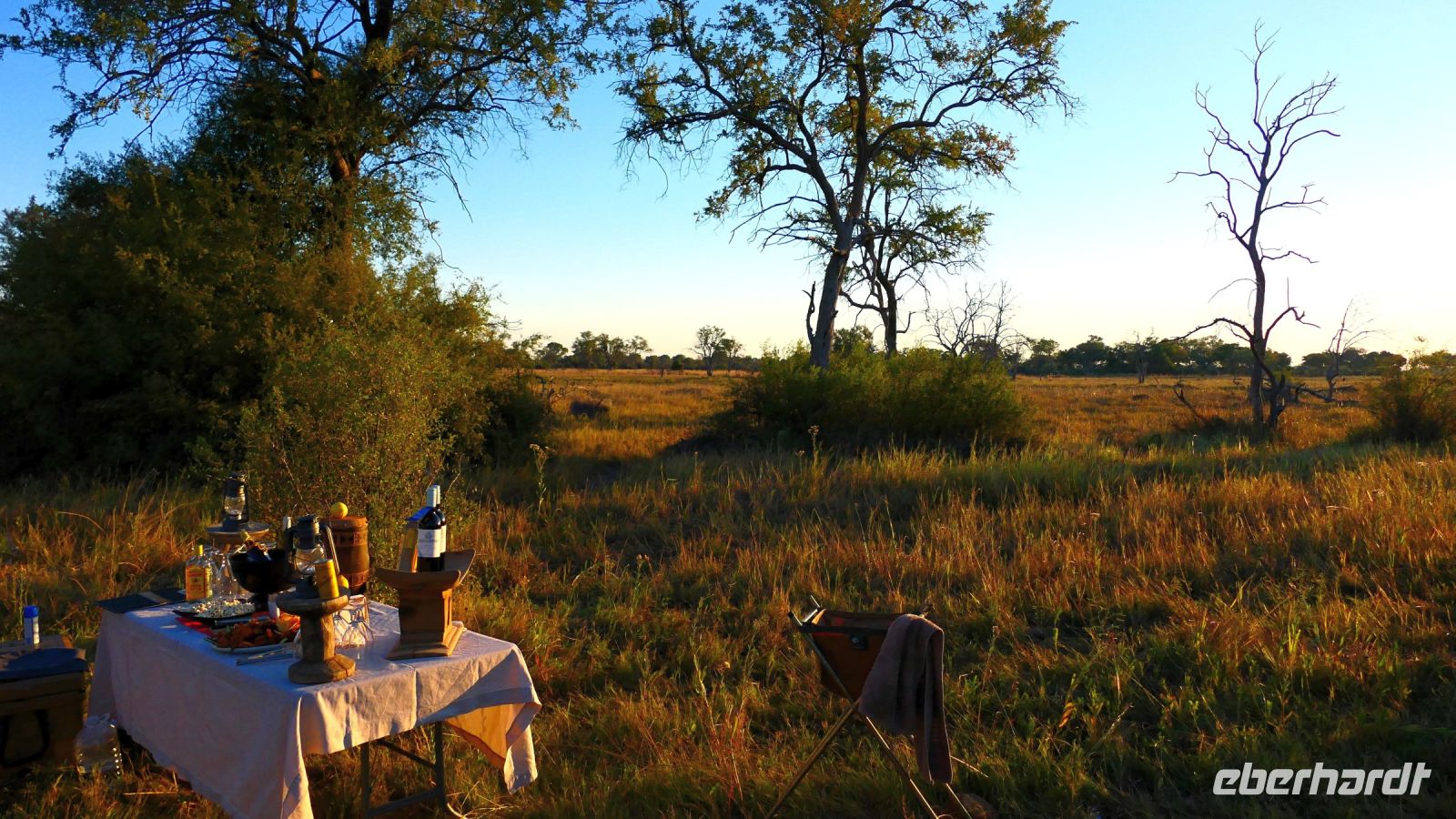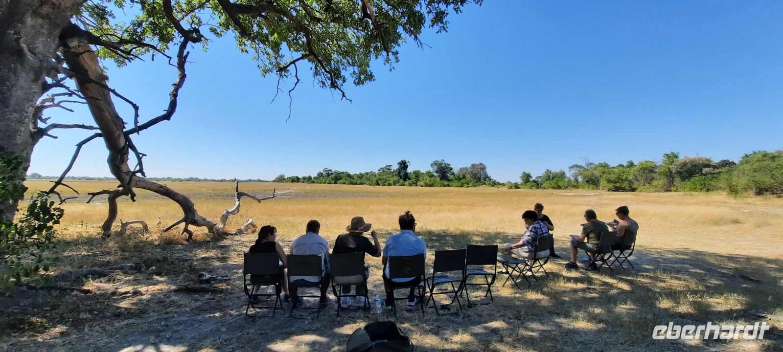 Pünktlich 5:30 Uhr werden wir von unseren Rangern an den Zelten abgeholt. Es ist frisch und noch dunkel. Etwas müde, dennoch voller Adrenalin berichten wir von unseren nächtlichen Erfahrungen und schlürfen dabei Kaffee oder Tee, "ditschen" Bisquits rein = Safari Early Breakfast. Mit Kebi und Katembo schwangen wir uns auf unsere Jeeps getreu dem Motto neuer tag = neue Taten. Durch das South Gate begannen wir unsere Safari im südlichen Moremi Wildreservat, einem fast 5.000 Quadratkilometer großen Schutzgebiet mit über 1.000 Pflanzen- und 560 Vogelarten. Allerdings wie schon vorher erwähnt, seit Jahren wird das südliche Delta immer trockener. Aber der Busch erwachte: Elefanten, Hyäne, Giraffen, Impalas und Warzenschweine beim Frühstück. Später auch wir - Frühstück im Busch, das hat schon was! Scheue Sandhühner, farbenprächtige Gabelracken leisteten uns Gesellschaft. Natürlich hofften wir auf die Sichtung von Löwen, die einige mit ihrem Gebrüll während der Nacht wach gehalten hatten. Das Glück war auf unserer Seite. Auf einer weiten, trockenen Ebene erspähten wir Geier, Marabus und einen Schakal, die sich an den Resten eines Zebra Kadavers labten. Es war wahrscheinlich in der letzten Nacht von Löwen gerissen wurden, viel war nicht mehr übrig. Wir fuhren querfeldein und dann ein Löwen Paar, keine 3 m von uns. Löwendame war die Dominantere und bestimmte, wo es lang ging. Einmalige, hautnahe Schnappschüsse entstanden. Irgendwo waren sicher auch Cubs versteckt, die wir aber nicht zu Gesicht bekamen. Etwas weiter entfernt, lang eine schwangere Löwin, die auch zum Rudel gehörte. Wie uns Kebi erzählte, wird sie in den nächsten 2 Wochen kleine Löwen zur Welt bringen. Übrigens: Löwen gebären über das ganze Jahr. Zum Mittag wurden die Stühle ausgeklappt. Vor malerischer Kulisse in der trockenen Savanee unterm Schattenbaum genossen ein leckeres, rustikales Picknick. In guten Regen-und Flutzeiten ist hier in der Senkung sonst ein Wasserpool, wo auch Hippos anzutreffen sind. Aufgrund der Dürre sahen wir nur Bones eine Hippo-Schädels, es ist wahrscheinloch verdurstet. Auf dem Rückweg zur Lodge begegneten uns noch_ Elefanten, Giraffen, Warzenschweine, Zebras und viele Antilopen. Als krönender Abschluss des Tages erwartete uns wieder ein besonderes Abendessen mit einem musikalischen Ständchen der gesamten Lodge-Crew.