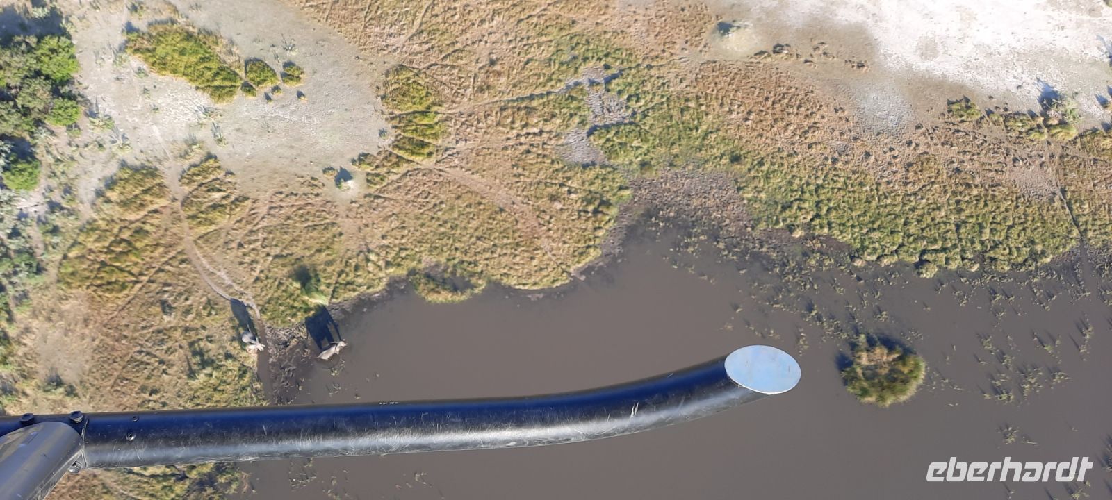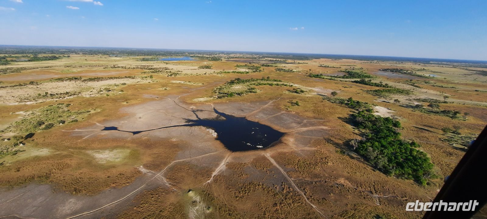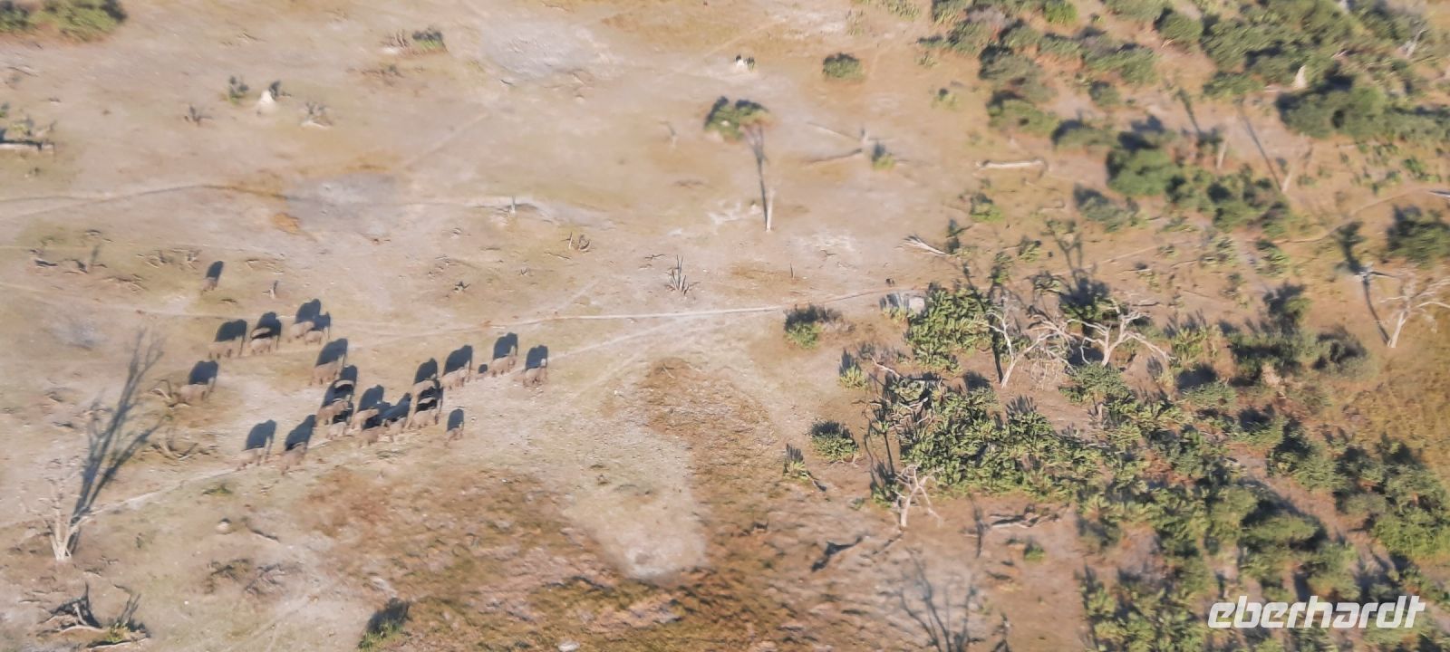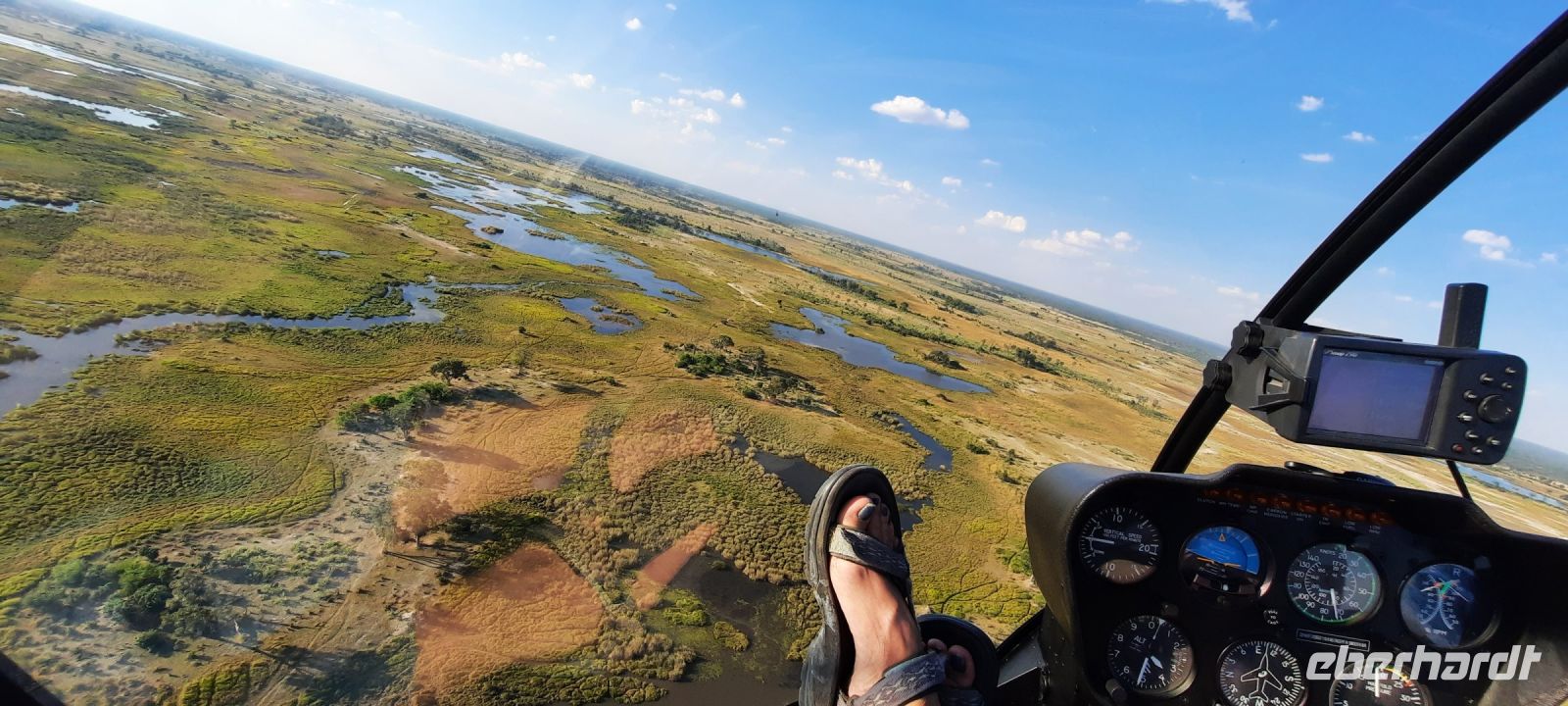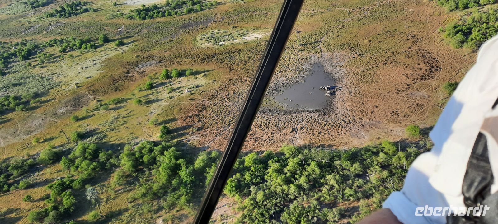 Mit vielen Herzchen wurden wir von Otti & Crew auf Shokomoka verabschiedet. Es war ein traumhafter, exklusiver Aufenthalt im Bush. Gern wären wir länger geblieben, doch die Karawane zog weiter. Unsere Ranger Kebi und Katembo brachten uns siche nach Maun zurück. Elefanten & Co verabschiedeten uns ebenso. Am Mittag checkten wir in unserer, bereits bekannten Thamalakane Lodge erneut ein. Am Nachmittag stand ein besonderes Highlight für einige Gäste auf dem Programm: Von Maun starteten sie mit Open-Door-Helicopters zu einem 1stündigen Flug über das Okavango-Delta! Das Okavango-Delta ist ein Naturphänomen. Es ist mit ca. 20.000 km² eines der größten Binnendeltas der Welt. Erst Monate nach der Regenzeit im angolanischen Hochland erreicht das Wasser des Okavango das Delta, wo er sich in ein riesiges Geflecht aus Seen, Flussläufen und Wasseradern verzweigt. Leider fallen die Regenzeiten im angolanischen Hochland seit einigen Jahren sehr spärlich aus und die Flut kommt immer seltener in Maun an (Klimawandel/Übervölkerung?). Das südliche Delta um Maun wird immer trockener., so dass der Tierreichtum im südlichen Delta auch geringer wird. Um das wasserreiche Delta zu erleben, muß man immer tiefer ins Delta eintauchen- der Tourismus wird dadurch mehr und mehr exklusiver. Dennoch war es für die Flieger ein unvergessliches Erlebnis, Elefanten- und Hippo-Herden, Krokodile, Giraffen und vieles mehr in dieser atemberaubenden und schützenswerten Landschaft von oben zu sehen.
