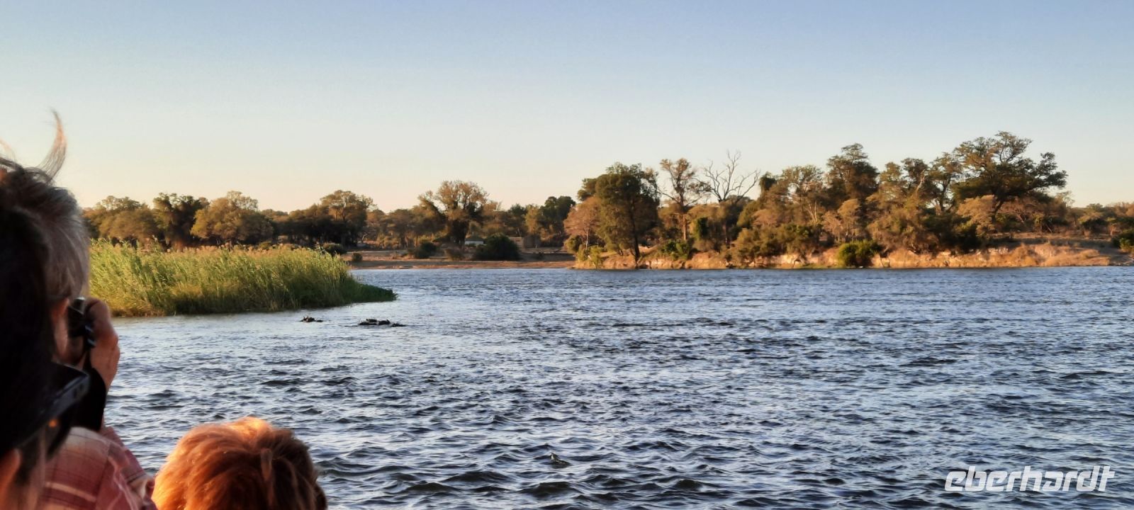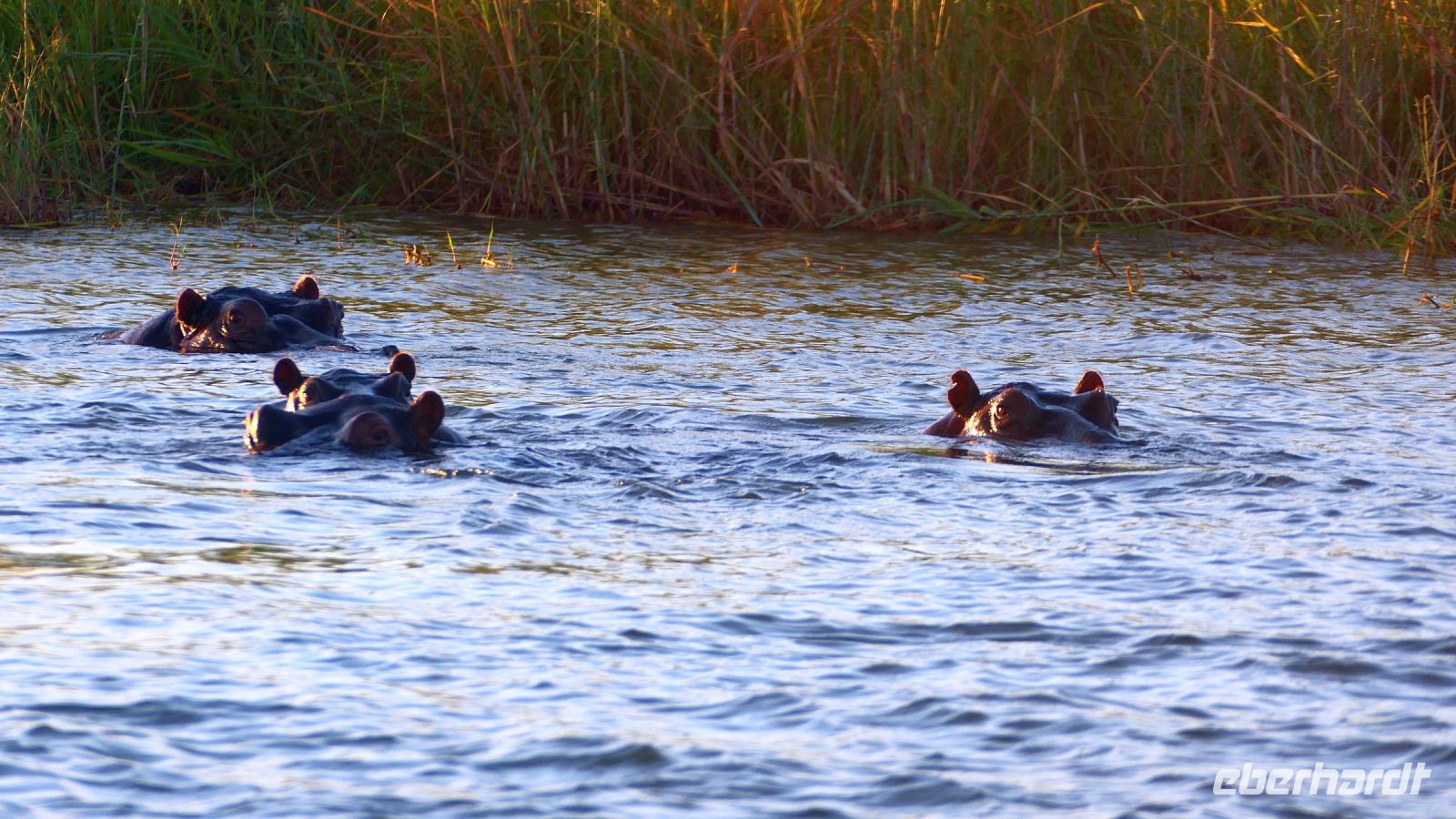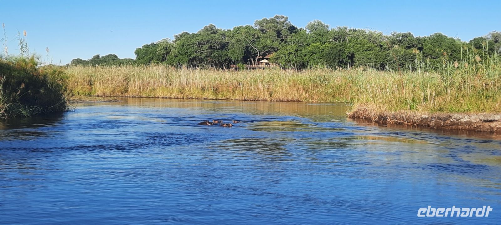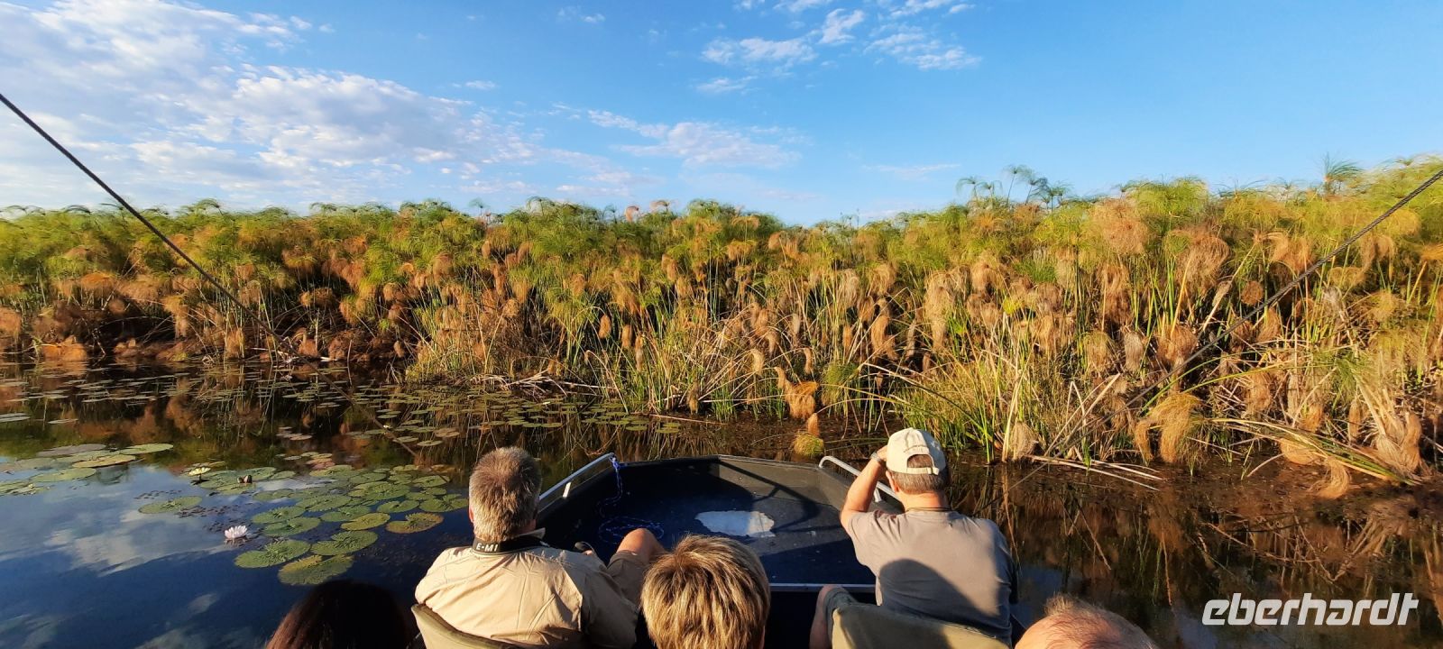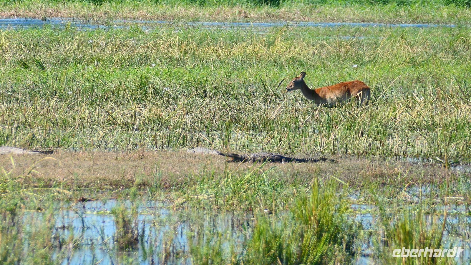Am Nachmittag trafen wir uns zu einer weiteren Pirschfahrt wieder. Diesmal ausschließlich mit dem Boot auf dem Kwando-River, der hier einem Delta ähnelt. Wir schipperten zunächst gemächlich daher und genossen einfach. Auf dem Boot hatten Zwergrötelschwalben ihr Nest gebaut. Eine herrliche Landschaft aus Schilf und Papyrus mit vereinzelt blühenden Wasserlilien säumten die Wasserwege. Unser Bootsführer Kashius fuhr vorausschauend, denn überall konnten Krokodile und Flusspferde unerwartet auftauchen. Und das taten sie auch! - wieder der bekannte Hippo Roadblock in der Biegung des Kwandos. Wir beobachteten die Truppe aus sicherer Entfernung oder die Hippos uns? Unseren Augen präsentierten sich weitere, einzigartige Foto- und Filmmotive in außergewöhnlichen, zauberhaften Licht. Schlangenhalsvogel, Graulärmvogel, Blatthühnchen, einen versteckten Wasserwaran, ein kleineres Krokodil und eine große Herde Letschwe Antilopen bekamen wir zu Gesicht, später auch noch eine scheue Leierantilope. Unterwegs pflückte Cashius eine Wasserlilie und bastelte daraus eine Halskette. Wasserlilien spielen eine wichtige Rolle bei den hiesigen Einwohnern, Vor allen werden sie als Deko und Schmuck bei Festlichkeiten genutzt wie zum Beispiel bei Hochzeiten. Schnell war eine Braut gefunden, deren Hals die Kette zierte. Der zugehörige Bräutigam bekam einen stylischen Hut aus den Blättern. Die Party konnte beginnen! An Land bauten wir nun unsere Sundowner-Bar auf. Mit dem