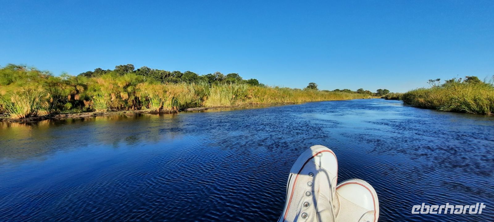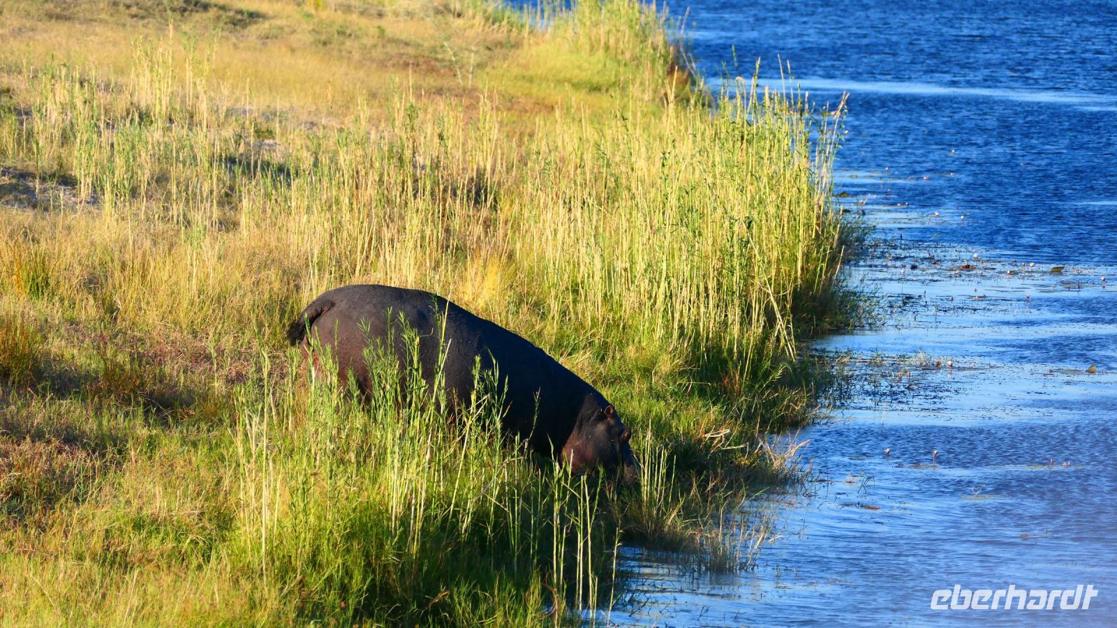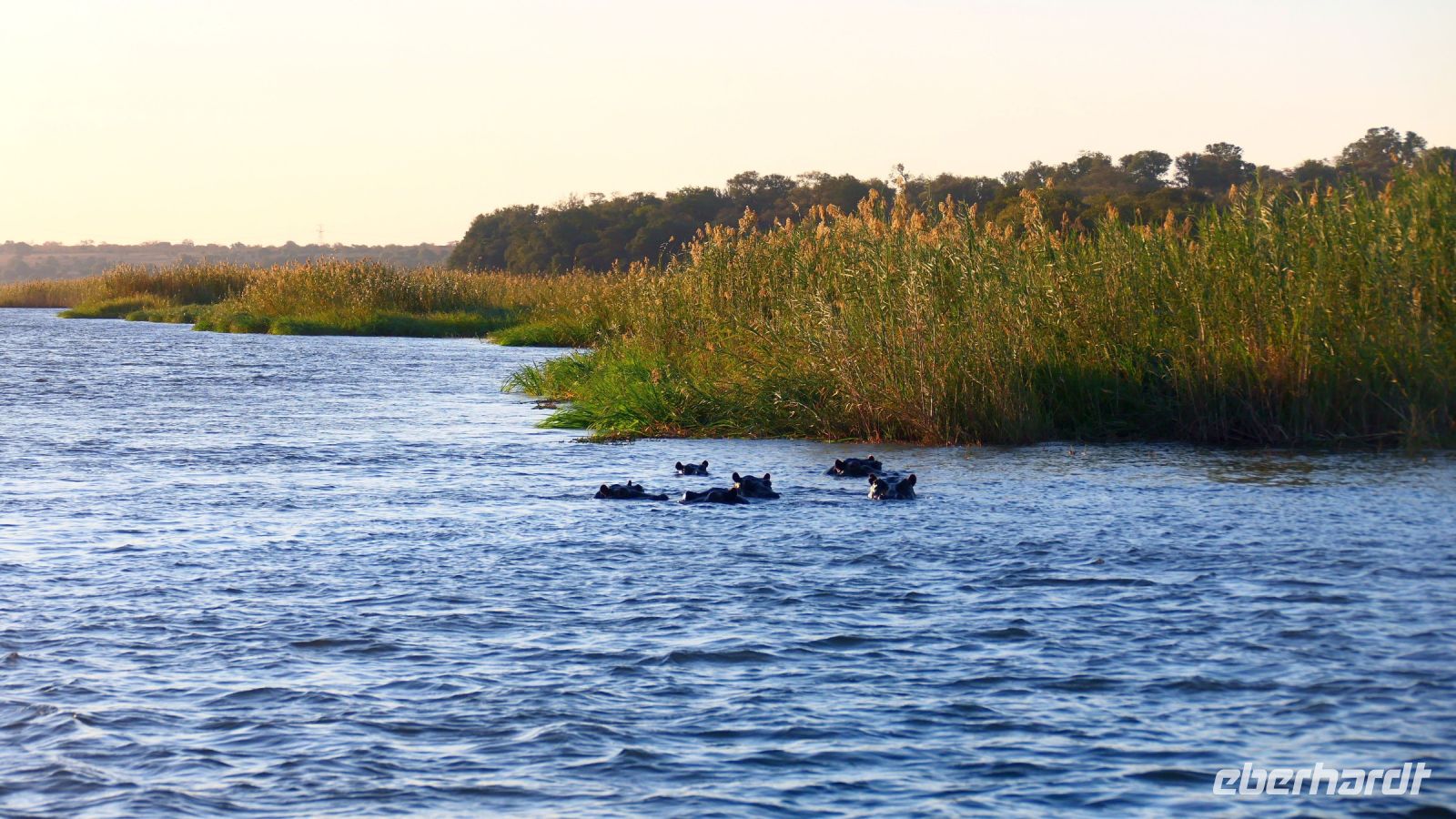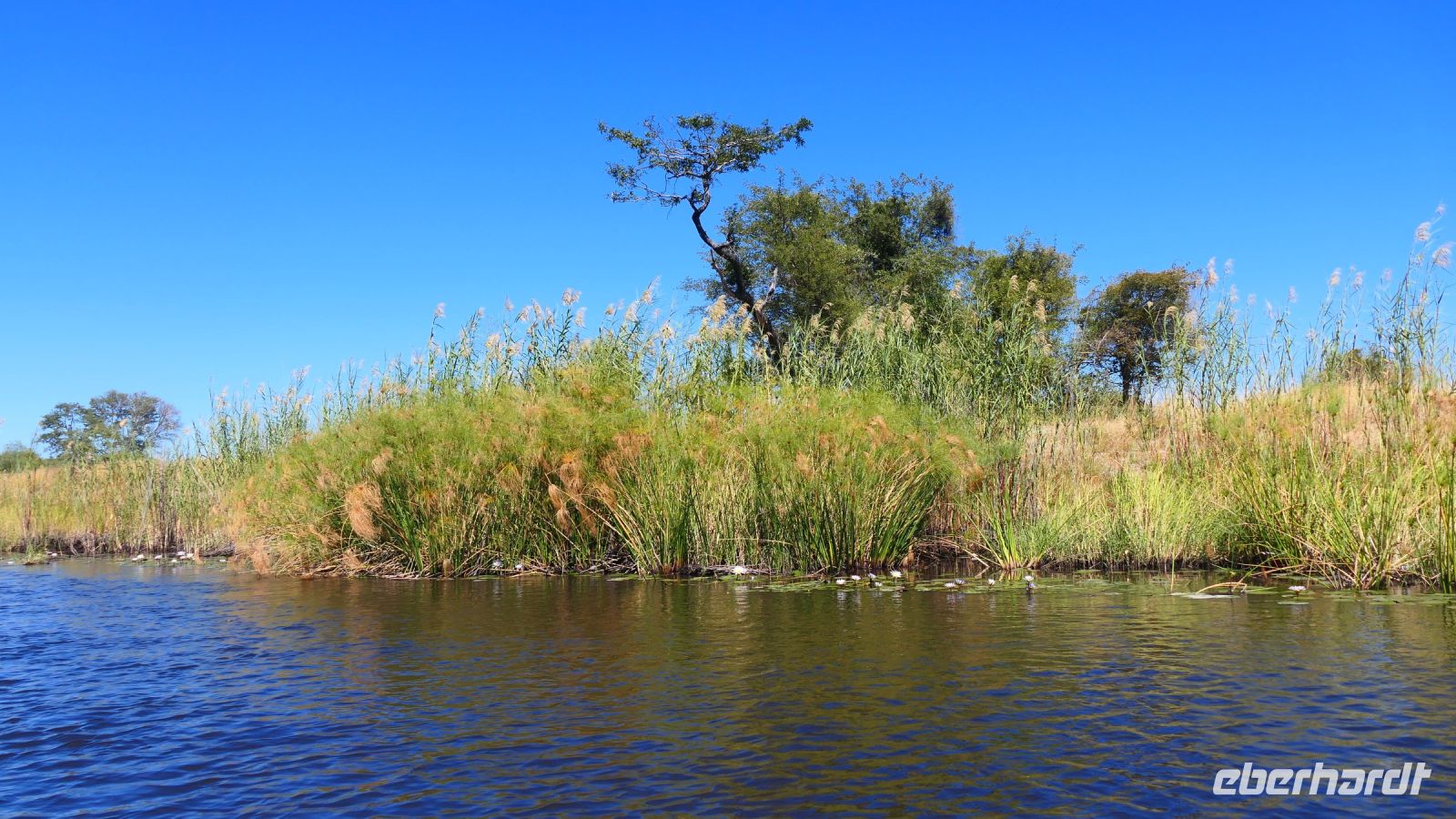 Am Nachmittag trafen wir uns zu einer weiteren Pirschfahrt wieder. Diesmal ausschließlich mit dem Boot auf dem Kwando-River, der hier einem Delta ähnelt. Wir schipperten zunächst gemächlich daher und genossen einfach. Auf dem Boot hatten Zwergrötelschwalben ihr Nest gebaut. Eine herrliche Landschaft aus Schilf und Papyrus mit vereinzelt blühenden Wasserlilien säumten die Wasserwege. Unser Bootsführer Kashius fuhr vorausschauend, denn überall konnten Krokodile und Flusspferde unerwartet auftauchen. Und das taten sie auch! - wieder der bekannte Hippo Roadblock in der Biegung des Kwandos. Wir beobachteten die Truppe aus sicherer Entfernung oder die Hippos uns? Unseren Augen präsentierten sich weitere, einzigartige Foto- und Filmmotive in außergewöhnlichen, zauberhaften Licht. Schlangenhalsvogel, Graulärmvogel, Blatthühnchen, einen versteckten Wasserwaran, ein kleineres Krokodil und eine große Herde Letschwe Antilopen bekamen wir zu Gesicht, später auch noch eine scheue Leierantilope. Unterwegs pflückte Cashius eine Wasserlilie und bastelte daraus eine Halskette. Wasserlilien spielen eine wichtige Rolle bei den hiesigen Einwohnern, Vor allen werden sie als Deko und Schmuck bei Festlichkeiten genutzt wie zum Beispiel bei Hochzeiten. Schnell war eine Braut gefunden, deren Hals die Kette zierte. Der zugehörige Bräutigam bekam einen stylischen Hut aus den Blättern. Die Party konnte beginnen! An Land bauten wir nun unsere Sundowner-Bar auf. Mit dem
