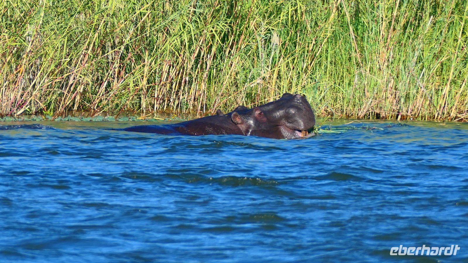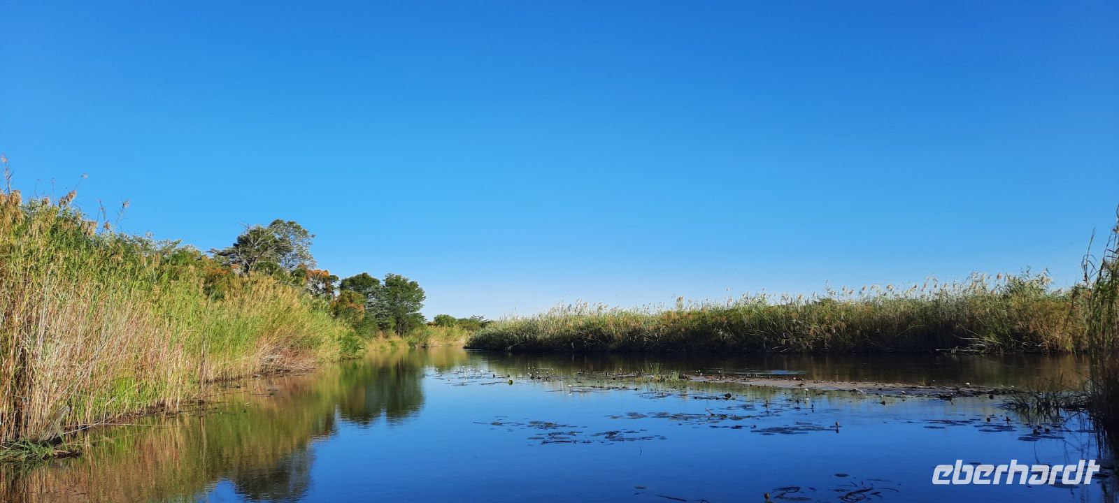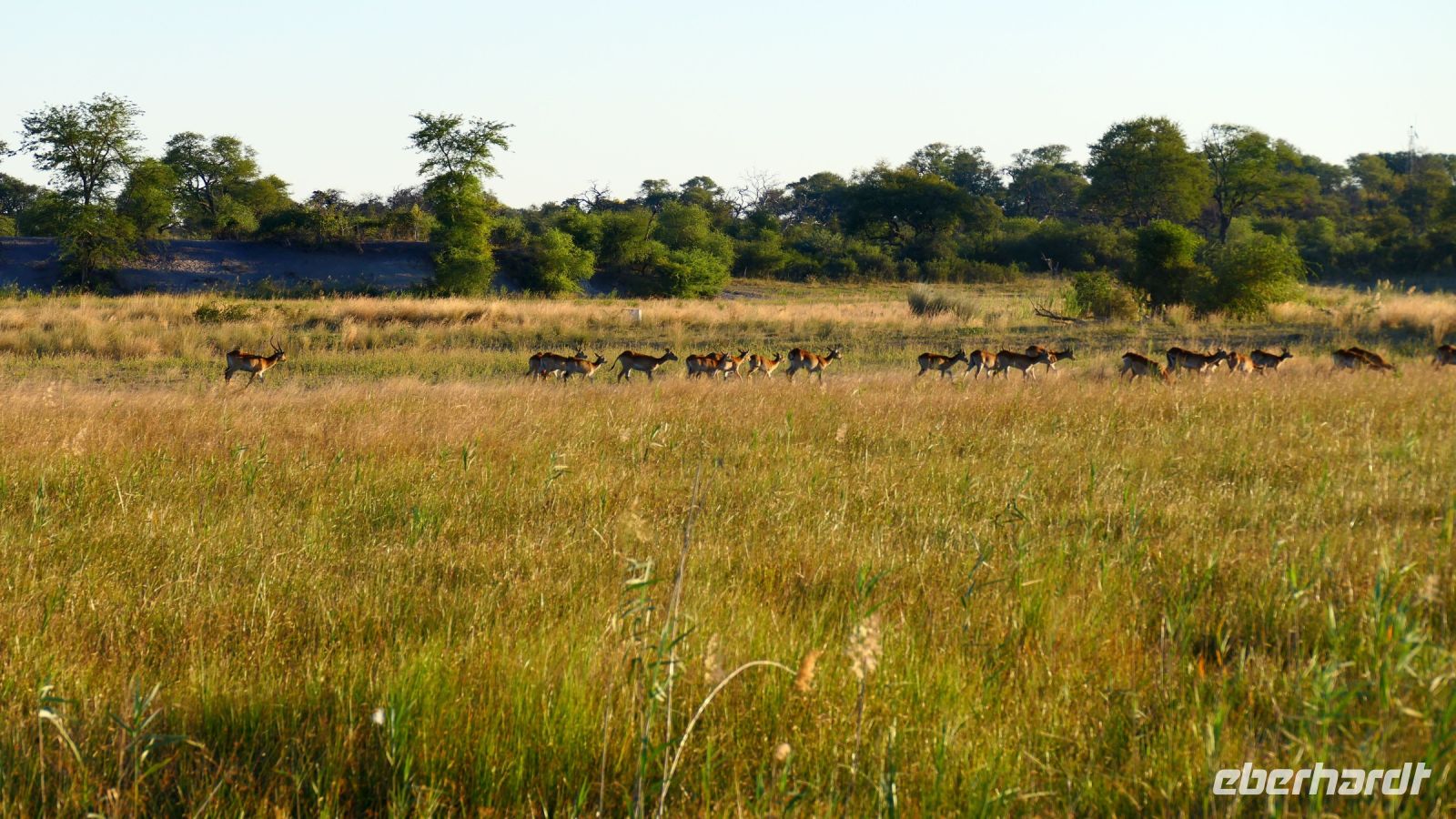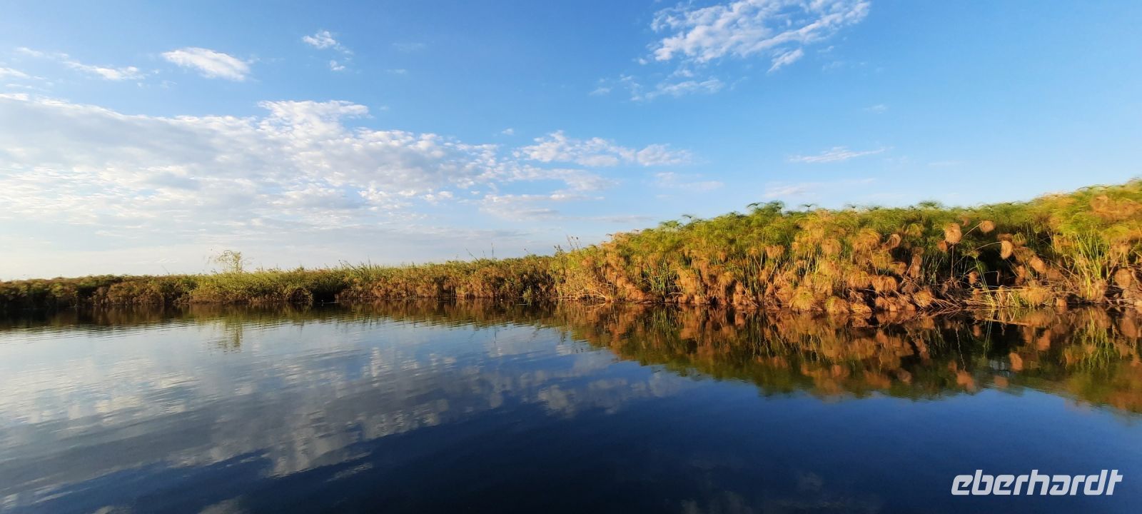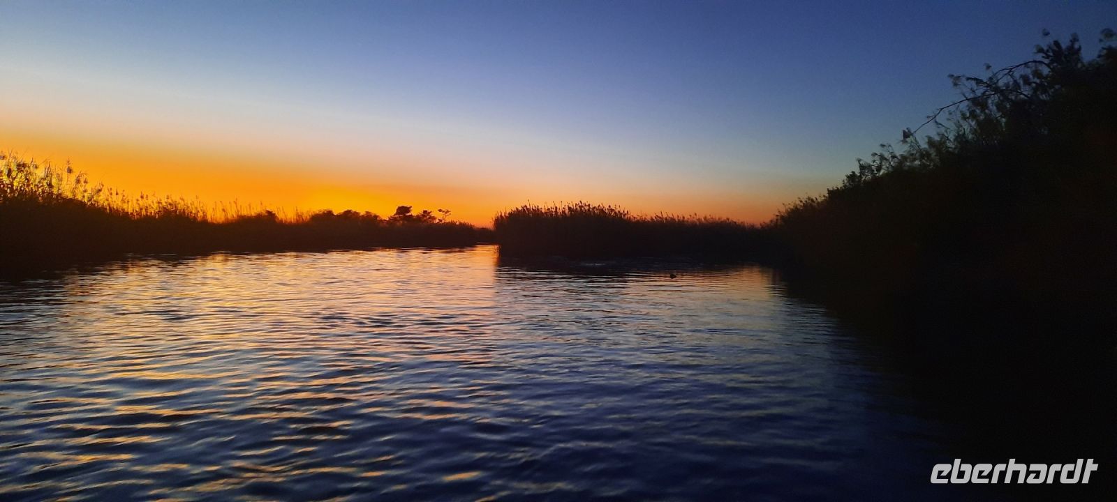 Am Nachmittag trafen wir uns zu einer weiteren Pirschfahrt wieder. Diesmal ausschließlich mit dem Boot auf dem Kwando-River, der hier einem Delta ähnelt. Wir schipperten zunächst gemächlich daher und genossen einfach. Auf dem Boot hatten Zwergrötelschwalben ihr Nest gebaut. Eine herrliche Landschaft aus Schilf und Papyrus mit vereinzelt blühenden Wasserlilien säumten die Wasserwege. Unser Bootsführer Kashius fuhr vorausschauend, denn überall konnten Krokodile und Flusspferde unerwartet auftauchen. Und das taten sie auch! - wieder der bekannte Hippo Roadblock in der Biegung des Kwandos. Wir beobachteten die Truppe aus sicherer Entfernung oder die Hippos uns? Unseren Augen präsentierten sich weitere, einzigartige Foto- und Filmmotive in außergewöhnlichen, zauberhaften Licht. Schlangenhalsvogel, Graulärmvogel, Blatthühnchen, einen versteckten Wasserwaran, ein kleineres Krokodil und eine große Herde Letschwe Antilopen bekamen wir zu Gesicht, später auch noch eine scheue Leierantilope. Unterwegs pflückte Cashius eine Wasserlilie und bastelte daraus eine Halskette. Wasserlilien spielen eine wichtige Rolle bei den hiesigen Einwohnern, Vor allen werden sie als Deko und Schmuck bei Festlichkeiten genutzt wie zum Beispiel bei Hochzeiten. Schnell war eine Braut gefunden, deren Hals die Kette zierte. Der zugehörige Bräutigam bekam einen stylischen Hut aus den Blättern. Die Party konnte beginnen! An Land bauten wir nun unsere Sundowner-Bar auf. Mit dem