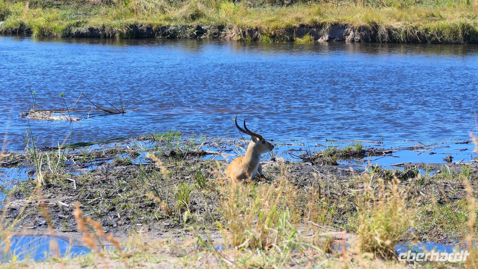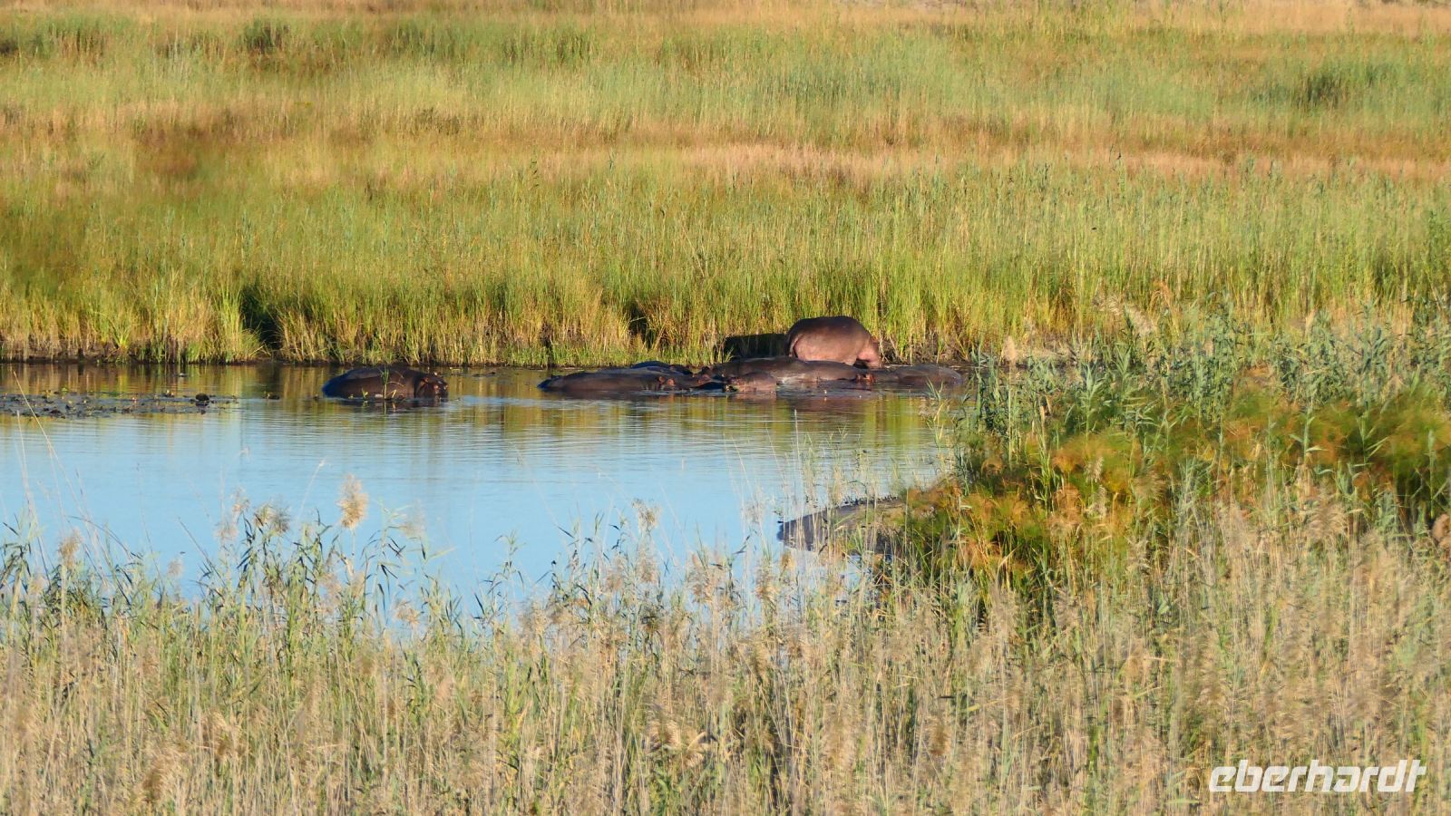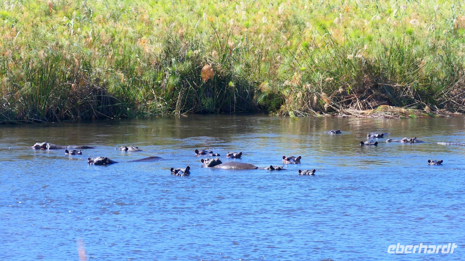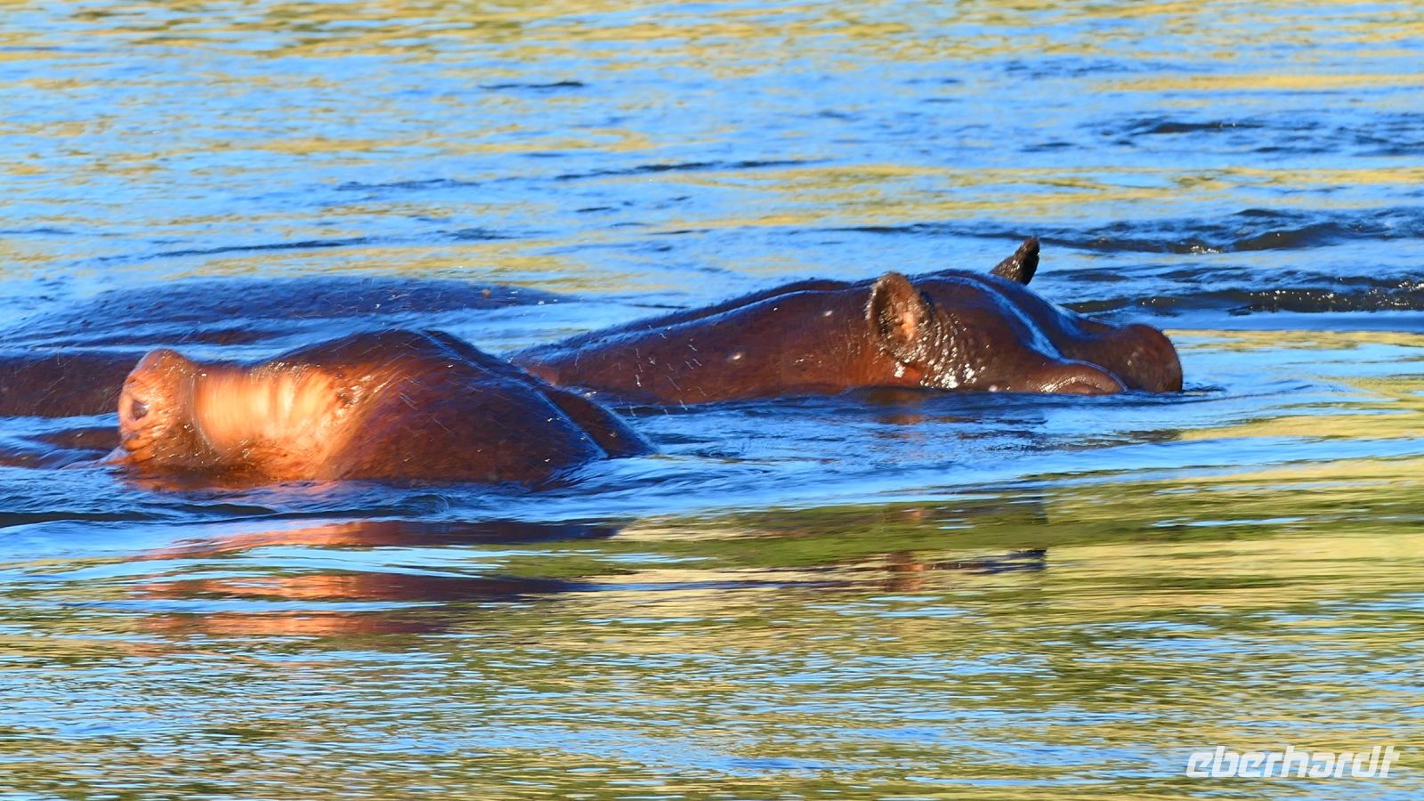 Am Nachmittag trafen wir uns zu einer weiteren Pirschfahrt wieder. Diesmal ausschließlich mit dem Boot auf dem Kwando-River, der hier einem Delta ähnelt. Wir schipperten zunächst gemächlich daher und genossen einfach. Auf dem Boot hatten Zwergrötelschwalben ihr Nest gebaut. Eine herrliche Landschaft aus Schilf und Papyrus mit vereinzelt blühenden Wasserlilien säumten die Wasserwege. Unser Bootsführer Kashius fuhr vorausschauend, denn überall konnten Krokodile und Flusspferde unerwartet auftauchen. Und das taten sie auch! - wieder der bekannte Hippo Roadblock in der Biegung des Kwandos. Wir beobachteten die Truppe aus sicherer Entfernung oder die Hippos uns? Unseren Augen präsentierten sich weitere, einzigartige Foto- und Filmmotive in außergewöhnlichen, zauberhaften Licht. Schlangenhalsvogel, Graulärmvogel, Blatthühnchen, einen versteckten Wasserwaran, ein kleineres Krokodil und eine große Herde Letschwe Antilopen bekamen wir zu Gesicht, später auch noch eine scheue Leierantilope. Unterwegs pflückte Cashius eine Wasserlilie und bastelte daraus eine Halskette. Wasserlilien spielen eine wichtige Rolle bei den hiesigen Einwohnern, Vor allen werden sie als Deko und Schmuck bei Festlichkeiten genutzt wie zum Beispiel bei Hochzeiten. Schnell war eine Braut gefunden, deren Hals die Kette zierte. Der zugehörige Bräutigam bekam einen stylischen Hut aus den Blättern. Die Party konnte beginnen! An Land bauten wir nun unsere Sundowner-Bar auf. Mit dem
