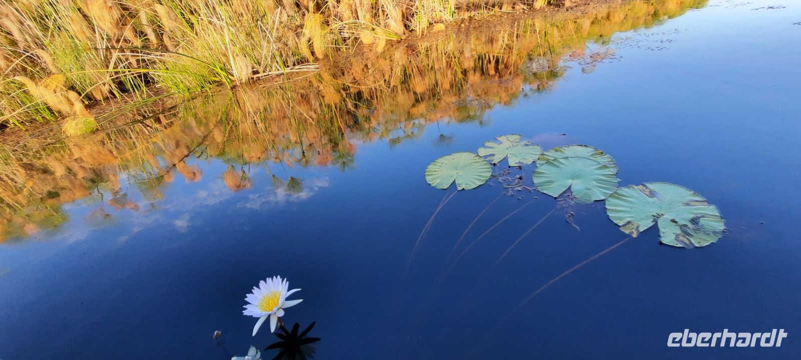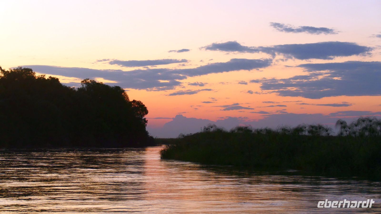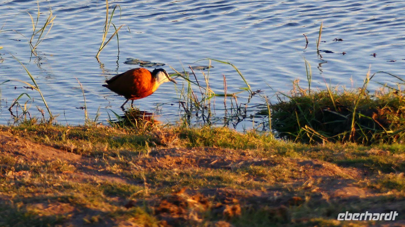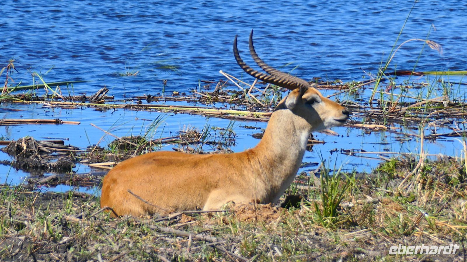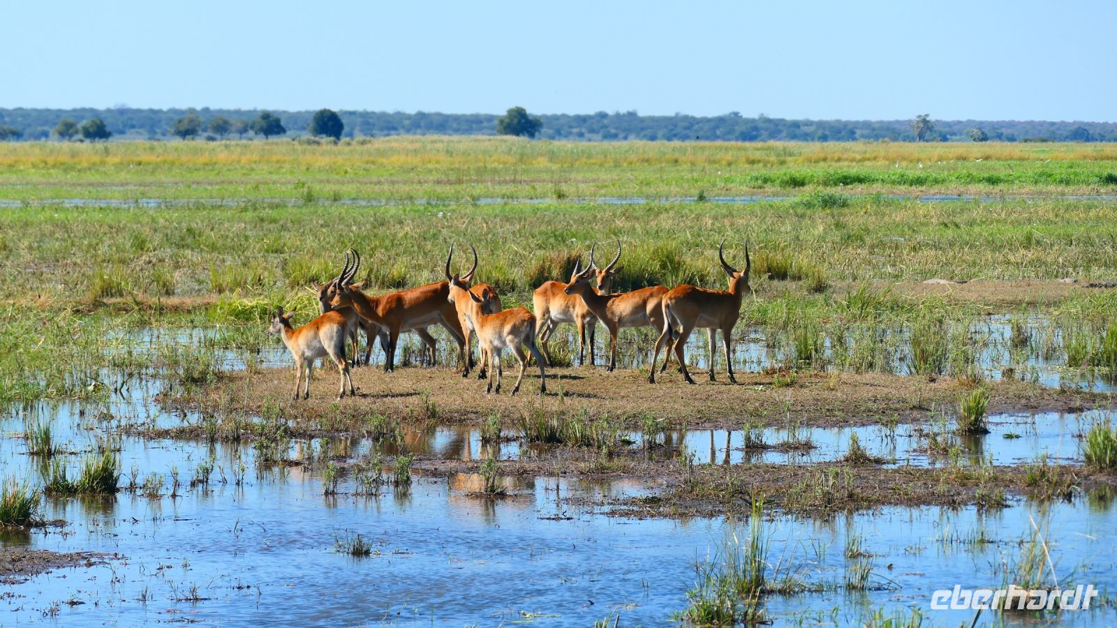 Am Nachmittag trafen wir uns zu einer weiteren Pirschfahrt wieder. Diesmal ausschließlich mit dem Boot auf dem Kwando-River, der hier einem Delta ähnelt. Wir schipperten zunächst gemächlich daher und genossen einfach. Auf dem Boot hatten Zwergrötelschwalben ihr Nest gebaut. Eine herrliche Landschaft aus Schilf und Papyrus mit vereinzelt blühenden Wasserlilien säumten die Wasserwege. Unser Bootsführer Kashius fuhr vorausschauend, denn überall konnten Krokodile und Flusspferde unerwartet auftauchen. Und das taten sie auch! - wieder der bekannte Hippo Roadblock in der Biegung des Kwandos. Wir beobachteten die Truppe aus sicherer Entfernung oder die Hippos uns? Unseren Augen präsentierten sich weitere, einzigartige Foto- und Filmmotive in außergewöhnlichen, zauberhaften Licht. Schlangenhalsvogel, Graulärmvogel, Blatthühnchen, einen versteckten Wasserwaran, ein kleineres Krokodil und eine große Herde Letschwe Antilopen bekamen wir zu Gesicht, später auch noch eine scheue Leierantilope. Unterwegs pflückte Cashius eine Wasserlilie und bastelte daraus eine Halskette. Wasserlilien spielen eine wichtige Rolle bei den hiesigen Einwohnern, Vor allen werden sie als Deko und Schmuck bei Festlichkeiten genutzt wie zum Beispiel bei Hochzeiten. Schnell war eine Braut gefunden, deren Hals die Kette zierte. Der zugehörige Bräutigam bekam einen stylischen Hut aus den Blättern. Die Party konnte beginnen! An Land bauten wir nun unsere Sundowner-Bar auf. Mit dem