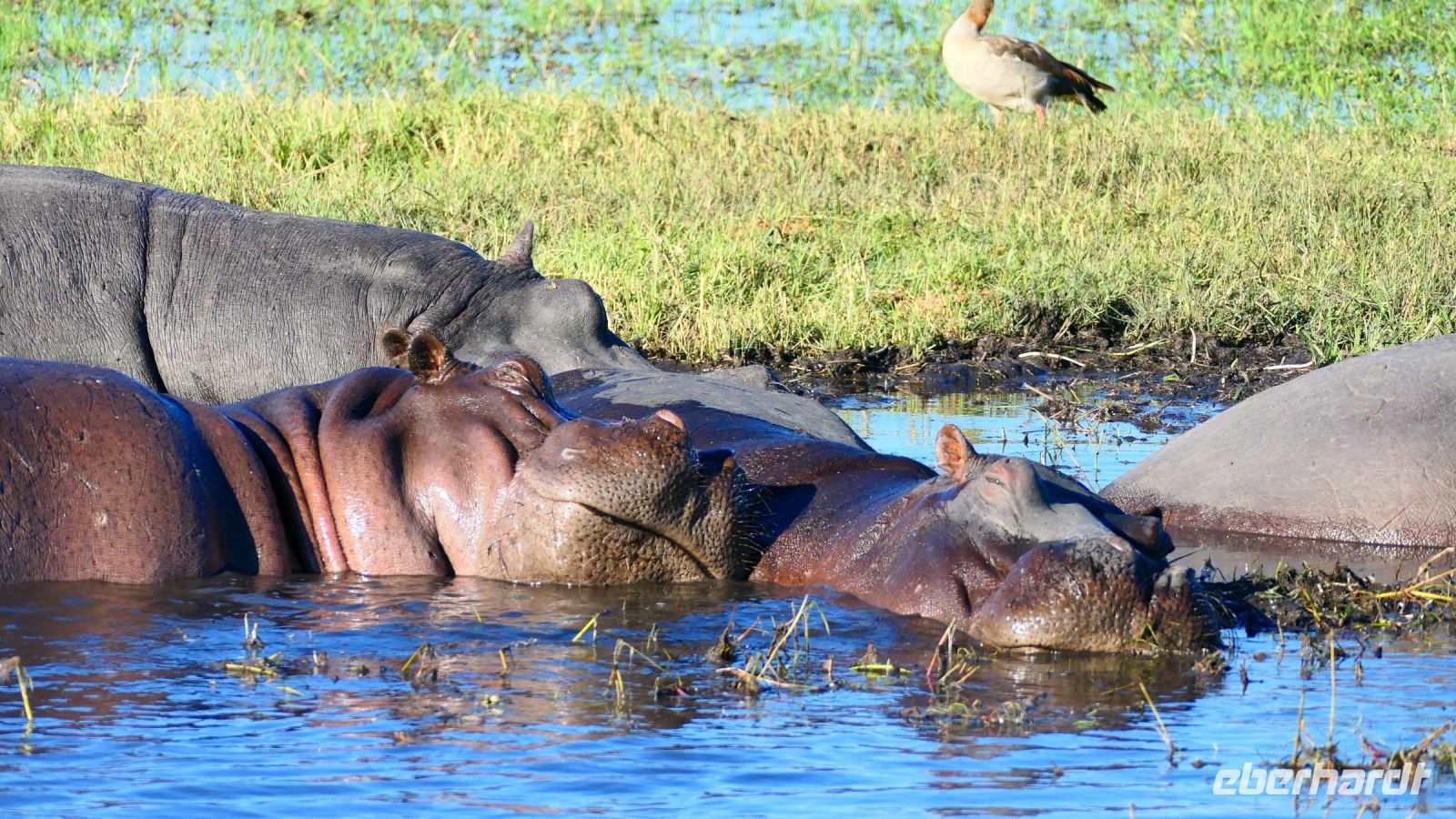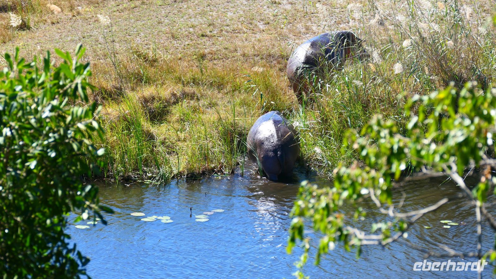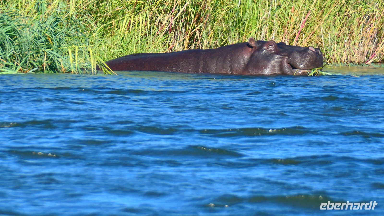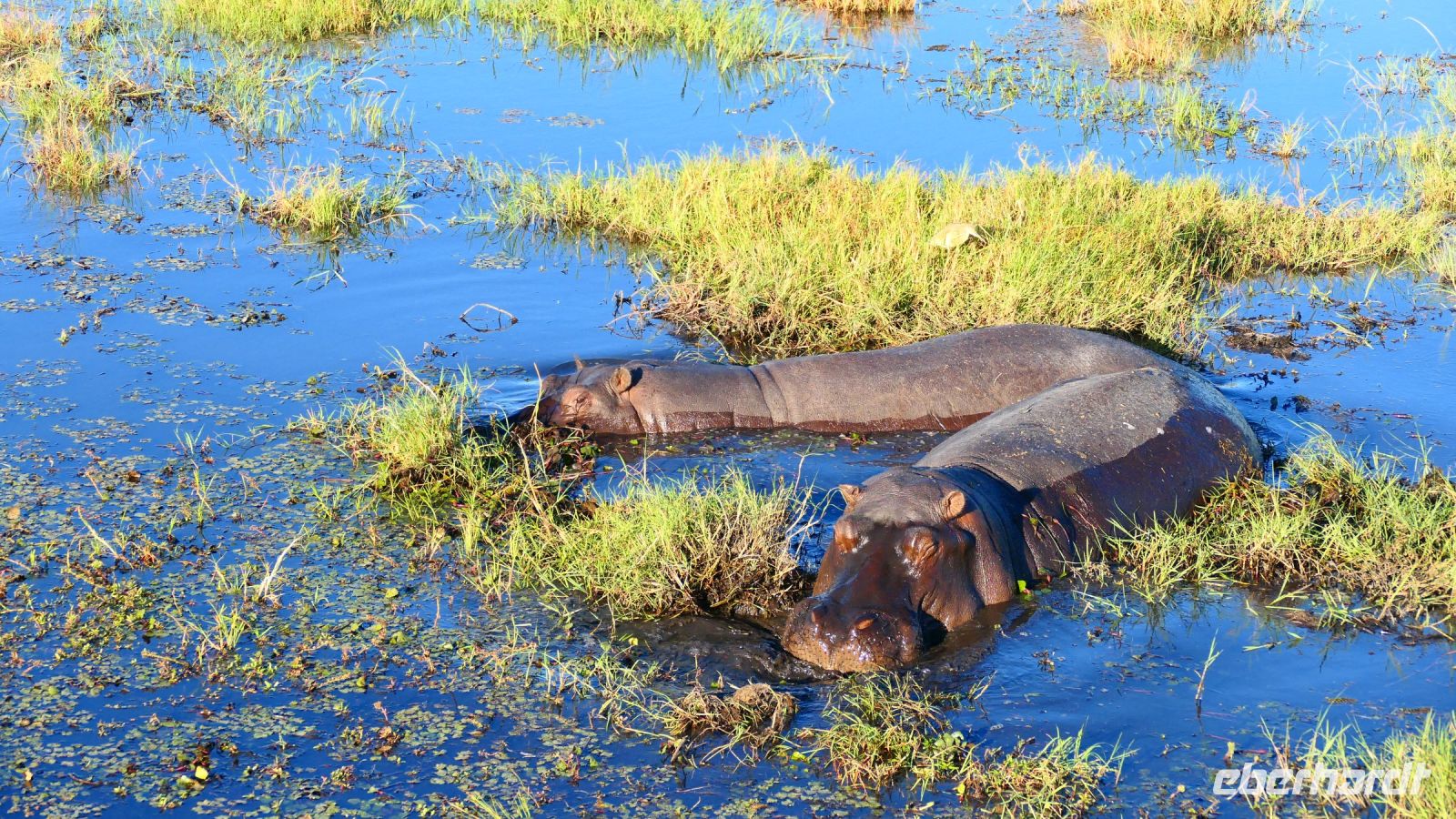 Am Nachmittag trafen wir uns zu einer weiteren Pirschfahrt wieder. Diesmal ausschließlich mit dem Boot auf dem Kwando-River, der hier einem Delta ähnelt. Wir schipperten zunächst gemächlich daher und genossen einfach. Auf dem Boot hatten Zwergrötelschwalben ihr Nest gebaut. Eine herrliche Landschaft aus Schilf und Papyrus mit vereinzelt blühenden Wasserlilien säumten die Wasserwege. Unser Bootsführer Kashius fuhr vorausschauend, denn überall konnten Krokodile und Flusspferde unerwartet auftauchen. Und das taten sie auch! - wieder der bekannte Hippo Roadblock in der Biegung des Kwandos. Wir beobachteten die Truppe aus sicherer Entfernung oder die Hippos uns? Unseren Augen präsentierten sich weitere, einzigartige Foto- und Filmmotive in außergewöhnlichen, zauberhaften Licht. Schlangenhalsvogel, Graulärmvogel, Blatthühnchen, einen versteckten Wasserwaran, ein kleineres Krokodil und eine große Herde Letschwe Antilopen bekamen wir zu Gesicht, später auch noch eine scheue Leierantilope. Unterwegs pflückte Cashius eine Wasserlilie und bastelte daraus eine Halskette. Wasserlilien spielen eine wichtige Rolle bei den hiesigen Einwohnern, Vor allen werden sie als Deko und Schmuck bei Festlichkeiten genutzt wie zum Beispiel bei Hochzeiten. Schnell war eine Braut gefunden, deren Hals die Kette zierte. Der zugehörige Bräutigam bekam einen stylischen Hut aus den Blättern. Die Party konnte beginnen! An Land bauten wir nun unsere Sundowner-Bar auf. Mit dem