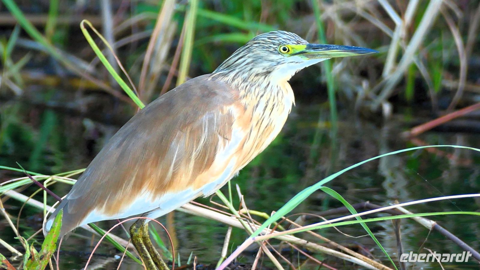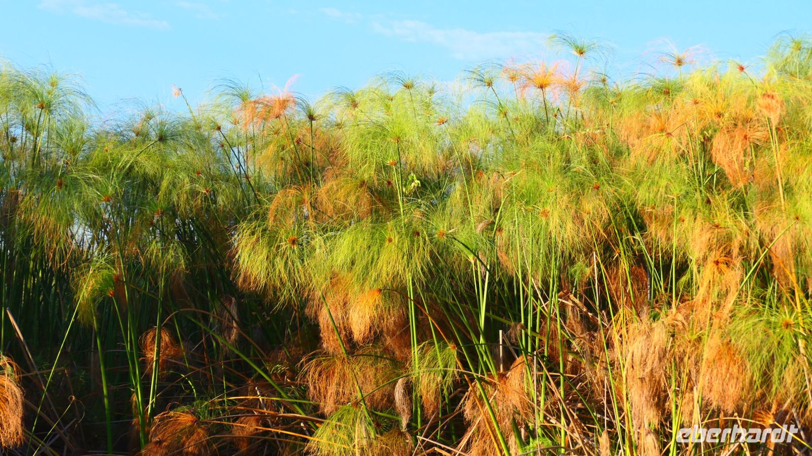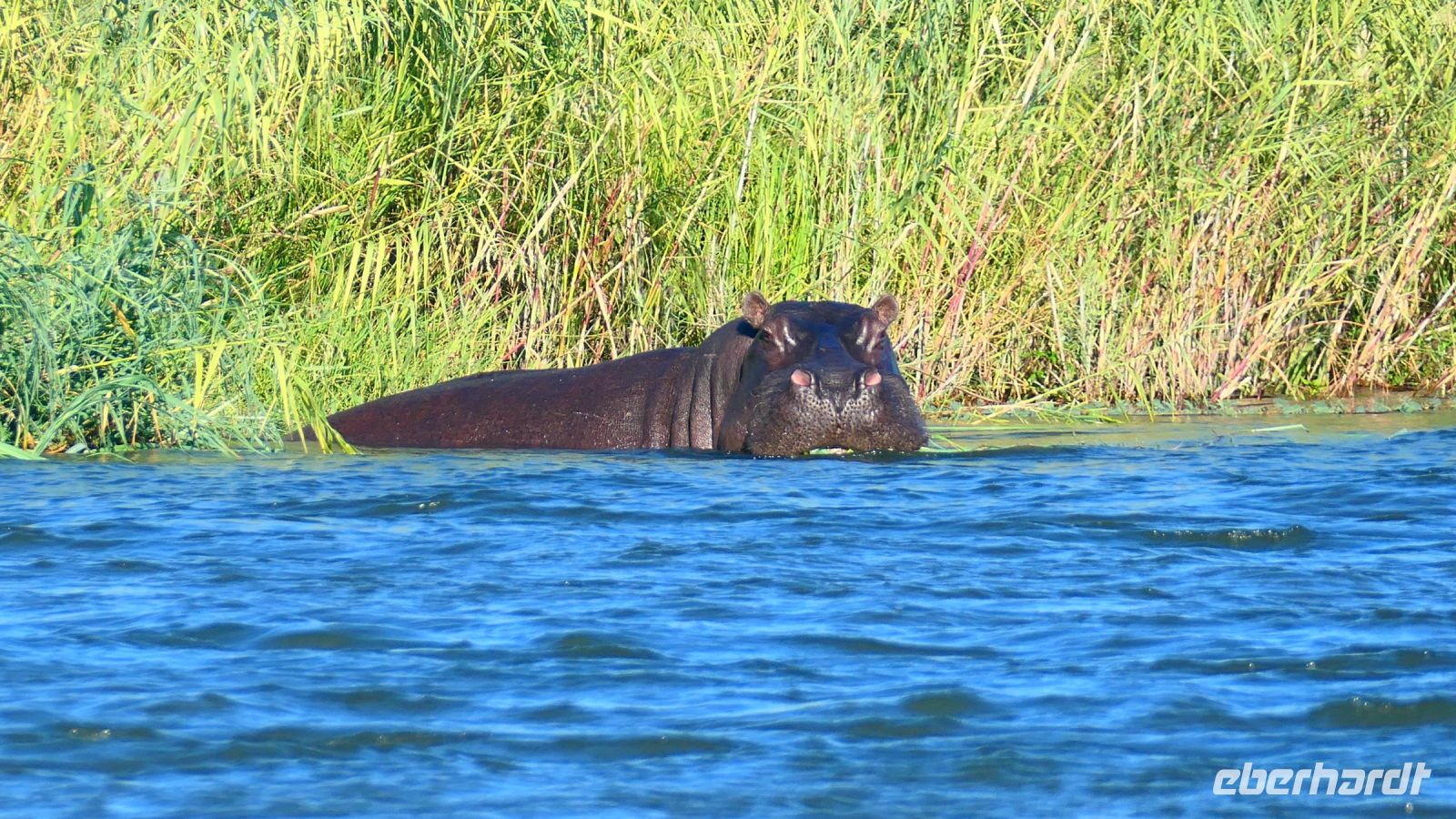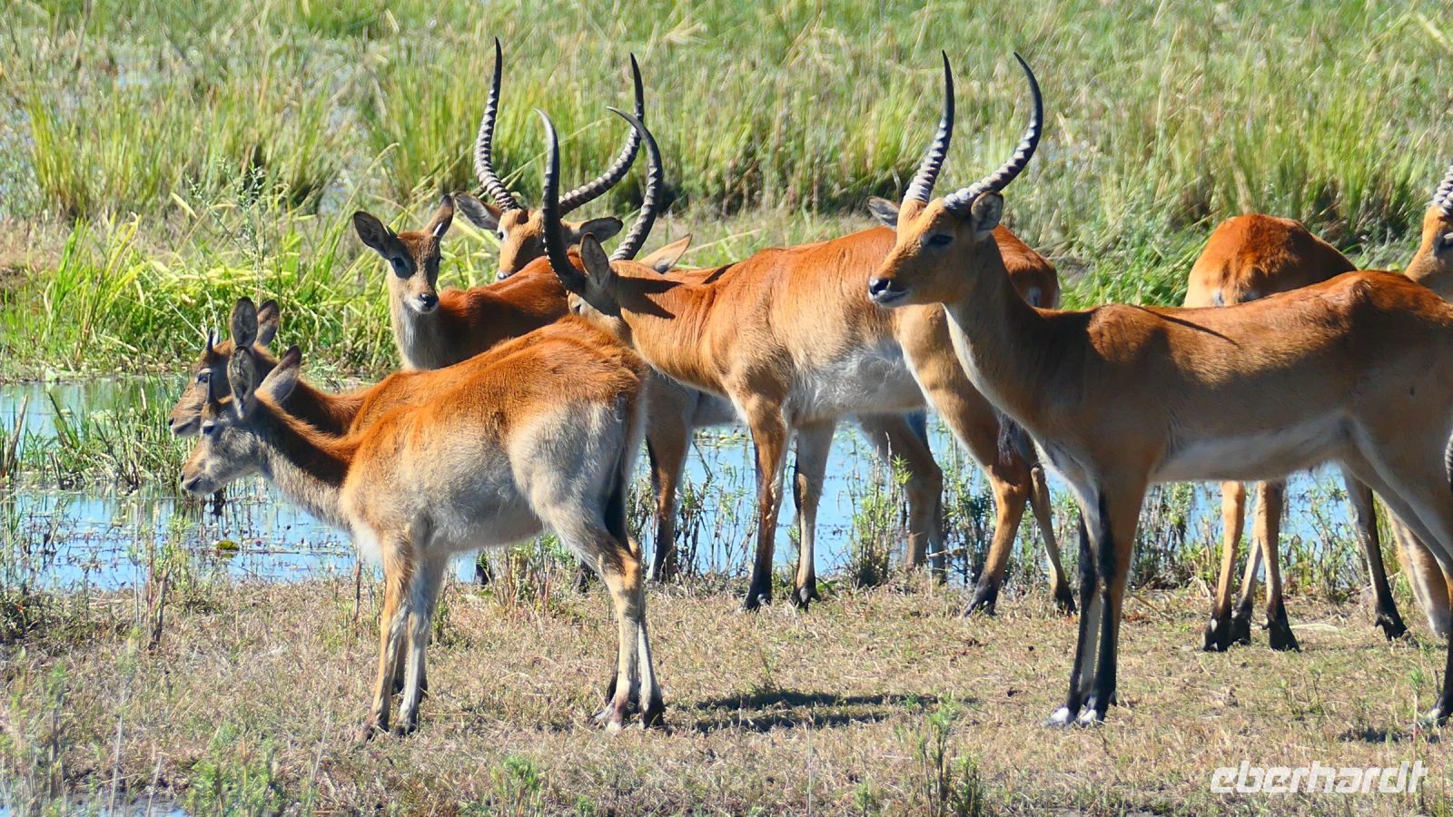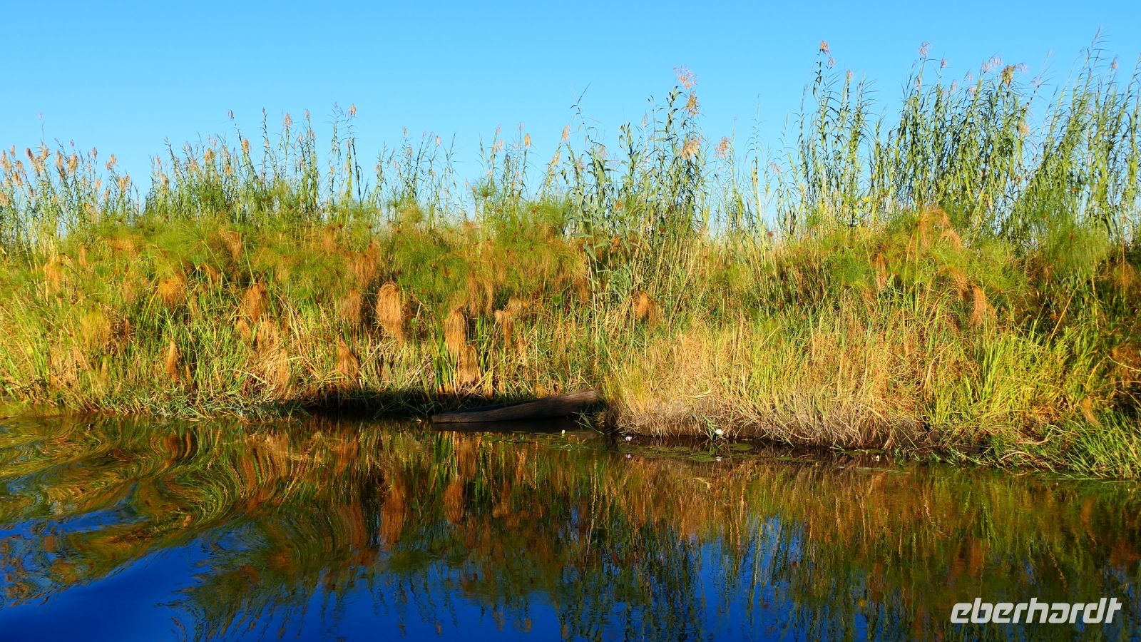 Am Nachmittag trafen wir uns zu einer weiteren Pirschfahrt wieder. Diesmal ausschließlich mit dem Boot auf dem Kwando-River, der hier einem Delta ähnelt. Wir schipperten zunächst gemächlich daher und genossen einfach. Auf dem Boot hatten Zwergrötelschwalben ihr Nest gebaut. Eine herrliche Landschaft aus Schilf und Papyrus mit vereinzelt blühenden Wasserlilien säumten die Wasserwege. Unser Bootsführer Kashius fuhr vorausschauend, denn überall konnten Krokodile und Flusspferde unerwartet auftauchen. Und das taten sie auch! - wieder der bekannte Hippo Roadblock in der Biegung des Kwandos. Wir beobachteten die Truppe aus sicherer Entfernung oder die Hippos uns? Unseren Augen präsentierten sich weitere, einzigartige Foto- und Filmmotive in außergewöhnlichen, zauberhaften Licht. Schlangenhalsvogel, Graulärmvogel, Blatthühnchen, einen versteckten Wasserwaran, ein kleineres Krokodil und eine große Herde Letschwe Antilopen bekamen wir zu Gesicht, später auch noch eine scheue Leierantilope. Unterwegs pflückte Cashius eine Wasserlilie und bastelte daraus eine Halskette. Wasserlilien spielen eine wichtige Rolle bei den hiesigen Einwohnern, Vor allen werden sie als Deko und Schmuck bei Festlichkeiten genutzt wie zum Beispiel bei Hochzeiten. Schnell war eine Braut gefunden, deren Hals die Kette zierte. Der zugehörige Bräutigam bekam einen stylischen Hut aus den Blättern. Die Party konnte beginnen! An Land bauten wir nun unsere Sundowner-Bar auf. Mit dem