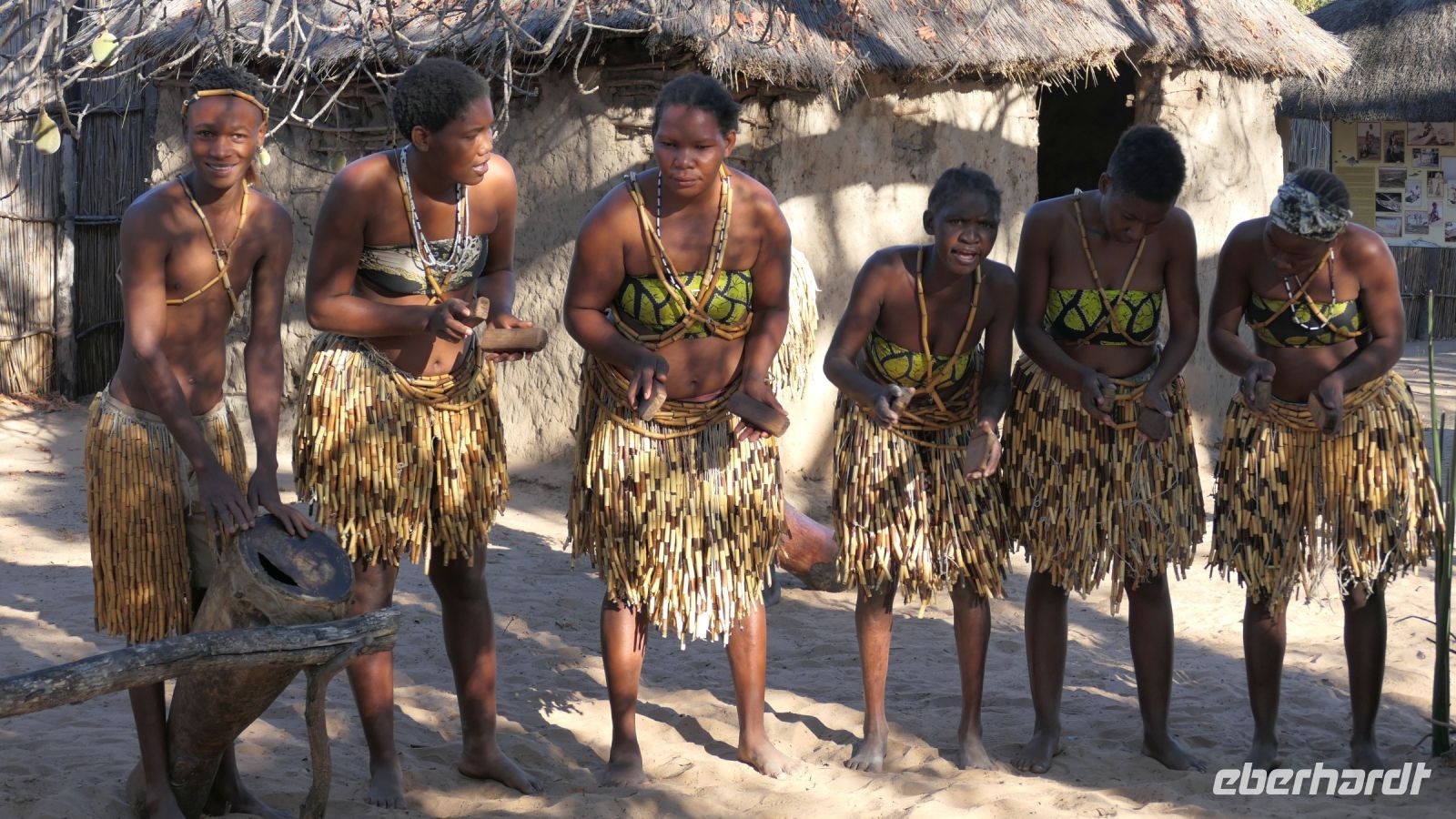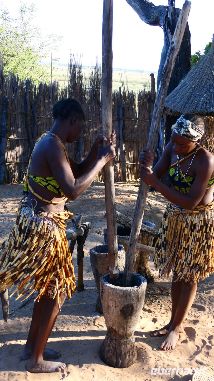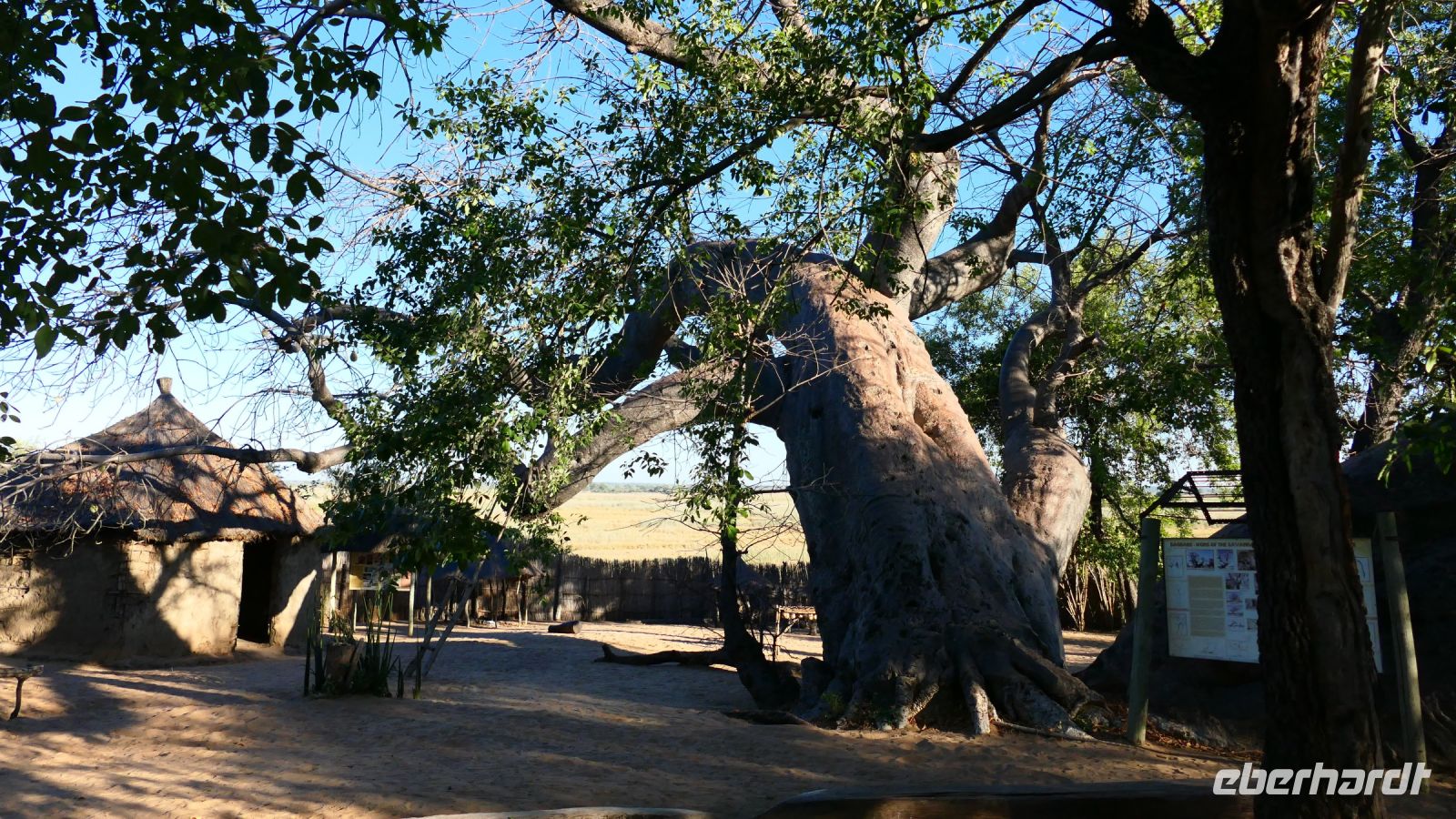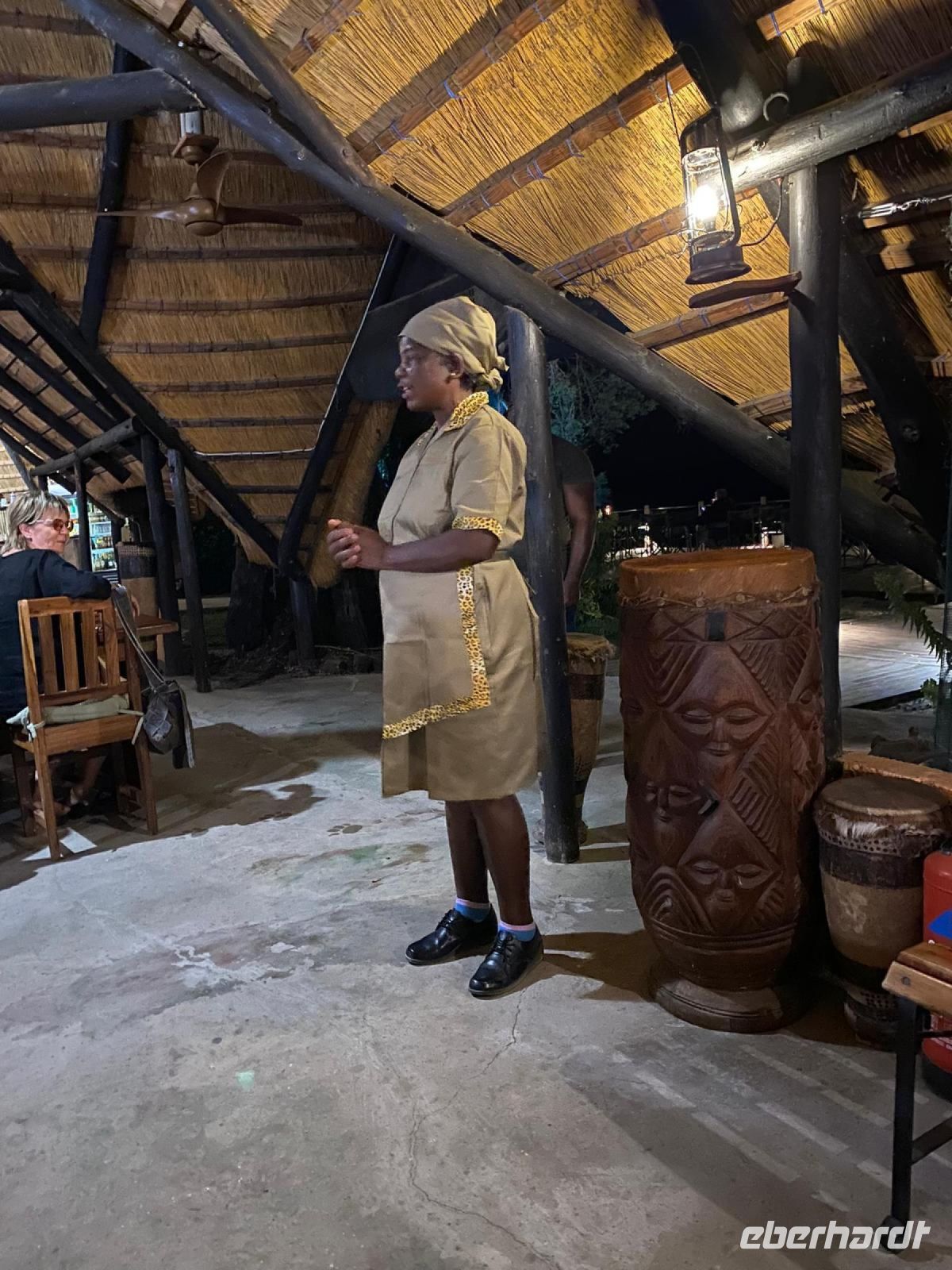 Unsere Reise führte uns heute nach Botswana zurück, in die Chobe Region. Doch zunächst besuchten wir das benachbarte Namushasha Culture Village, ein lebendiges Museumsdorf. Unter einem ca. 1.000 bis 1.500 Jahre alten Baobab, dem Urbaum, dem eine besondere Energie und magische Kräfte zugeschrieben werden, erhielten wir einige Einblicke in die Kultur und Lebensweise der lokalen Familien Clans: Wie ist so ein Dorf aufgebaut, wie arbeitet der Schmied und wie wird gefeiert, getanzt und gesungen. Auch dieser Besuch war interessant und spannend, zumal wir verschiedene Dinge selbst ausprobieren konnten, wie Mais stampfen oder der "Hippo-Trommel" Geräusche zu entlocken, um Flusspferde nachzuahmen. Auch der Medizin-Mann gab uns seinen Segen für eine sichere Weiterreise. Auf der Ngoma Bridge überquerten wir den trockenen Chobe Fluss. An der Grenze zu Botswana mussten wir ein wenig warten. Das Übliche mit Schuhe desinfizieren und so. Via Transitstraße ging es dann zügig durch den Chobe Nationalpark zu unserer Lodge in Kasane. Die Chobe Safari Lodge befindet sich am Ufer des gleichnamigen Flusses. Beim Check In herrschte Hochbetrieb und wir mussten abermals gedulden. Die Wartezeit überbrückten wir in der Lounge und Eberhardt spendierte ein kühles Bier für die ausgetrockneten Kehlen. Später konnten die Gäste ihre mehr als komfortablen Zimmer beziehen und ihre Freizeit genießen. Hartmut und Annett waren noch heimatlos, den die Lodge war überbucht. Am späten Nachmittag war dann auch für uns ein Schlafplatz außerhalb gefunden. Zum Abendessen bedienten wir uns am großzügigen Buffet im offenen Sedudu Restaurant.
