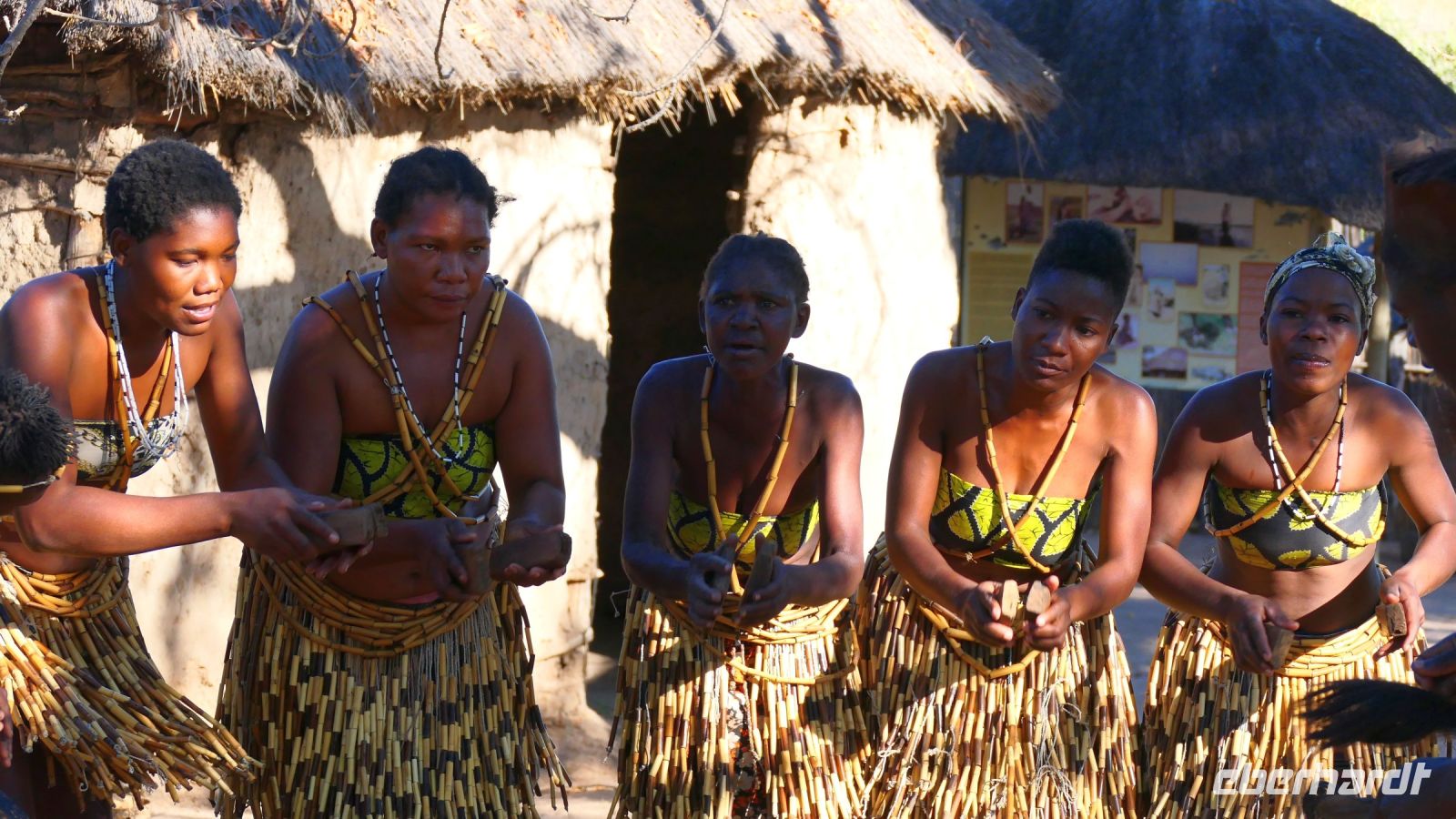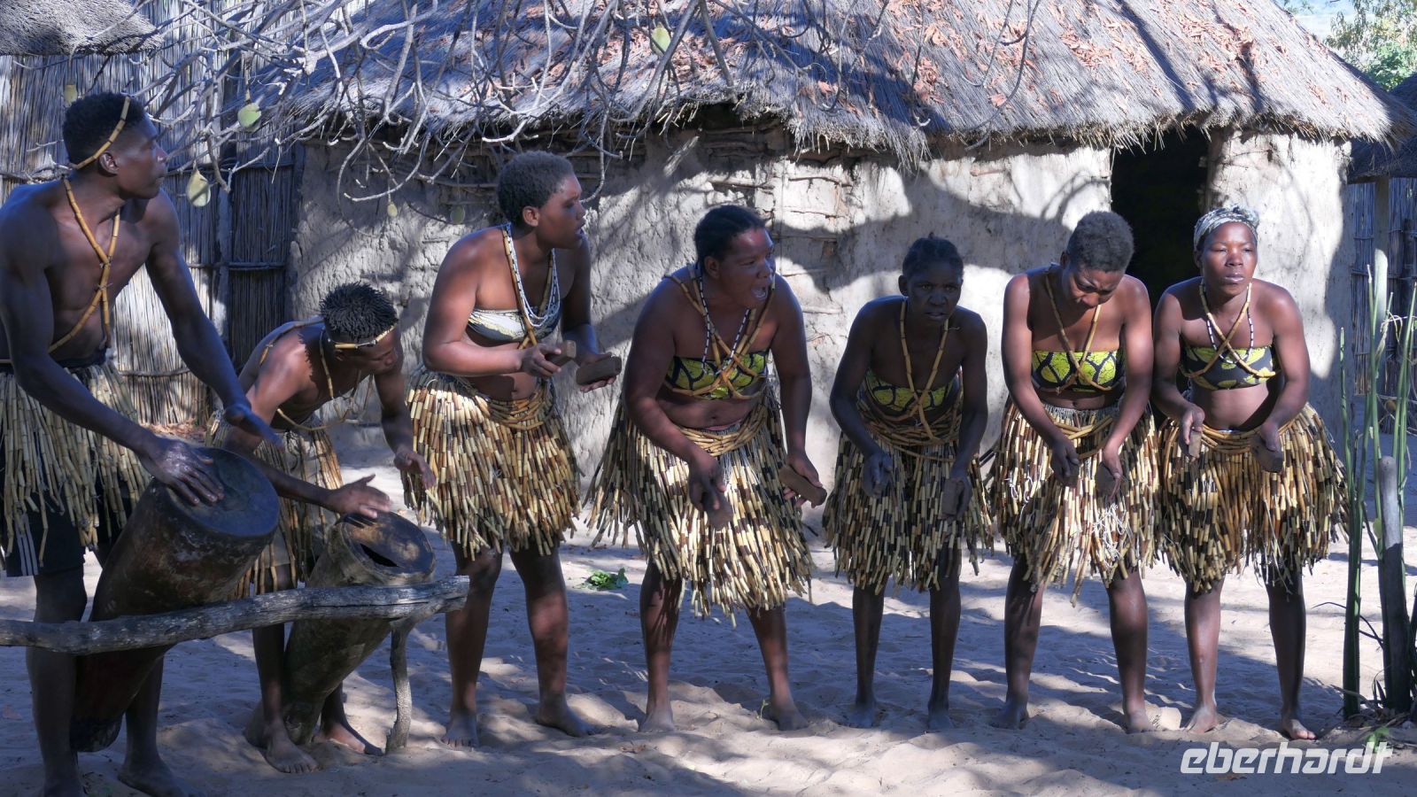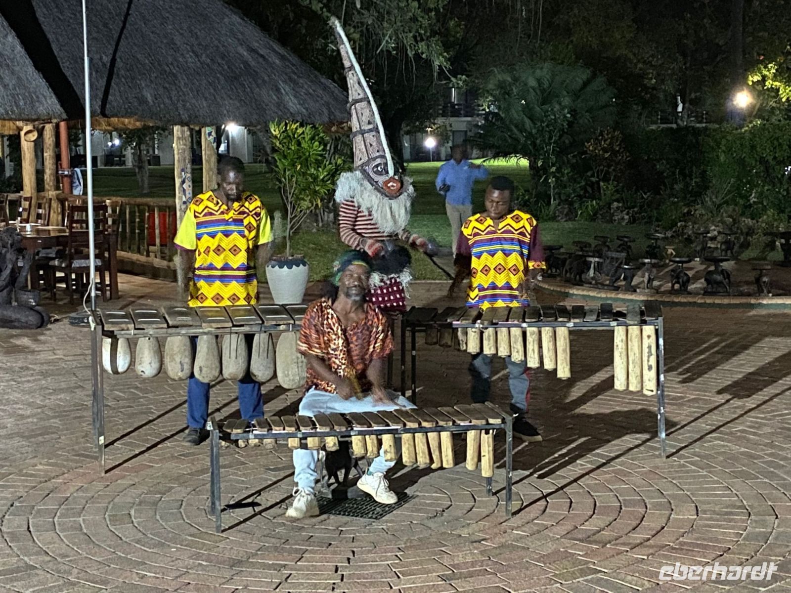 Unsere Reise führte uns heute nach Botswana zurück, in die Chobe Region. Doch zunächst besuchten wir das benachbarte Namushasha Culture Village, ein lebendiges Museumsdorf. Unter einem ca. 1.000 bis 1.500 Jahre alten Baobab, dem Urbaum, dem eine besondere Energie und magische Kräfte zugeschrieben werden, erhielten wir einige Einblicke in die Kultur und Lebensweise der lokalen Familien Clans: Wie ist so ein Dorf aufgebaut, wie arbeitet der Schmied und wie wird gefeiert, getanzt und gesungen. Auch dieser Besuch war interessant und spannend, zumal wir verschiedene Dinge selbst ausprobieren konnten, wie Mais stampfen oder der "Hippo-Trommel" Geräusche zu entlocken, um Flusspferde nachzuahmen. Auch der Medizin-Mann gab uns seinen Segen für eine sichere Weiterreise. Auf der Ngoma Bridge überquerten wir den trockenen Chobe Fluss. An der Grenze zu Botswana mussten wir ein wenig warten. Das Übliche mit Schuhe desinfizieren und so. Via Transitstraße ging es dann zügig durch den Chobe Nationalpark zu unserer Lodge in Kasane. Die Chobe Safari Lodge befindet sich am Ufer des gleichnamigen Flusses. Beim Check In herrschte Hochbetrieb und wir mussten abermals gedulden. Die Wartezeit überbrückten wir in der Lounge und Eberhardt spendierte ein kühles Bier für die ausgetrockneten Kehlen. Später konnten die Gäste ihre mehr als komfortablen Zimmer beziehen und ihre Freizeit genießen. Hartmut und Annett waren noch heimatlos, den die Lodge war überbucht. Am späten Nachmittag war dann auch für uns ein Schlafplatz außerhalb gefunden. Zum Abendessen bedienten wir uns am großzügigen Buffet im offenen Sedudu Restaurant.