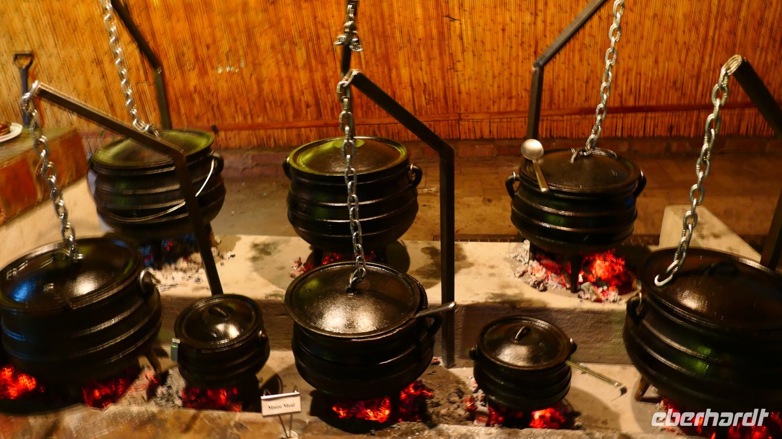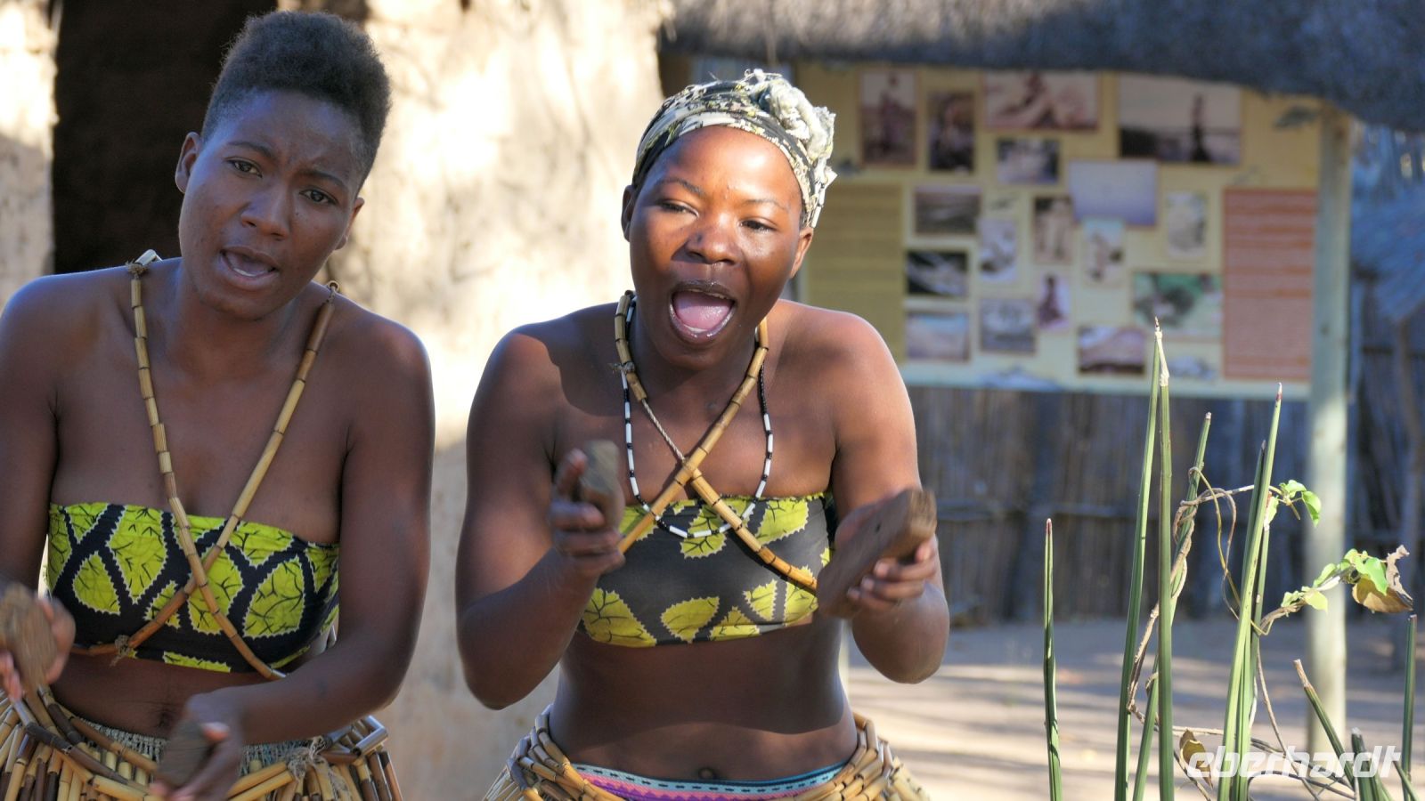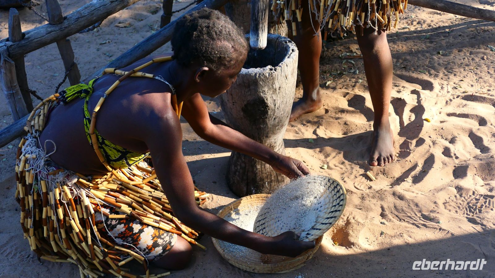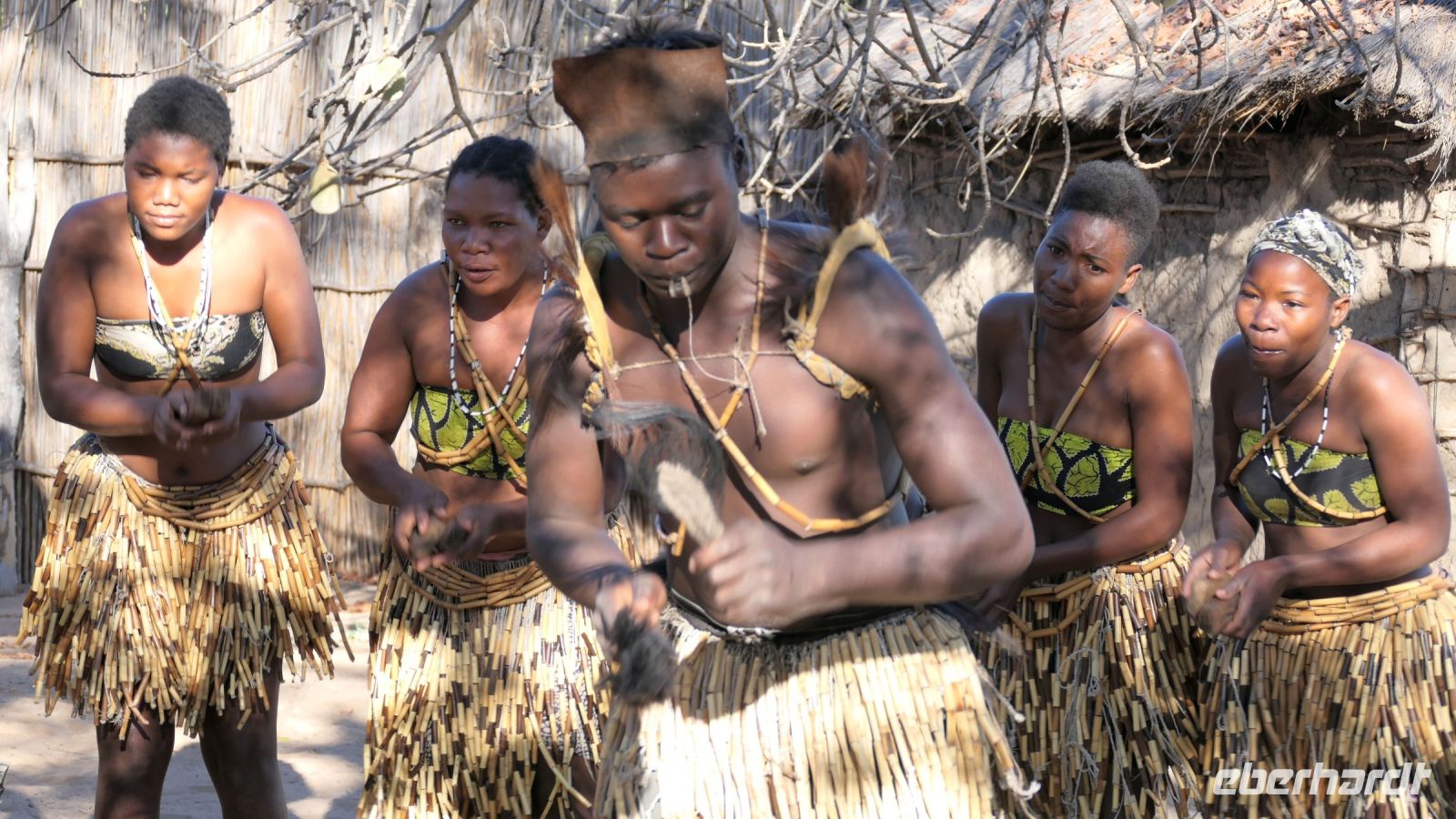 Unsere Reise führte uns heute nach Botswana zurück, in die Chobe Region. Doch zunächst besuchten wir das benachbarte Namushasha Culture Village, ein lebendiges Museumsdorf. Unter einem ca. 1.000 bis 1.500 Jahre alten Baobab, dem Urbaum, dem eine besondere Energie und magische Kräfte zugeschrieben werden, erhielten wir einige Einblicke in die Kultur und Lebensweise der lokalen Familien Clans: Wie ist so ein Dorf aufgebaut, wie arbeitet der Schmied und wie wird gefeiert, getanzt und gesungen. Auch dieser Besuch war interessant und spannend, zumal wir verschiedene Dinge selbst ausprobieren konnten, wie Mais stampfen oder der "Hippo-Trommel" Geräusche zu entlocken, um Flusspferde nachzuahmen. Auch der Medizin-Mann gab uns seinen Segen für eine sichere Weiterreise. Auf der Ngoma Bridge überquerten wir den trockenen Chobe Fluss. An der Grenze zu Botswana mussten wir ein wenig warten. Das Übliche mit Schuhe desinfizieren und so. Via Transitstraße ging es dann zügig durch den Chobe Nationalpark zu unserer Lodge in Kasane. Die Chobe Safari Lodge befindet sich am Ufer des gleichnamigen Flusses. Beim Check In herrschte Hochbetrieb und wir mussten abermals gedulden. Die Wartezeit überbrückten wir in der Lounge und Eberhardt spendierte ein kühles Bier für die ausgetrockneten Kehlen. Später konnten die Gäste ihre mehr als komfortablen Zimmer beziehen und ihre Freizeit genießen. Hartmut und Annett waren noch heimatlos, den die Lodge war überbucht. Am späten Nachmittag war dann auch für uns ein Schlafplatz außerhalb gefunden. Zum Abendessen bedienten wir uns am großzügigen Buffet im offenen Sedudu Restaurant.