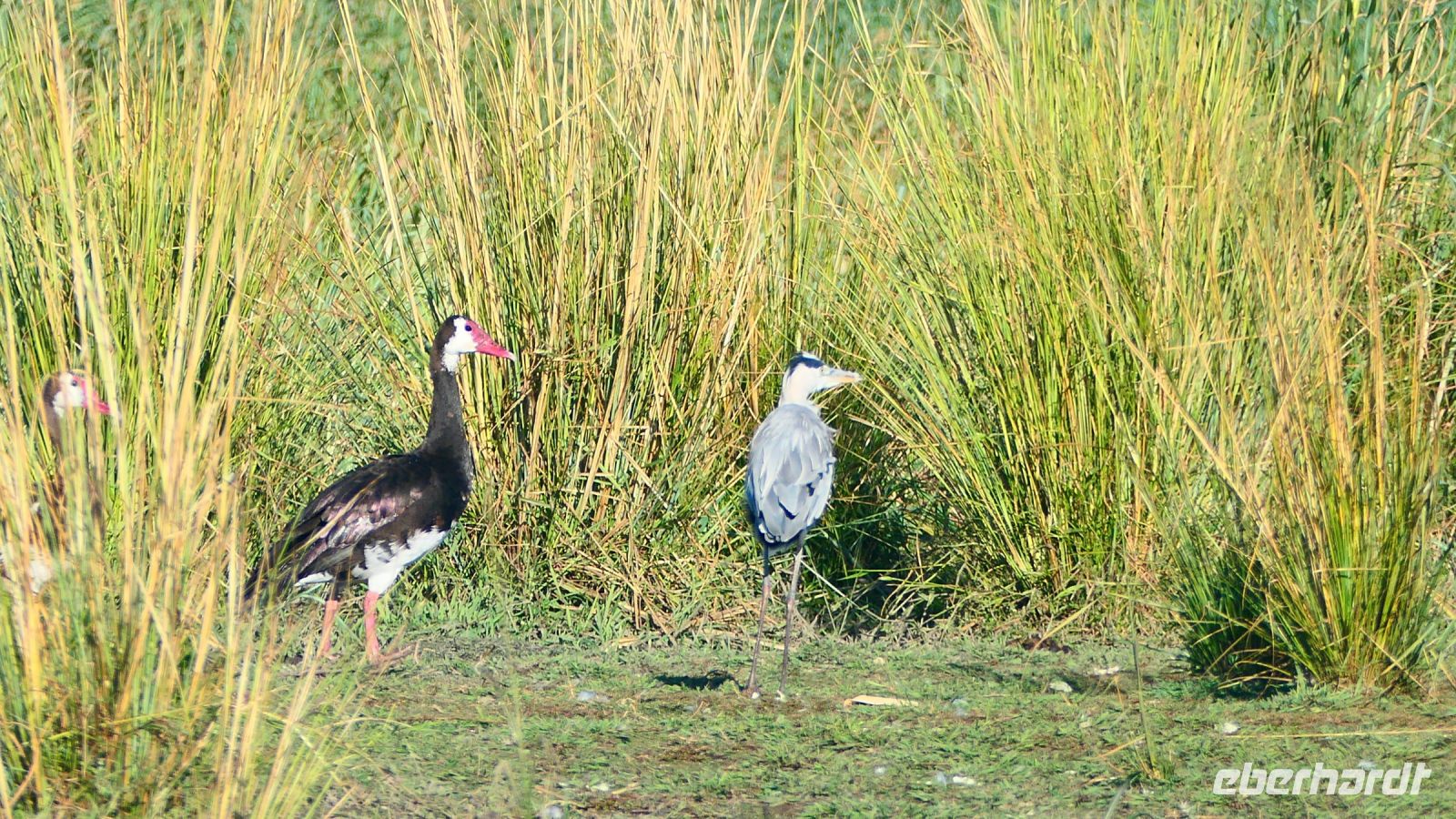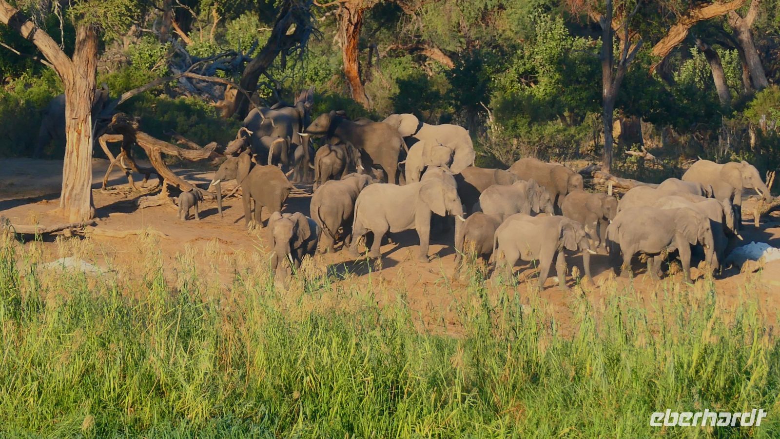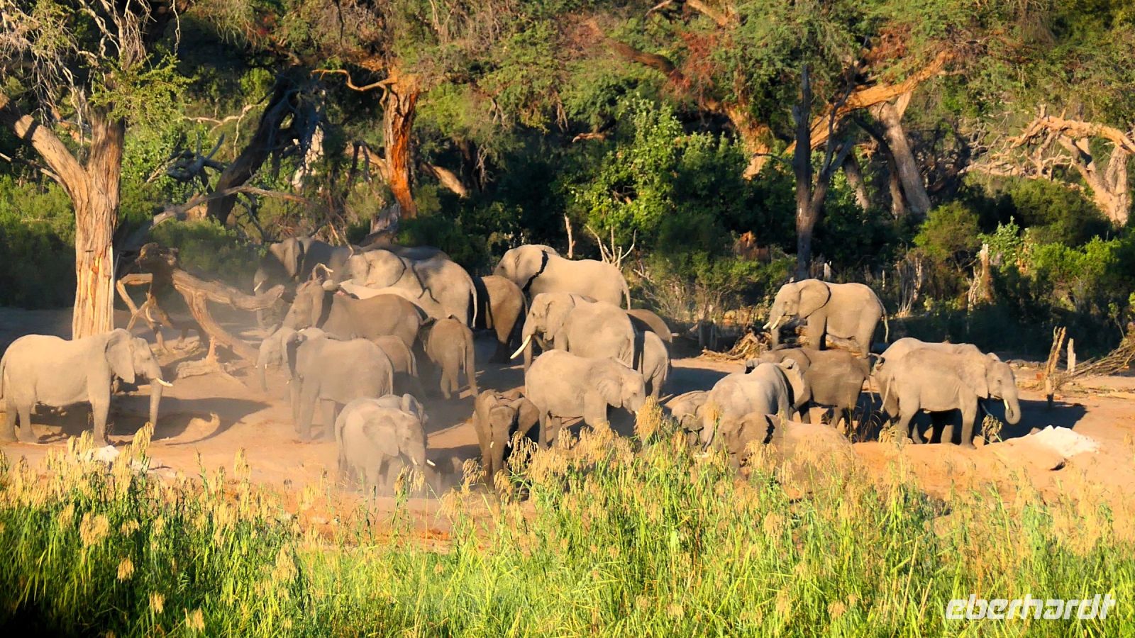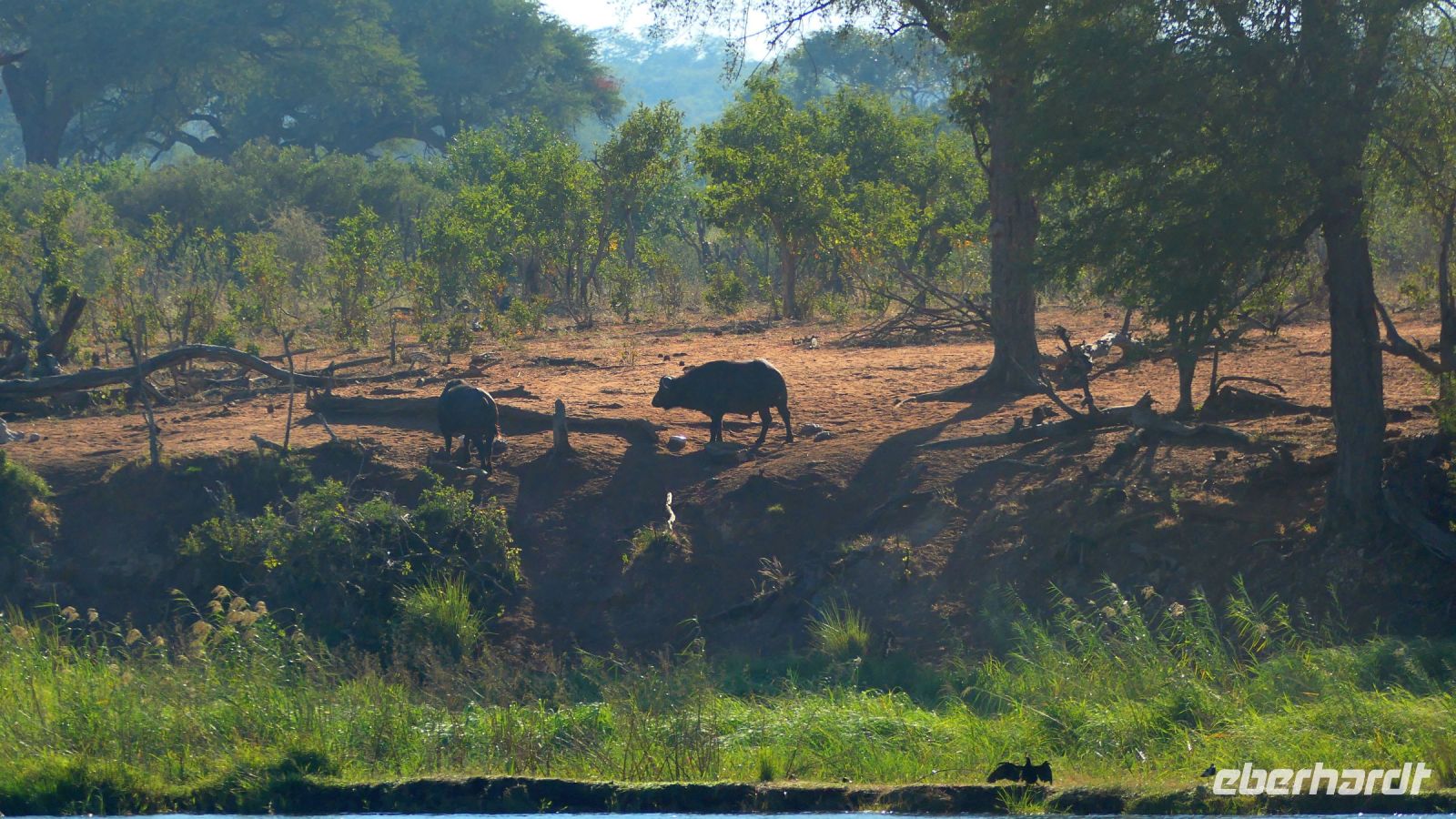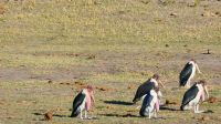 Nach angenehmer Nacht und entspanntem Frühstück weckten uns die grünen Ibisse (Hagedasch) lautstark. Die Morgenstimmung war mystisch, nach der kalten Nacht zogen Nebelschwaden über die Landschaft am Kwando. Nach dem Frühstück waren wir bereit für neue Abenteuer, getreu dem Motto: neuer Tag, neue Taten!. Via Bootstransfer setzten wir auf das "Festland" des Bwabwata Parks über. Unterwegs entdeckten wir Hippo Highways im Riedgras, später natürlich Hippos im Wasser, Krokodile, Bienenfresser, die in den Uferwänden ihre Brutstätten haben. Später sattelten wir in offene Jeeps um und starteten unsere Pirschfahrt durch den Bwabwata Nationalpark. Wir genossen die einmalige und wieder ganz andere Landschaft. Eine Buffelgruppe (Altherren-WG) graste friedlich in der Savanne, Madenhacker kümmerten sich um deren Fell. Wir sichteten auch viele Vögel wie Gabelracke und die lustigen Tokos, Klaffschnabel, Hammerkopf, Sattelstorch, Goliath- und Silberreiher.... Später Elefanten Dung und ein Warnruf eines missgelaunten Elefanten, der sich sichtlich von uns gestört fühlte. Harmoisch und friedlich ging es bei der größeren Elefantenherde mit Jungtieren zu. Aus nächster Nähe war es eine Freude, ihnen beim Frühstück zuzuschauen. Am Ufer des Kwandos (Horseshoe) stiegen wir später aus und beobachteten die idyllische Uferzone beim 2. Frühstück. Im Kwando versteckten sich ein paar Krokodile, also nicht zu weit von der Truppe entfernen. Auf dem Rückweg entdeckten wir noch einen Schreiseeadler, Kudus, Paviane, viele Impalas und einen stattlichen Letschwe-Bock sowie eine mind. 30köpfige Hippo-Familie. Auch der Hippo Roadblock im Wasser war noch da, ließ uns aber passieren.... Die Mittagsstunden verbrachten wir in unserer Lodge, einige unternahmen einen kleinen Spaziergang.