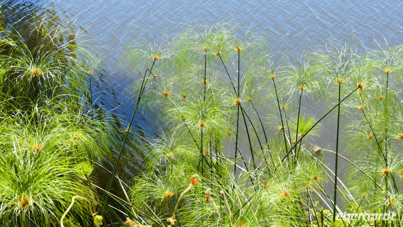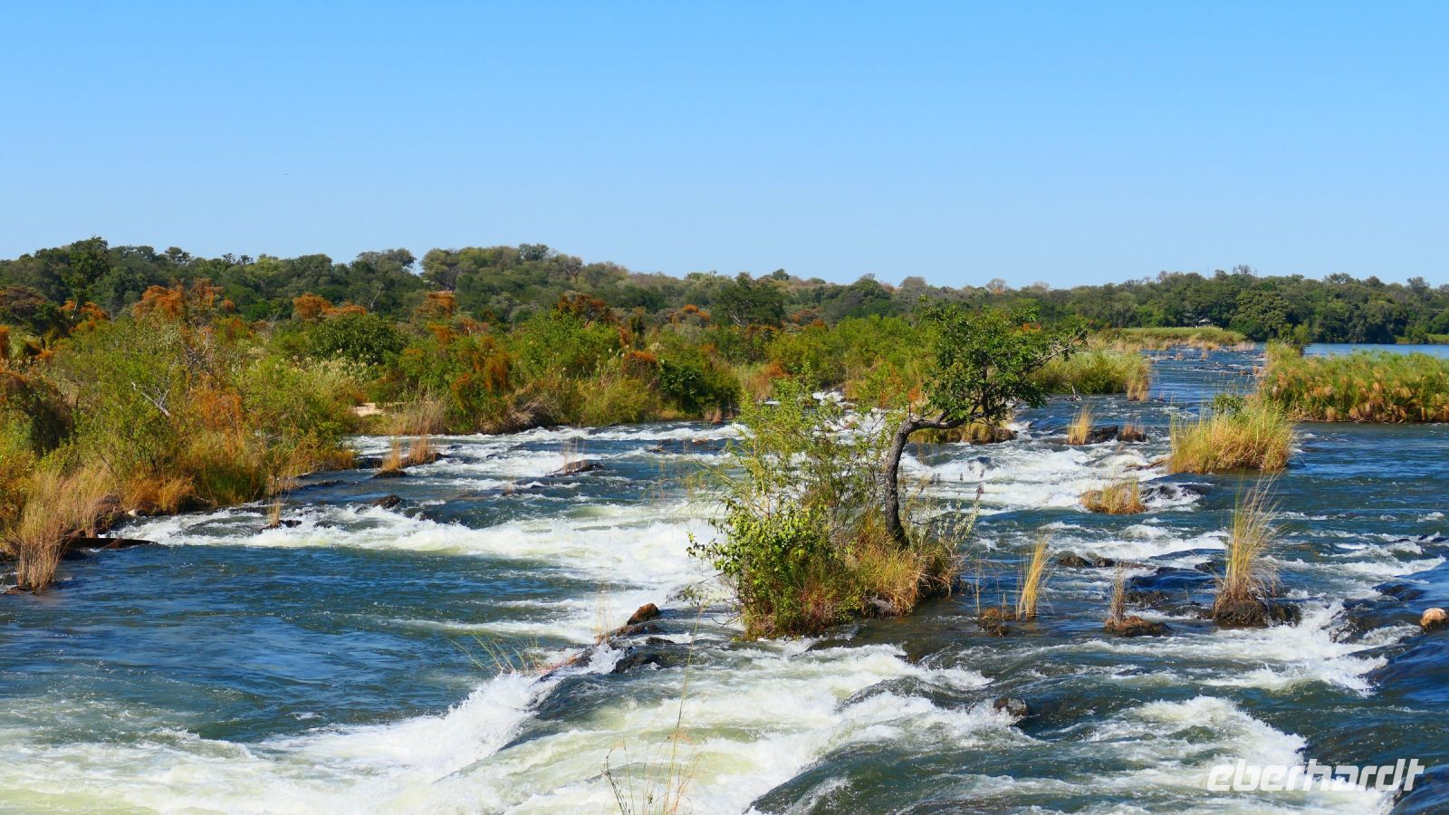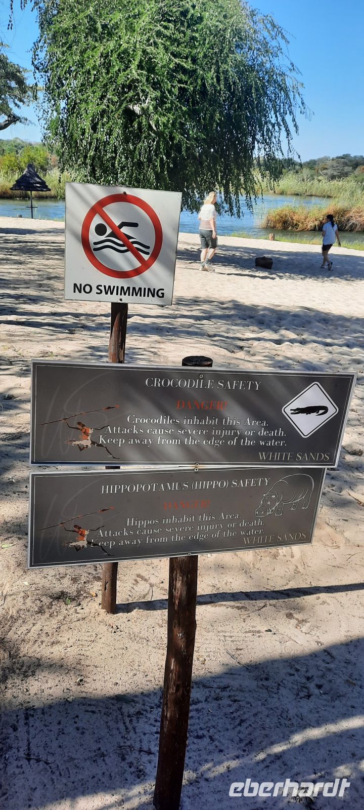 Ein letztes Frühstück in der Ndhovu Lodge mit Flusspferd, Wasserbock und Büffel im Blick und schon hieß es Abschied nehmen. Bei Divundu überquerten wir die Brücke über den Okavango. Kurz darauf bogen wir rechts ab und legten eine Stopp an den Popa Falls bei White Sands ein. Die Popa Falls sind ja keine Wasserfälle, sondern Stromschnellen. Auf einem Knick bannt sich hier der Okavango über Steine seinen weg und schüttet durch die Strömung weißen Sand auf - daher da Name. Mikel, ein lokaler Guide führte uns bei diesem morgendlichen Spaziergang. Das Resort Popa Falls ist ein privates Projekt in Zusammenarbeit mit dem Tourismusamt Namibia. Bisher können an diesem idyllischen Ort mit wenige Gäste, meist Selbstversorger übernachten. Später fuhren wir auf schnurgerader Teerstraße durch die Sambesi-Region (Caprivistreifen). Rechts und links viele Dörfer mit ihren Rundhütten aus Lehm, aber auch modernere Gebäude. Verkehrsschilder warnten vor Elefanten, die hier regelmäßig durchstapfen, gesehen haben wir dennoch keine. Bei Kongola erreichten wir den Kwando, der wie der Okavango ebefalls in Angola