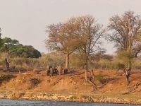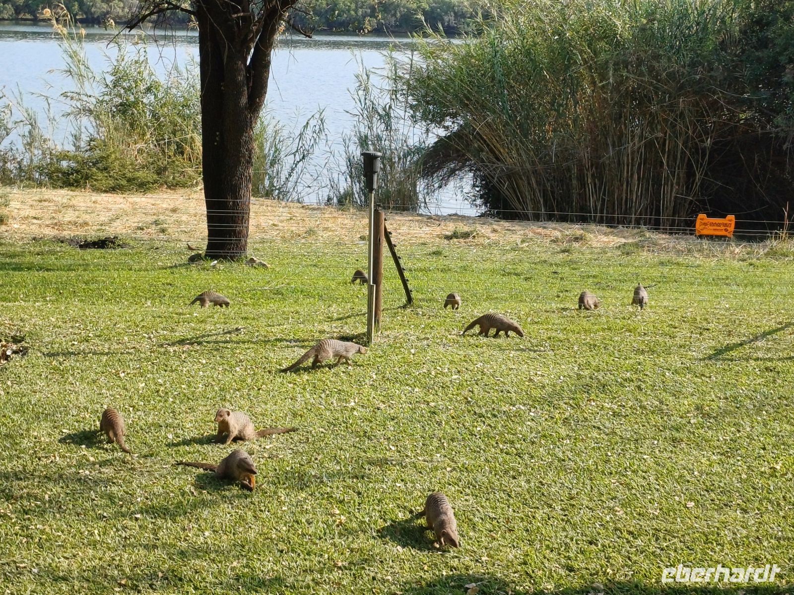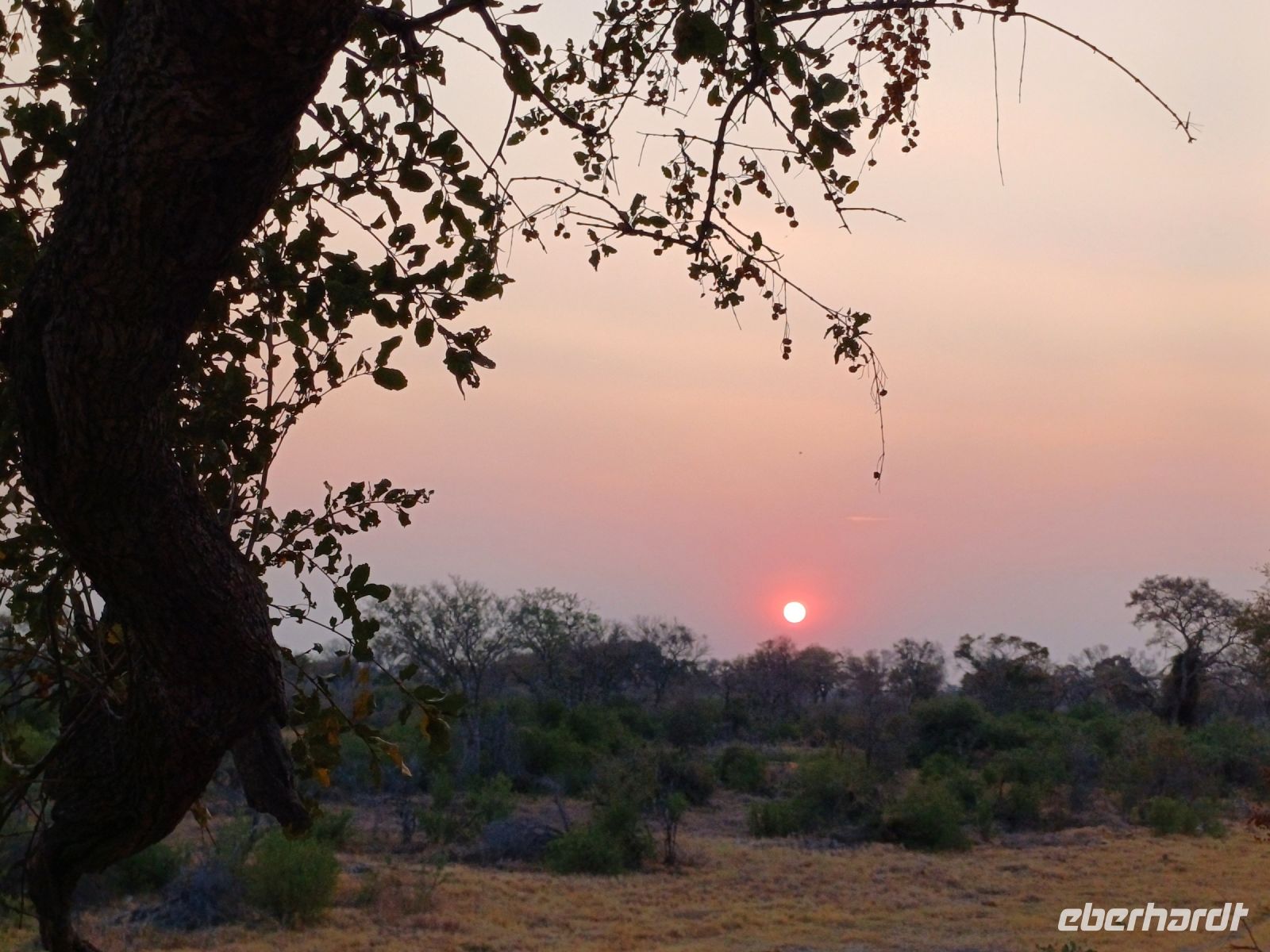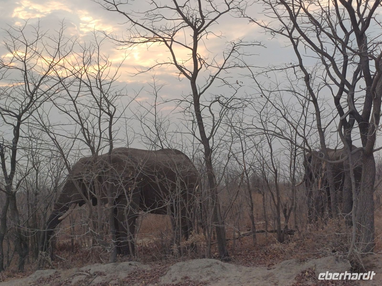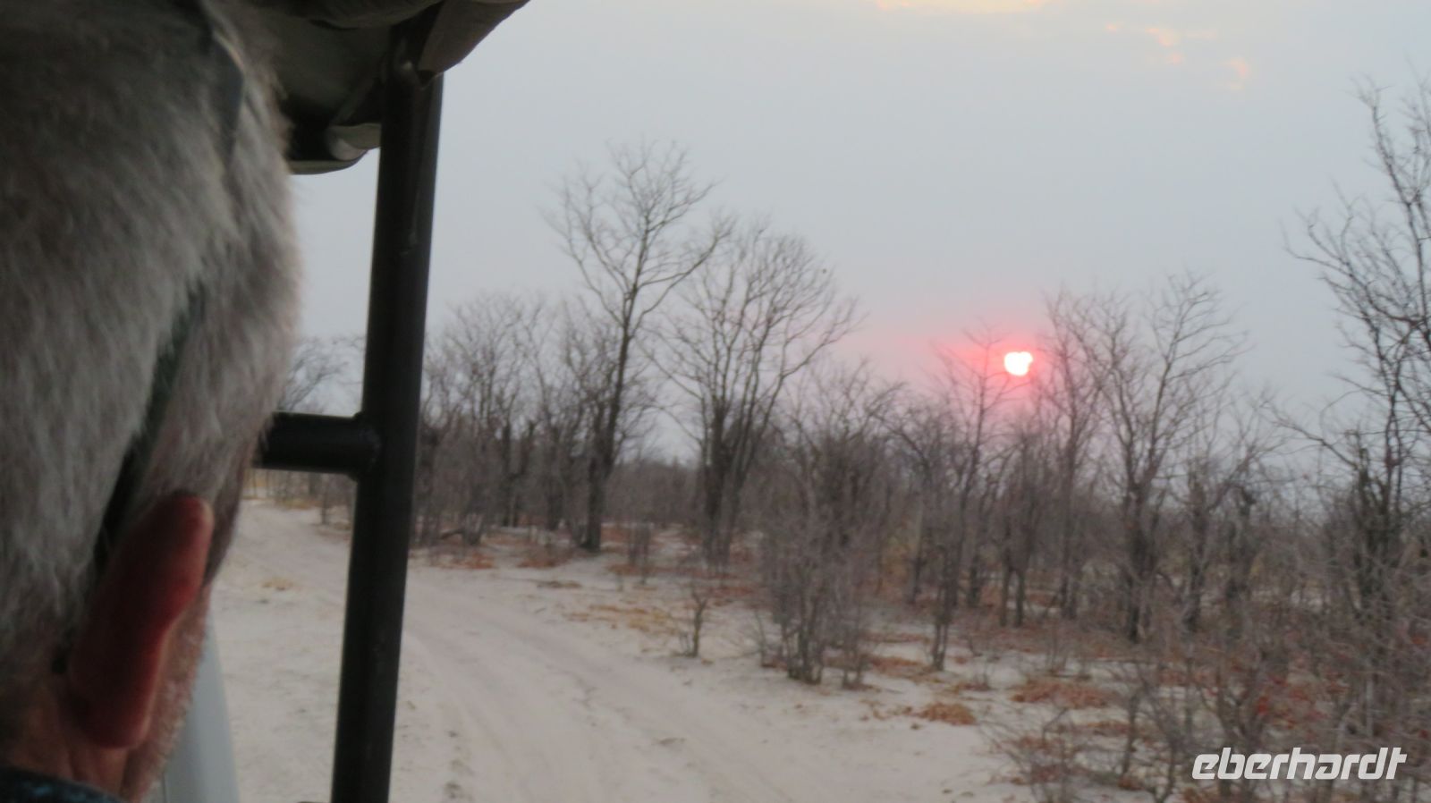 Heute standen Pirschfahrten per Boot und per Jeep auf dem Programm. Am Morgen ging es zur Bootstour auf dem Sambesi. Durch den fehlenden Regen hatte dieser nicht viel Wasser und deshalb konnten wir mit unserem Böötchen nicht in alle Seitenarme. Wir konnten aber trotzdem viele Tiere entdecken - Krokodile, Warane, Buschböcke mit Nachwuchs,, Schlangenhalsreiher, Geier und eine Vielzahl einheimischer Vögel. Am Nachmittag stand die Jeep-Safari auf dem Programm. Wer vorher noch Lust hatte konnte mit Jaco und mir einen kleine Wanderung entlang des den Flussarmes bis zum Namushasha-Herritage Center unternehmen. Wir entdeckten wieder Krokodile, Hippos, allerlei Vögel und an interessanten Informationstafeln waren die hier lebenden Tiere beschrieben. Am Nachmittag startete unsere Jeep-Safari in den Sonnenuntergang erst einmal per Boot zu den bereitstehenden Jeeps. Unseren Weg kreuzten Giraffen, Antilopen, Zebras, Marabus, Impalas, Hippos, jede Menge Elefanten auf dem Weg zum Wasser oder zurück und viele Vögel. Leider haben wir von den hier lebenden Löwen nur die Spuren entdecken können. Der nahende Sonnenuntergang stoppte unsere Suche. Sobald die Sonne am Horizont verschwunden ist mussten wir wieder in der Lodge sein. Schade. Bei einem schönen Abendessen unterm Sternenhimmel endete ein wieder erlebnisreicher Happy Day.