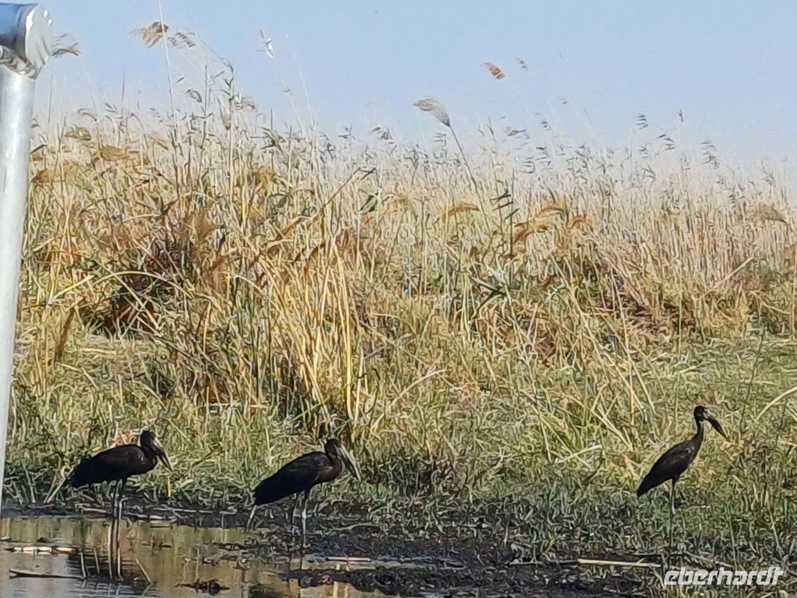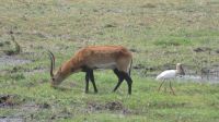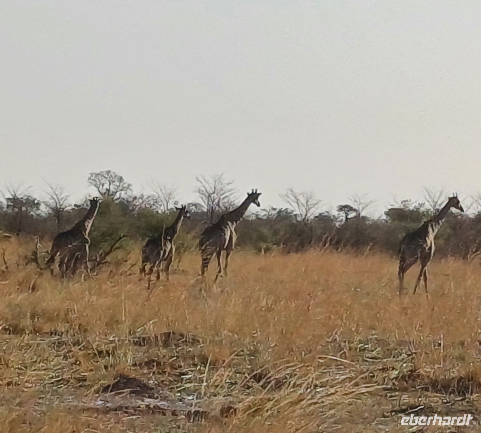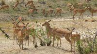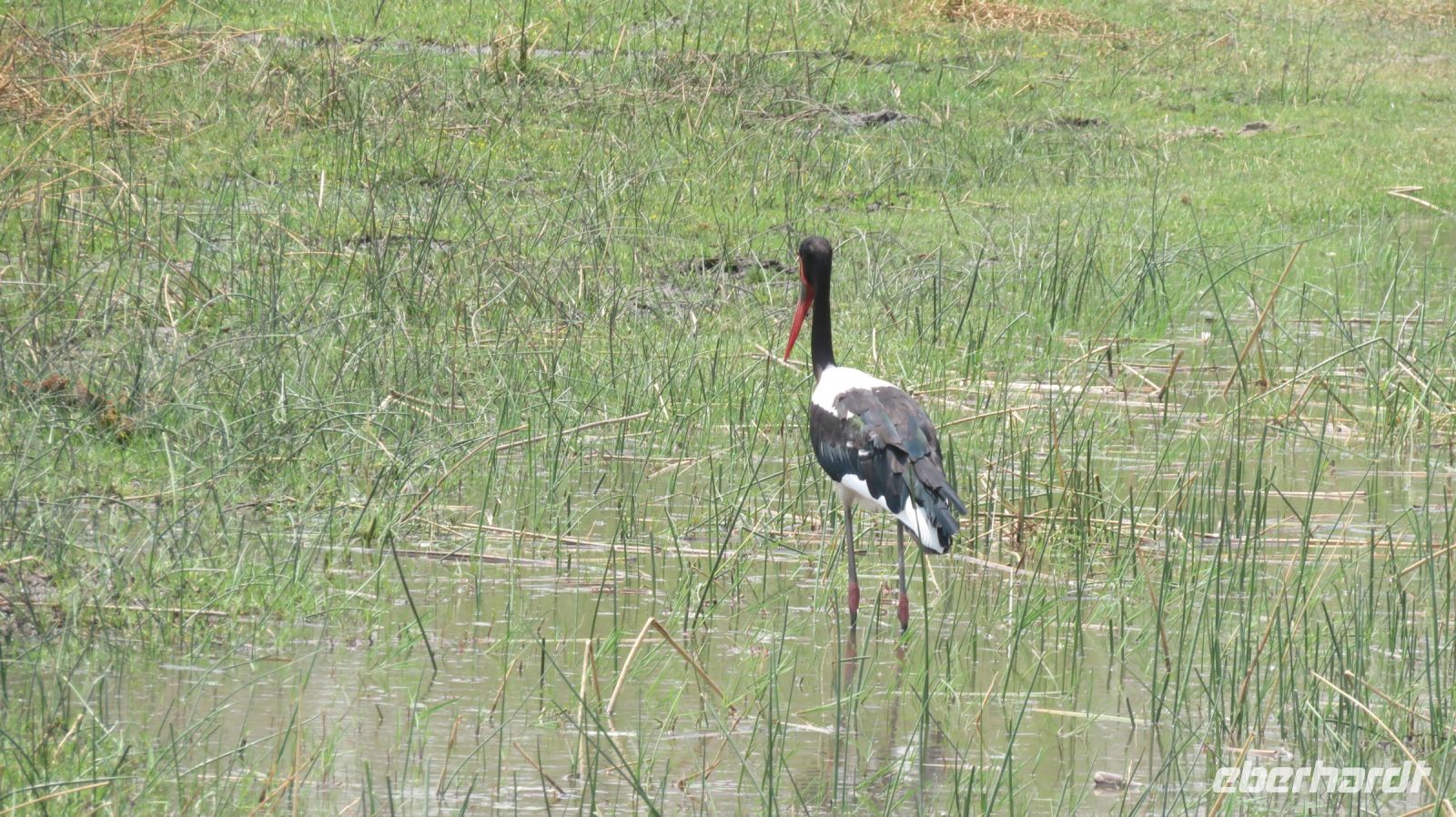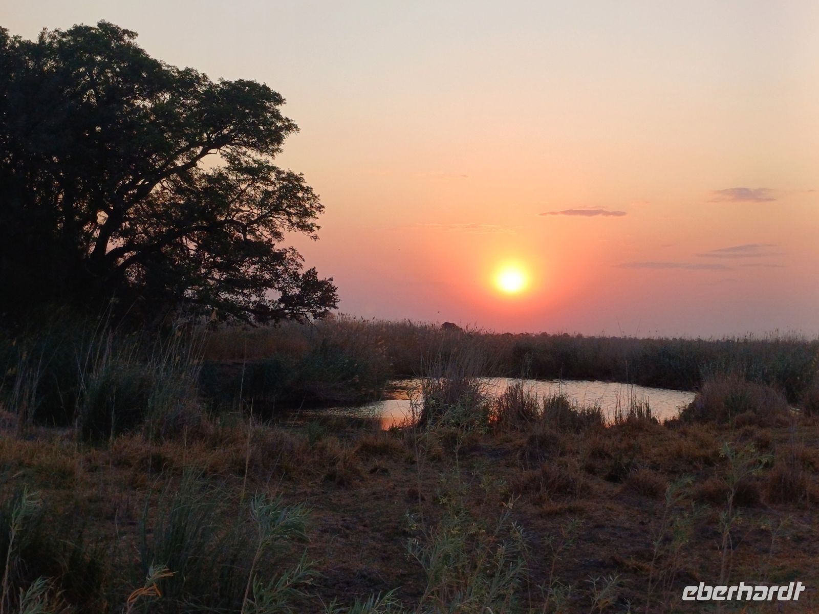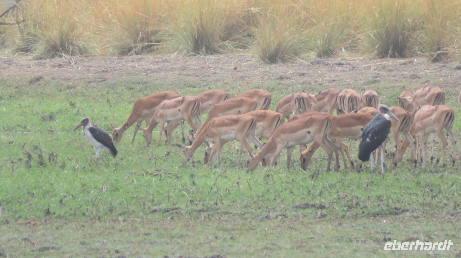 Heute standen Pirschfahrten per Boot und per Jeep auf dem Programm. Am Morgen ging es zur Bootstour auf dem Sambesi. Durch den fehlenden Regen hatte dieser nicht viel Wasser und deshalb konnten wir mit unserem Böötchen nicht in alle Seitenarme. Wir konnten aber trotzdem viele Tiere entdecken - Krokodile, Warane, Buschböcke mit Nachwuchs,, Schlangenhalsreiher, Geier und eine Vielzahl einheimischer Vögel. Am Nachmittag stand die Jeep-Safari auf dem Programm. Wer vorher noch Lust hatte konnte mit Jaco und mir einen kleine Wanderung entlang des den Flussarmes bis zum Namushasha-Herritage Center unternehmen. Wir entdeckten wieder Krokodile, Hippos, allerlei Vögel und an interessanten Informationstafeln waren die hier lebenden Tiere beschrieben. Am Nachmittag startete unsere Jeep-Safari in den Sonnenuntergang erst einmal per Boot zu den bereitstehenden Jeeps. Unseren Weg kreuzten Giraffen, Antilopen, Zebras, Marabus, Impalas, Hippos, jede Menge Elefanten auf dem Weg zum Wasser oder zurück und viele Vögel. Leider haben wir von den hier lebenden Löwen nur die Spuren entdecken können. Der nahende Sonnenuntergang stoppte unsere Suche. Sobald die Sonne am Horizont verschwunden ist mussten wir wieder in der Lodge sein. Schade. Bei einem schönen Abendessen unterm Sternenhimmel endete ein wieder erlebnisreicher Happy Day.
