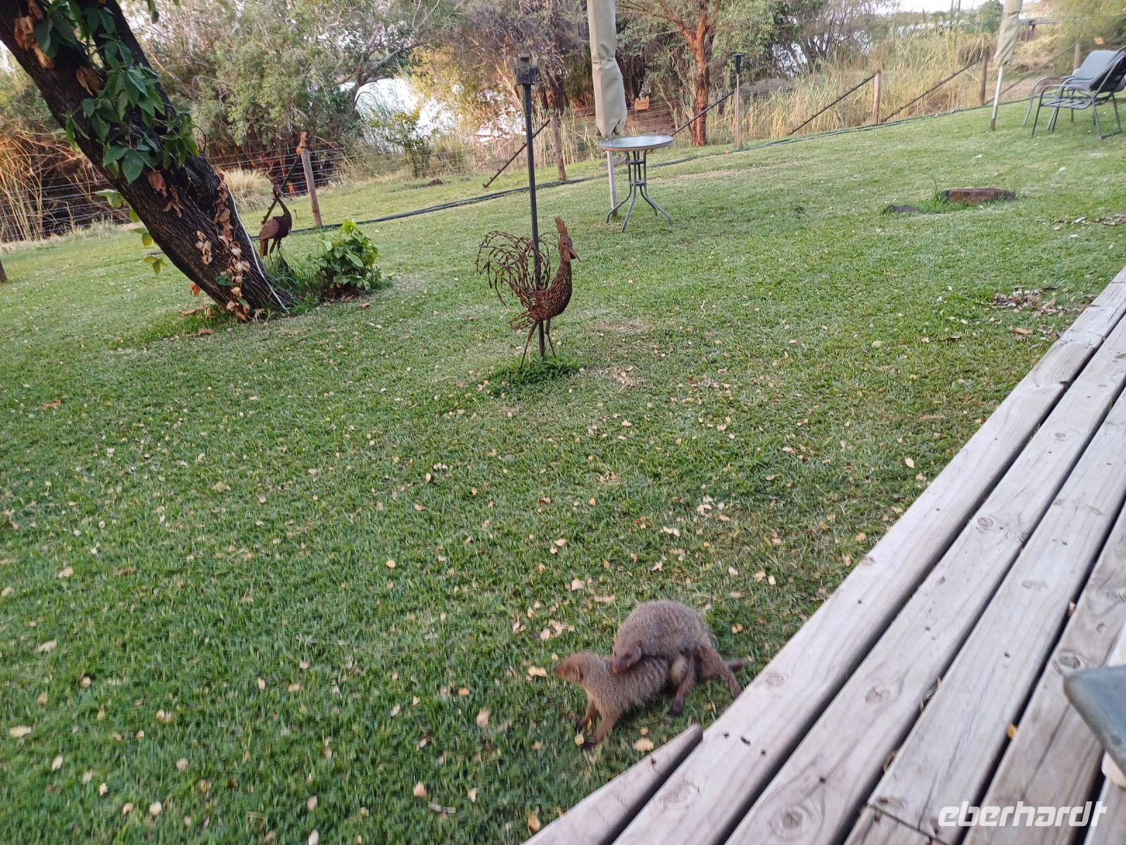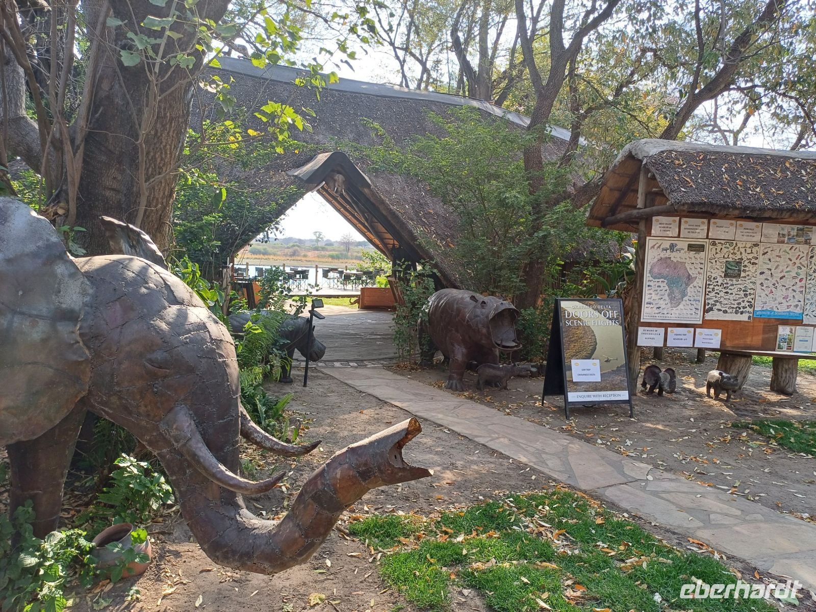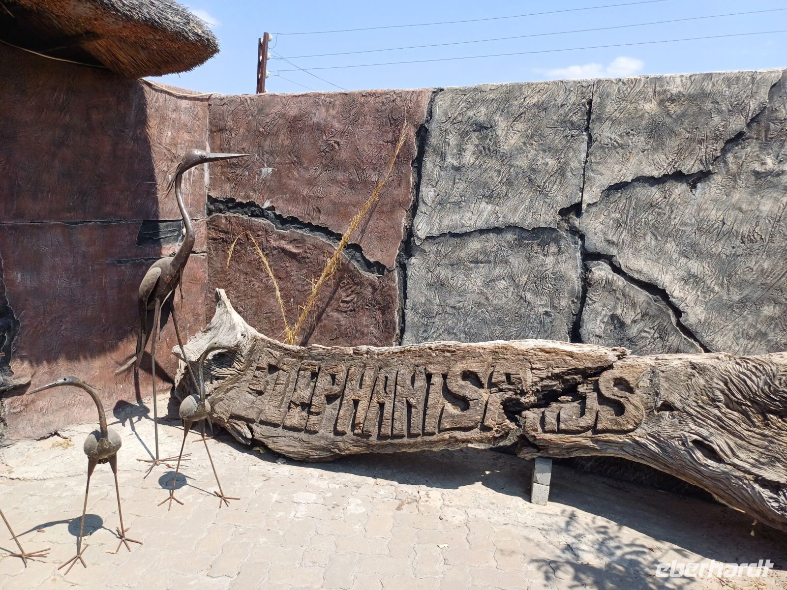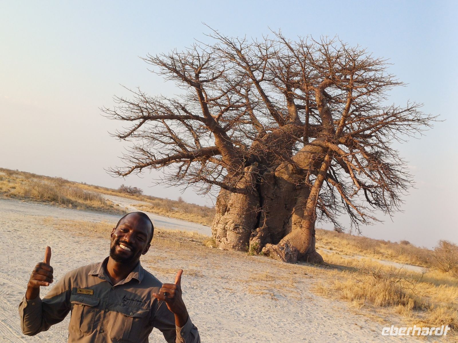 Nach einem gemütlichen Frühstück ging unsere Entdeckungsreise weiter Richtung Maun. Nach wenigen Kilometern der erste Stopp an einem ca. 2,50 Meter hohen Termitenhügel. Hier erzählte Jaco vieles über die kleinen, unter der Erde lebenden, Insekten. Ein Termitenbau wächst ca. 2,5 Zentimeter pro Jahr und so haben wir vor einem ca. 100 Jahre alten Bauwerk gestanden. Weiter ging unsere Fahrt bis am Straßenrand ein riesiges Erdferkel, allerdings aus Plastik, auftauchte. Die Einfahrt zu Baobab Planet, eine kleine Lodge wo wir eine kurze Rast einlegten und herrliche alte Baobabs (afrikanische Affenbrotbaum) fotografieren konnten, die über 4000 Jahre alt seien sollen. Nachdem wir am Straßenrand wieder Giraffen und Elefanten gesichtet haben erreichen wir am Nachmittag Maun und fuhren direkt zu unserer Lodge, welche wunderschön direkt am Thamalakane River gelegen ist. Die geräumigen Zimmer waren schnell bezogen und erste Erkundungsgänge in der Anlage unternommen. Außerdem hiess es Koffer umpacken, da es am kommenden Tag nur mit kleinem Gepäck & per Jeep ins Zeltcamp ging.Den Abschluss des Tages bildete dann das beim Sonnenuntergang romantische Abendessen.