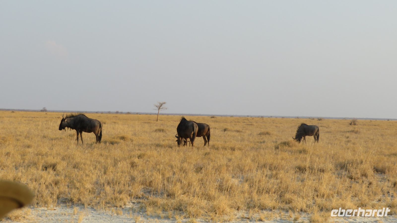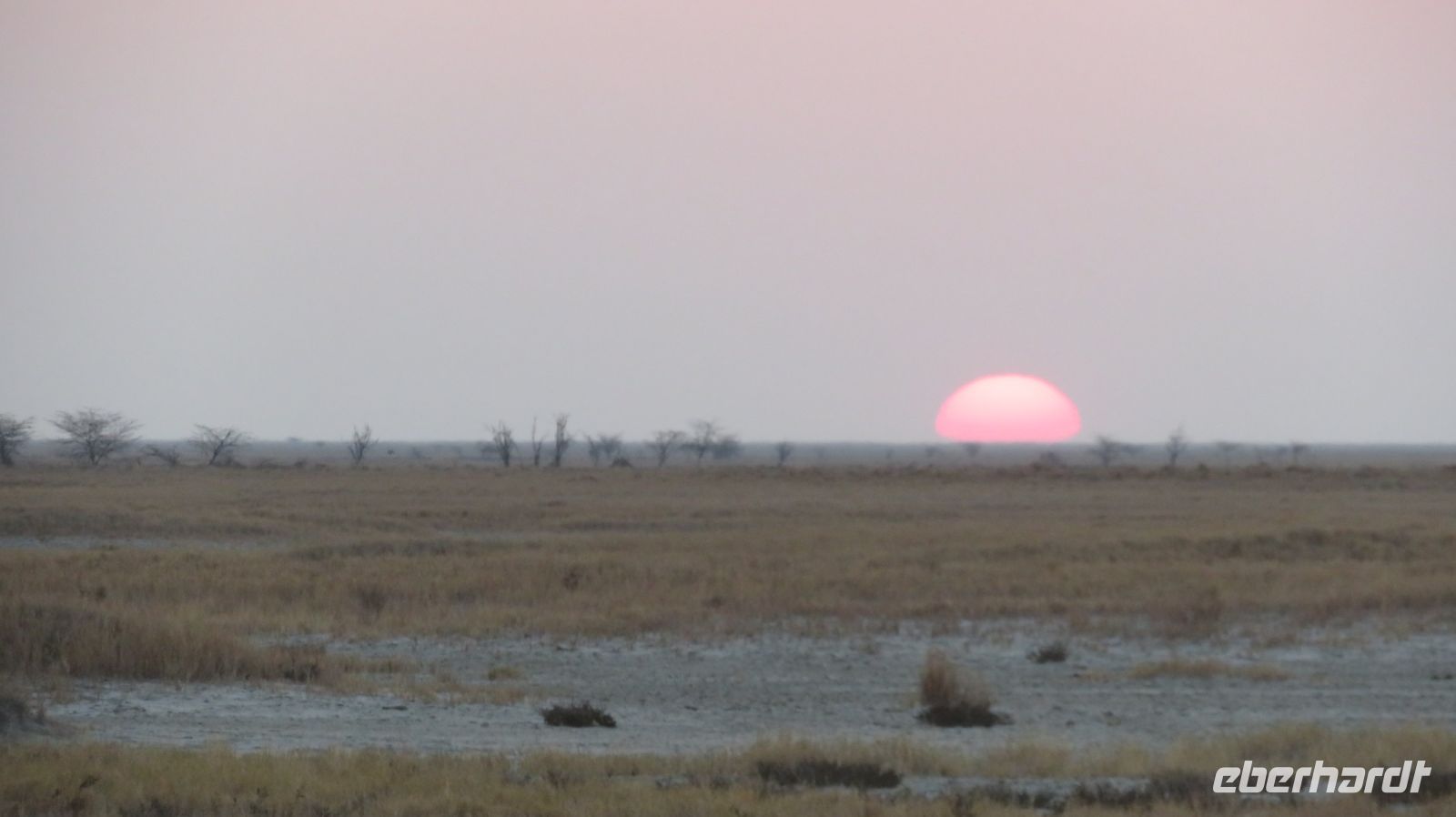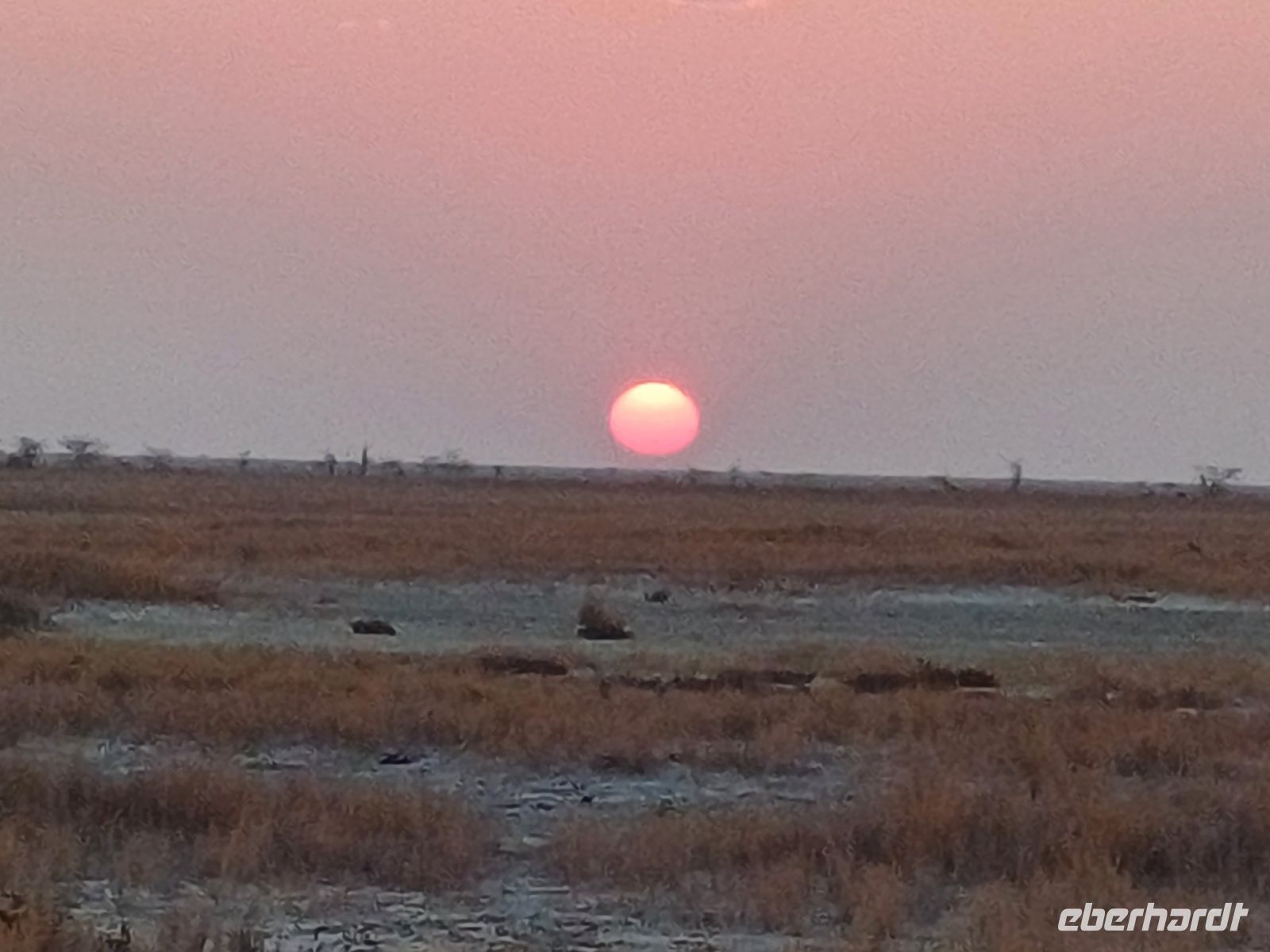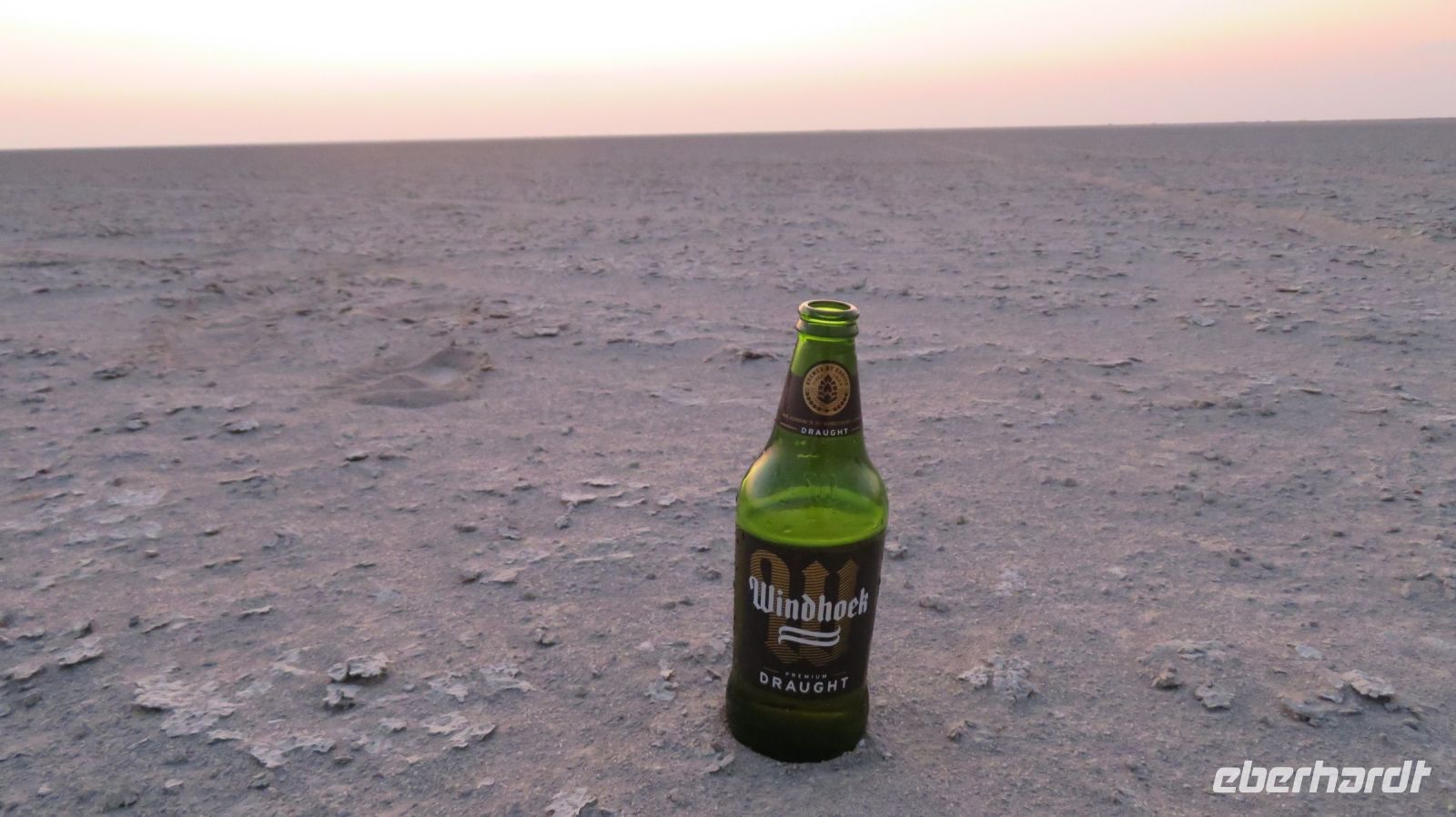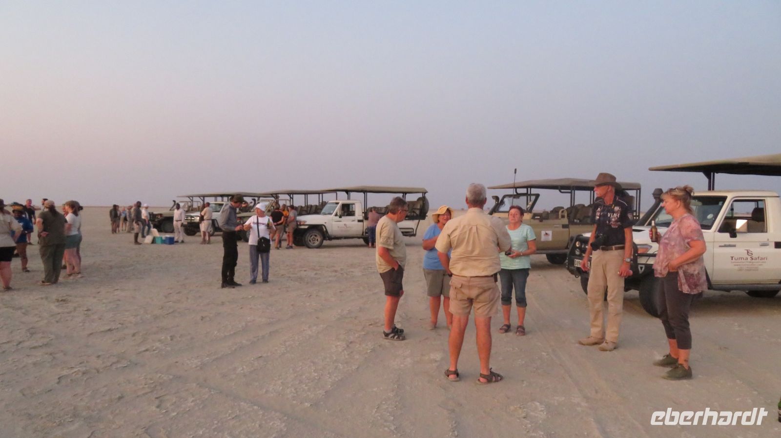 Nach 20 Minuten war dieser wieder aufgetaucht und los geht in die fast vegetationslosen Salzpfannen, mit einer Größe von rund 17.000 Quadratkilometern die Größte in der Welt. In der Pfanne sehen wir zum Beispiel Gnus, die hier völlig unbehelligt leben können, da sie keine natürlichen Feinde, wie Löwen oder Leoparden haben. Da die Pfanne völlig ausgetrocknet ist waren leider keine Pelikane oder Flamingos zu finden. Wir erleben einen wunderschönen Sonnenuntergang in der Pfanne. Der Tag endet mit einem schmackhaften