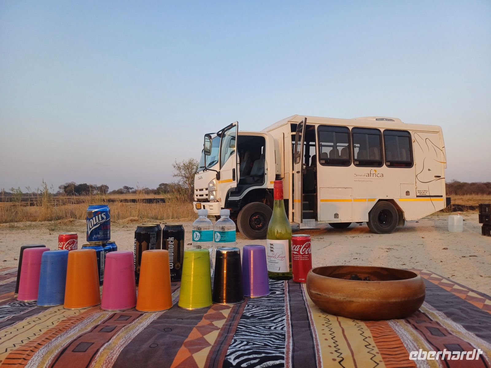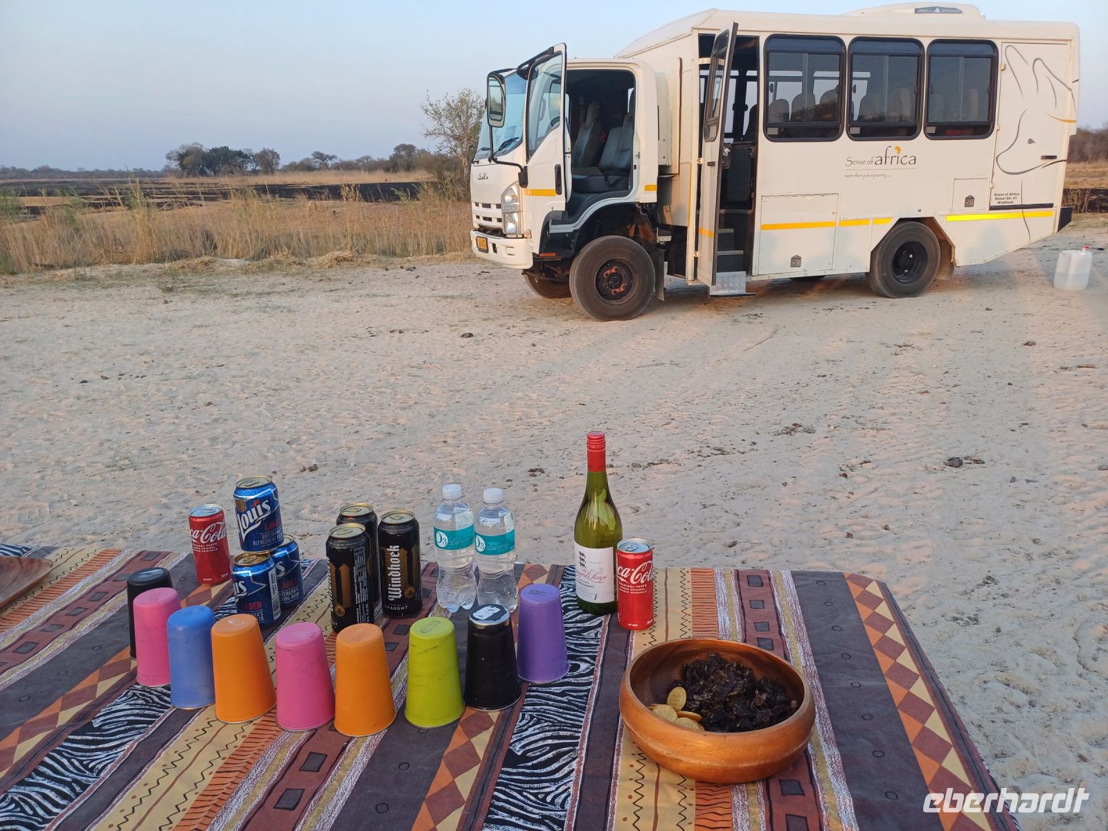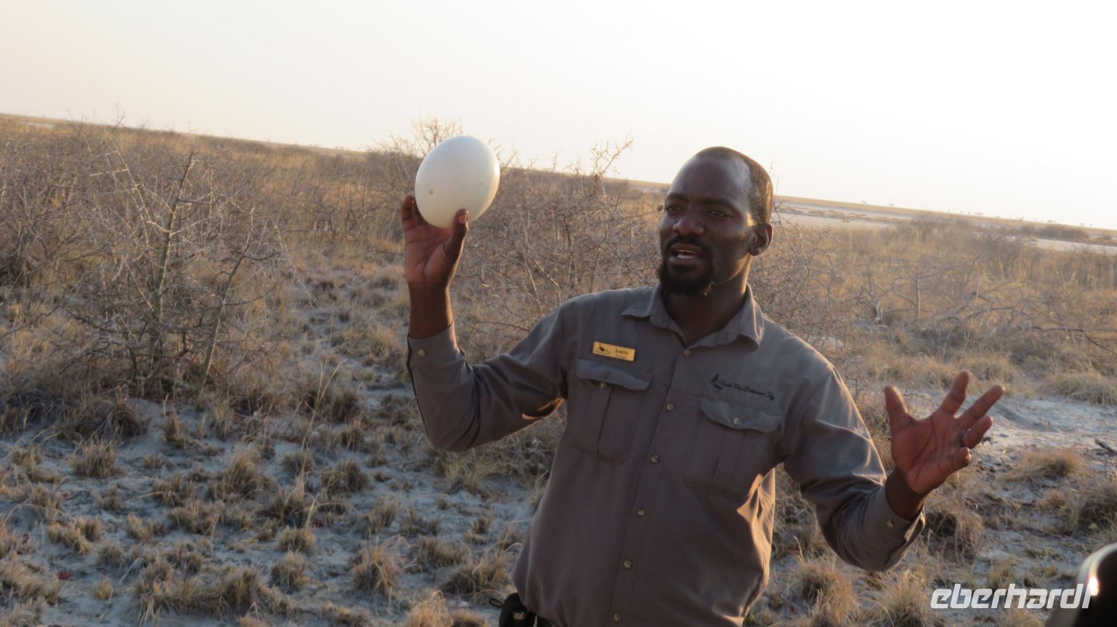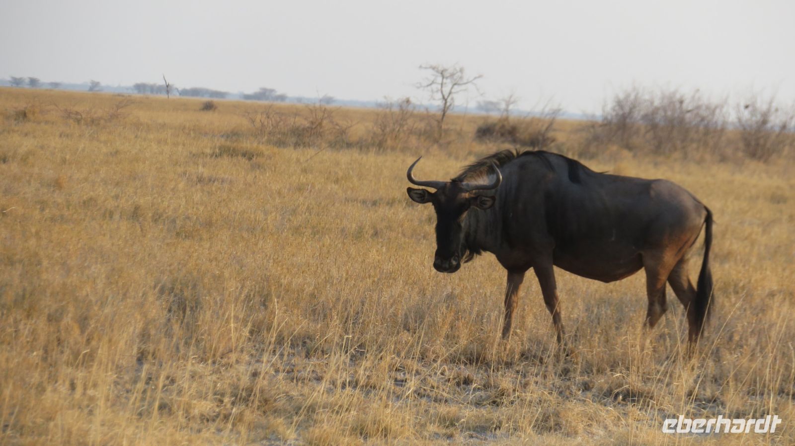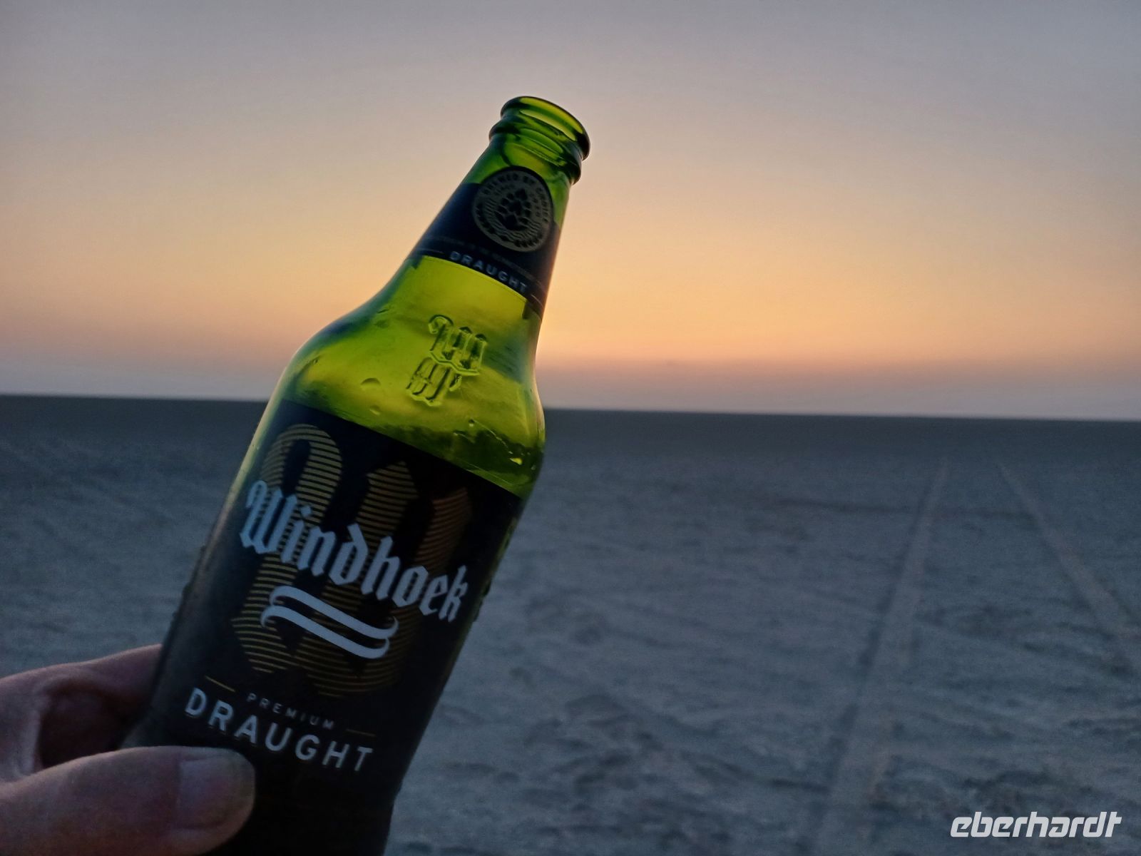 Nach 20 Minuten war dieser wieder aufgetaucht und los geht in die fast vegetationslosen Salzpfannen, mit einer Größe von rund 17.000 Quadratkilometern die Größte in der Welt. In der Pfanne sehen wir zum Beispiel Gnus, die hier völlig unbehelligt leben können, da sie keine natürlichen Feinde, wie Löwen oder Leoparden haben. Da die Pfanne völlig ausgetrocknet ist waren leider keine Pelikane oder Flamingos zu finden. Wir erleben einen wunderschönen Sonnenuntergang in der Pfanne. Der Tag endet mit einem schmackhaften