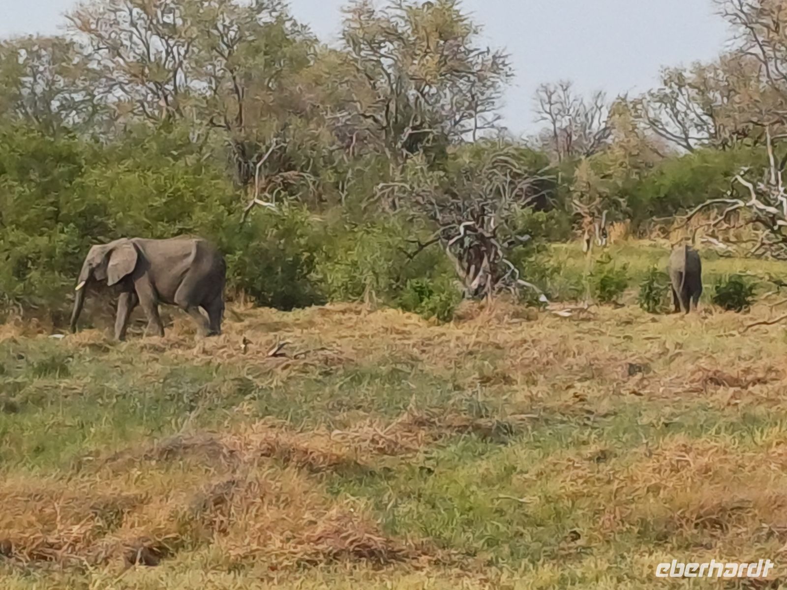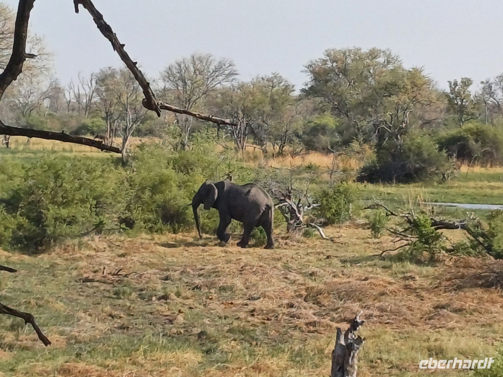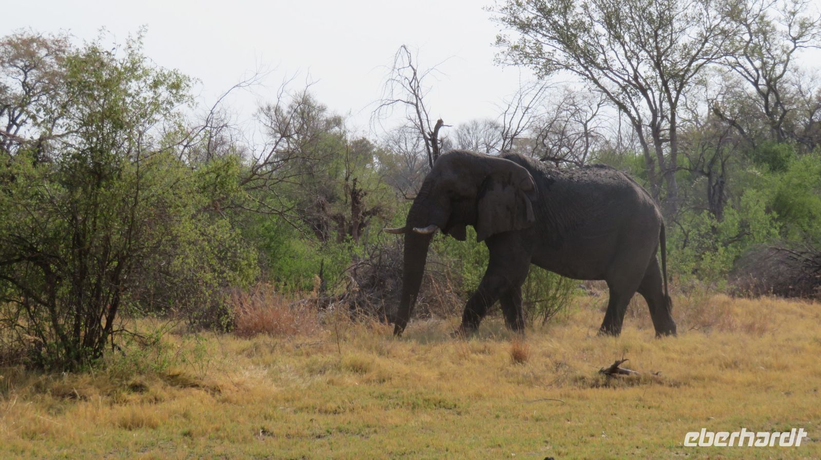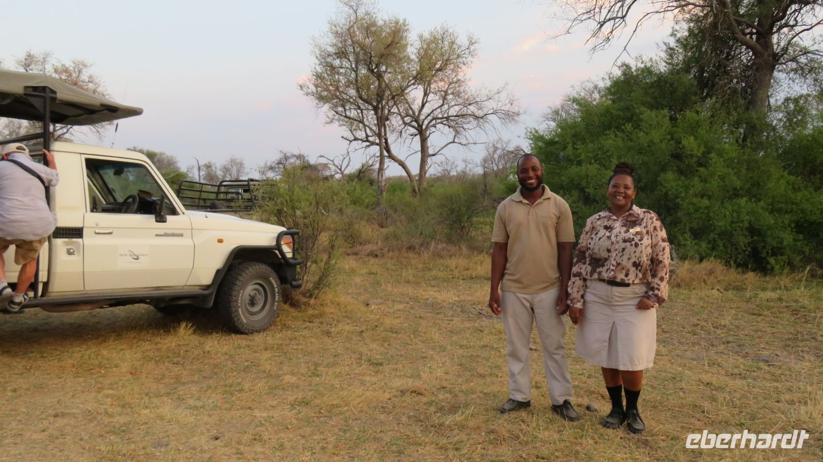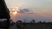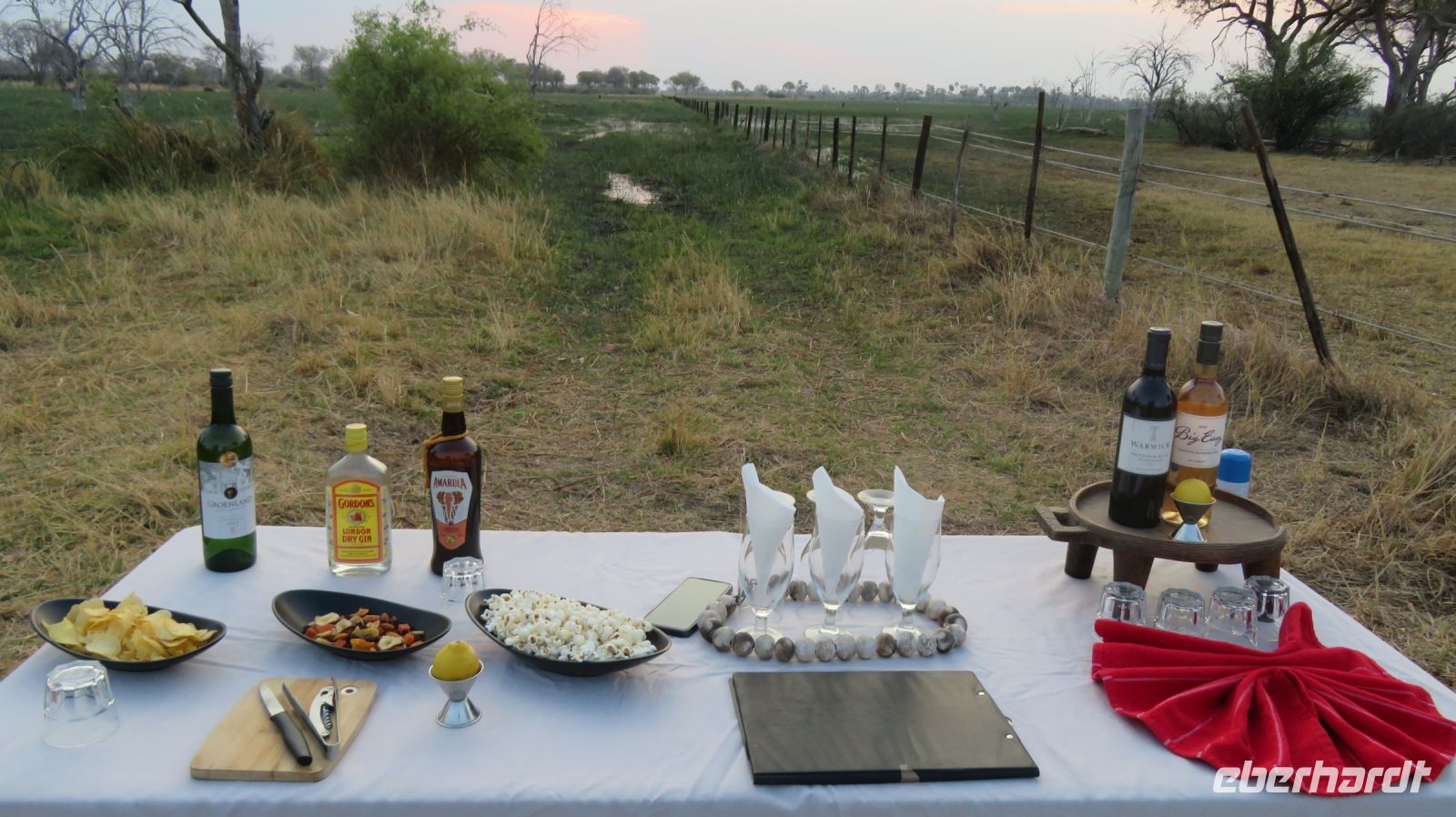 Nach dem gemütlichen Frühstück wurde unser "großes" Reisegepäck im Truck eingeschlossen, der in der Thamelakane River Lodge geparkt wurde. Für uns ging es mit dem Jeep für die kommenden zwei Tage in die wirkliche Wildnis. Erst über die heissen Asphaltstraßen von Maun, dann über Sandwege entlang des Büffelzauns erreichen wir die, abseits der Zivilisation liegende, Shokomoka Lodge. Während unserer Fahrt sahen wir mehrere größere Elefantenherden und einige andere Tiere. In der Lodge wurden wir herzlich von Otti, der Managerin und Ihrem Team begrüßt und genossen unseren Mittagsimbiss. Anschließend bezogen wir unsere sehr Zelte, welche sehr komfortabel eingerichtet waren. Dann konnten wir von der kleinen Holzterrasse der Lodge aus die ersten Tiere beobachten - Warzenschweine, Antilopen, verschiedene Vögel und natürlich Elefanten. Am späten Nachmittag fuhren wir zu einem kleinen Sundowner-Picknick im Gelände der Lodge. Auf der Fahrt dahin entdeckten wir einen im Baum hängenden Leopardenriss (der Leopard war leider nicht da) und wurden wieder von Elefanten-Familien bestaunt. Mitten in der Wildnis hatten Otti & Ihr Team ein wunderschönes Picknick Buffet aufgebaut und wir genossen bei Cola, Wein, Bier oder Gin-Tonic umrahmt von vielen Tierstimmen einen schönen Sonnenuntergang. Das leckere Abendessen & das gemütliche Beisammensein am Lagerfeuer rundete den Tag ab.