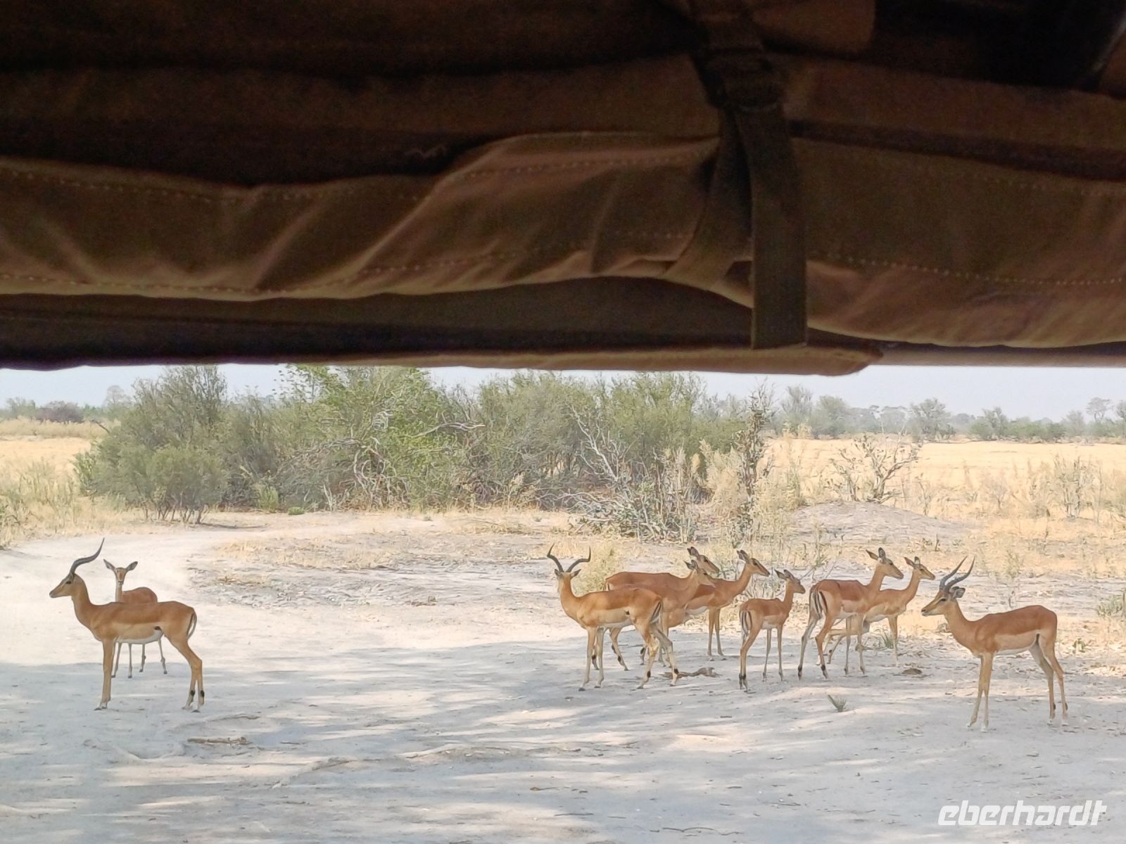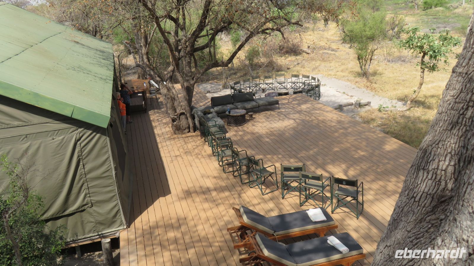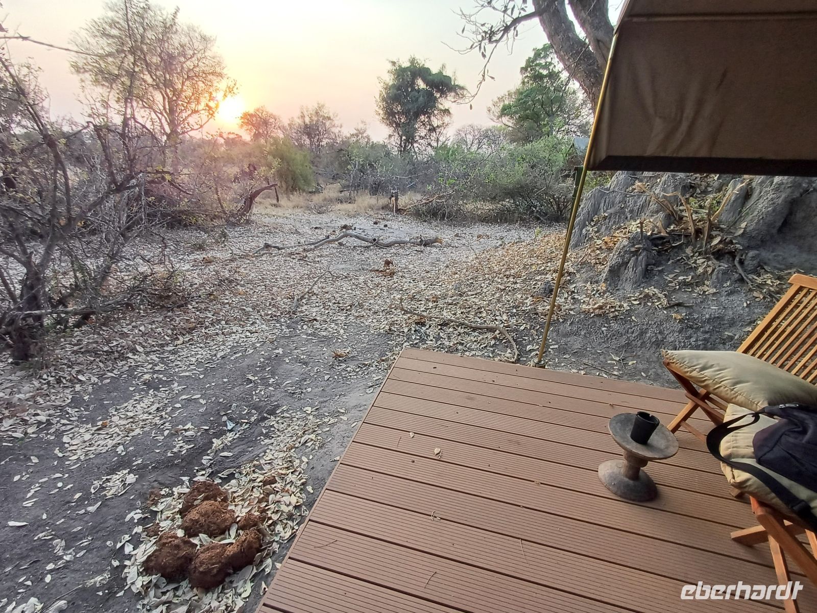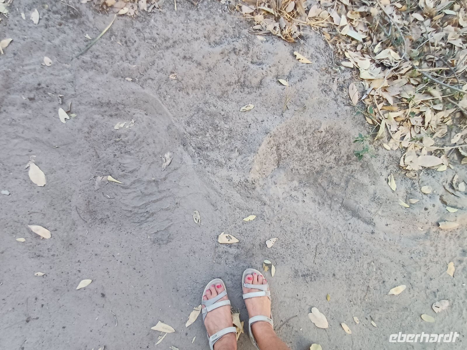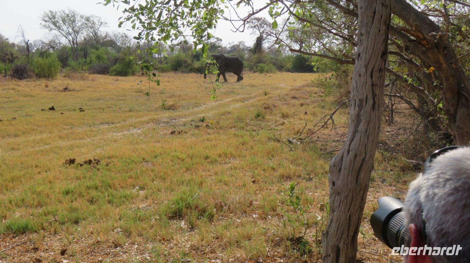 Nach dem gemütlichen Frühstück wurde unser "großes" Reisegepäck im Truck eingeschlossen, der in der Thamelakane River Lodge geparkt wurde. Für uns ging es mit dem Jeep für die kommenden zwei Tage in die wirkliche Wildnis. Erst über die heissen Asphaltstraßen von Maun, dann über Sandwege entlang des Büffelzauns erreichen wir die, abseits der Zivilisation liegende, Shokomoka Lodge. Während unserer Fahrt sahen wir mehrere größere Elefantenherden und einige andere Tiere. In der Lodge wurden wir herzlich von Otti, der Managerin und Ihrem Team begrüßt und genossen unseren Mittagsimbiss. Anschließend bezogen wir unsere sehr Zelte, welche sehr komfortabel eingerichtet waren. Dann konnten wir von der kleinen Holzterrasse der Lodge aus die ersten Tiere beobachten - Warzenschweine, Antilopen, verschiedene Vögel und natürlich Elefanten. Am späten Nachmittag fuhren wir zu einem kleinen Sundowner-Picknick im Gelände der Lodge. Auf der Fahrt dahin entdeckten wir einen im Baum hängenden Leopardenriss (der Leopard war leider nicht da) und wurden wieder von Elefanten-Familien bestaunt. Mitten in der Wildnis hatten Otti & Ihr Team ein wunderschönes Picknick Buffet aufgebaut und wir genossen bei Cola, Wein, Bier oder Gin-Tonic umrahmt von vielen Tierstimmen einen schönen Sonnenuntergang. Das leckere Abendessen & das gemütliche Beisammensein am Lagerfeuer rundete den Tag ab.
