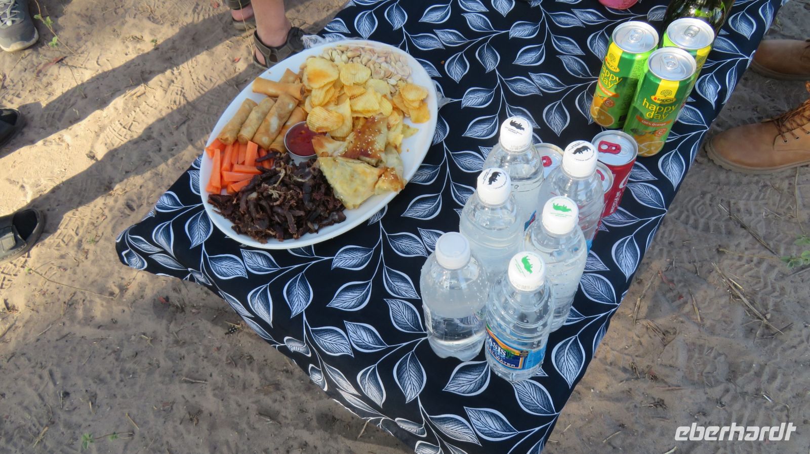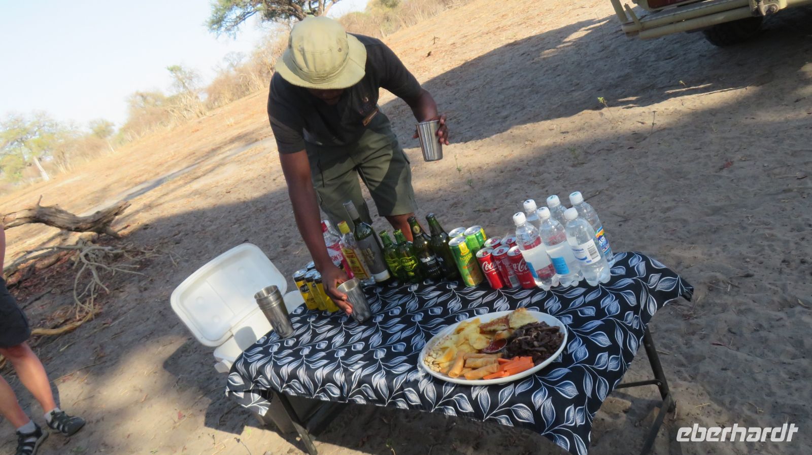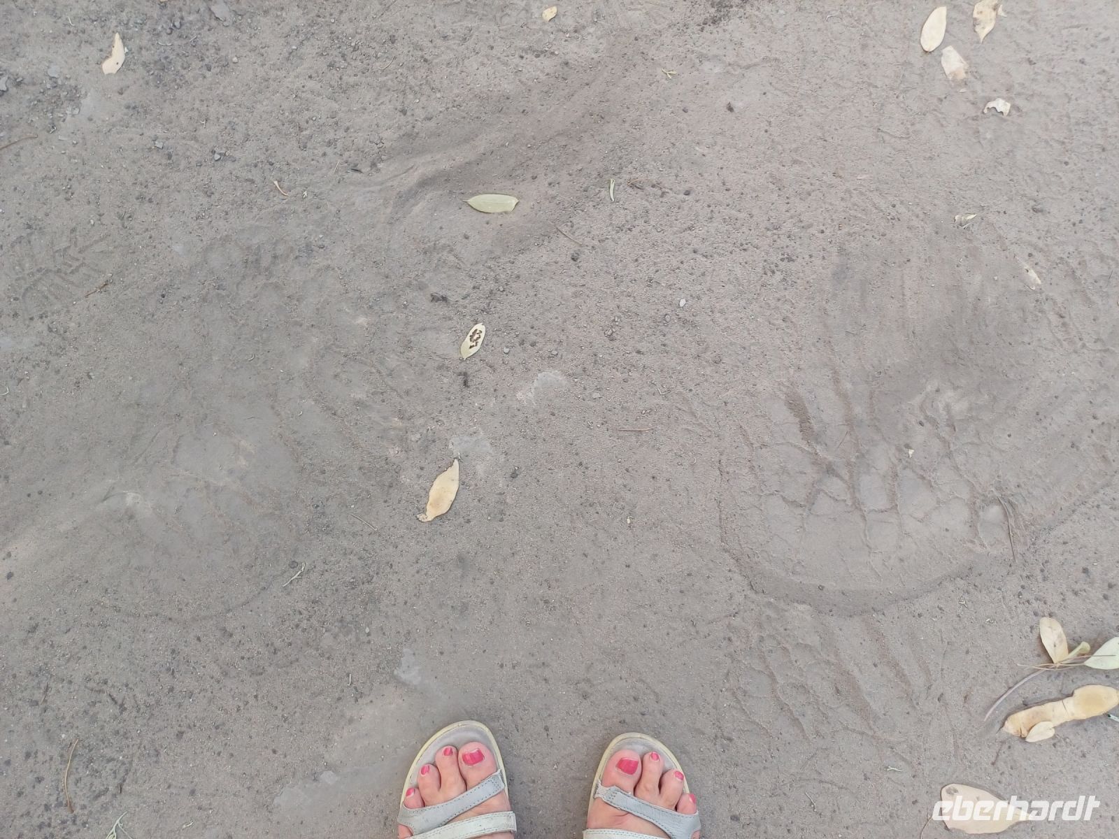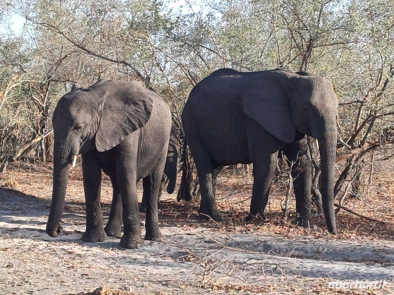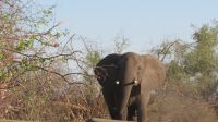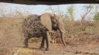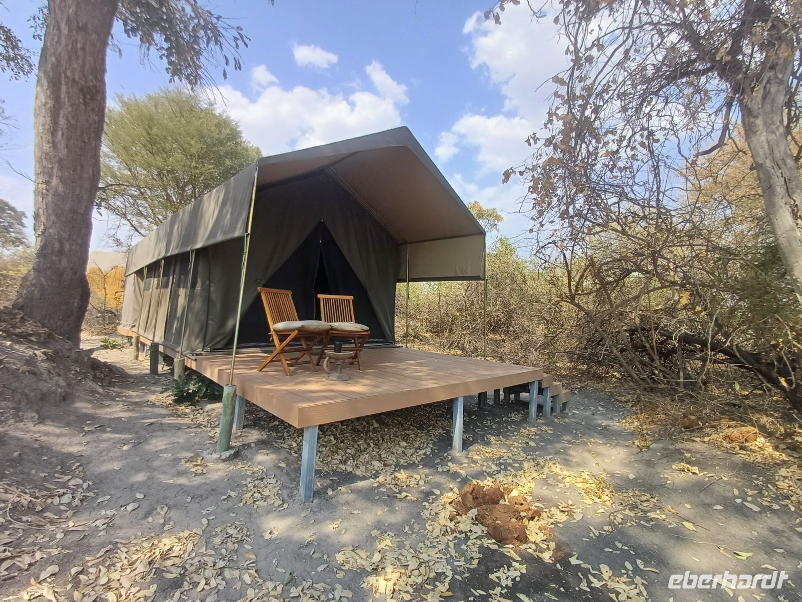 Nach dem gemütlichen Frühstück wurde unser "großes" Reisegepäck im Truck eingeschlossen, der in der Thamelakane River Lodge geparkt wurde. Für uns ging es mit dem Jeep für die kommenden zwei Tage in die wirkliche Wildnis. Erst über die heissen Asphaltstraßen von Maun, dann über Sandwege entlang des Büffelzauns erreichen wir die, abseits der Zivilisation liegende, Shokomoka Lodge. Während unserer Fahrt sahen wir mehrere größere Elefantenherden und einige andere Tiere. In der Lodge wurden wir herzlich von Otti, der Managerin und Ihrem Team begrüßt und genossen unseren Mittagsimbiss. Anschließend bezogen wir unsere sehr Zelte, welche sehr komfortabel eingerichtet waren. Dann konnten wir von der kleinen Holzterrasse der Lodge aus die ersten Tiere beobachten - Warzenschweine, Antilopen, verschiedene Vögel und natürlich Elefanten. Am späten Nachmittag fuhren wir zu einem kleinen Sundowner-Picknick im Gelände der Lodge. Auf der Fahrt dahin entdeckten wir einen im Baum hängenden Leopardenriss (der Leopard war leider nicht da) und wurden wieder von Elefanten-Familien bestaunt. Mitten in der Wildnis hatten Otti & Ihr Team ein wunderschönes Picknick Buffet aufgebaut und wir genossen bei Cola, Wein, Bier oder Gin-Tonic umrahmt von vielen Tierstimmen einen schönen Sonnenuntergang. Das leckere Abendessen & das gemütliche Beisammensein am Lagerfeuer rundete den Tag ab.