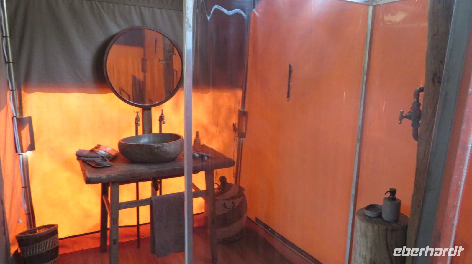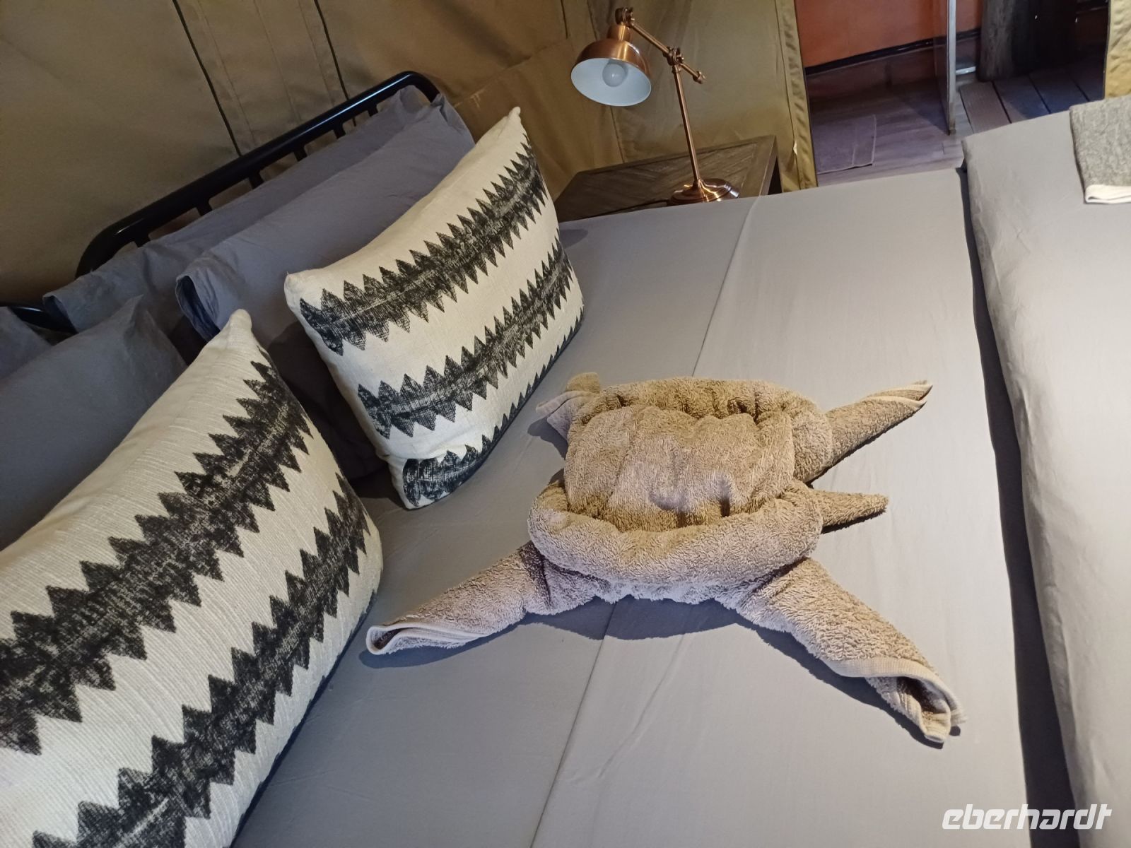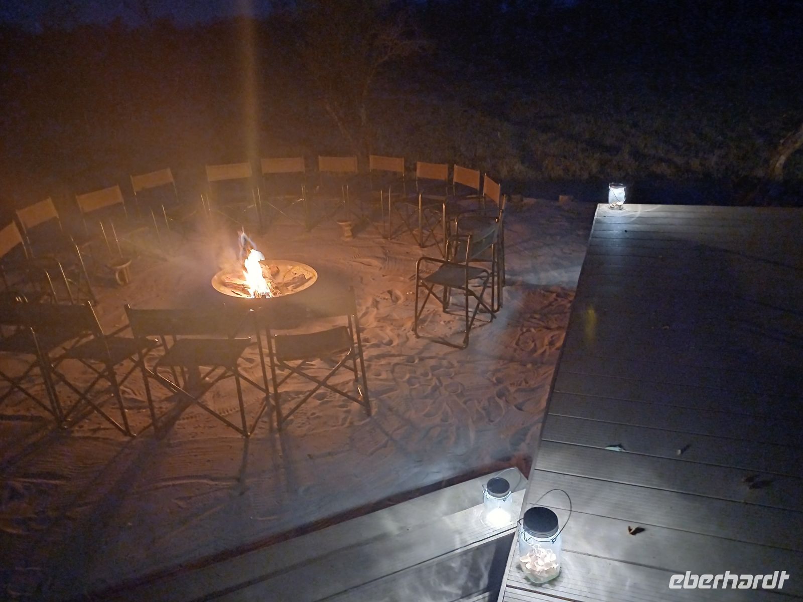 Holzchalets. Per Jeep soll es dann zum Sundowner in die ausgetrocknete Salzpfanne gehen, wo aber ist der Schlüssel für das Auto ??