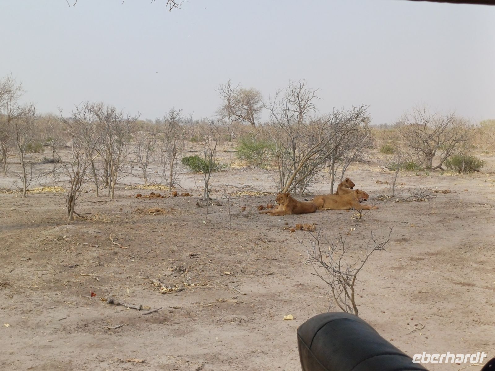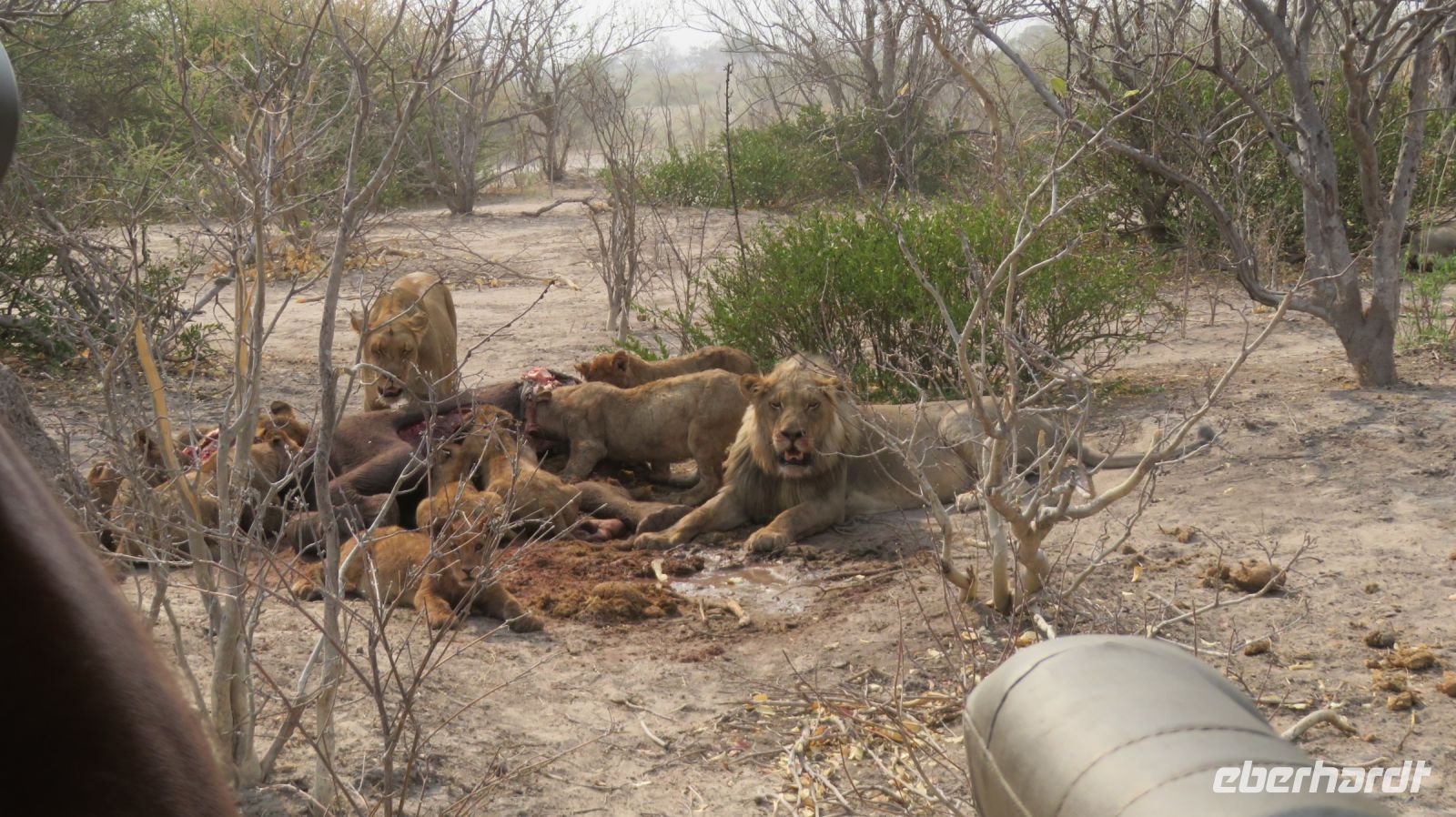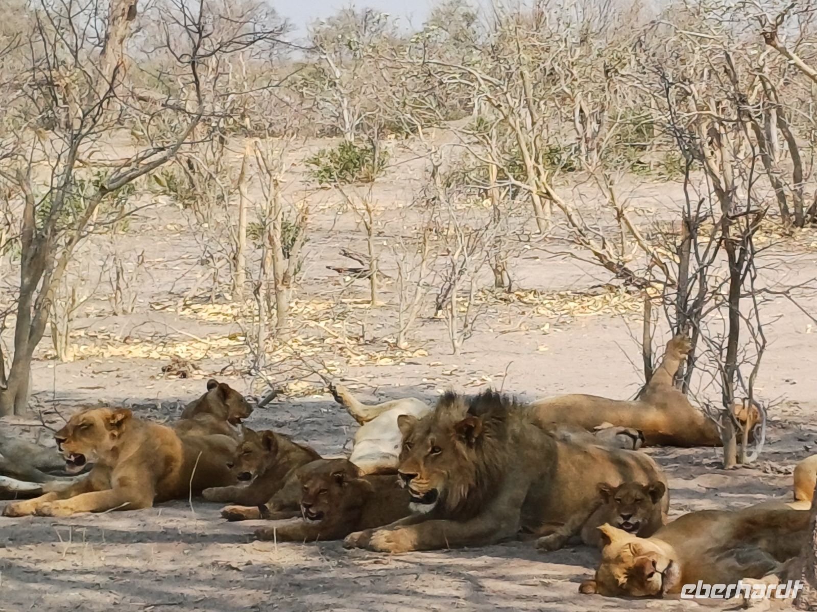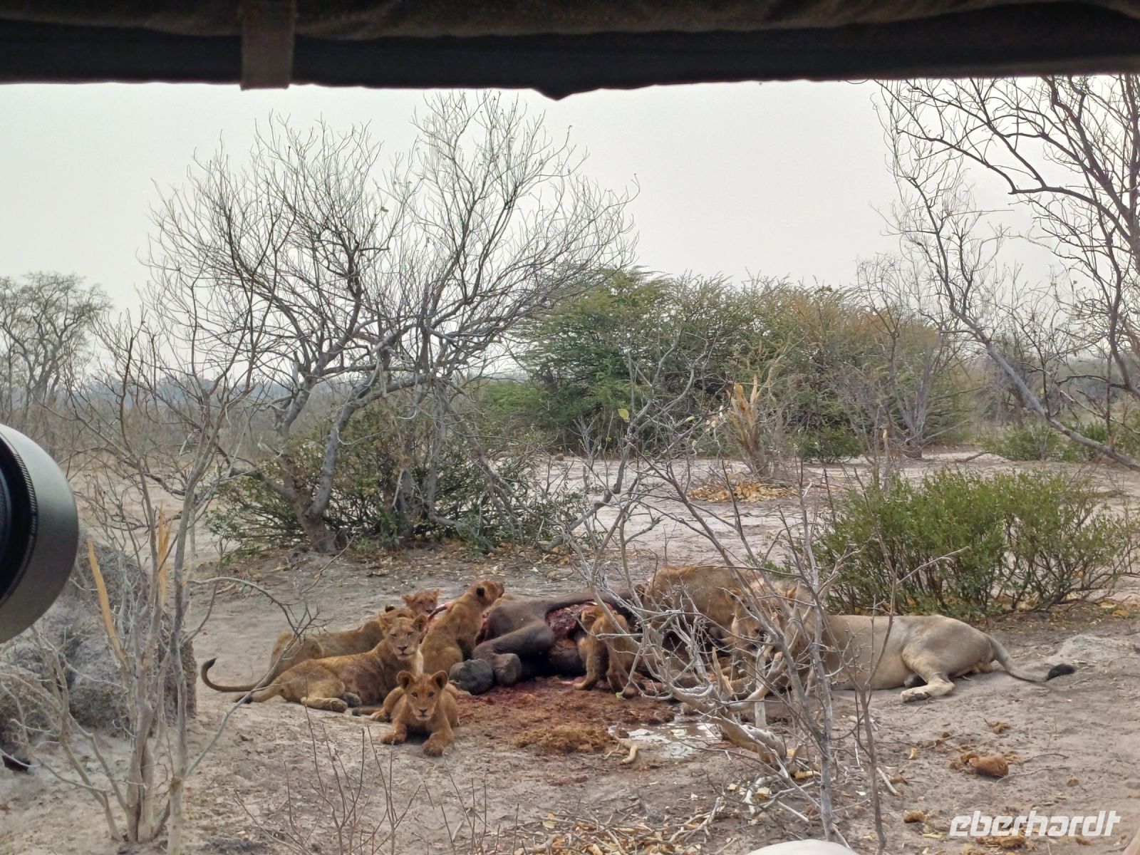 Nach einer Nacht unruhigen Nacht mit vielen Tierbesuchen (Löwe, Elefant, brüllendes Hippo) hiess es 5 Uhr aufstehen, Kaffee, Keks und los ging es mit dem Jeep in Richtung Moremi Game Reserve. Am Eingang des fast 5.000 Quadratkilometer großen Schutzgebiet mit über 1.000 Pflanzen- und 560 Vogelarten, sowie vielen Antilopen, Nilpferden, Giraffen, Elefanten, Löwen mußten wir uns anmelden & los ging die Pirschfahrt. Allerdings knurrten unsere Mägen, mittlerweile waren wir 3 Stunden on Tour. Also erst mal frühstücken & dann Tiere suchen. An einem ausgetrocknetem Wasserloch wurden Tische aufgebaut und lecker gefrühstückt. Otti und Ihr Team hatten superleckere Lunchboxen gepackt. Wieder auf den Jeep und schon das erste Highlight ein Löwenrudel hatte einen kleinen Elefanten gerissen und wir konnten Sie beim "Frühstücken" beobachten. Auf der weiteren Pirsch bekamen wir Zebras, Gnus, Warzenschweine, Kudus, Springböcke, Elefanten & mindestens noch 20 Löwen vor die Kamera - ein Traum. Das Mittags-Picknick machten wir an einem Wasserloch unter Beobachtung von mehreren Hippos und allerlei Vögeln. Am Nachmittag machten wir noch einmal Stopp bei dem verfressenen Löwenrudel vom Vormittag & fuhren dann, voller Begeisterung und fantastischer Eindrücke in unsere kleine Lodge zurück. Auch hier gab es Überraschungen die Sräucher vor meinem Zelt waren weg- von Elefanten gefressen & rund um meine kleine Terrasse hatten Sie Ihre Häufchen hinterlassen. Bei einem leckeren Abendessen ließen wir dann den traumhaft schönen Tag ausklingen. Um mit Jaco's Worten zu sprechen ein Happs Day ;-).