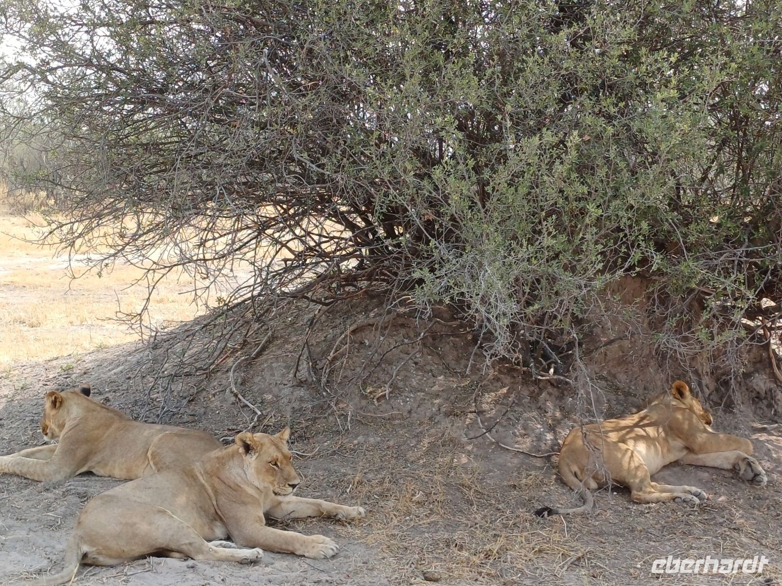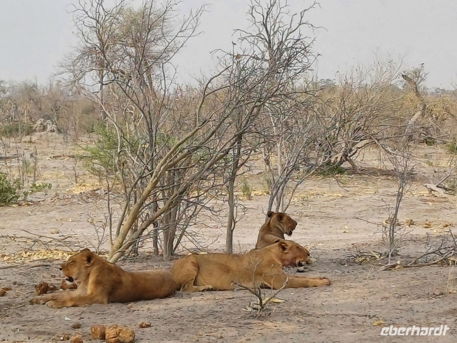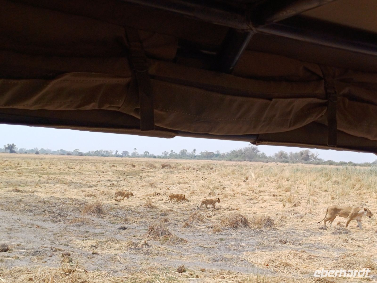 Nach einer Nacht unruhigen Nacht mit vielen Tierbesuchen (Löwe, Elefant, brüllendes Hippo) hiess es 5 Uhr aufstehen, Kaffee, Keks und los ging es mit dem Jeep in Richtung Moremi Game Reserve. Am Eingang des fast 5.000 Quadratkilometer großen Schutzgebiet mit über 1.000 Pflanzen- und 560 Vogelarten, sowie vielen Antilopen, Nilpferden, Giraffen, Elefanten, Löwen mußten wir uns anmelden & los ging die Pirschfahrt. Allerdings knurrten unsere Mägen, mittlerweile waren wir 3 Stunden on Tour. Also erst mal frühstücken & dann Tiere suchen. An einem ausgetrocknetem Wasserloch wurden Tische aufgebaut und lecker gefrühstückt. Otti und Ihr Team hatten superleckere Lunchboxen gepackt. Wieder auf den Jeep und schon das erste Highlight ein Löwenrudel hatte einen kleinen Elefanten gerissen und wir konnten Sie beim "Frühstücken" beobachten. Auf der weiteren Pirsch bekamen wir Zebras, Gnus, Warzenschweine, Kudus, Springböcke, Elefanten & mindestens noch 20 Löwen vor die Kamera - ein Traum. Das Mittags-Picknick machten wir an einem Wasserloch unter Beobachtung von mehreren Hippos und allerlei Vögeln. Am Nachmittag machten wir noch einmal Stopp bei dem verfressenen Löwenrudel vom Vormittag & fuhren dann, voller Begeisterung und fantastischer Eindrücke in unsere kleine Lodge zurück. Auch hier gab es Überraschungen die Sräucher vor meinem Zelt waren weg- von Elefanten gefressen & rund um meine kleine Terrasse hatten Sie Ihre Häufchen hinterlassen. Bei einem leckeren Abendessen ließen wir dann den traumhaft schönen Tag ausklingen. Um mit Jaco's Worten zu sprechen ein Happs Day ;-).