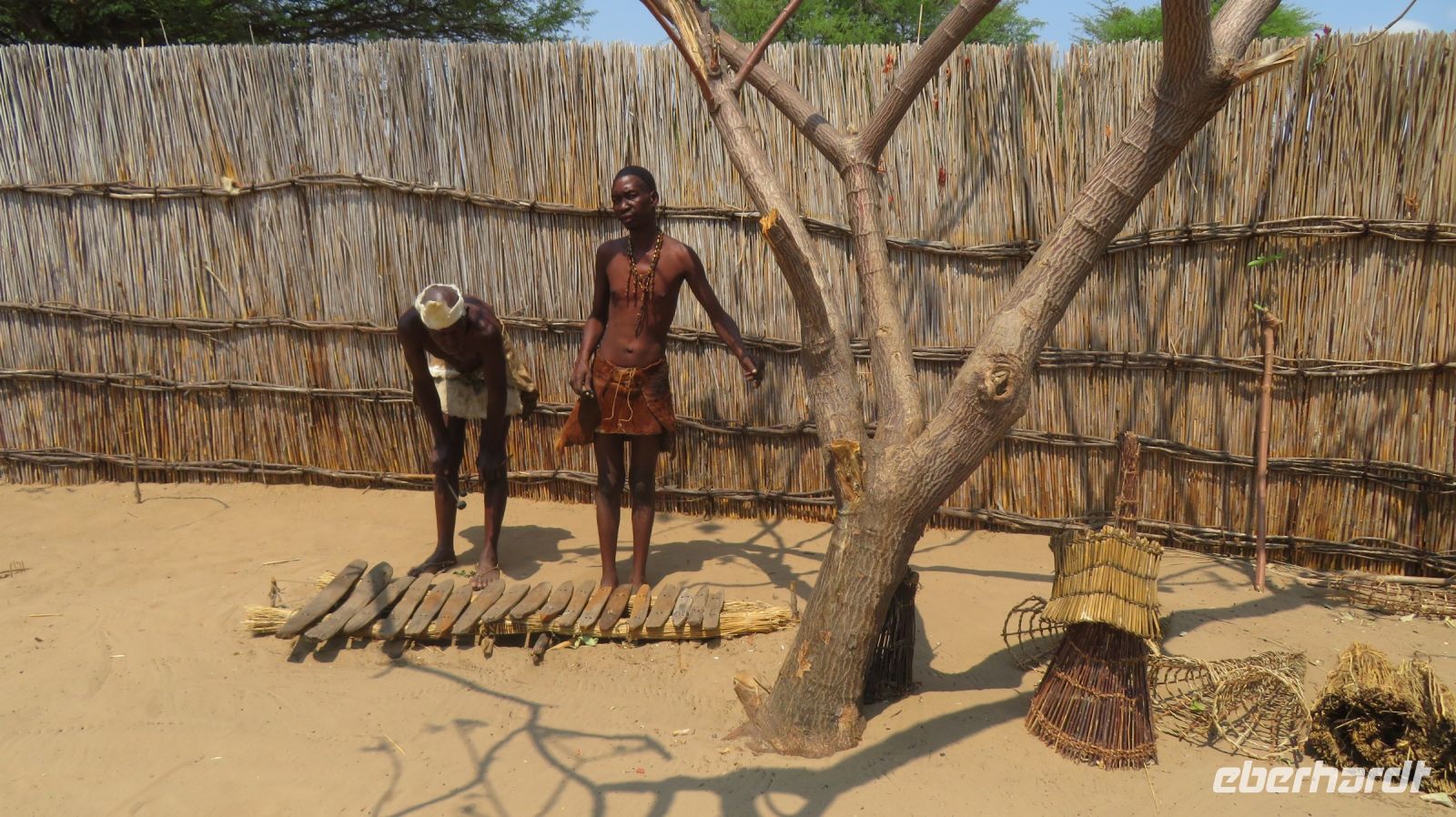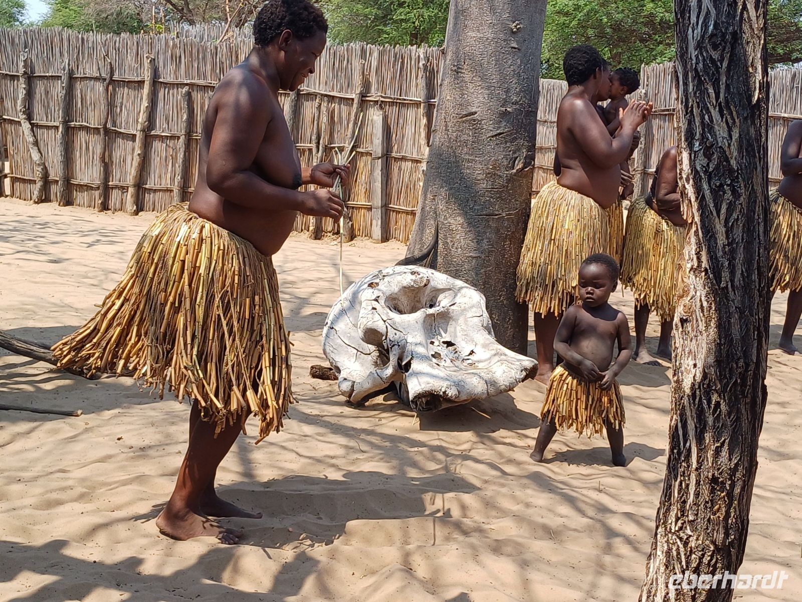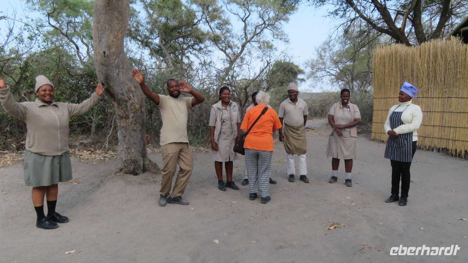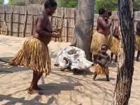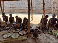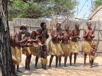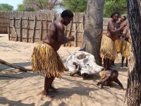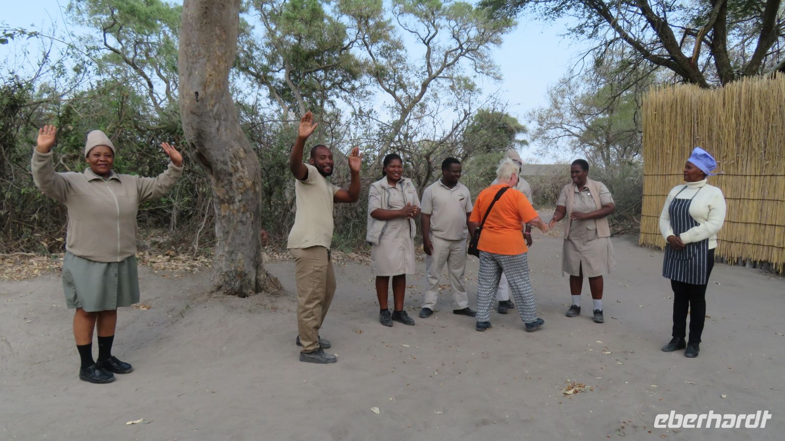 Nach dem ging unsere Reise weiter im Caprivi-Zipfel von Namibia. Wir wollten heute picknicken, also erst mal shoppen, was bei dieser Reise wirklich selten möglich war. In unserem Einkaufskörbchen landeten Brötchen, Wurst, Senf und Ketchup und schon ging die Fahrt weiter innerhalb des Bwabwata National Park. Ungefähr 280 km standen auf unserem Tagesplan. Zur Mittagszeit wurde an kleiner Picknickstelle, im Schatten eines Baumes, Grill, Campingtisch & Stühle für unsere Mittagspause ausgepackt. Die von Jaco gekauften & gegrillten Würste waren wirklich echt lecker. Am frühen Nachmittag stand der Besuch des lebendigen Museums der Mafwe, einem Stamm im Caprivi-Streifen, auf dem Programm. In einem traditionell errichteten Dorf erfuhren wir viel über die ursprüngliche Lebensweise, wie das Aufstellen von Fallen für den Tierfang, die Bearbeitung von Lebensmitteln, das Herstellen von Bastmatten & Musikinstrumenten und erhielten einen kleinen Einblick in Ihr kulturelles Leben. Wie ich bei diesem Besuch meinen Spitznamen "Erdferkel" erhielt bleibt unser kleines Gruppengeheimnis. Ein wirklich schöner Einblick in die einheimische Kultur.