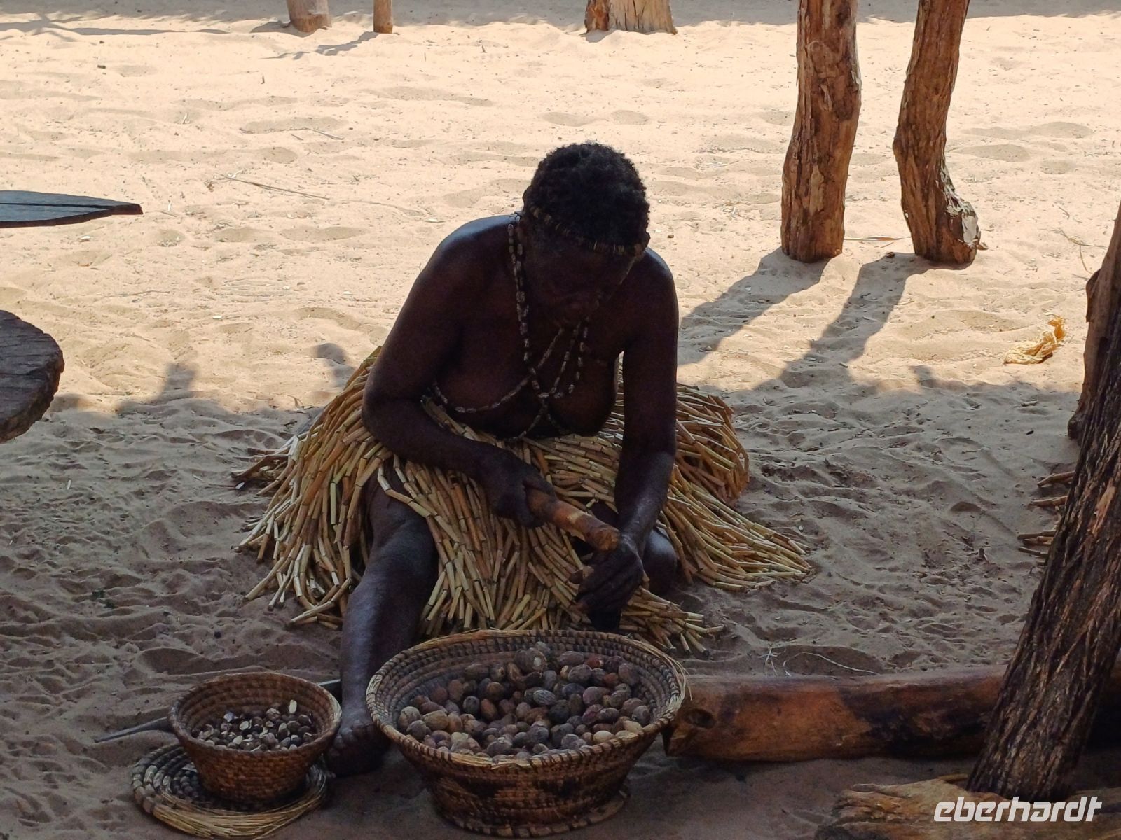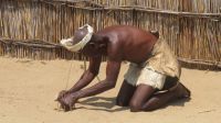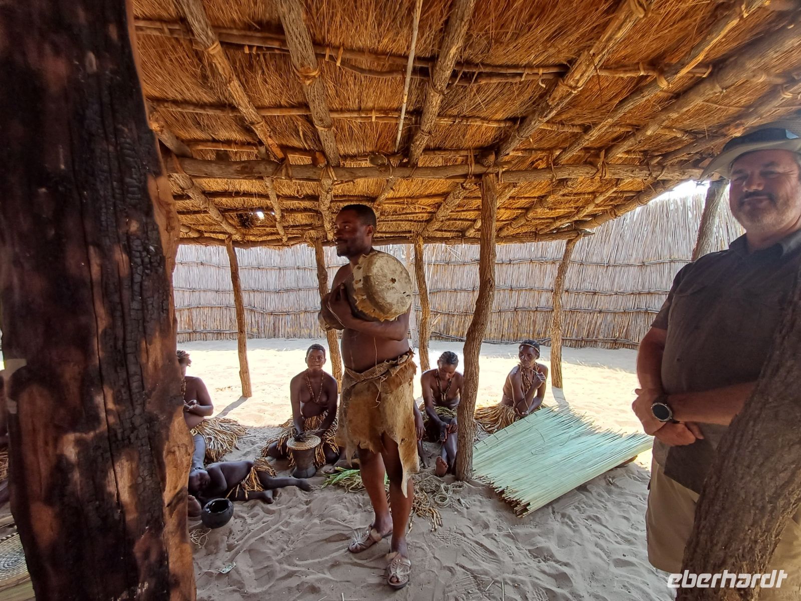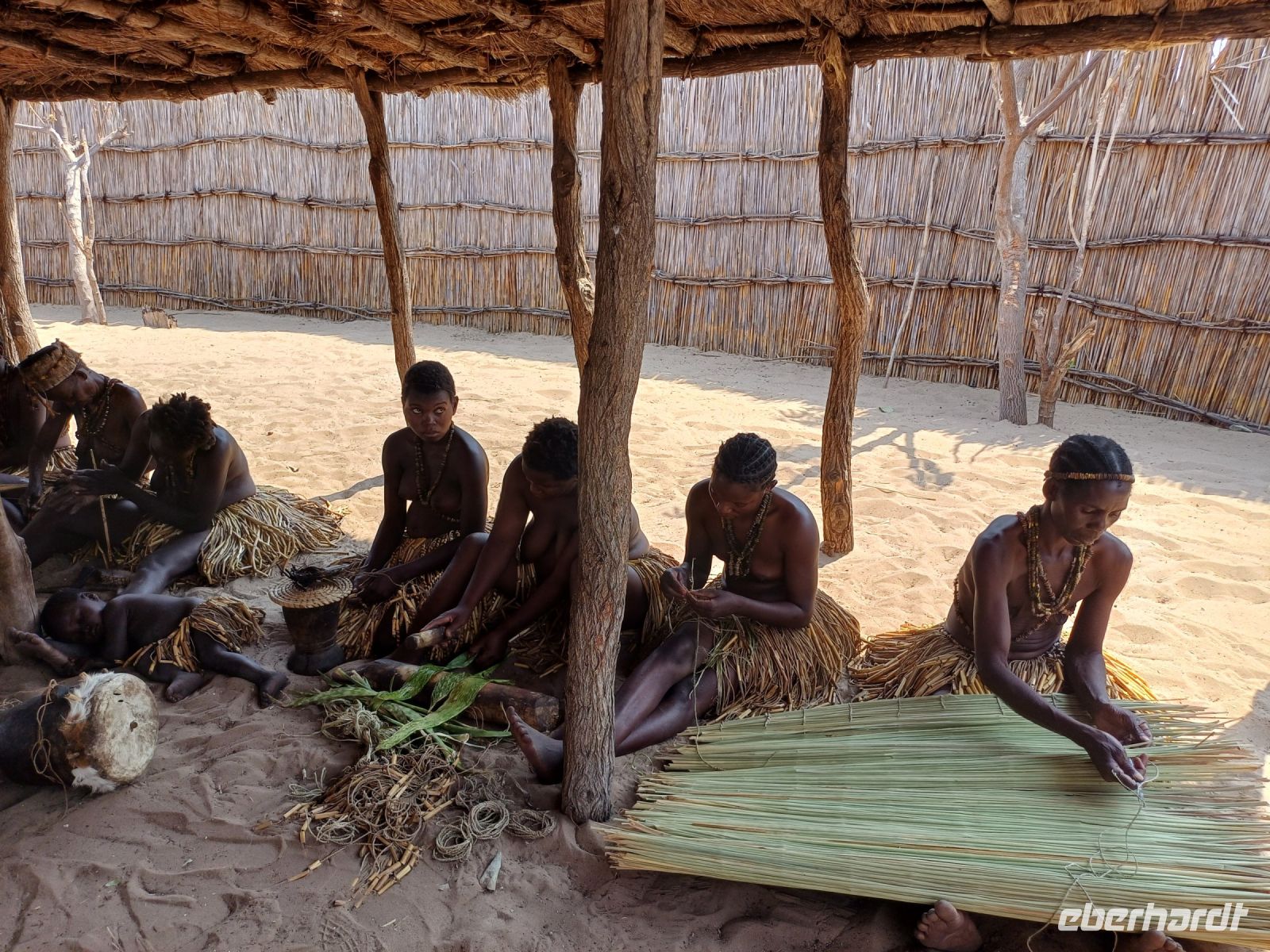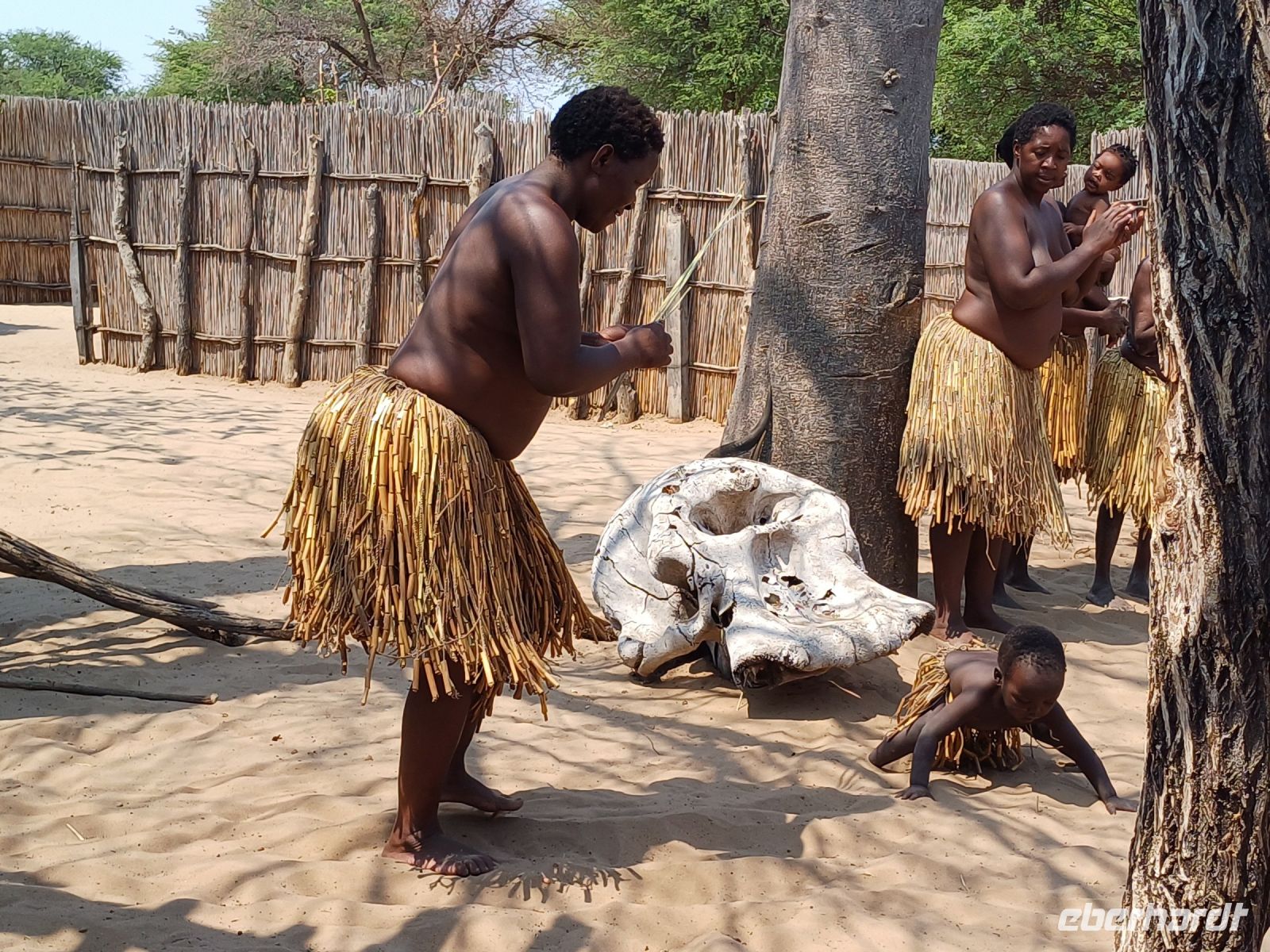 Nach dem ging unsere Reise weiter im Caprivi-Zipfel von Namibia. Wir wollten heute picknicken, also erst mal shoppen, was bei dieser Reise wirklich selten möglich war. In unserem Einkaufskörbchen landeten Brötchen, Wurst, Senf und Ketchup und schon ging die Fahrt weiter innerhalb des Bwabwata National Park. Ungefähr 280 km standen auf unserem Tagesplan. Zur Mittagszeit wurde an kleiner Picknickstelle, im Schatten eines Baumes, Grill, Campingtisch & Stühle für unsere Mittagspause ausgepackt. Die von Jaco gekauften & gegrillten Würste waren wirklich echt lecker. Am frühen Nachmittag stand der Besuch des lebendigen Museums der Mafwe, einem Stamm im Caprivi-Streifen, auf dem Programm. In einem traditionell errichteten Dorf erfuhren wir viel über die ursprüngliche Lebensweise, wie das Aufstellen von Fallen für den Tierfang, die Bearbeitung von Lebensmitteln, das Herstellen von Bastmatten & Musikinstrumenten und erhielten einen kleinen Einblick in Ihr kulturelles Leben. Wie ich bei diesem Besuch meinen Spitznamen "Erdferkel" erhielt bleibt unser kleines Gruppengeheimnis. Ein wirklich schöner Einblick in die einheimische Kultur.